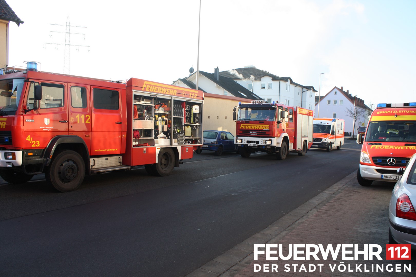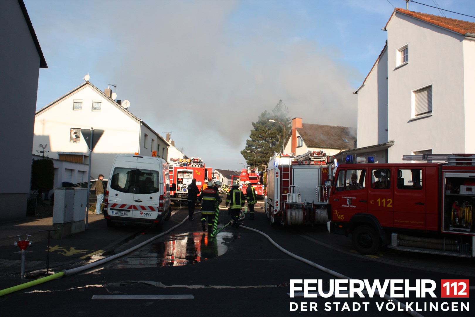 Die Feuerwehr wurde zu einem Wohnhausbrand alarmiert. Beim Eintreffen der Einsatzkräfte brannten das oberste Geschoss und das Dach bereits in voller Ausdehnung. Die Bewohner hatten zu diesem Zeitpunkt bereits das Gebäude verlassen. Im ersten Angriff gingen drei Trupps unter schwerem Atemschutz mit je einem C-Rohr in das Gebäude , ein weiterer Trupp mit einem B-Rohr zum Aussenangriff vor. Gleichzeitig wurde die Drehleiter in Stellung gebracht um den Brand des Dachs mit einem B-Rohr zu löschen. Das Nachbargebäude wurde ebenfalls abgeschirmt, hier wurden zwei Personen bis zum Eintreffen der Krisenintervention durch die Feuerwehr betreut. Nachdem das Feuer gelöscht war wurde eine Brandwache gestellt. Bei Bränden dieser Größenordnung kommt es immer wieder zum Aufkeimen kleinerer Brandherde, die dann wieder abgelöscht werden müssen. Gegen 16:40 Uhr konnte der Einsatz beendet werden. 10 Personen verloren bei diesem Brand ihre Wohnung und mussten durch das Ordnungsamt der Stadt Völklingen in Notunterkünften untergebracht werden. Neben der Feuerwehr war auch der Rettungsdienst, die Polizei, die Krisenintervention und die Stadtwerke mit ca. 70 Kräften im Einsatz.