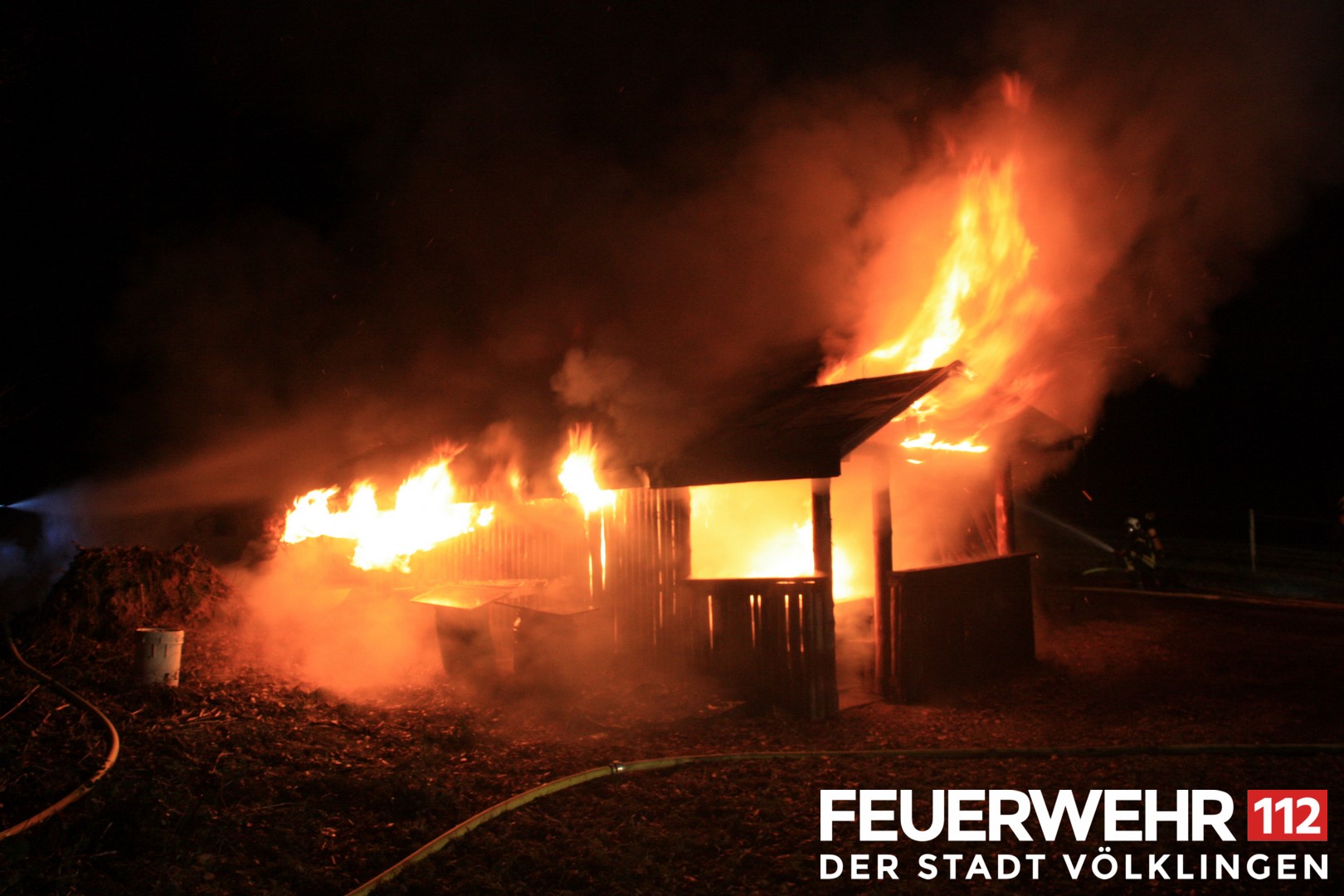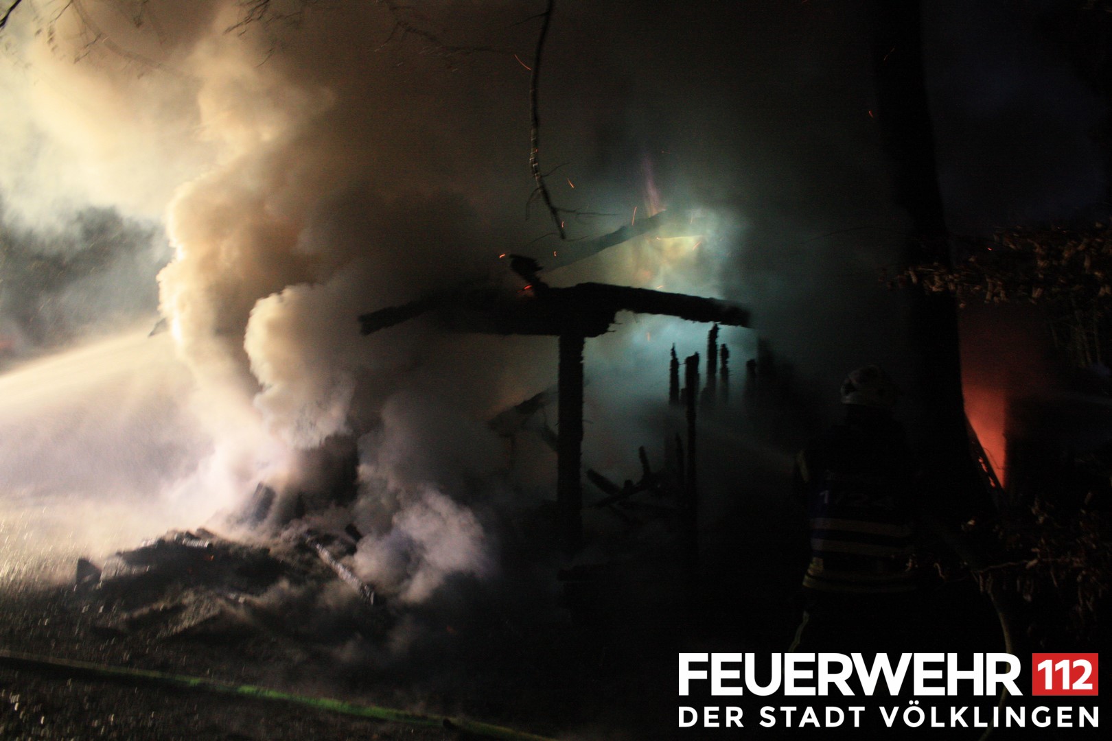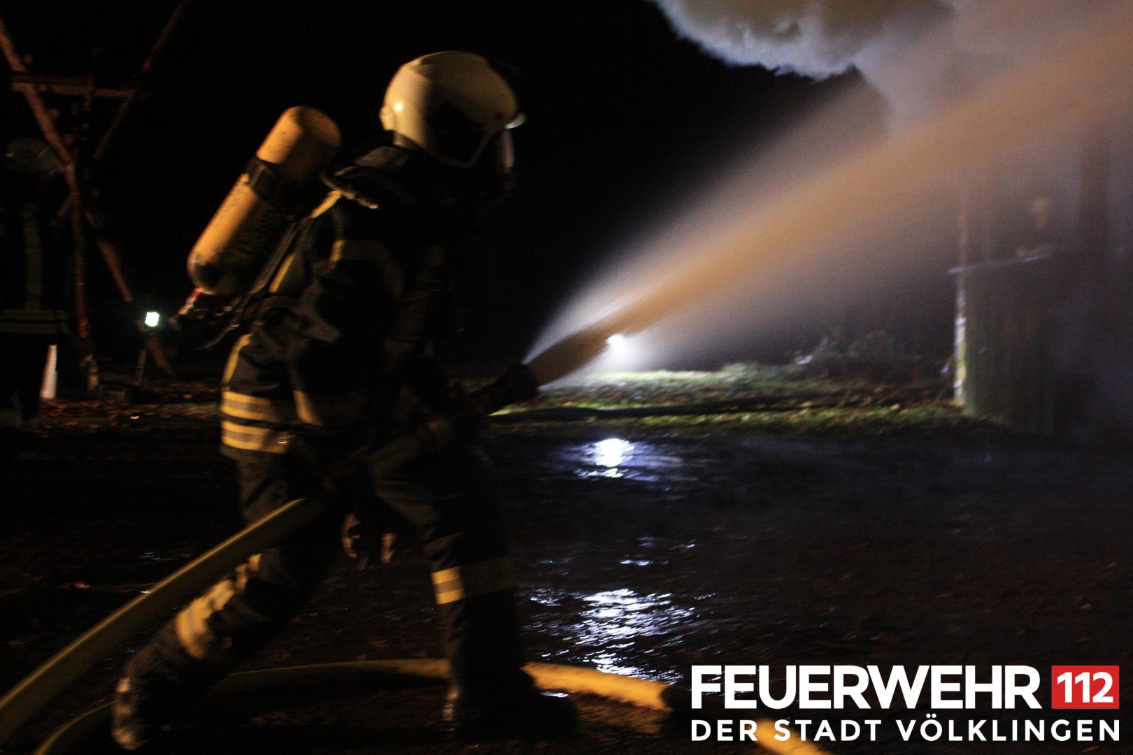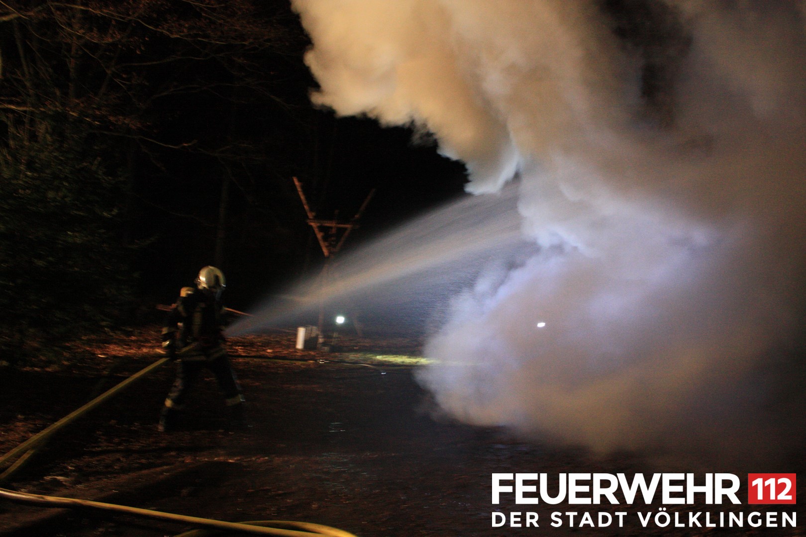 Die Feuerwehr Völklingen wurde zu einem Brand einer Waldhütte in die Langwiesstraße gerufen. Bei Eintreffen der Einsatzkräfte stand die Hütte bereits in Vollbrand. Die Feuerwehr löschte den Brand mit 4 C-Rohren ab. Da die Einsatzstelle abseits des Hydrantennetzes lag, musste die Wasserversorgung über eine Länge von ca. 500m aufgebaut werden. Nach Ablöschen von Glutnestern konnte die Einsatzstelle an die Polizei übergeben werden.