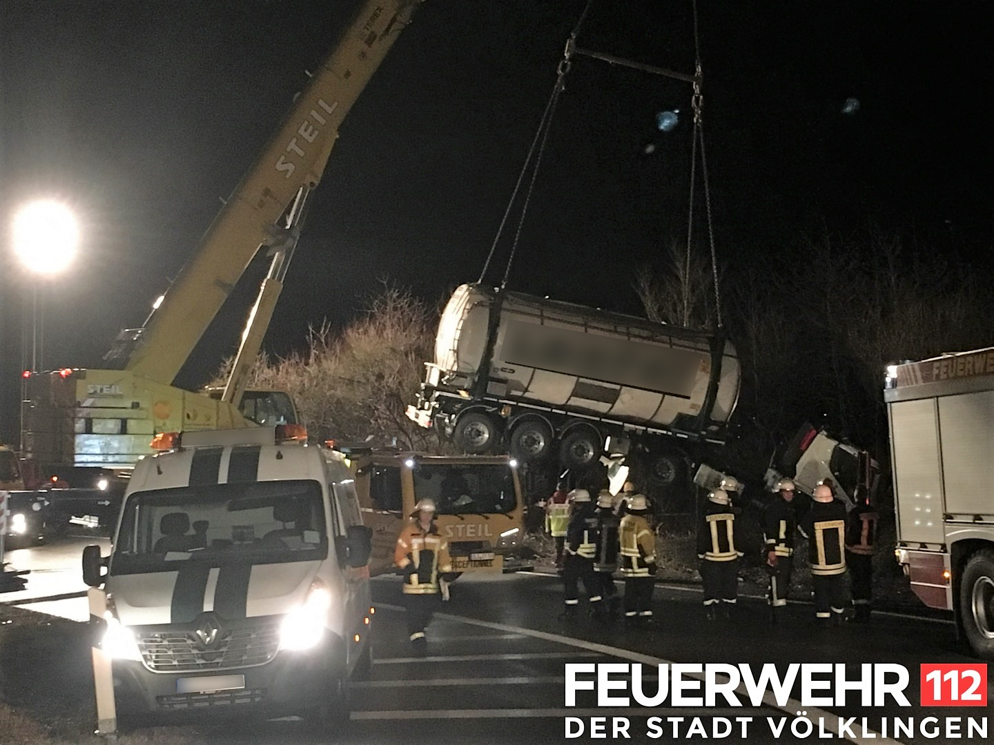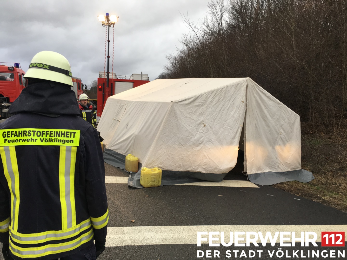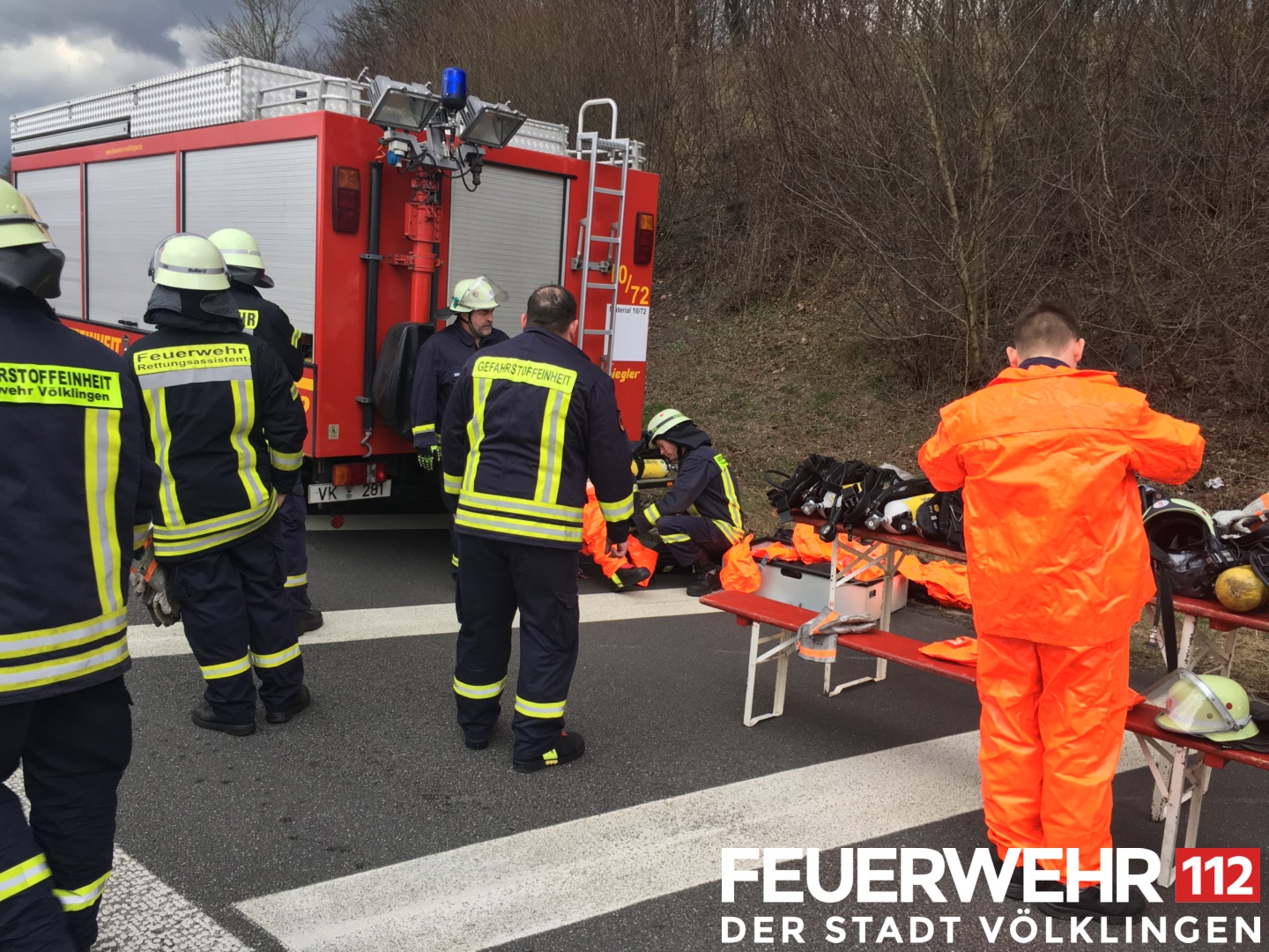 Die Gefahrstoffeinheit der Feuerwehr Völklingen wurde zur Unterstützung der Feuerwehr Friedrichsthal zu einem verunfallten Gefahrgut LKW gerufen. Gegen 10.30 Uhr ist dieser auf der Überleitung von der A 623 zur A 8 in Fahrtrichtung Luxemburg verunfallt. Da die Ladung, welche aus 23 Tonnen "2-Ethyl-Hexyl-Acrylat" bestand, in einen Ersatz-LKW umgepumpt werden musste, übernahmen die Mitglieder der Gefahrstoffeinheit die Absicherung des Umpumpvorgangs, um im Falle eines Stoffaustritts sofort eingreifen zu können.
