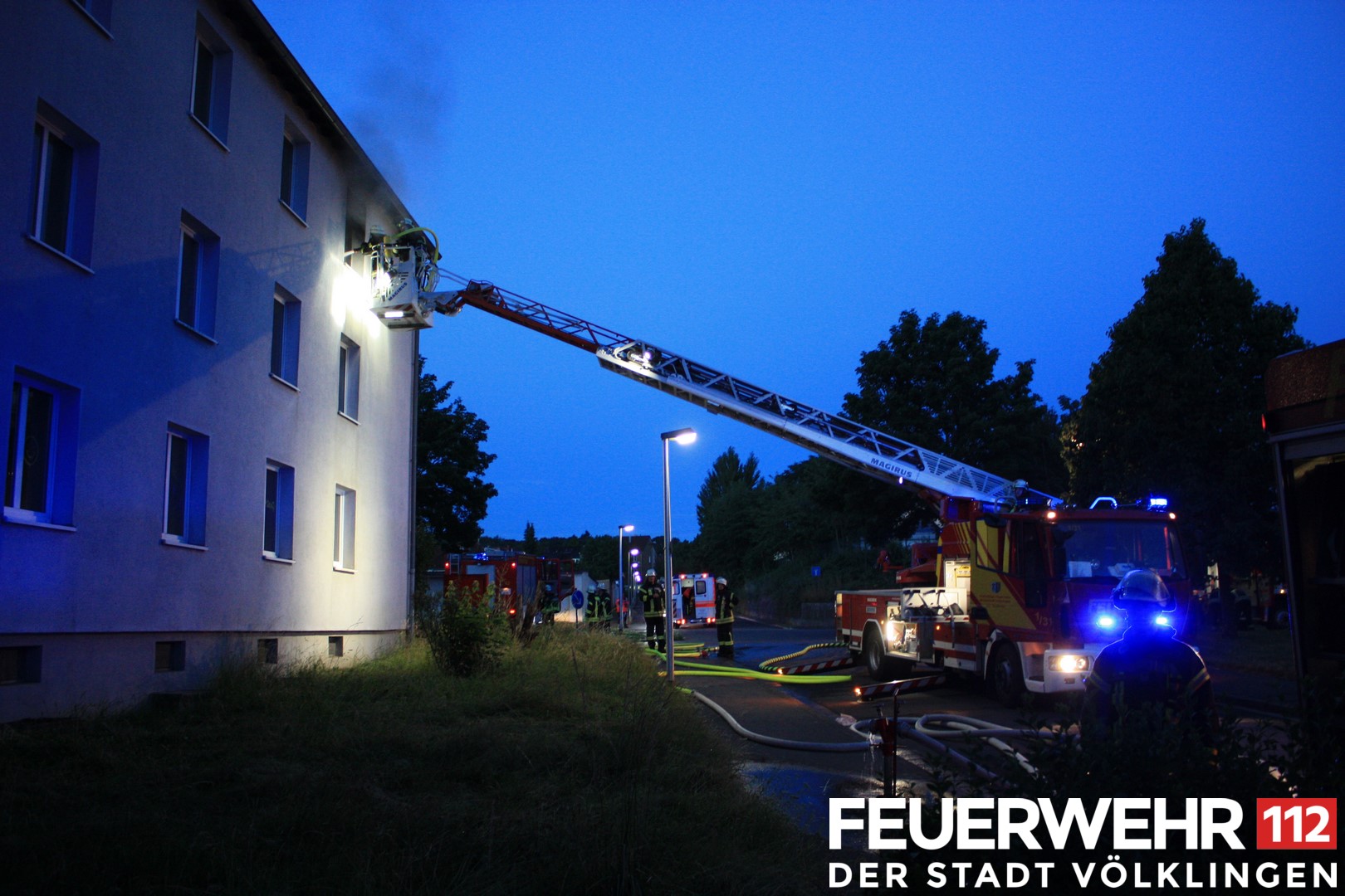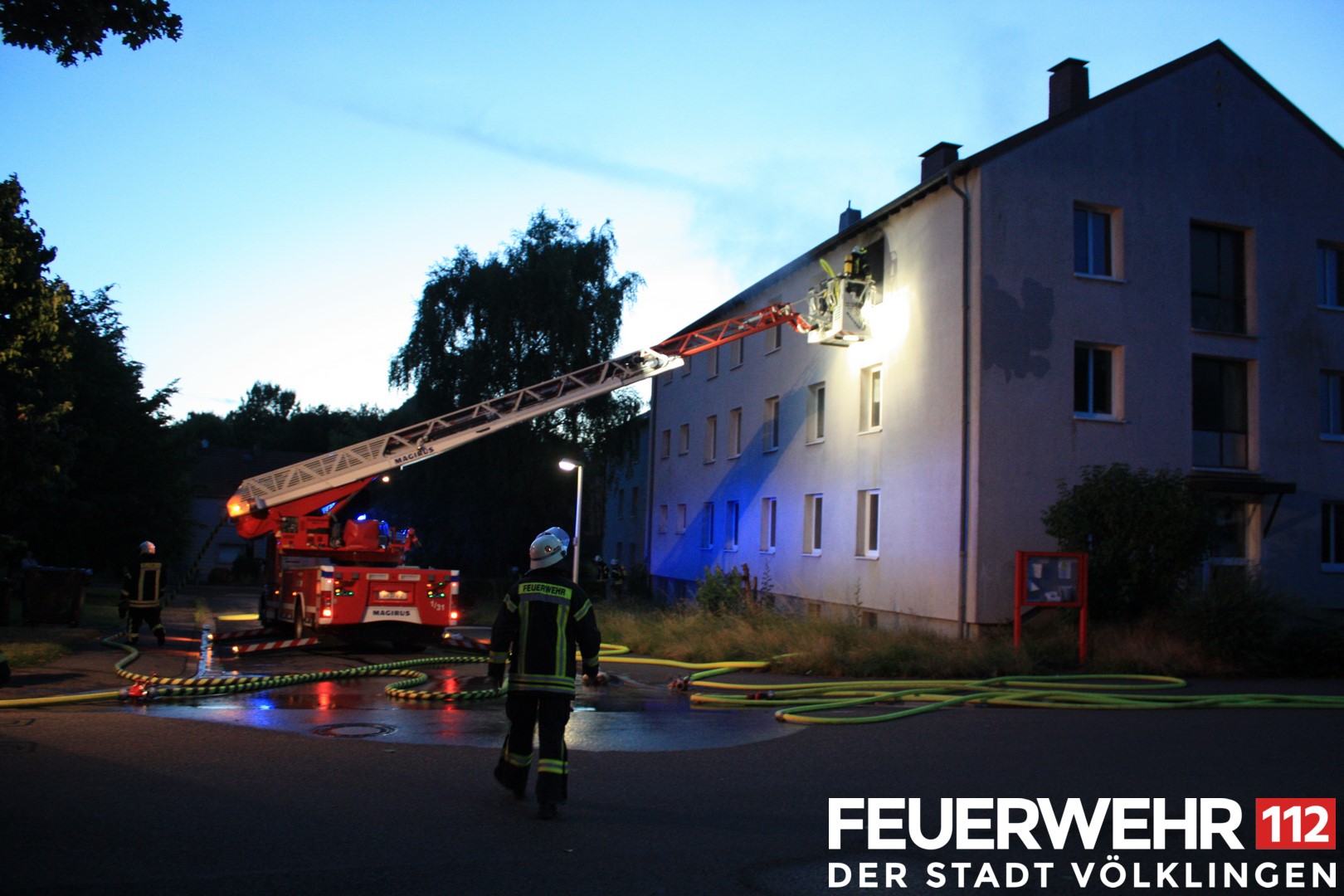 Die Feuerwehr wurde zu einem Brand in einem Gebäude alarmiert. Beim Eintreffen der Einsatzkräfte drang bereits dichter Rauch aus dem zweiten Obergeschoss des Gebäudes. Es wurden mehrere Trupps unter schwerem Atemschutz zur Personensuche und Brandbekämpfung in das Gebäude geschickt. Zum Zeitpunkt des Einsatzes befanden sich jedoch keine Menschen im Gebäude. Nach Abschluss der Löscharbeiten und Belüftung des Gebäudes wurde die Einsatzstelle für die Kriminalpolzei zur Brandursachenforschung ausgeleuchtet. Nach Abschluss der Arbeiten konnte die Einsatzstelle übergeben werden.