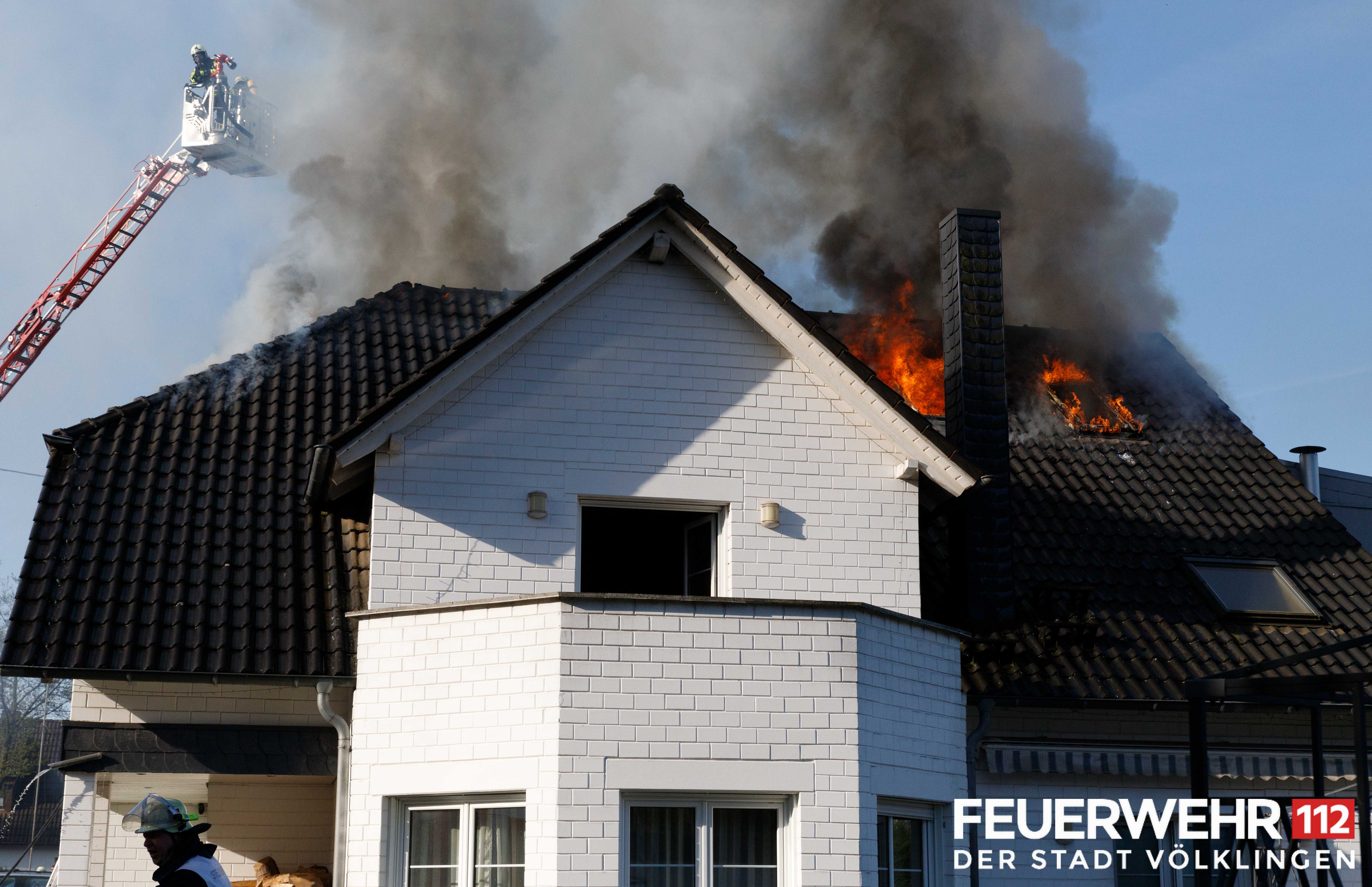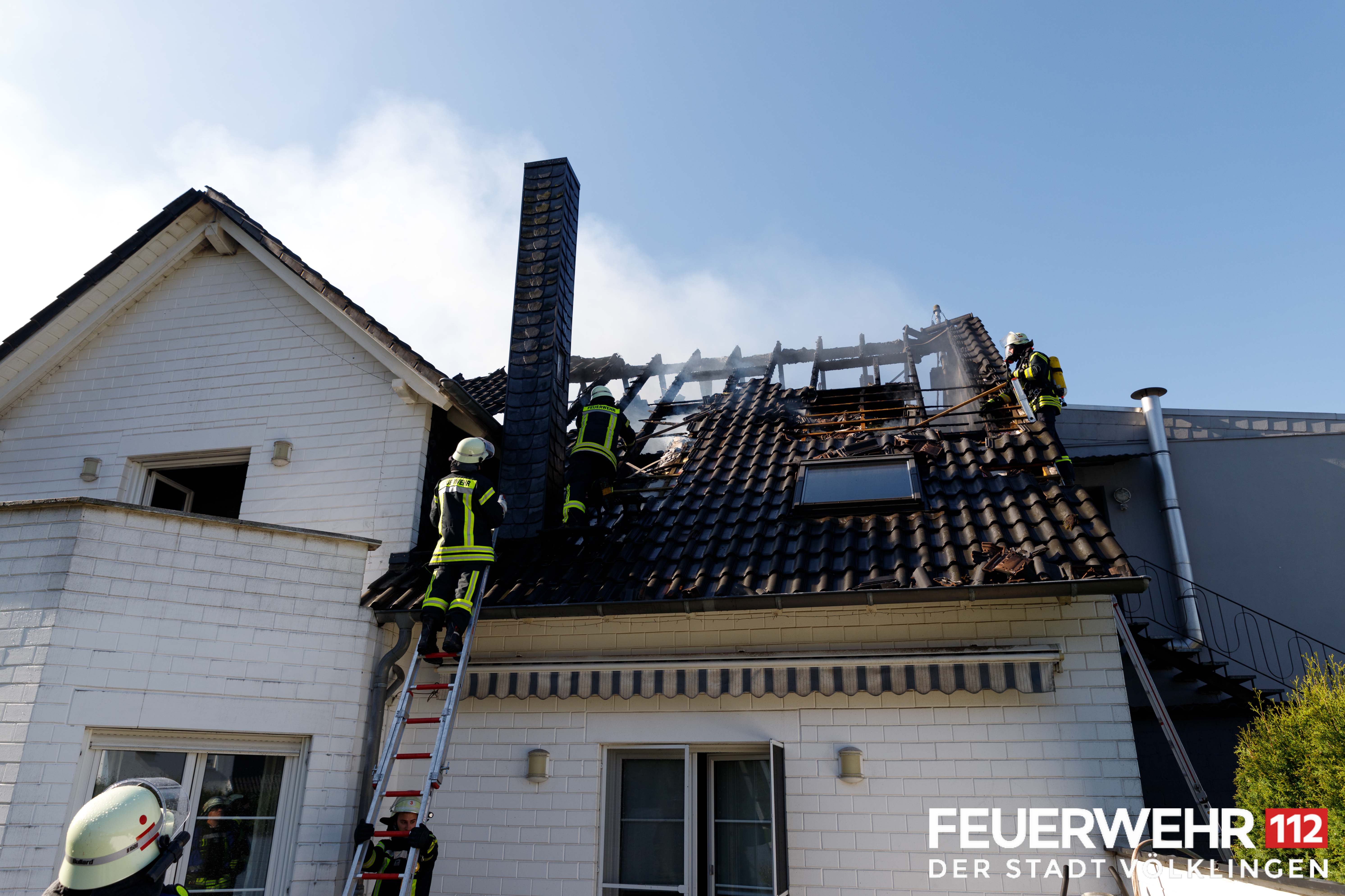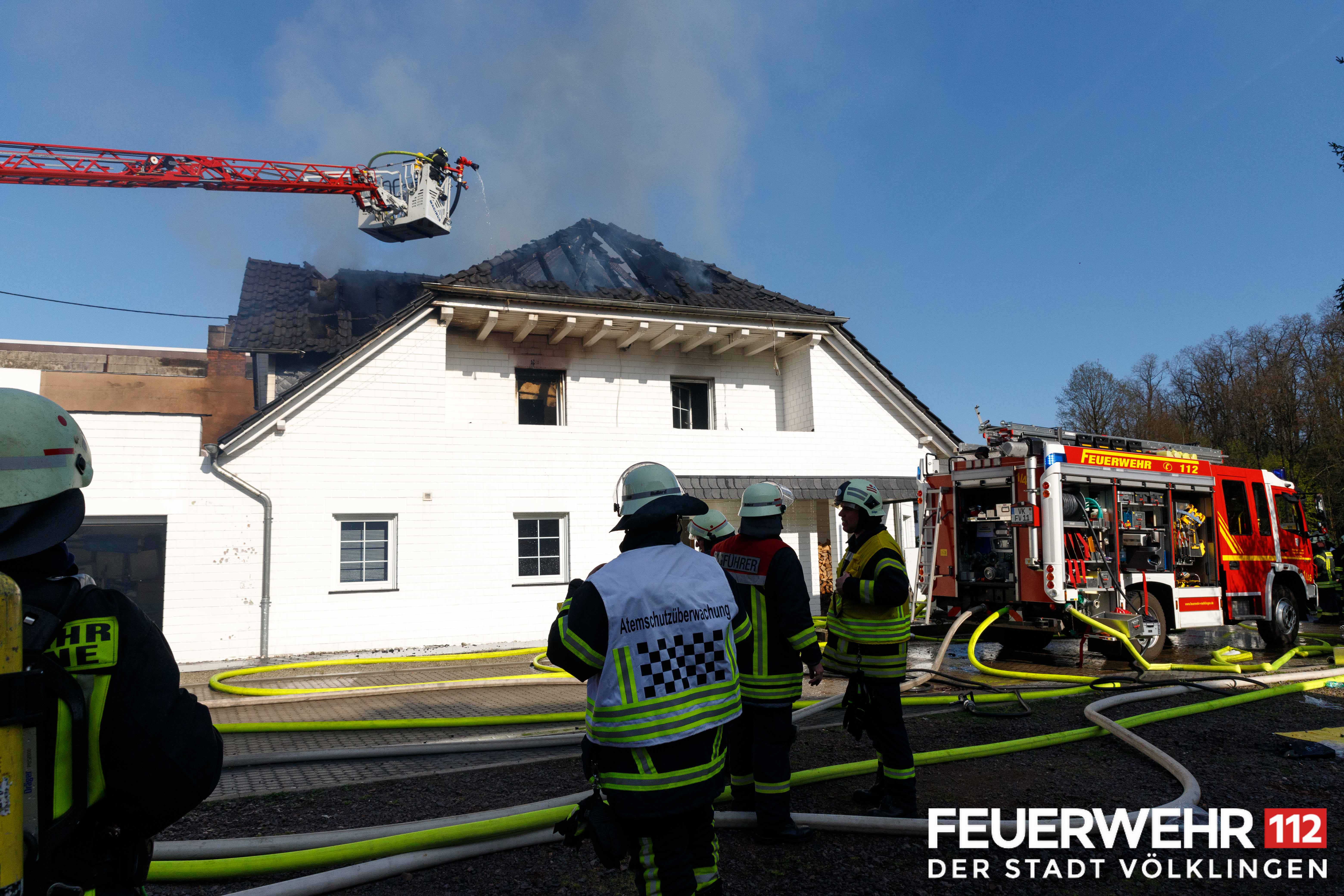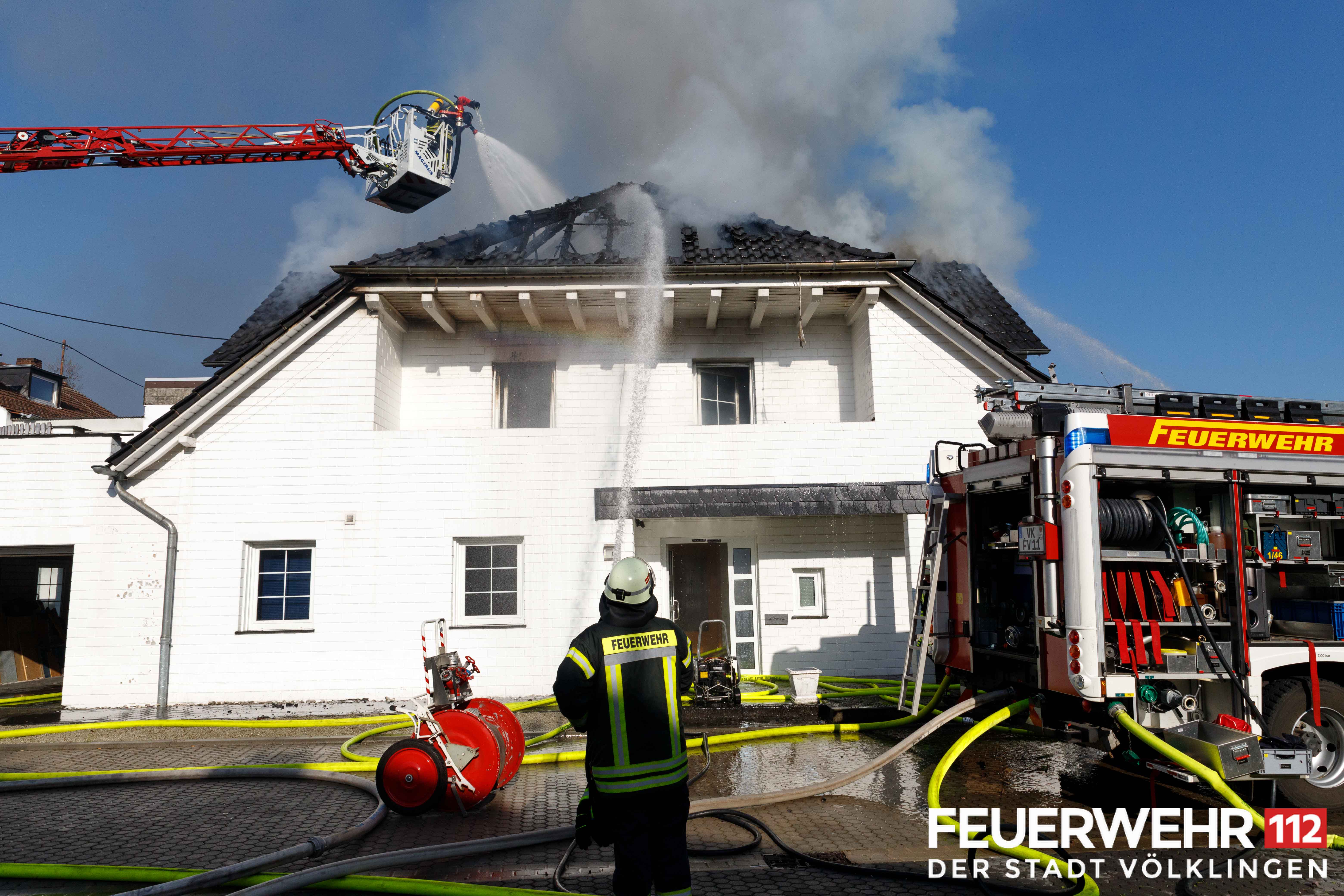 Die Feuerwehr Völklingen wurde zu einem Dachstuhlbrand auf die Röchlinghöhe gerufen. Bei Eintreffen der ersten Einsatzkräfte hatten die Bewohner bereits das Gebäude verlassen. Der erste Angriffstrupp unter PA begab sich sofort zur Brandbekämpfung in das Obergeschoss des Hauses. Dort stand bereits die komplette Wohnung in Vollbrand, was es den dort eingesetzten Kräften unmöglich machte weiter in diesen Bereich vorzudringen. Gleichzeitig wurde ein Angriff über die Drehleiter und über einen Balkon mittels Steckleiter begonnen. Weitere Kräfte bauten eine Riegelstellung zu der benachbarten Backerei und dem in der Nähe stehenden Wohnhaus auf, um ein übergreifen der Flammen auf diese Gebäude zu verhindern. Zeitweise waren bis zu 5 C-Rohre und 1 B-Rohr im Einsatz um das Schadensfeuer zu bekämpfen. Gegen 11:00 Uhr konnte "Feuer aus" gemeldet werden. Allerdings dauerten die Nachlöscharbeiten an den Glutnestern bis zum Nachmittag an. Um ein weiteres Aufflackern des Brandes zu verhindern wurde bis in den Abend ein Fahrzeug mit Besatzung als Brandwache an der Örtlichkeit bereit gestellt. Die Trierer Straße war von Einsatzbeginn bis ca. 13:00 Uhr voll gesperrt. Ein besonderer Dank gilt der zur Brandstelle benachbarten Bäckerei Pusse, die während der gesamten Einsatzdauer die Einsatzkräfte mit Speisen und Getränke auf Ihre Kosten versorgten.