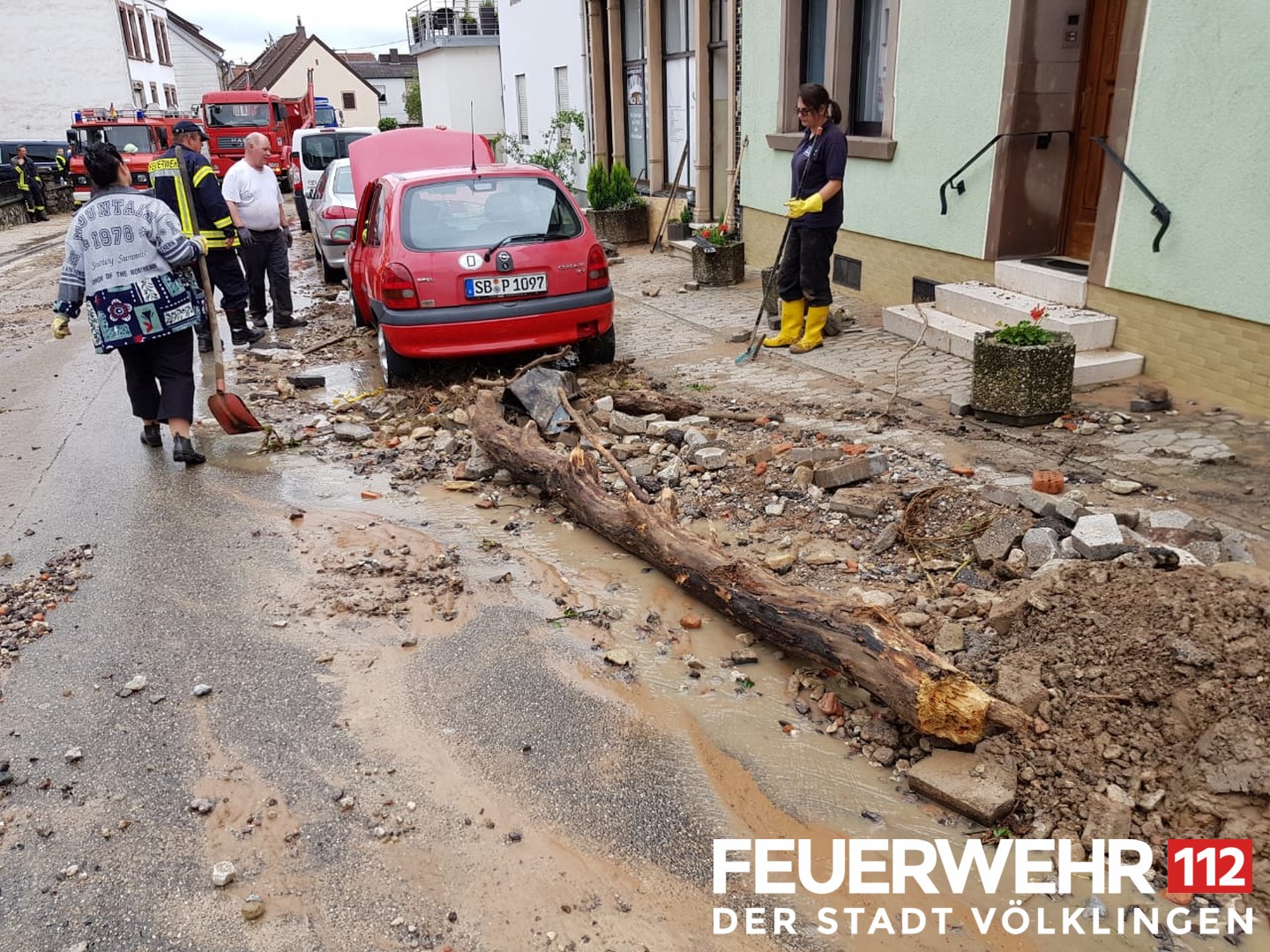 Die Völklinger Feuerwehrleute waren mit dem Einsatzleitwagen vor Ort, um die dortige Einsatzleitung bei der Koordination der Einsätze zu unterstützen. Weitere Fahrzeuge aus den Löschbezirken Stadtmitte, Luisenthal, Wehrden, Geislautern und Lauterbach wurden nach Kleinblittersdorf beordert, um die Kameraden mit Pumpen und Saugern bei der großen Anzahl an Einsätzen zu unterstützen. Auch der Quadrokopter wurde am nächsten Morgen eingesetzt, um sich ein Bild der Verwüstung durch die Wassermassen aus der Luft zu machen.