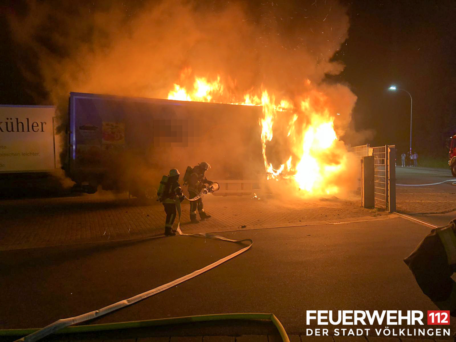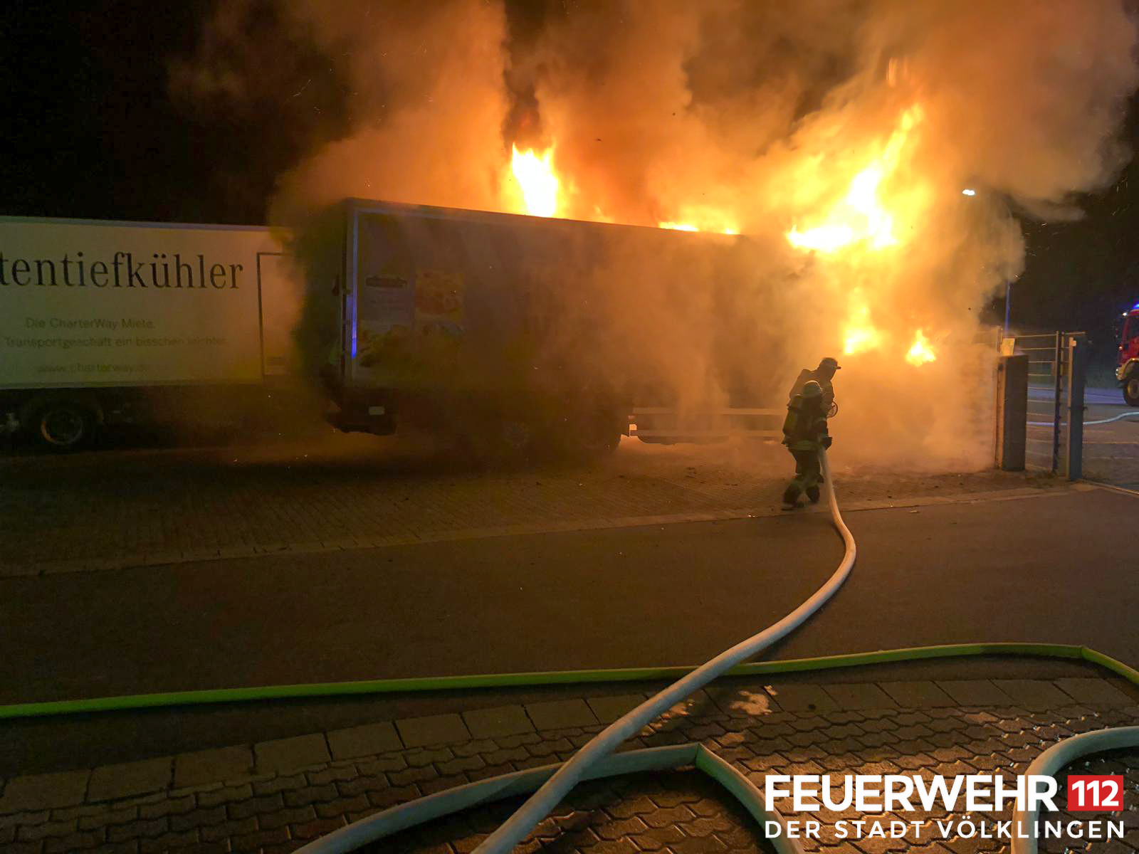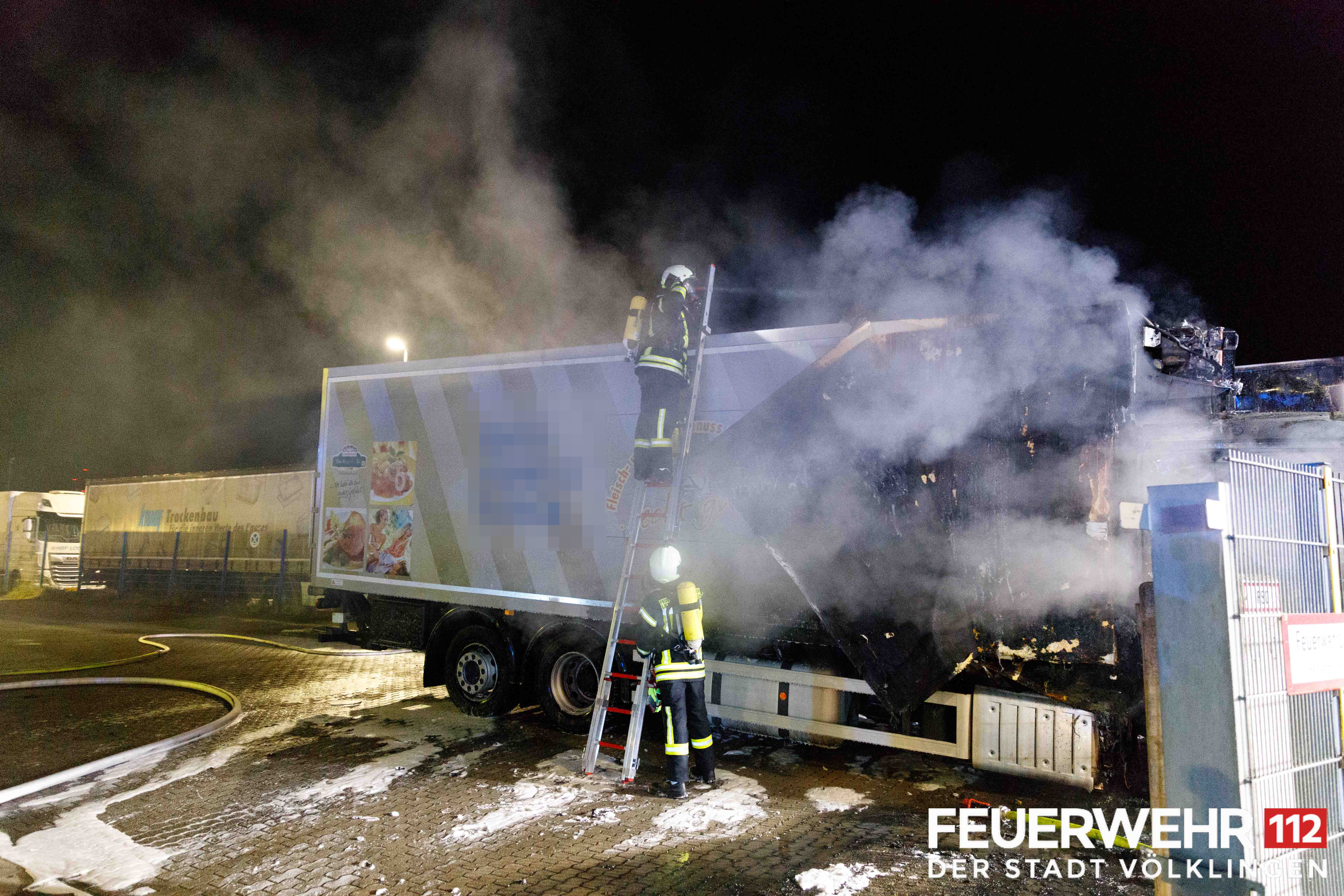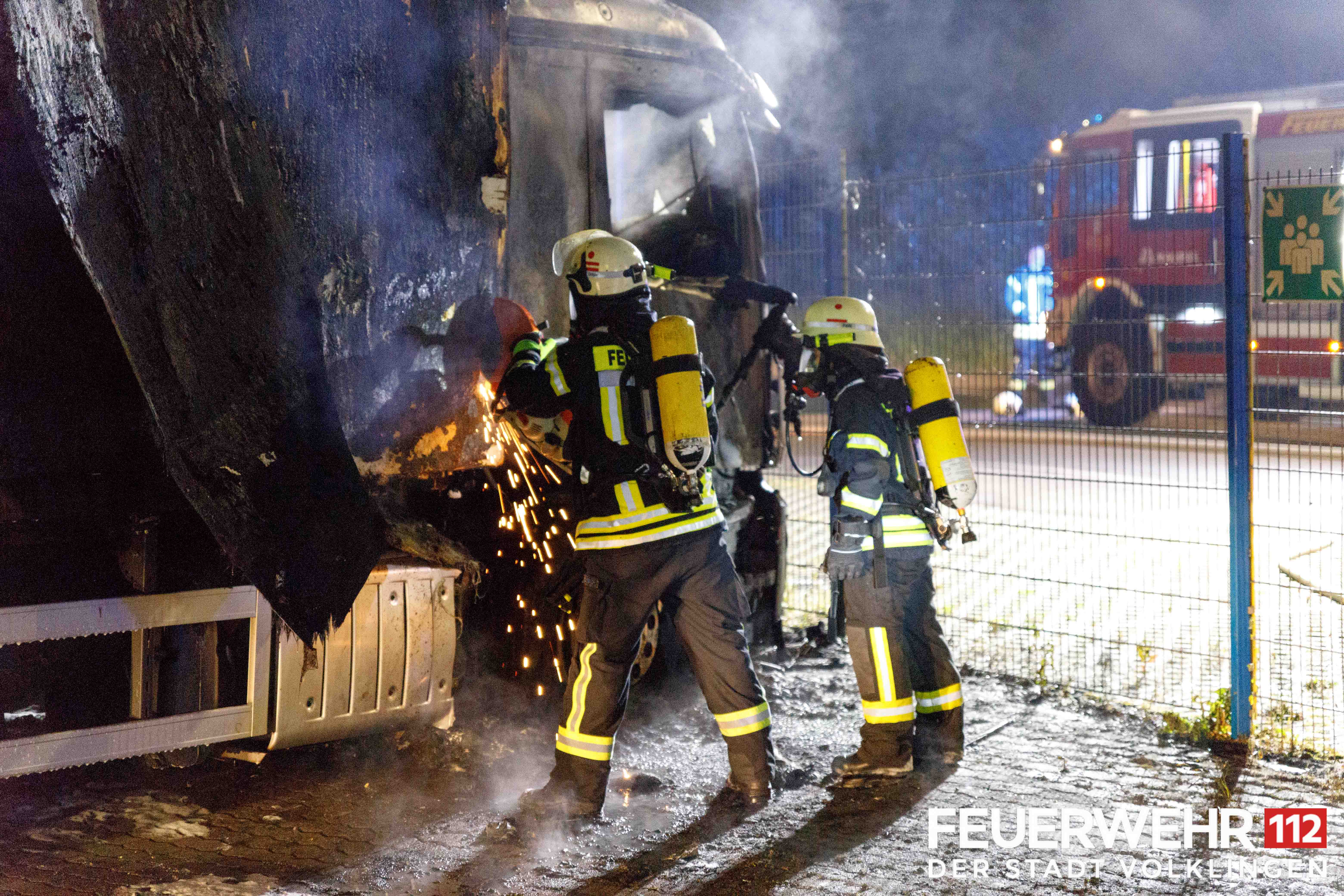 Die Feuerwehr wurde zum Brand eines LKWs auf einem Betriebsgelände alarmiert. Beim Eintreffen der Einsatzkräfte stand ein LKW in Vollbrand, das Feuer griff bereits auf einen Zweiten über. Trupps unter schwerem Atemschutz löschten den Brand mit C-Rohren und Schaumrohr ab. Anschließend konnte die Einsatzstelle an den Betreiber und die Polizei übergeben werden.