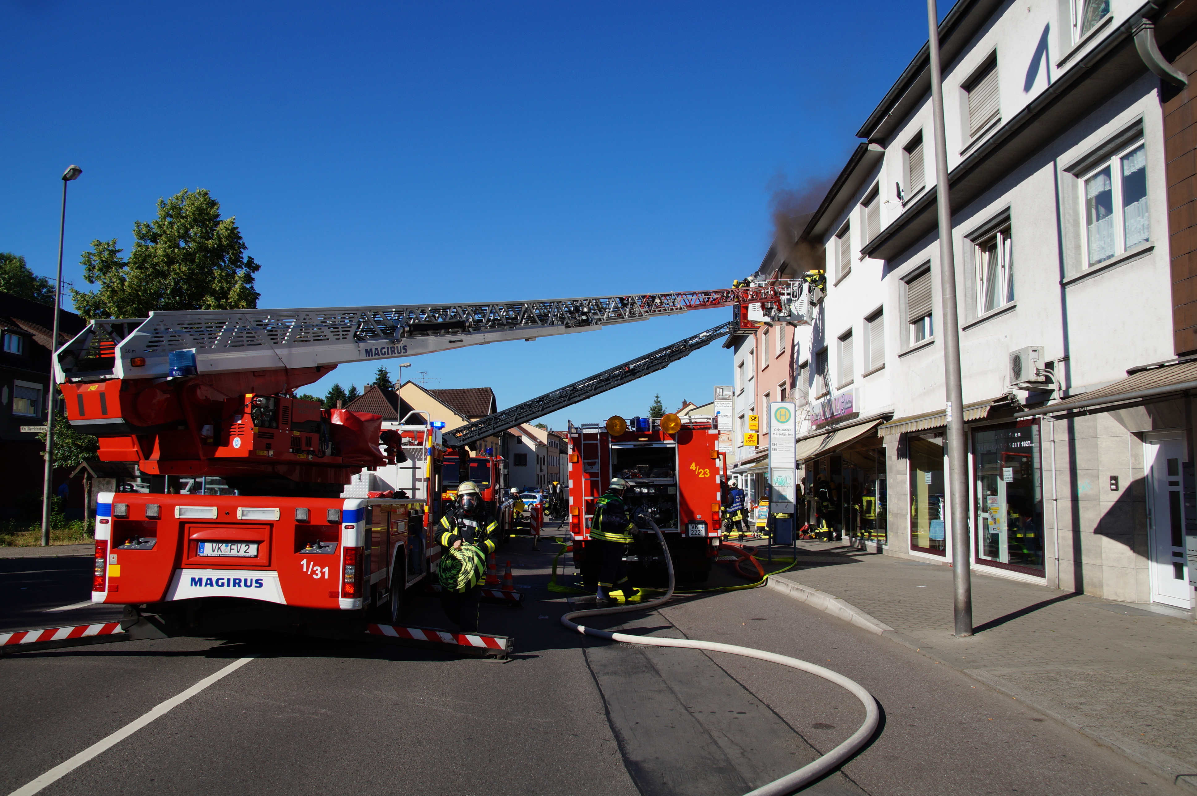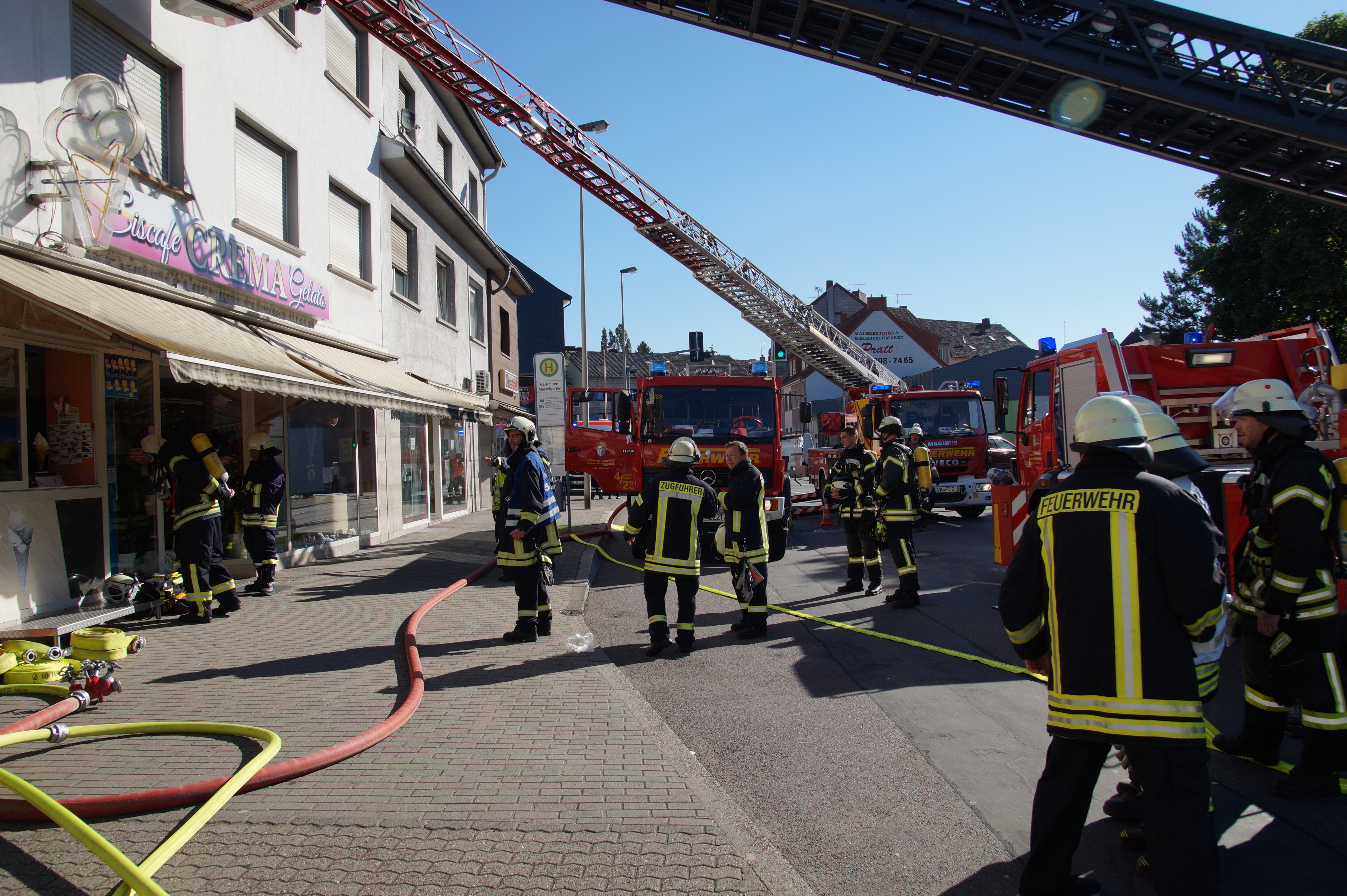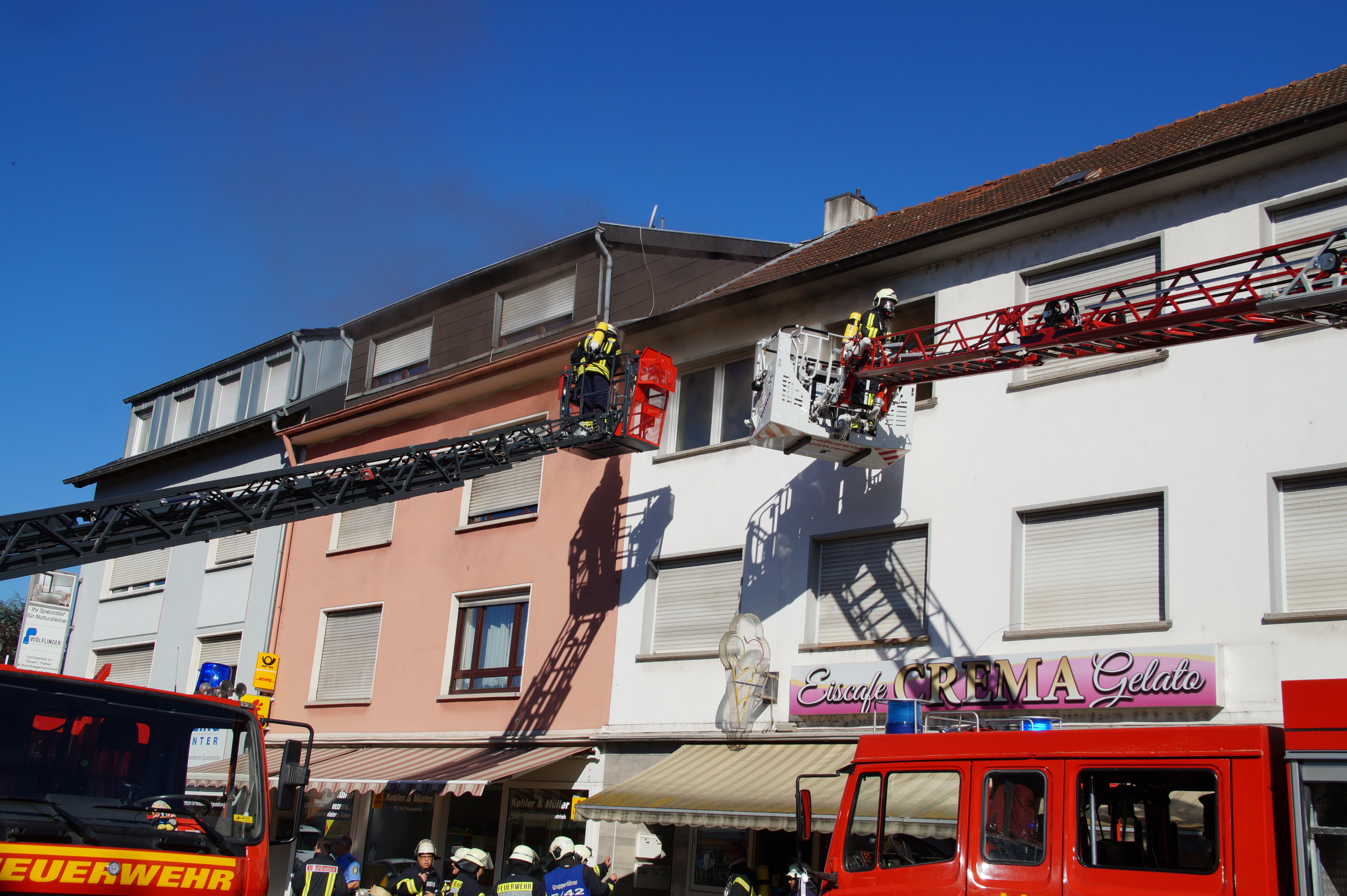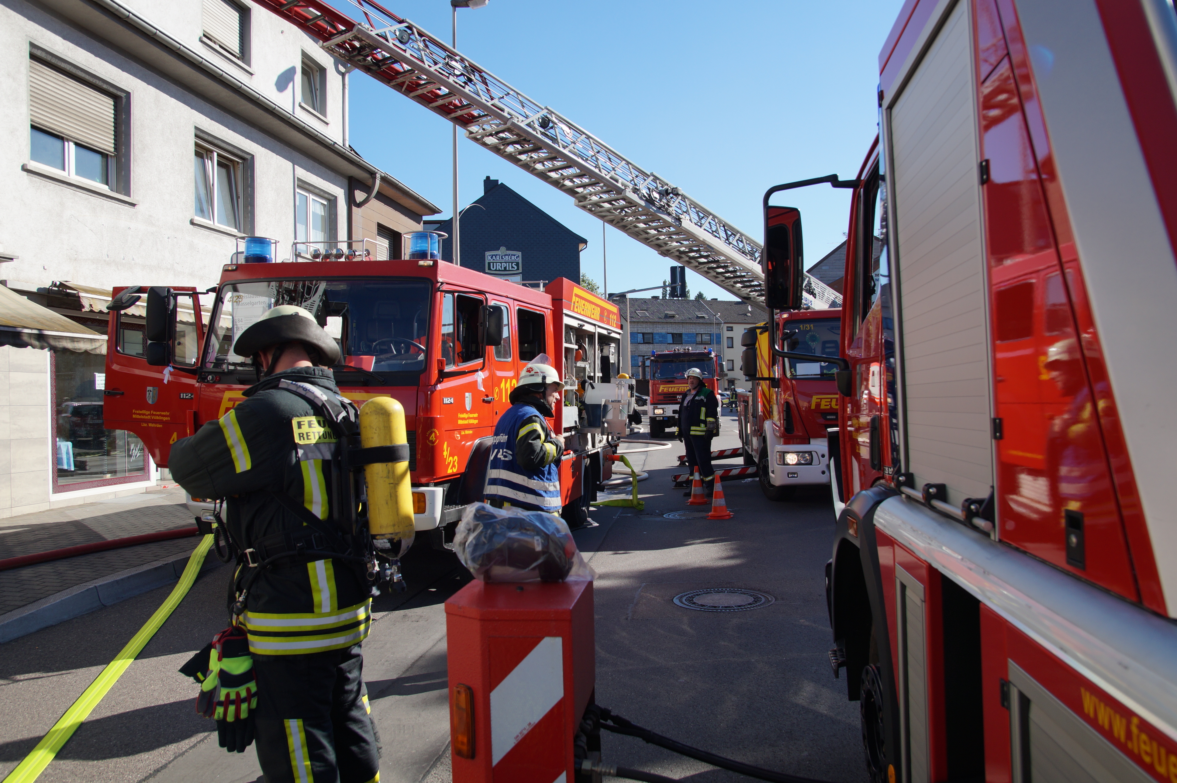 Die Feuerwehr wurde wegen einer Rauchentwicklung in einer Wohnung im 2. Obergeschoss eines Mehrfamilien- und Geschäftshauses alarmiert. Da beim Eintreffen der Einsatzkräfte nicht klar war, ob sich noch Personen in der betroffenen Wohnung aufhielten, wurde durch 1 Trupp unter schwerem Atemschutz sofort mit der Personensuche begonnen. Dieser Trupp konnte jedoch gleich Entwanrung geben. Ein weiterer Trupp unter Atemschutz leitete die Brandbekämpfung ein. Nachdem das eigentliche Feuer schnell abgelöscht war wurde das Gebäude mittels Hochdrucklüfter rauchlos gemacht und anschließend der der Polizei übergeben.
