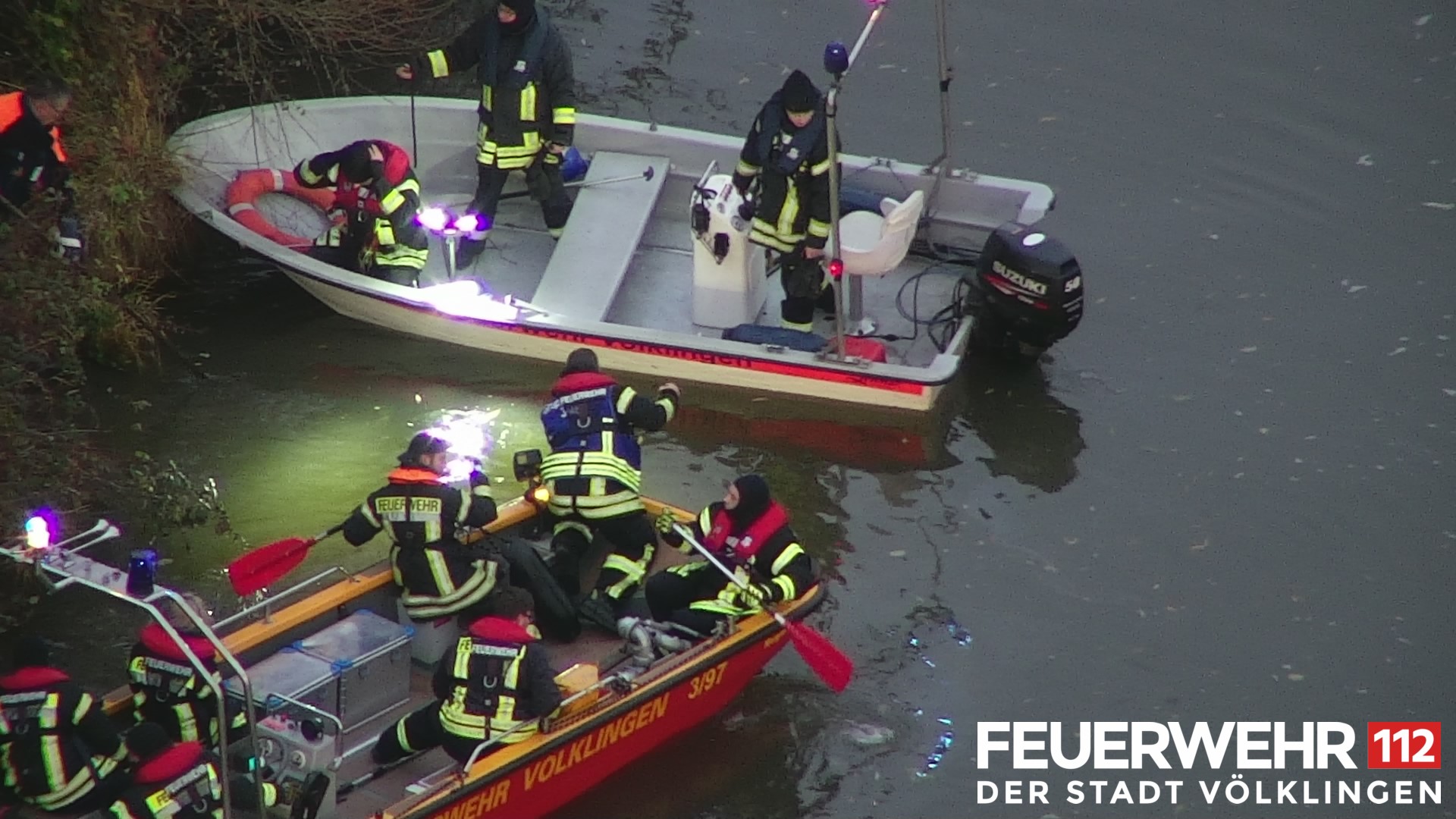 Die Feuerwehr Völklingen wurde wegen eines Ölfilms auf der Saar im Bereich der Karolinger Brücke alarmiert. Die Einsatzkräfte kontrollierten mit den beiden Booten der Wasserrettung den betroffenen Bereich. Zusätzlich wurde der Quadrokopter eingesetzt um den Ölfilm zu lokalisieren und zu dokumentieren. Es wurde festgestellt, dass der Ölfilm seinen Anfang in Höhe eines Treppenzugangs zur Saar hatte. Da hier keine Ursache gefunden werden konnte, wurde seitens der Wasserschutzpolizei entschieden am nächsten Tag Taucher in diesen Bereich zu entsenden. Ein weiterer Einsatz der Feuerwehrkräfte war nicht notwendig.