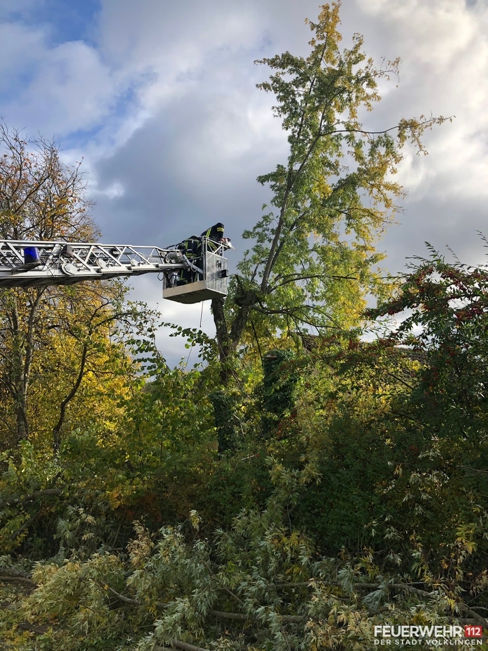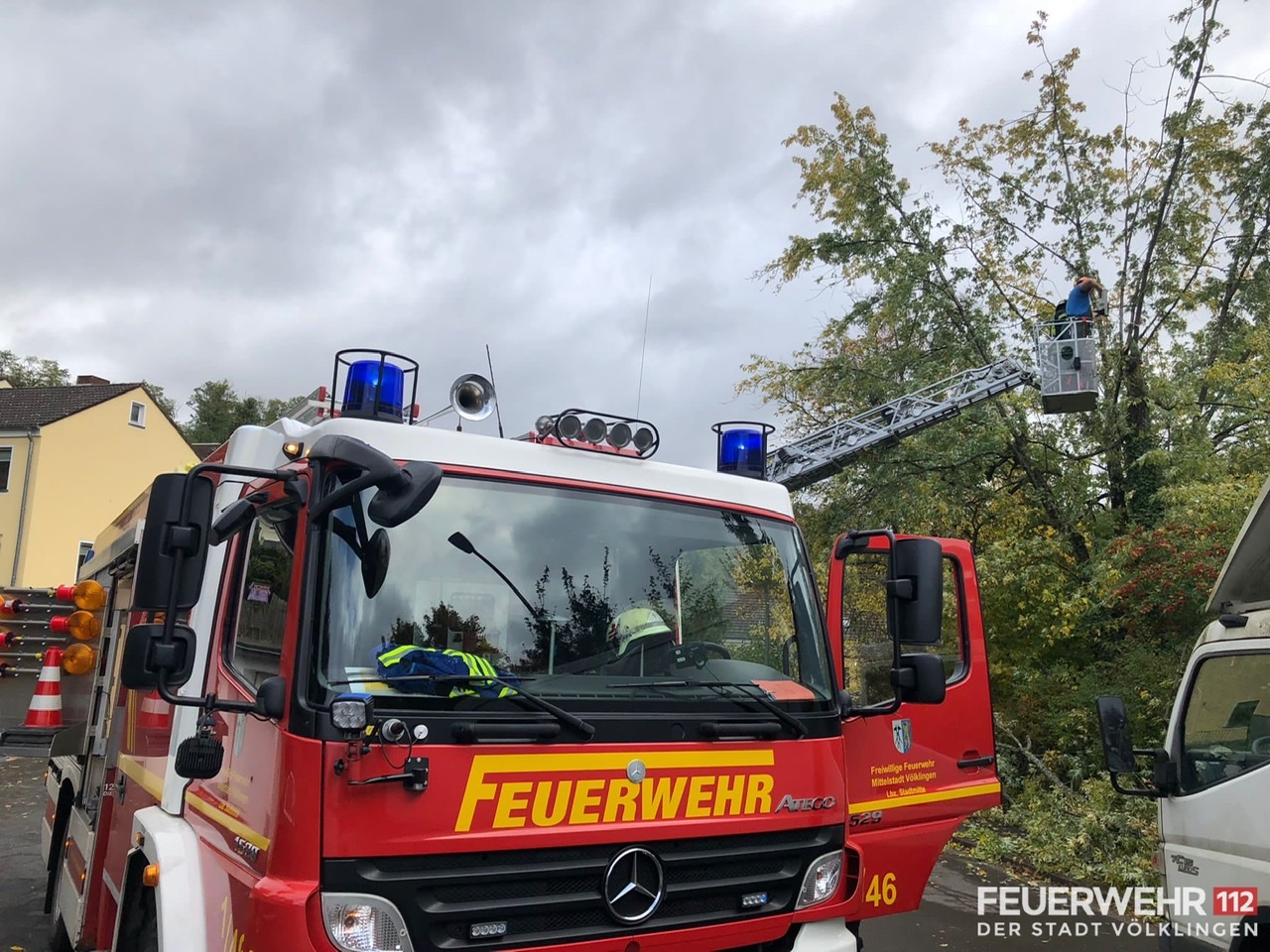 Die Feuerwehr wurde im Zeitraum vom 5:00-14:00 Uhr zu zehn unwetterbedingten Einsätzen im Stadtgebiet alarmiert. Dabei drohten mehrere Bäume auf Straße oder Gebäude zu fallen. Des Weiteren drohten Holzbalken an einem Kirchturm auf den Geweg zu stürzen, sodass Diese vorsorglich mittels Drehleiter entfernt wurden.