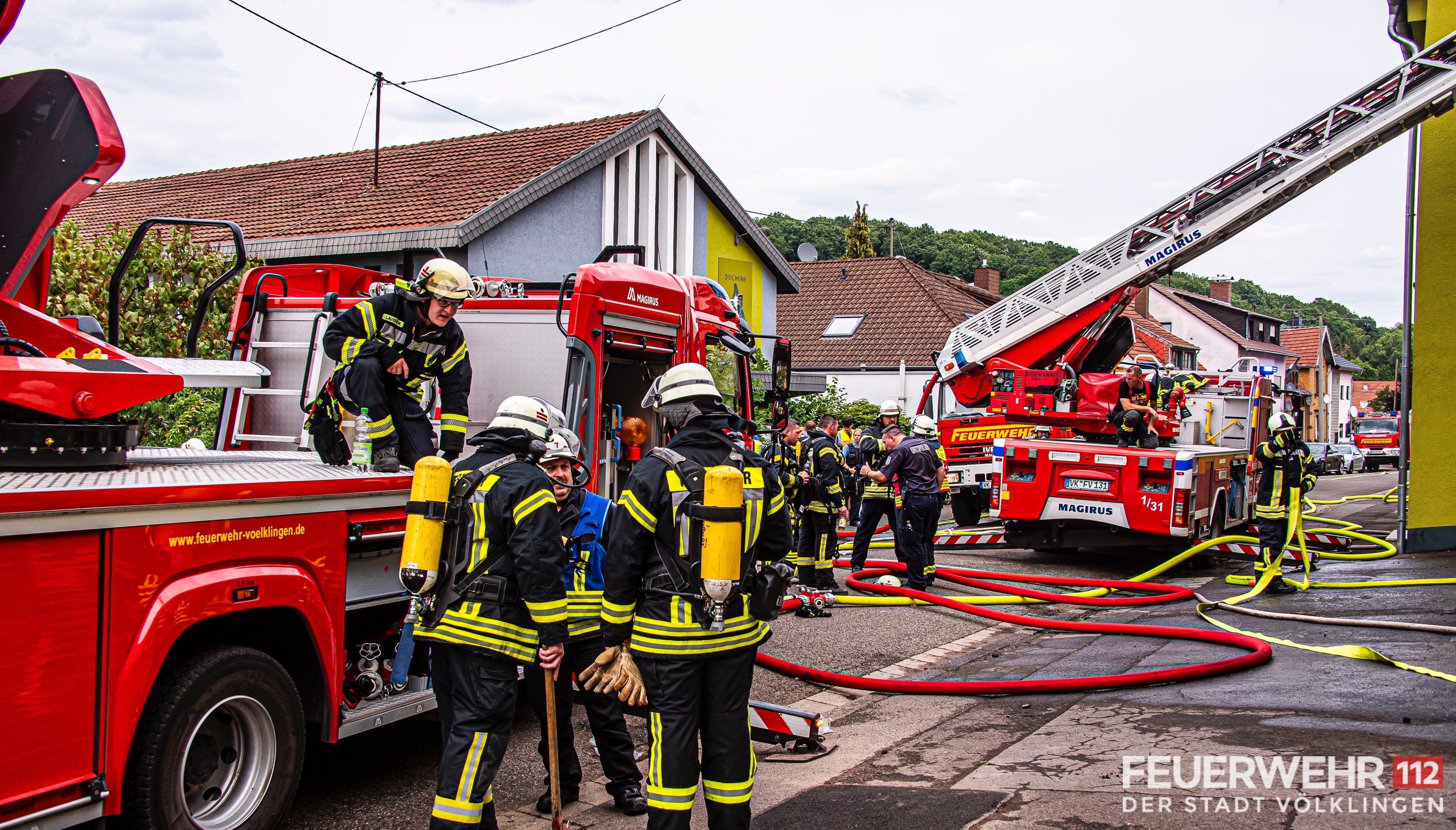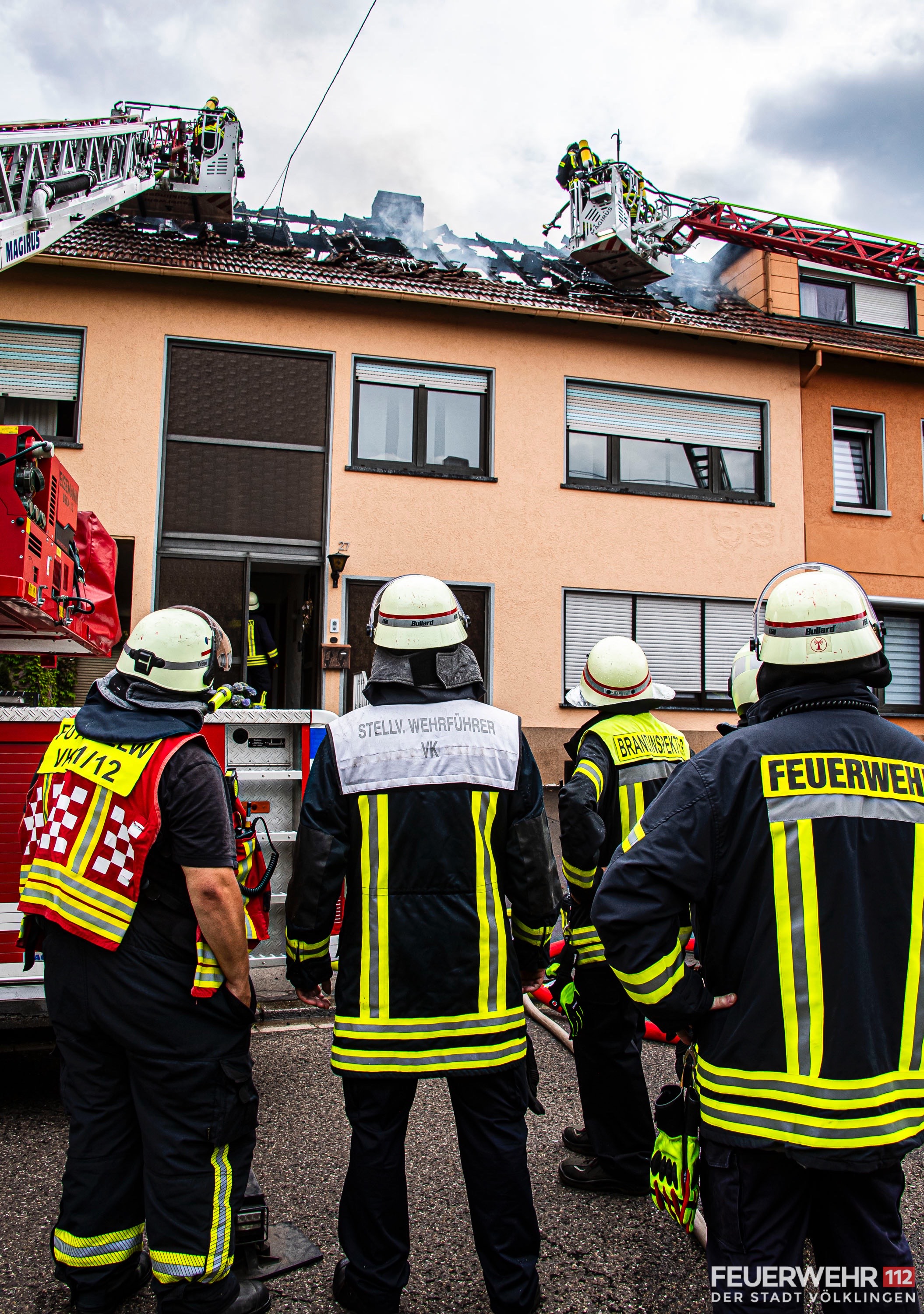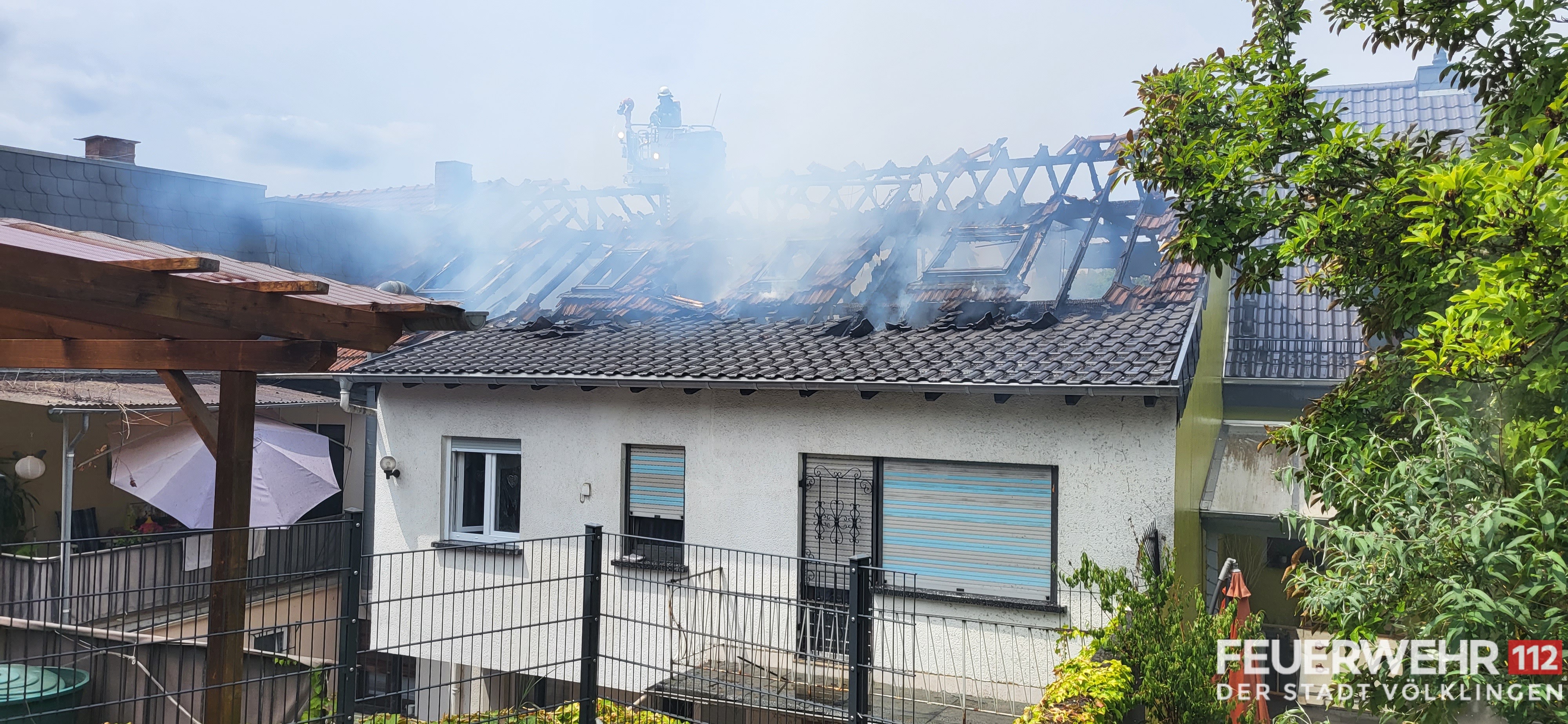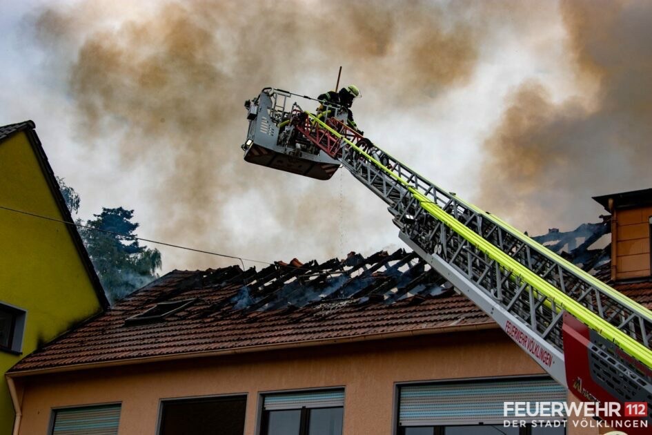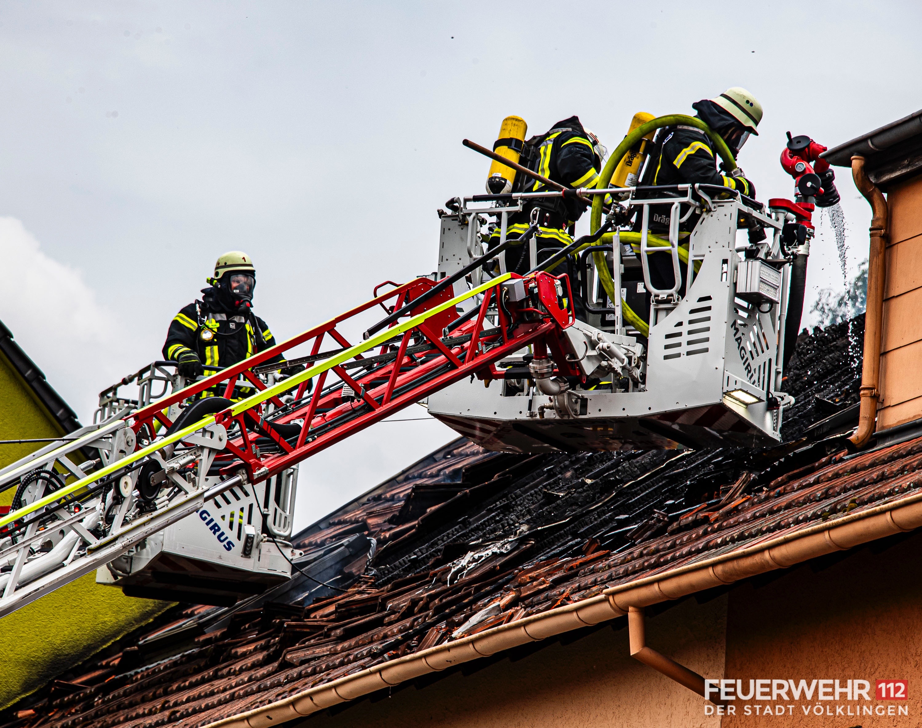 Die Feuerwehr wurde zu einer unklaren Rauchentwicklung aus einem Dachfenster in die Karlsbrunner Straße im Ortsteil Ludweiler alarmiert. Bereit auf Anfahrt war weitreichend eine starke Rauchentwicklung zu sehen, sodass unmittelbar eine Alarmstufenerhöhung durch den Einsatzleiter veranlasst wurde. Beim Eintreffen der ersten Kräfte stand der Dachstuhl des beidseitig angebauten Mehrfamilienhauses in Vollbrand und drohte auf weitere Gebäude überzugreifen. Mehrere Trupps unter Atemschutz im Gebäude, sowie zwei Drehleitern im Außenbereich wurden zur Brandbekämpfung in Stellung gebracht, sodass das Feuer schnell unter Kontrolle gebracht werden konnte. Das Übergreifen auf den Dachbereich eines weiteren Gebäudes konnte dennoch nicht gänzlich verhindert werden. Die Nachlöscharbeiten gestalteten sich aufgrund der massiven Zerstörung im Dachgeschoss als langwierig und schwierig. Eine Brandwache des Löschbezirk Ludweiler übernahm nach der Meldung "Feuer aus" für weitere drei Stunden die Beaufsichtigung des Gebäudes um weitere Glutnester zu lokalisieren und ein Wiederaufflammen zu verhindern. Das Gebäude ist durch Feuer und Rauch derzeit nicht bewohnbar. Abschließend wurde die Einsatzstelle an die Polizei zur Brandursachenermittlung übergeben.