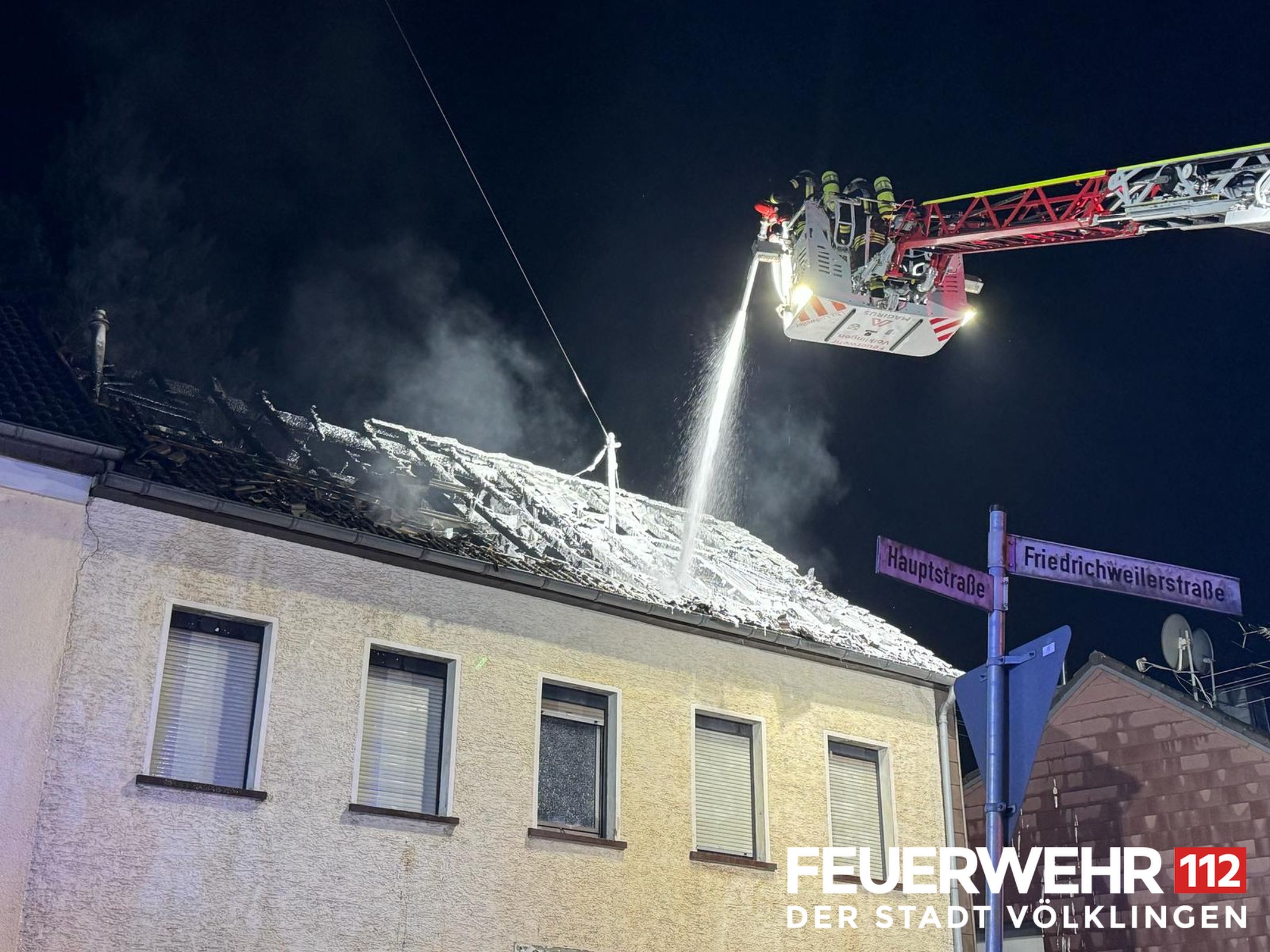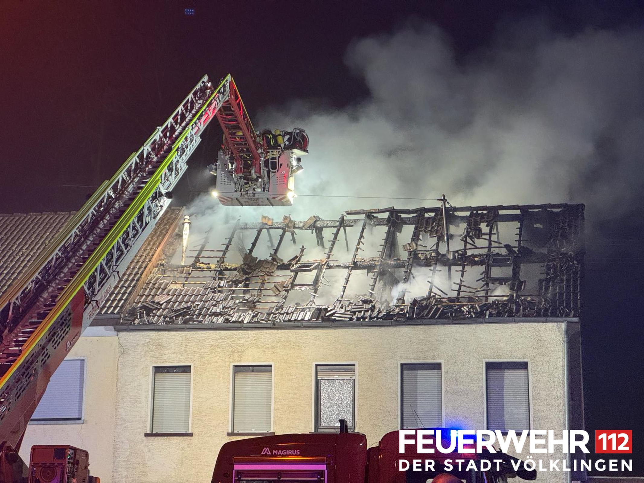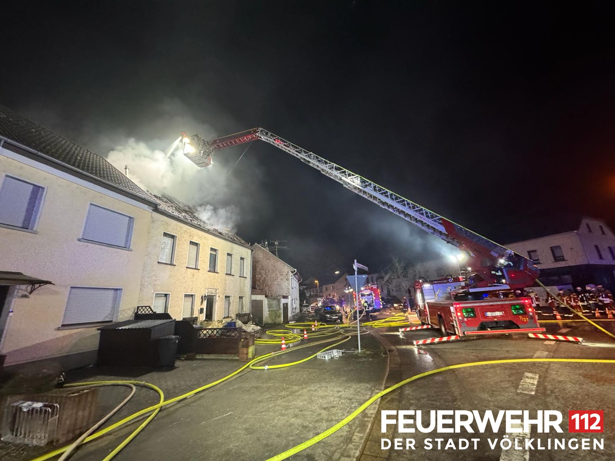 Die Drehleiter des Löschbezirkes Ludweiler wurde zur Unterstützung der FF Wadgassen zu einem Dachstuhlbrand alarmiert. Bei Ankunft bestätigte sich die gemeldete Lage und der Dachstuhl stand bereits in Vollbrand, alle Personen hatten das Gebäude bereits verlassen. Die Einsatzkräfte löschten umgehend das Feuer mittels Wenderohr über die Drehleiter und legten anschließend einen Schaumteppich aus. Weiterhin wurden die Kameraden mit Kalt-und Warmgetränken versorgt. Der Energieversorger schaltete das Gebäude stromlos. Anschließend konnte der Einsatz für die Feuerwehr Völklingen beendet werden, eine Brandwache durch die Kräfte aus Wadgassen wurde noch weiterhin gestellt.