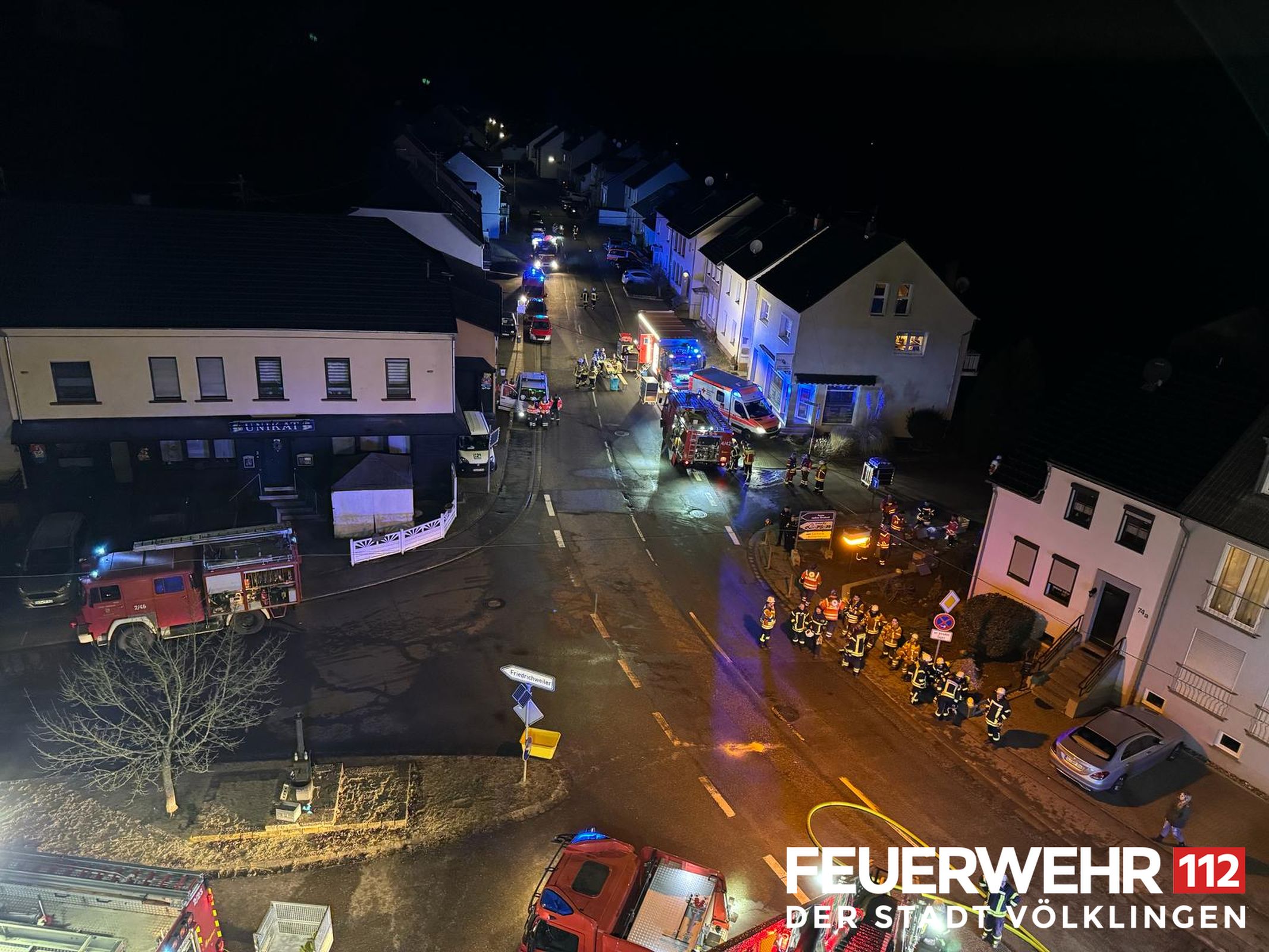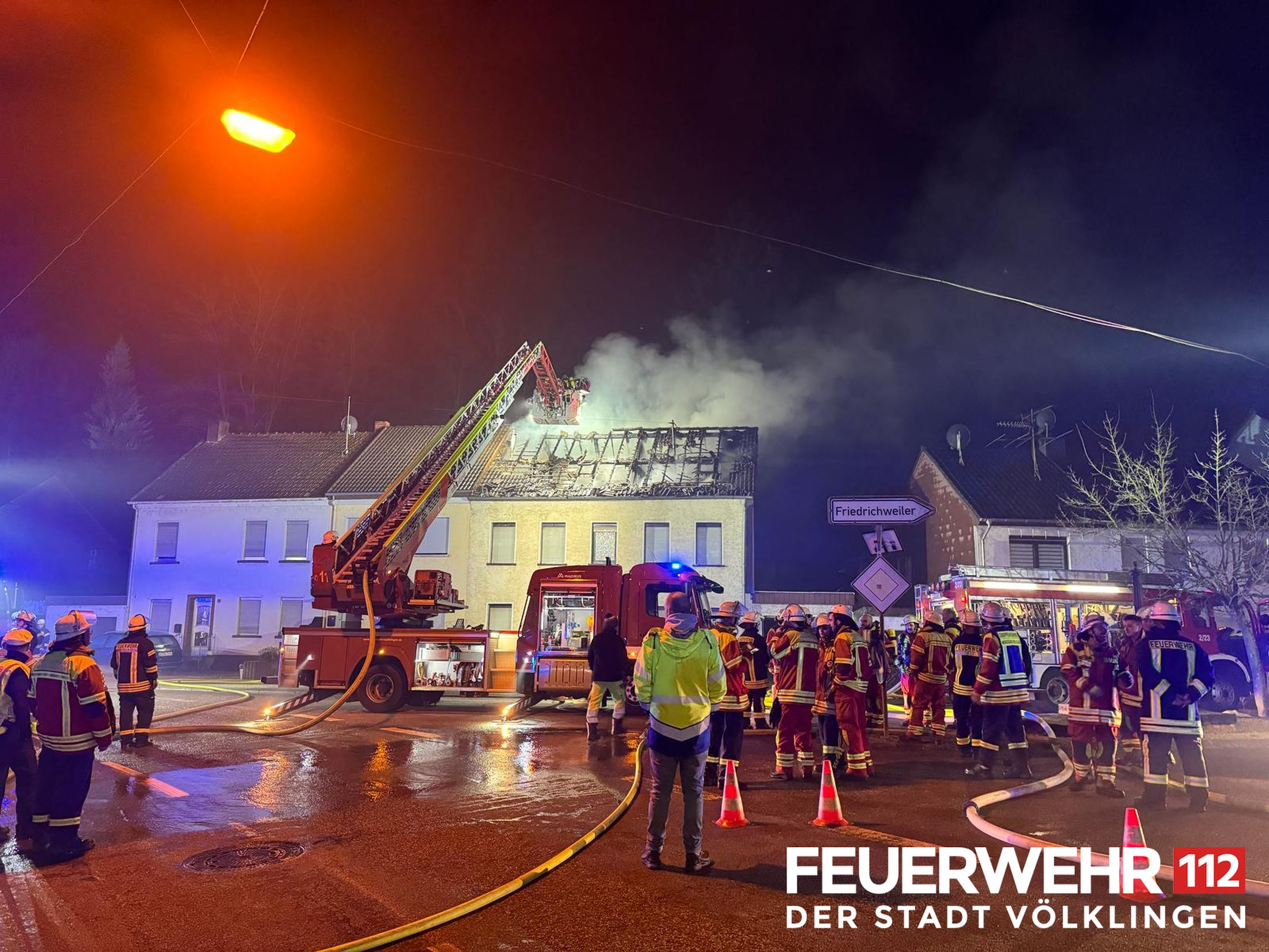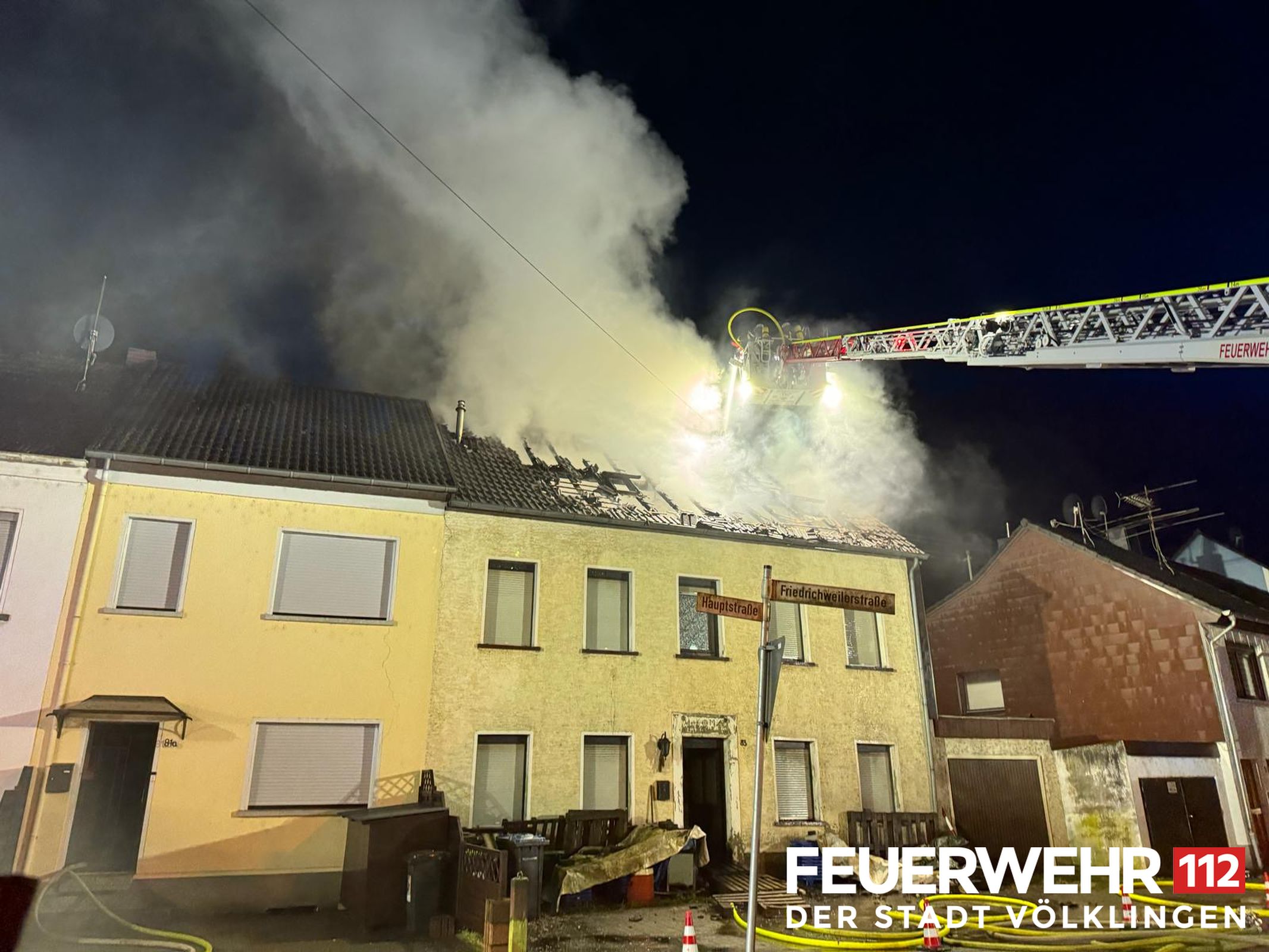 Die Drehleiter des Löschbezirkes Ludweiler wurde zur Unterstützung der FF Wadgassen zu einem Dachstuhlbrand alarmiert. Bei Ankunft bestätigte sich die gemeldete Lage und der Dachstuhl stand bereits in Vollbrand, alle Personen hatten das Gebäude bereits verlassen. Die Einsatzkräfte löschten umgehend das Feuer mittels Wenderohr über die Drehleiter und legten anschließend einen Schaumteppich aus. Weiterhin wurden die Kameraden mit Kalt-und Warmgetränken versorgt. Der Energieversorger schaltete das Gebäude stromlos. Anschließend konnte der Einsatz für die Feuerwehr Völklingen beendet werden, eine Brandwache durch die Kräfte aus Wadgassen wurde noch weiterhin gestellt.