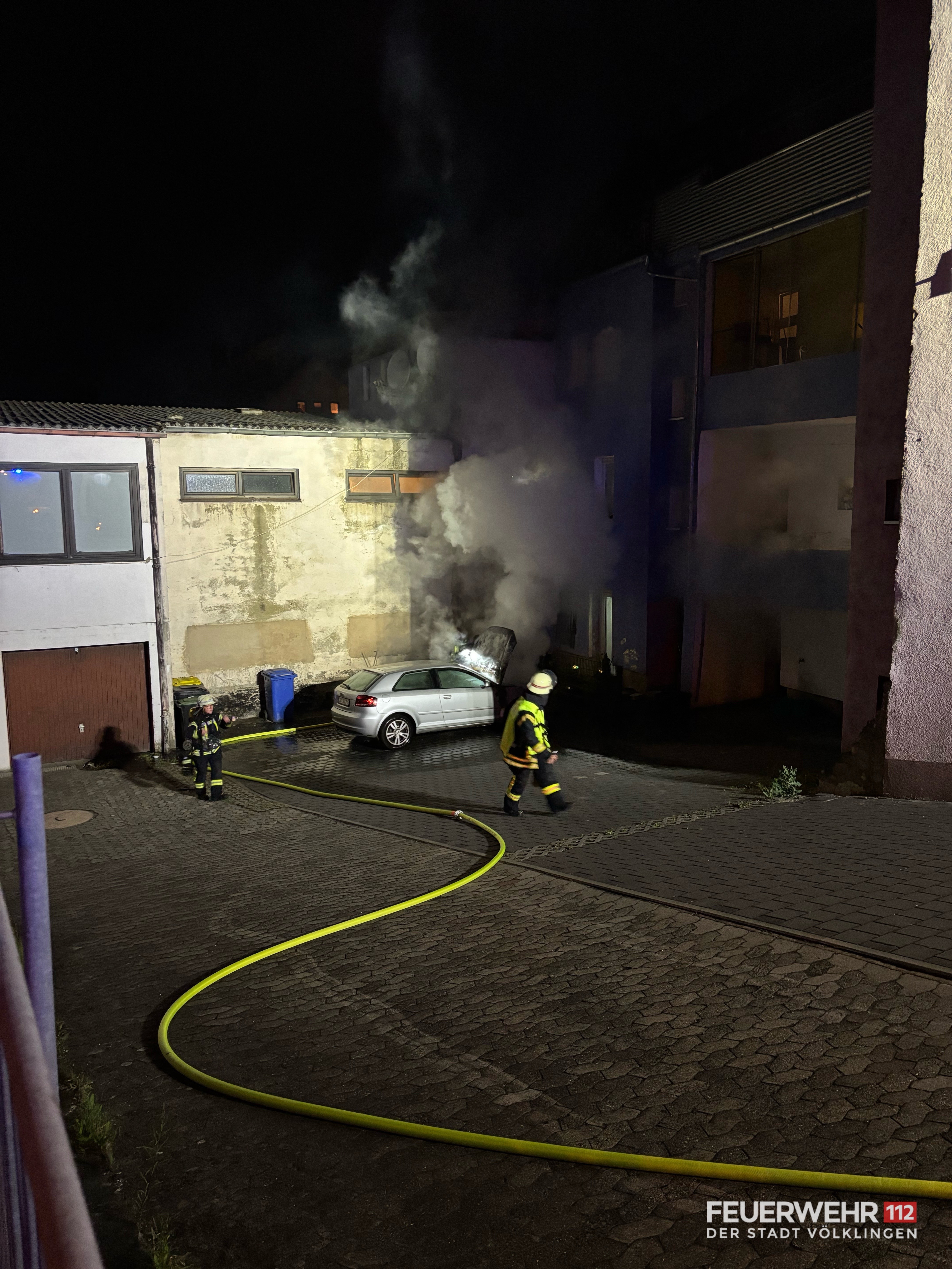 Die Feuerwehr wurde zu einem brennenden Pkw in die Straße des 13. Januar alarmiert. Beim Eintreffen der ersten Einsatzkräfte stand das Fahrzeug im Motorraum bereits in Vollbrand. Aufgrund der starken Rauch- und Hitzeentwicklung bestand die Gefahr, dass das Feuer auf angrenzende Gebäude übergreift.
