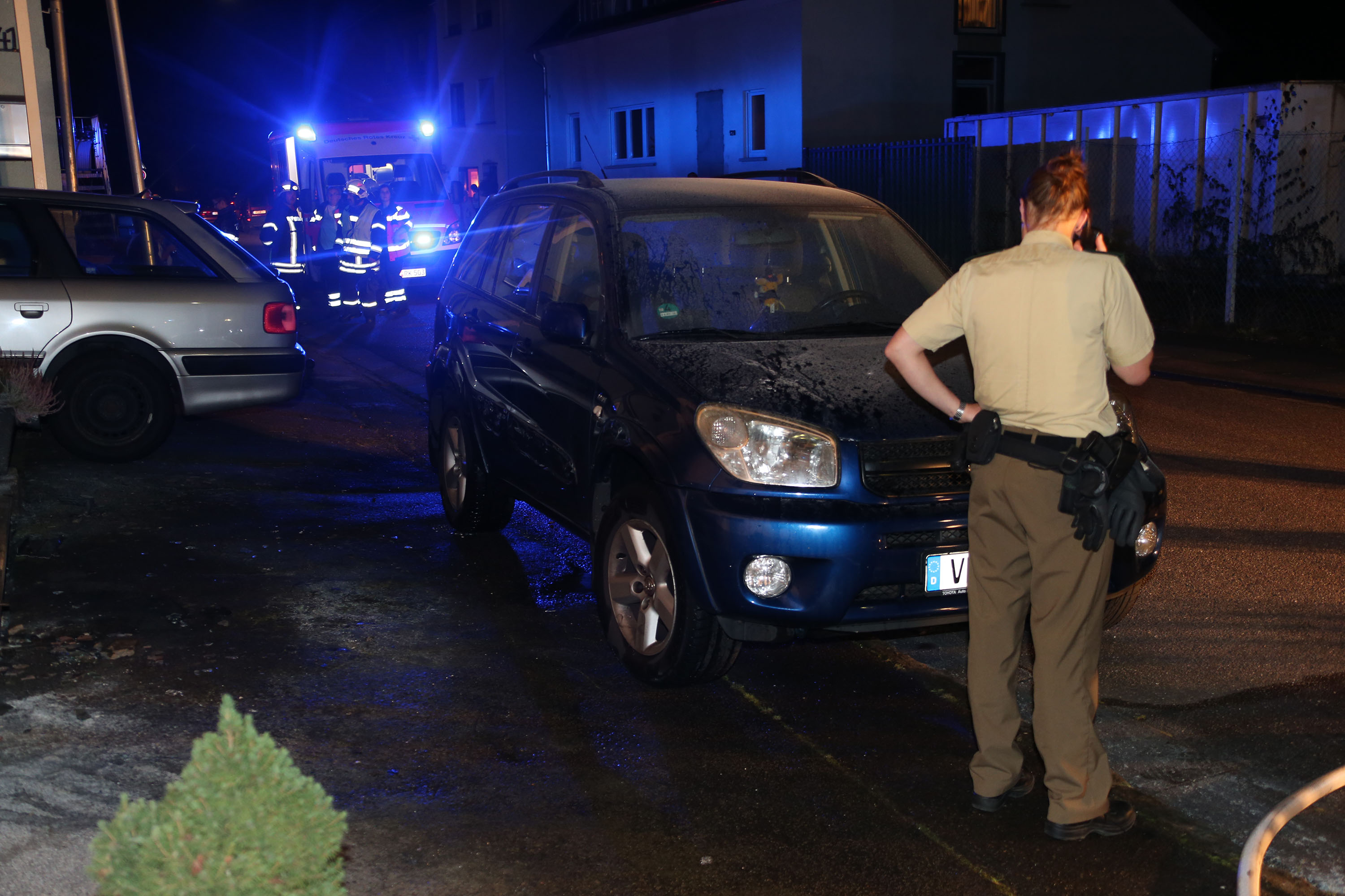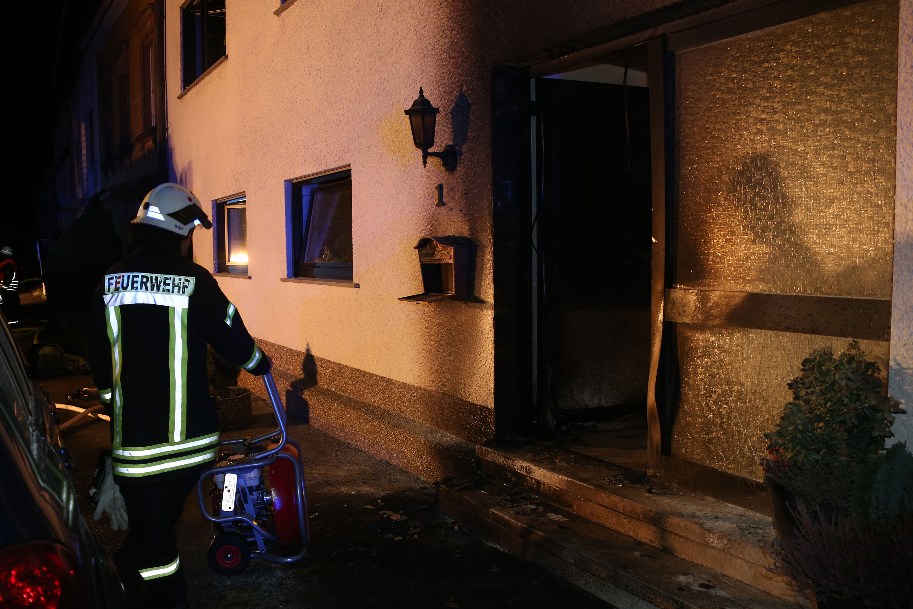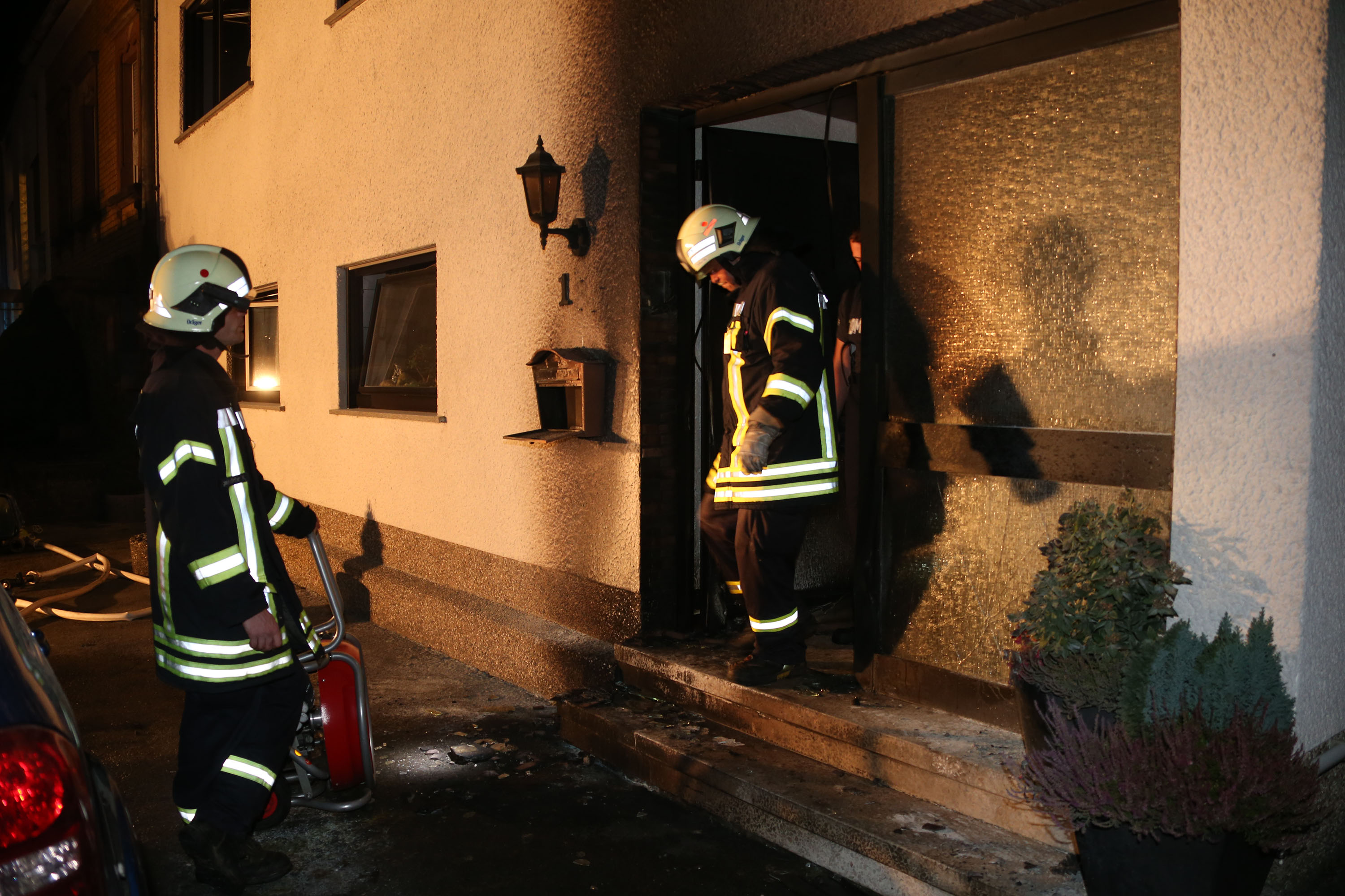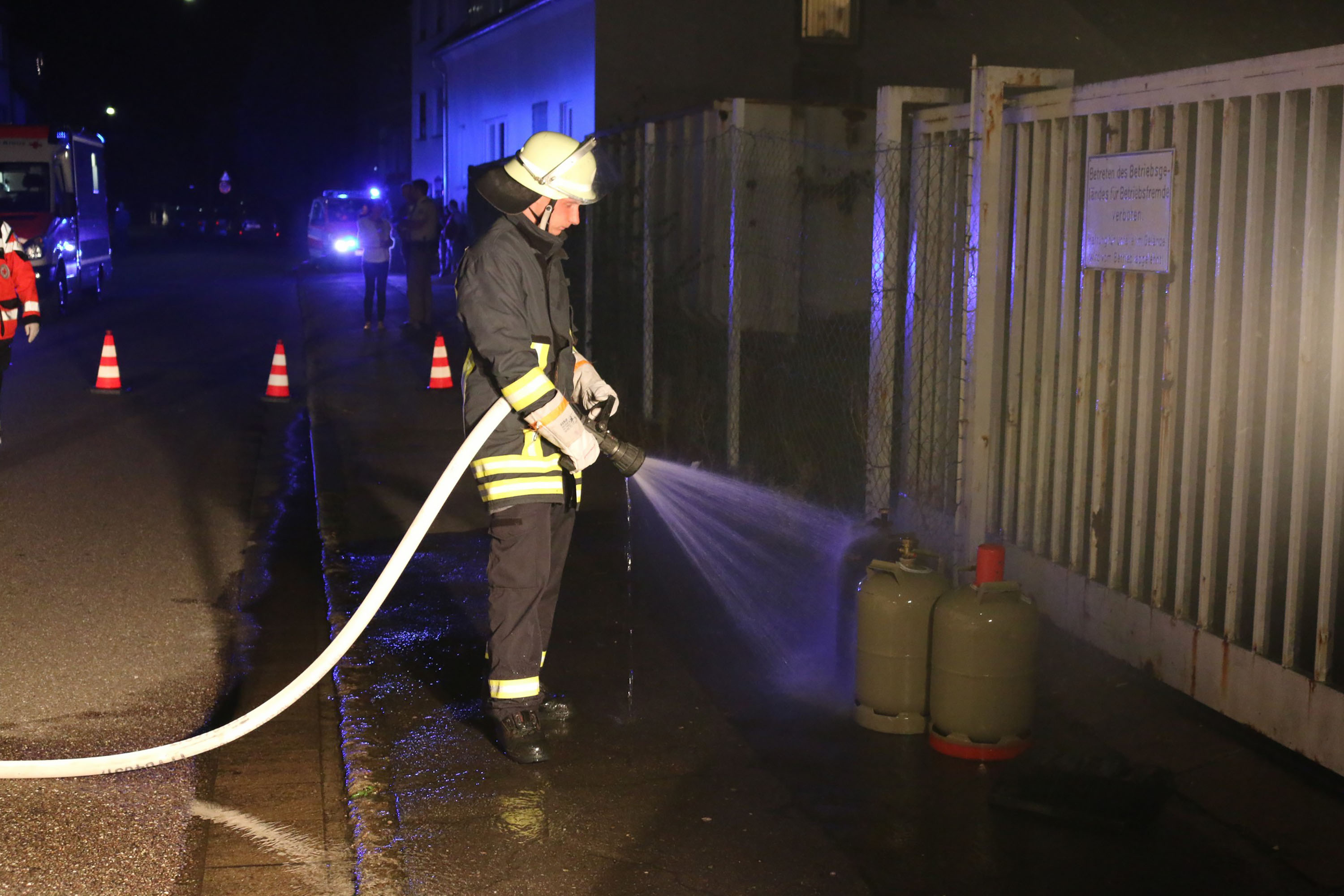 Bei Eintreffen der Feuerwehr stand der, durch Nachbarn mit einem Feuerlöscher gelöschte Ofen, vor dem Anwesen. Die Einsatzkräfte kühlten die betroffenen Gasflaschen und führten Nachlöscharbeiten durch. Des Weiteren wurde das Gebäude mittels Lüfter rauchfrei gemacht. Anschließend wurde die Einsatzstelle an die Polizei übergeben.