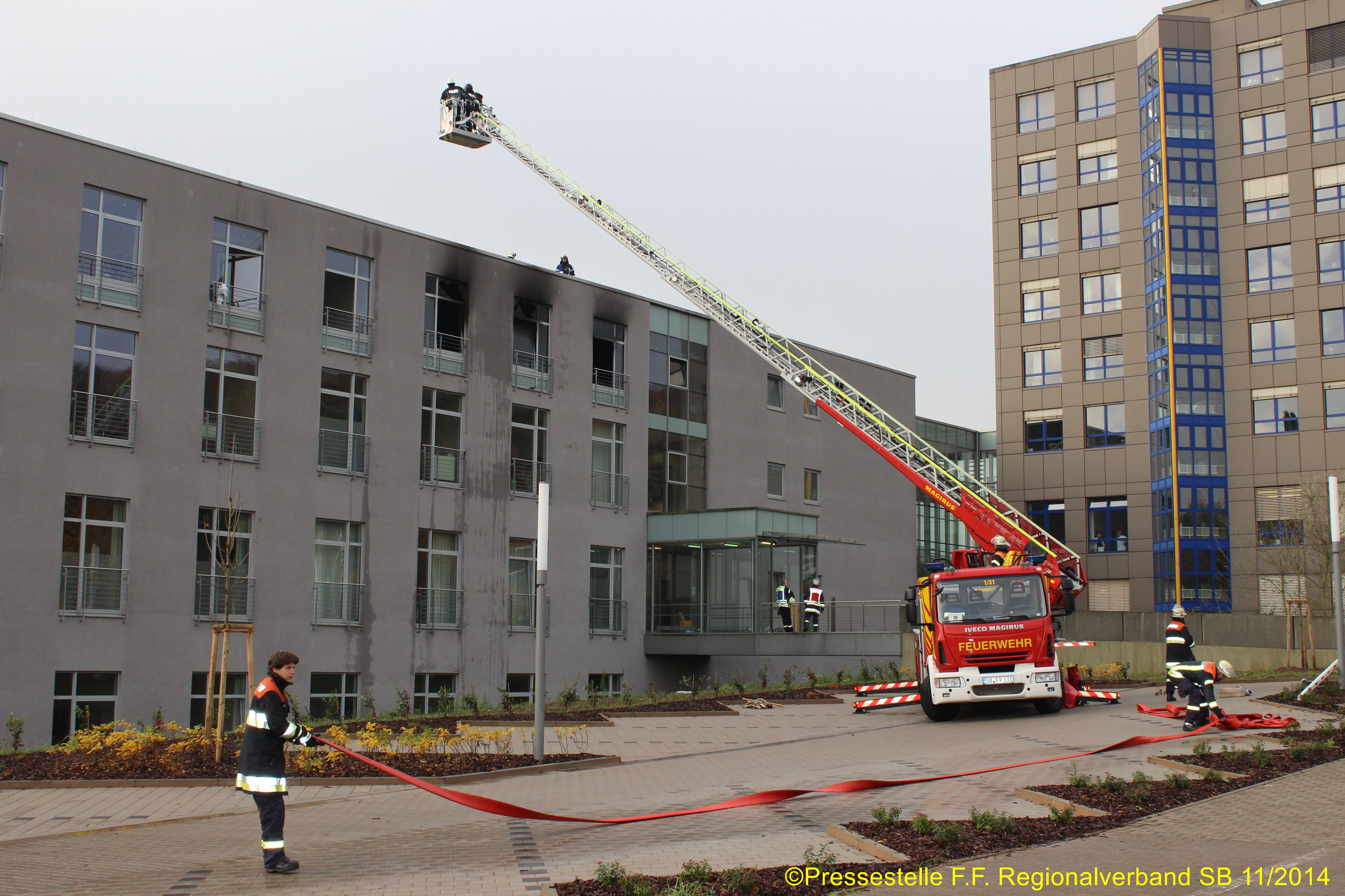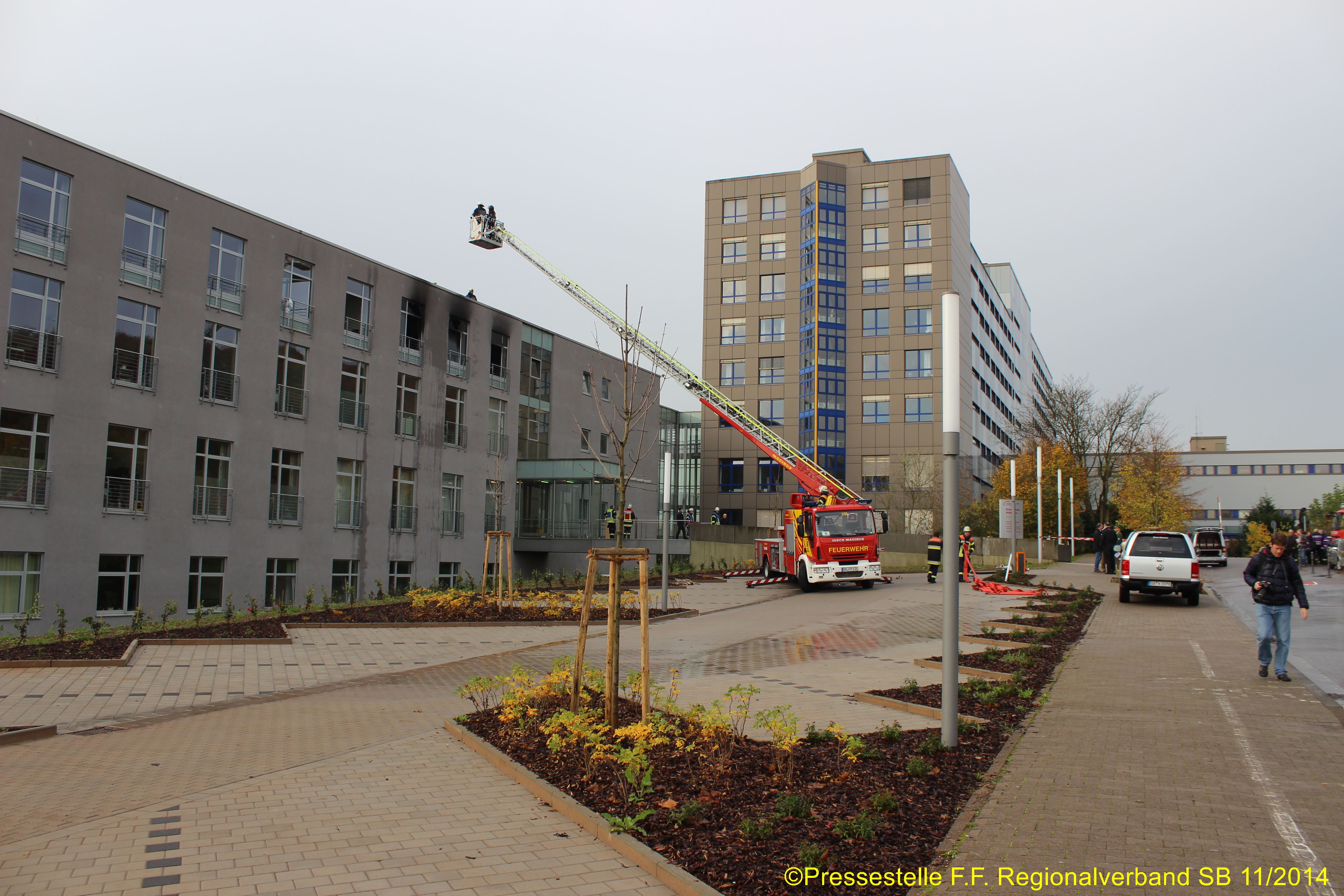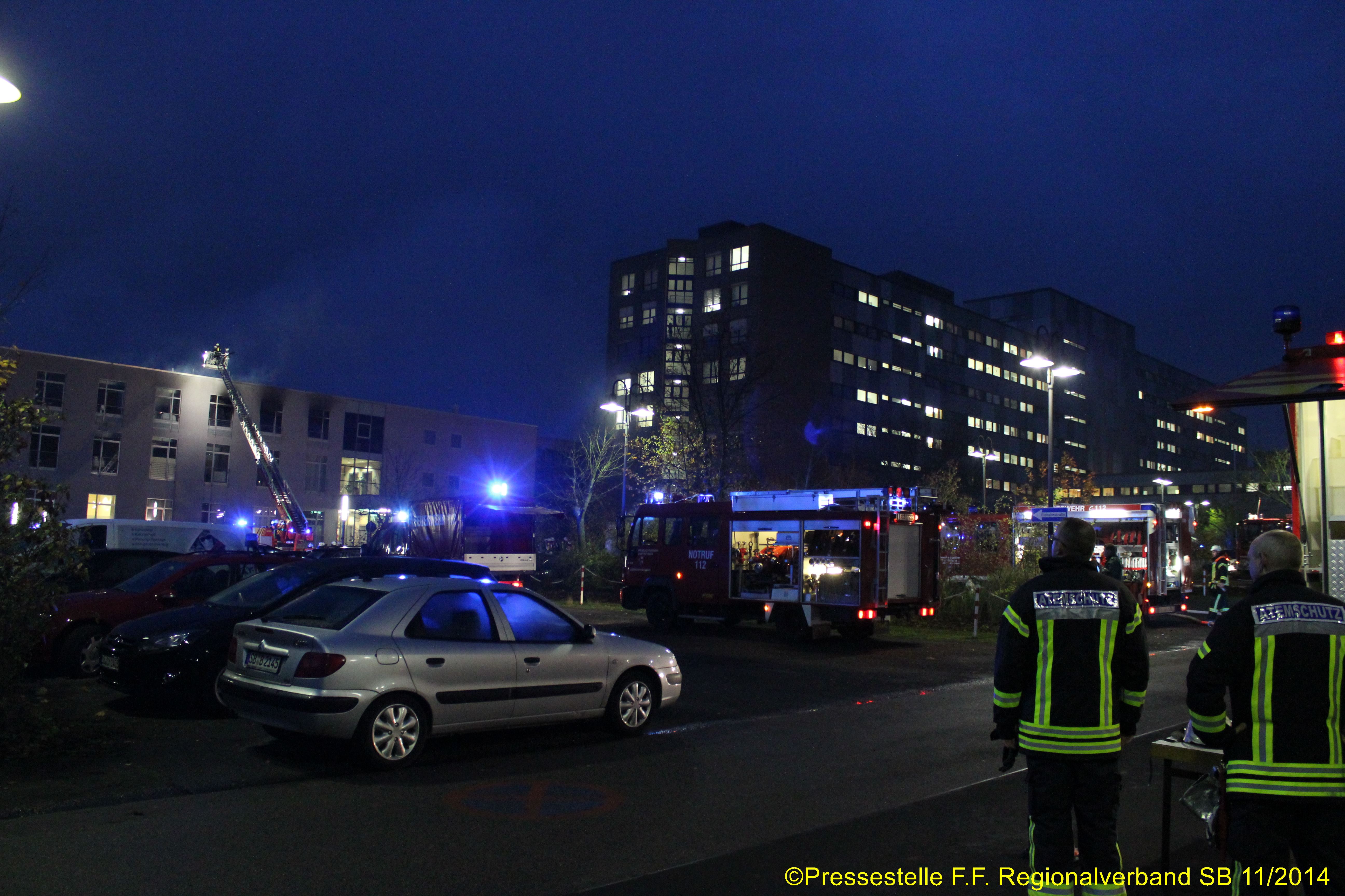 Die Feuerwehr Völklingen wurde zur Unterstützung alarmiert. Es brannte im 2. OG eines Klinikanbaus. Mehrere Trupps unter PA gingen zur Menschenrettung und Brandbekämpfung vor. In dem betroffenen Bereich befanden sich rd. 45 Patienten, die die Feuerwehr teilweise über Drehleitern rettete. Zwei Personen konnten nur noch tot geborgen werden.