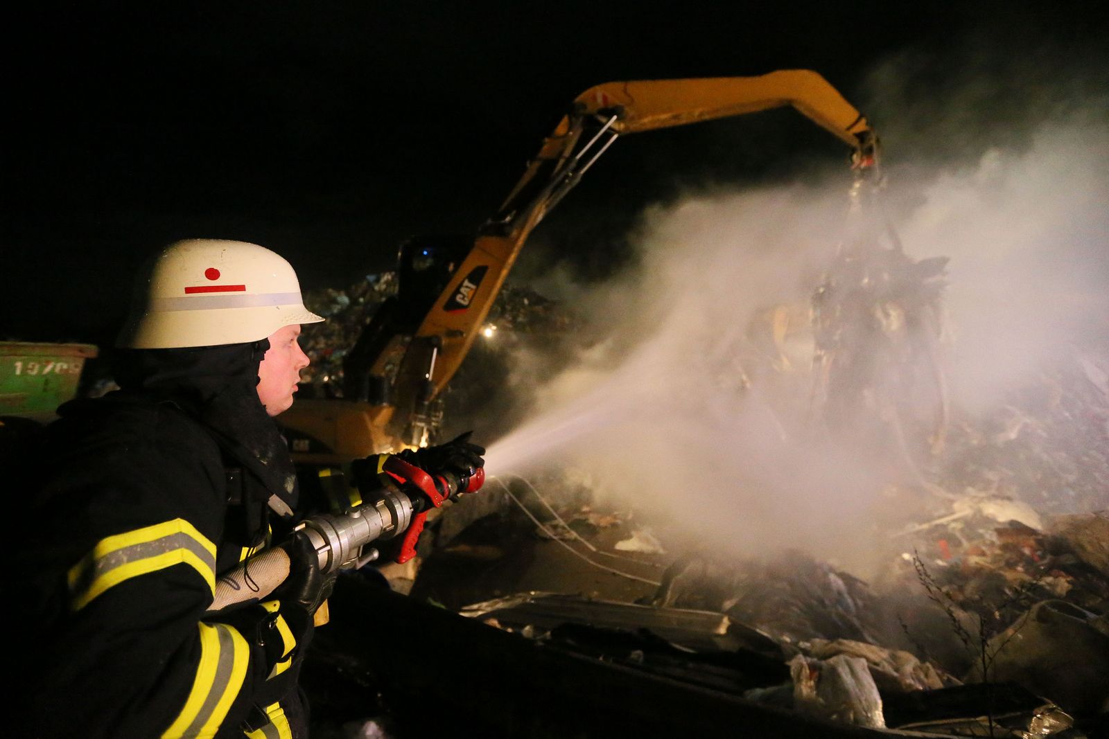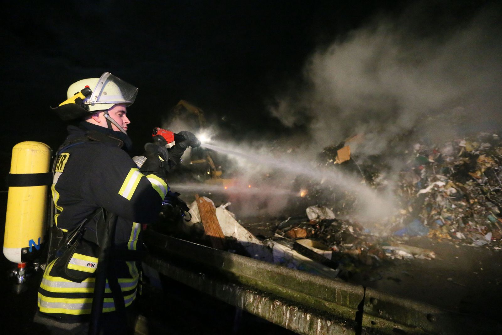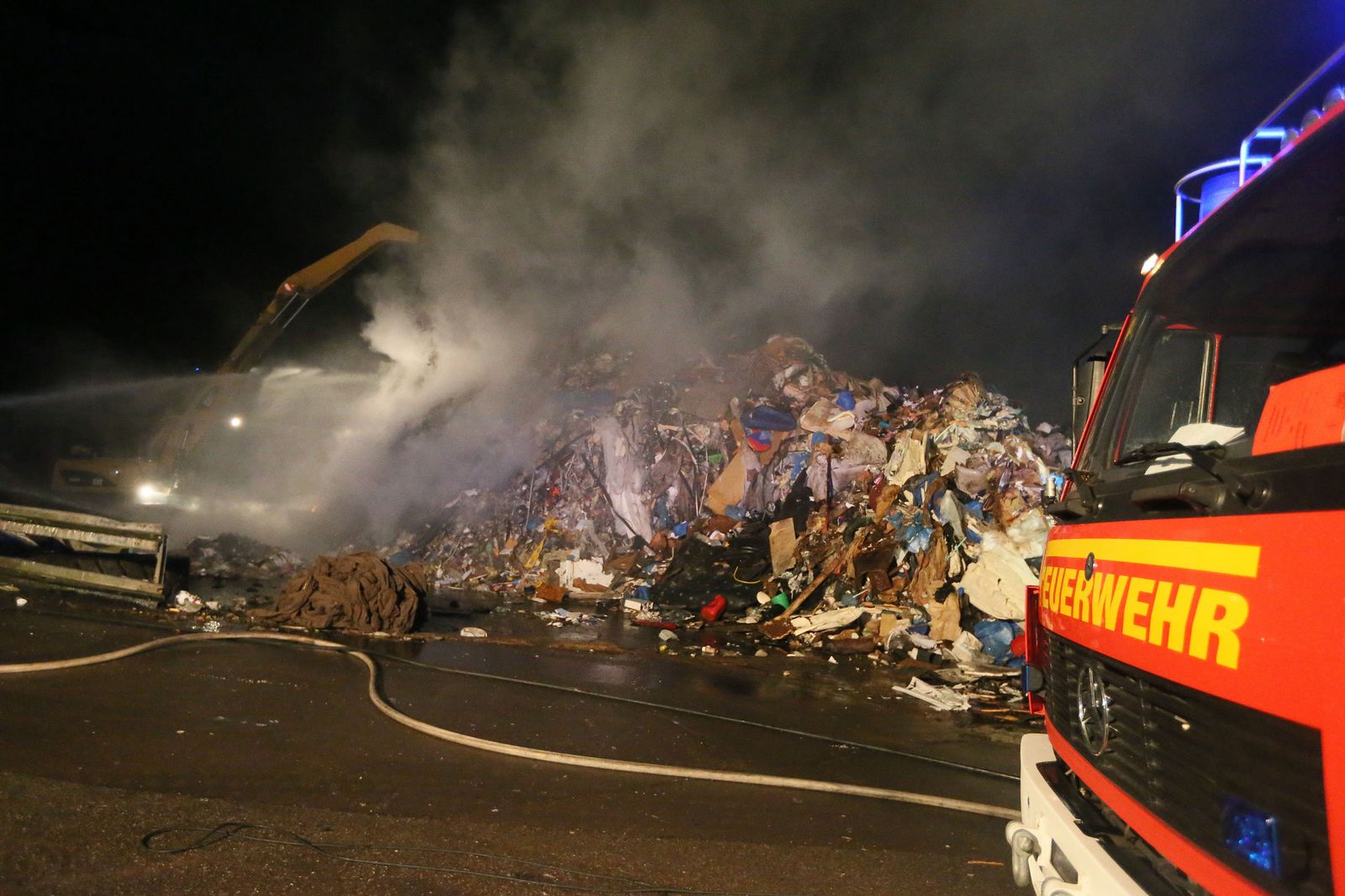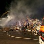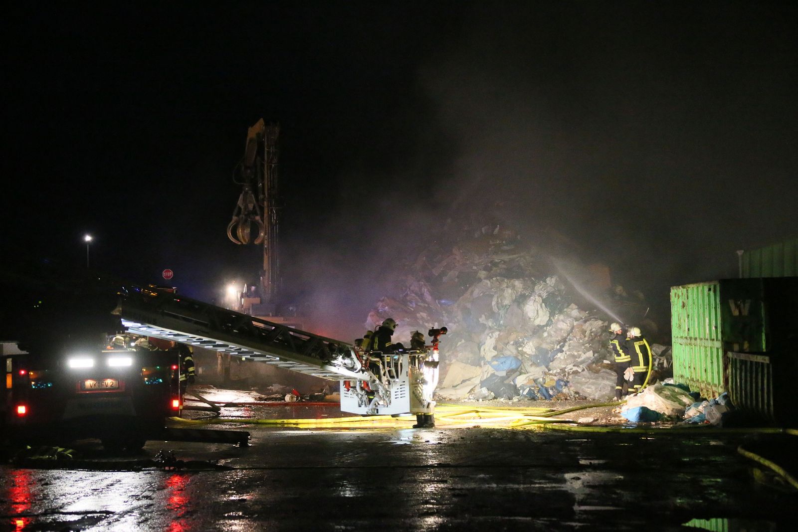 Beim Eintreffen der Feuerwehr brannte es in einem ca. 20 x 25 Meter großen, mehrere Meter aufgetürmten Wertstoffhaufen. Die Feuerwehr stellte die Wasserversorgung von der etwa 200 Meter entfernten Saar mit 2 Tragkraftspritzen zur Einsatzstelle in einem Wertstoffbetrieb her. Mit schwerem Gerät des Betreibers wurde der aufgetürmte Haufen abgetragen und gezielt abgelöscht. Anschließend wurde mit Schaummittel gelöscht. Im Einsatz befanden sich die Feuerwehr Völklingen mit fünf Löschbezirken und die Feuerwehr Wadgassen mit zwei Löschbezirken, insgesamt 18 Fahrzeugen und 100 Feuerwehrleuten. Ab etwa 3 Uhr war noch eine Gruppe (9 Personen) zur Überwachung der Einsatzstelle vor Ort.
