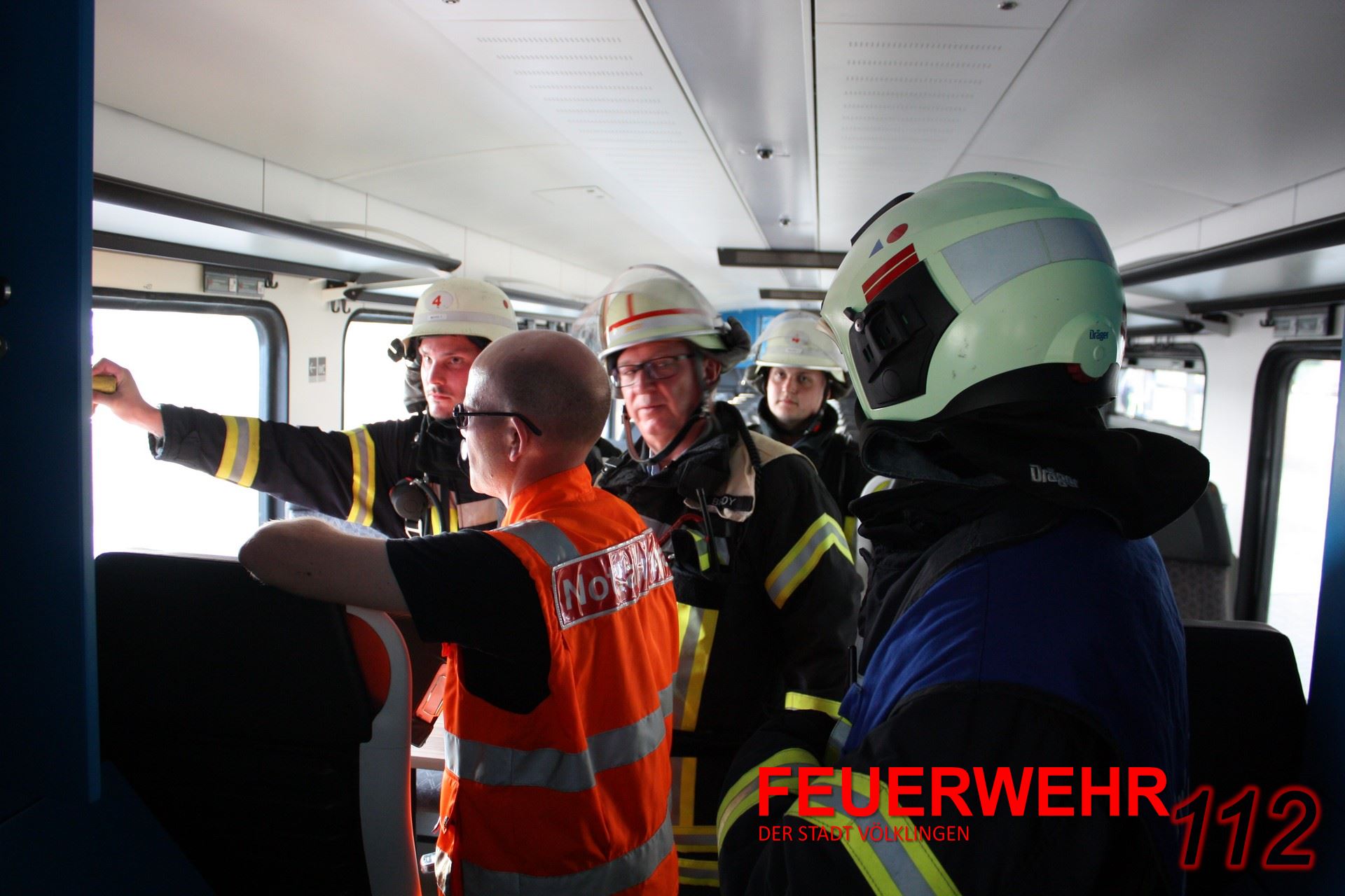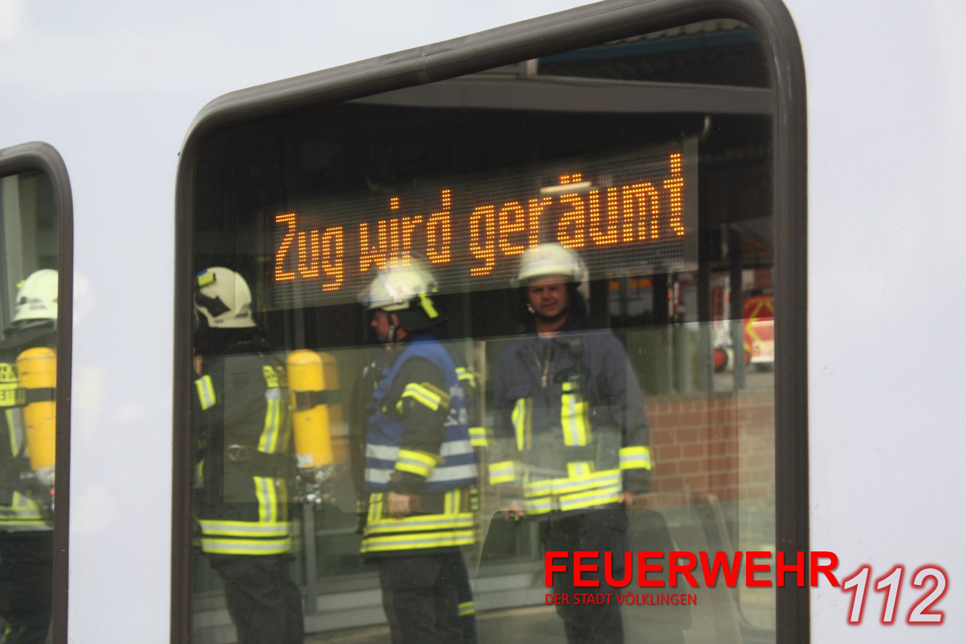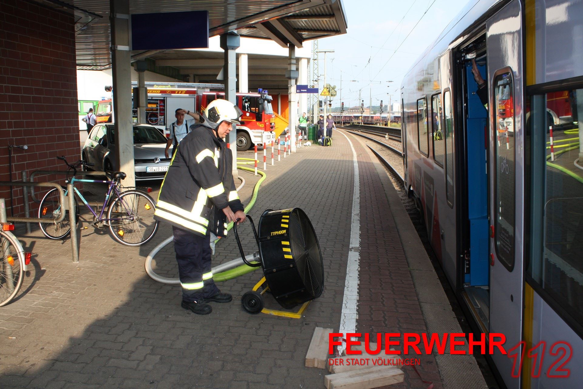In einem Regionalexpress der DB wurde Brandgeruch festgestellt. Nachdem der Zug im Bahnhof Völklingen angehalten hatte wurden alle Passagiere evakuiert. Die Einsatzkräfte untersuchten die Waggons und konnten einen Schmorbrand in einer Elektroverteilung feststellen. Durch den Zugführer wurde der Bereich stromlos geschaltet. Hiernach wurden die gesamten Abteile mittels Lüfter vom Brandgeruch befreit. Durch die DB wurde während des Einsatzes das betroffene, sowie das danebenliegende Gleis gesperrt.Anschließend wurde die Einsatzstelle an den Notfallmanager der Deutschen Bahn übergeben.
