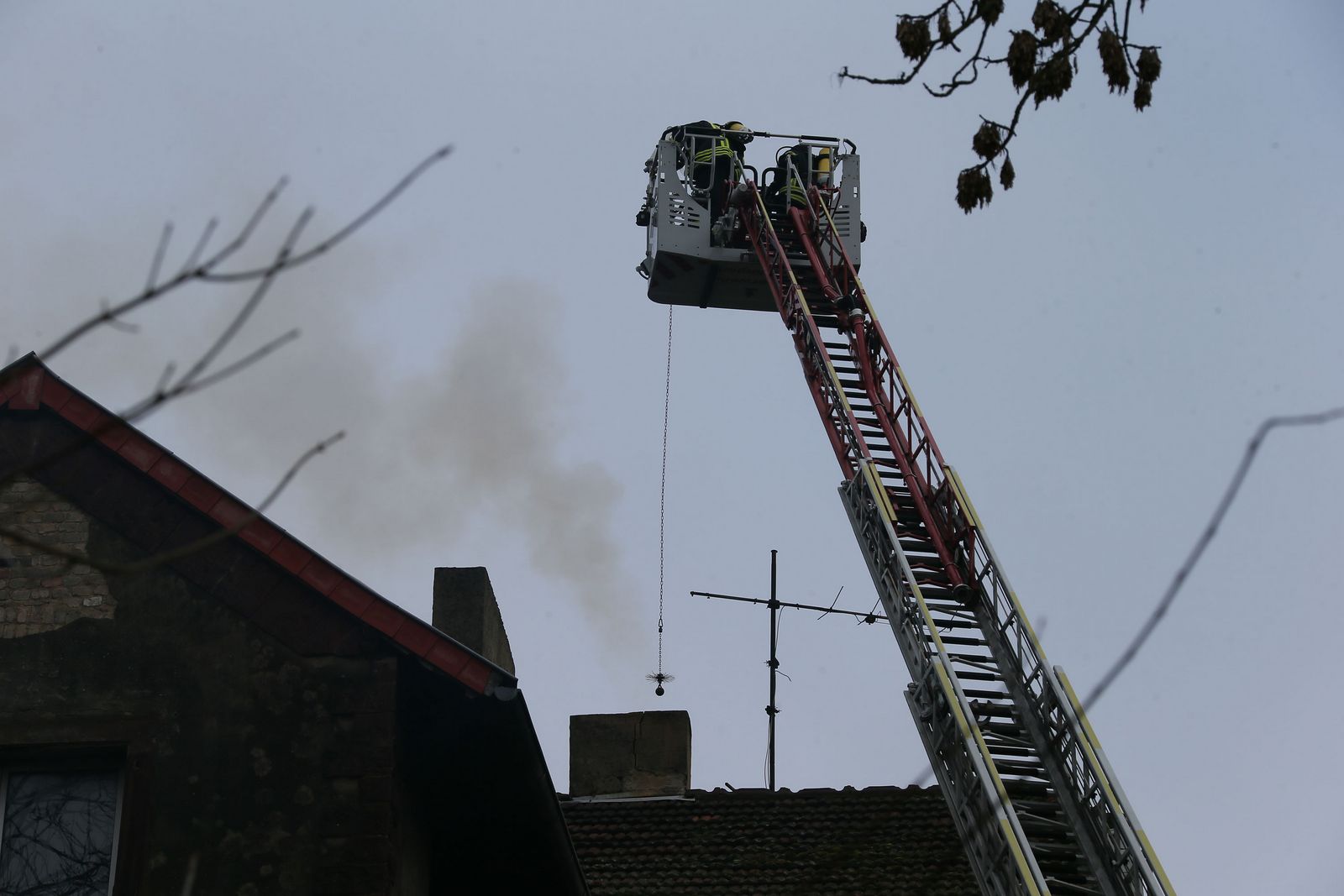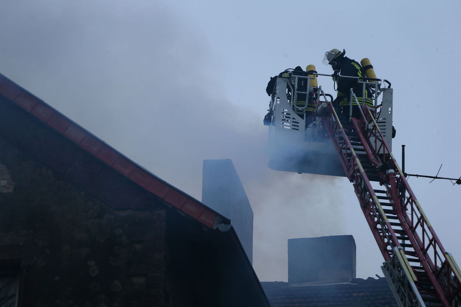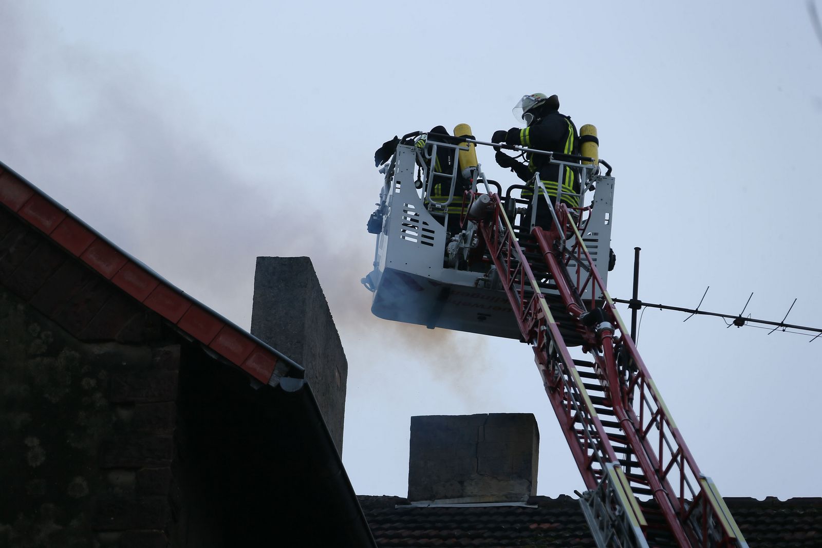 Die Einsatzkräfte sicherten in Verbindung mit der Polizei die Einsatzstelle. Der Kamin wurde von der DLK aus gekehrt. Die Reste aus dem Kamin wurden nach draußen gebracht und abgelöscht. Währenddessen wurde die Wand, hinter der der Kamin verläuft, mit dem Thermometer der Wärmebildkamera kontrolliert.