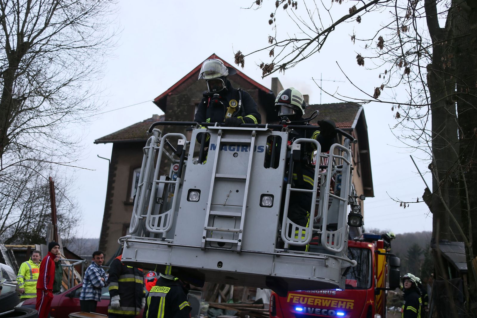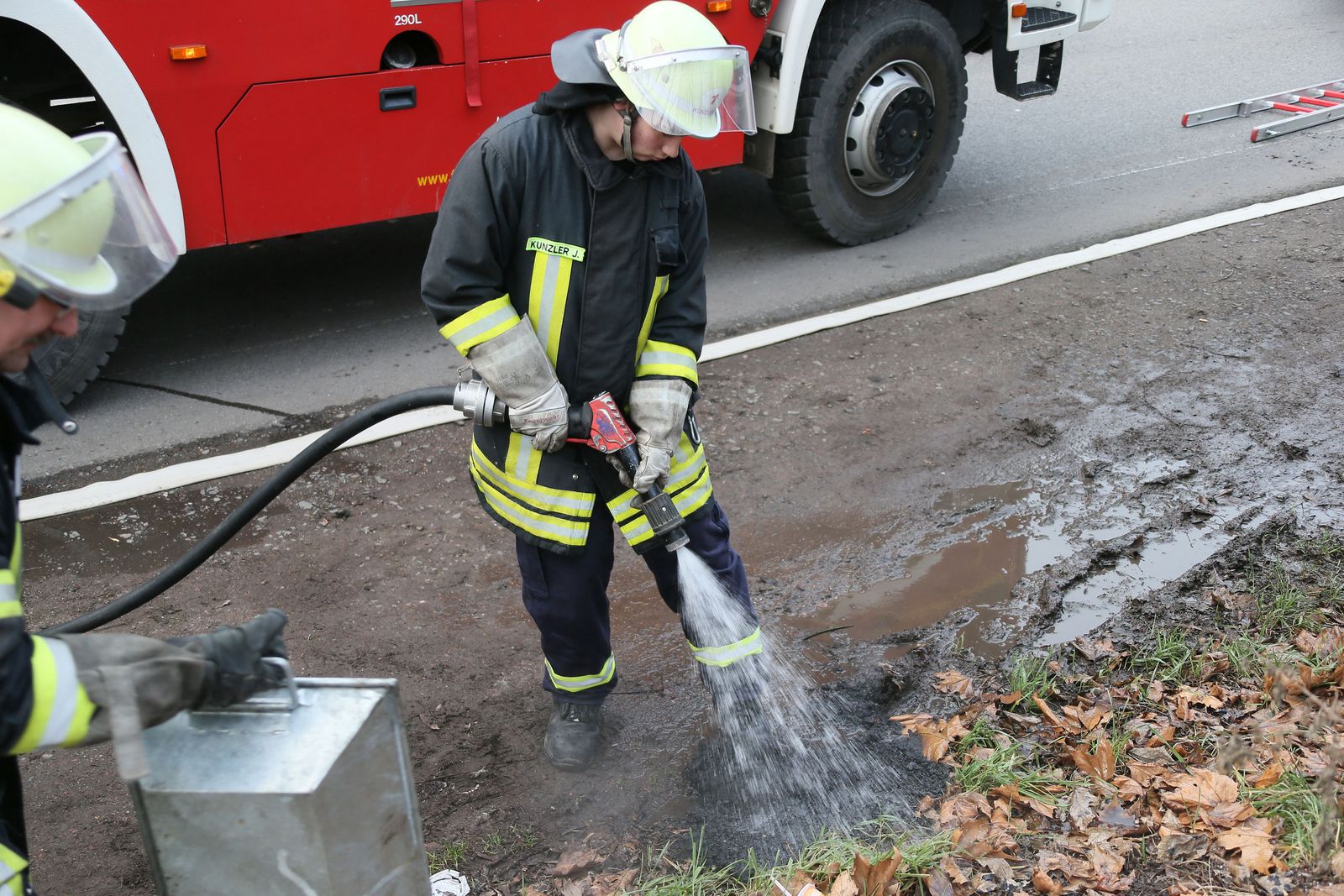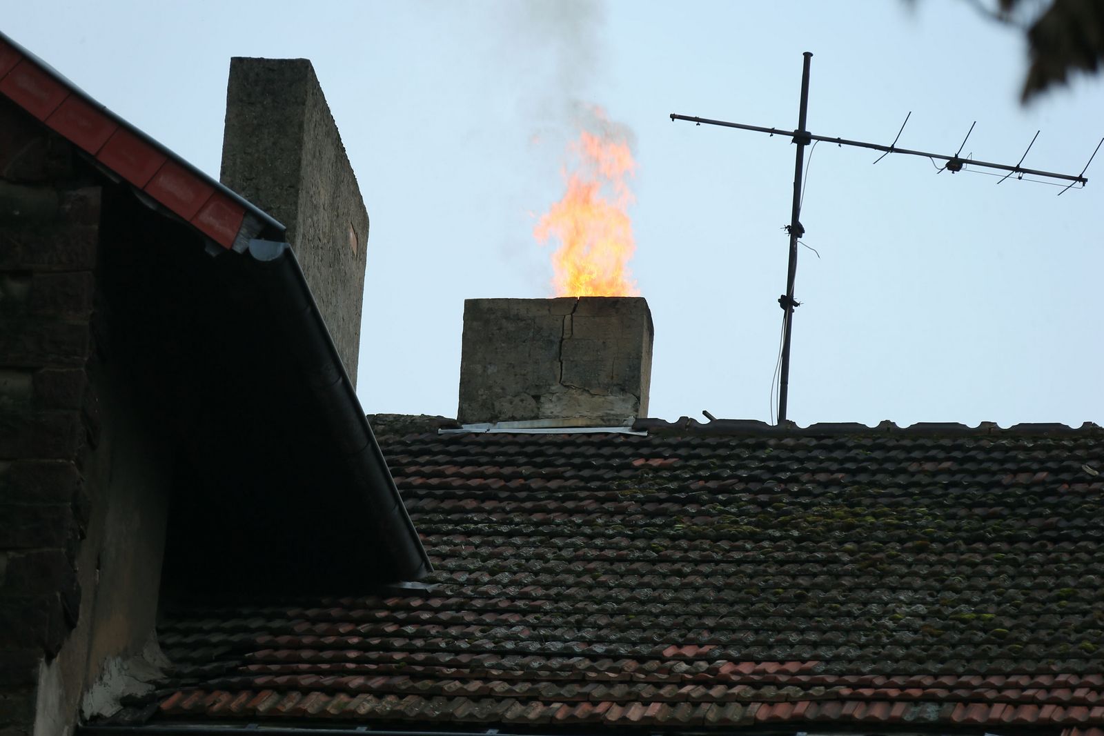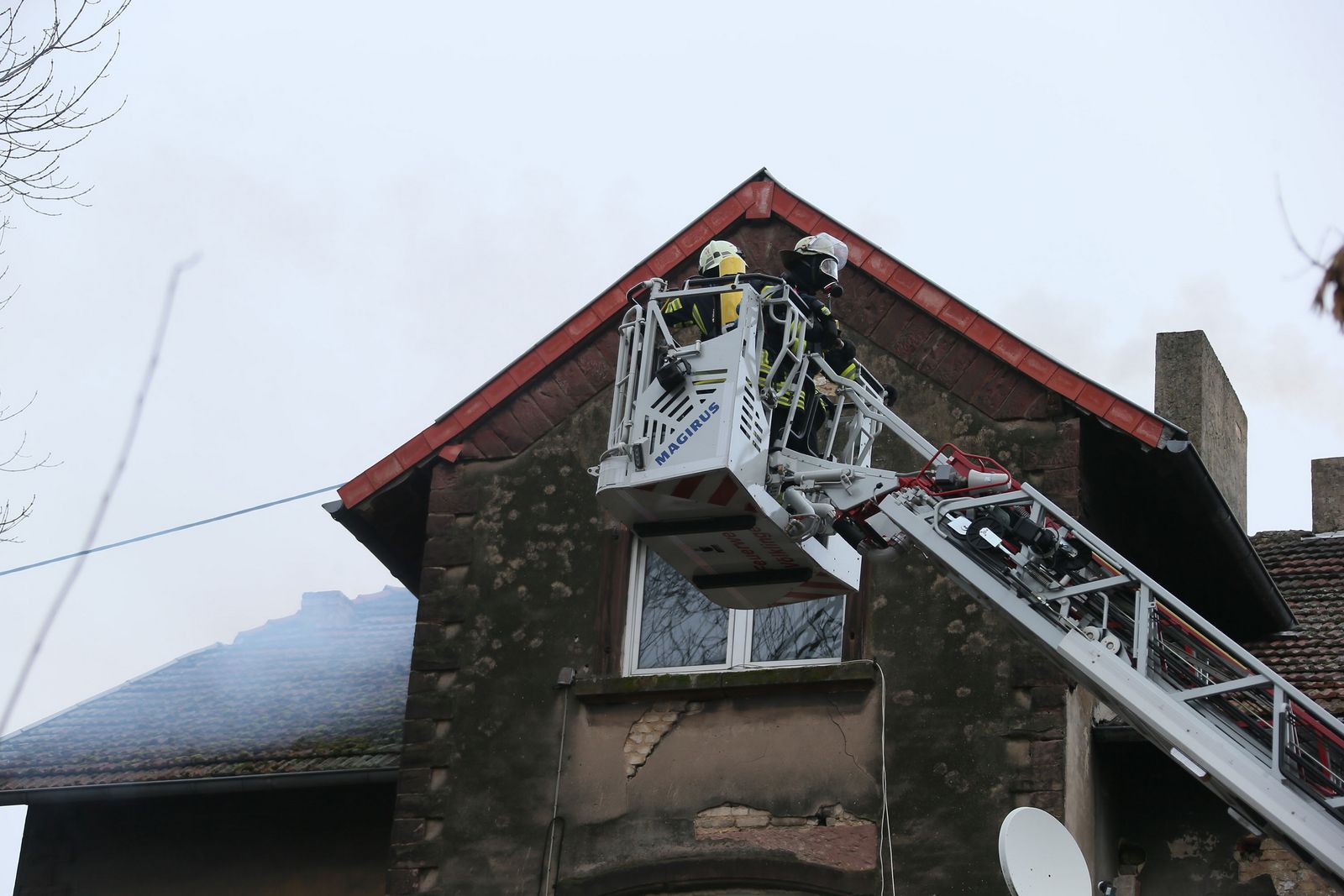 Die Einsatzkräfte sicherten in Verbindung mit der Polizei die Einsatzstelle. Der Kamin wurde von der DLK aus gekehrt. Die Reste aus dem Kamin wurden nach draußen gebracht und abgelöscht. Währenddessen wurde die Wand, hinter der der Kamin verläuft, mit dem Thermometer der Wärmebildkamera kontrolliert.