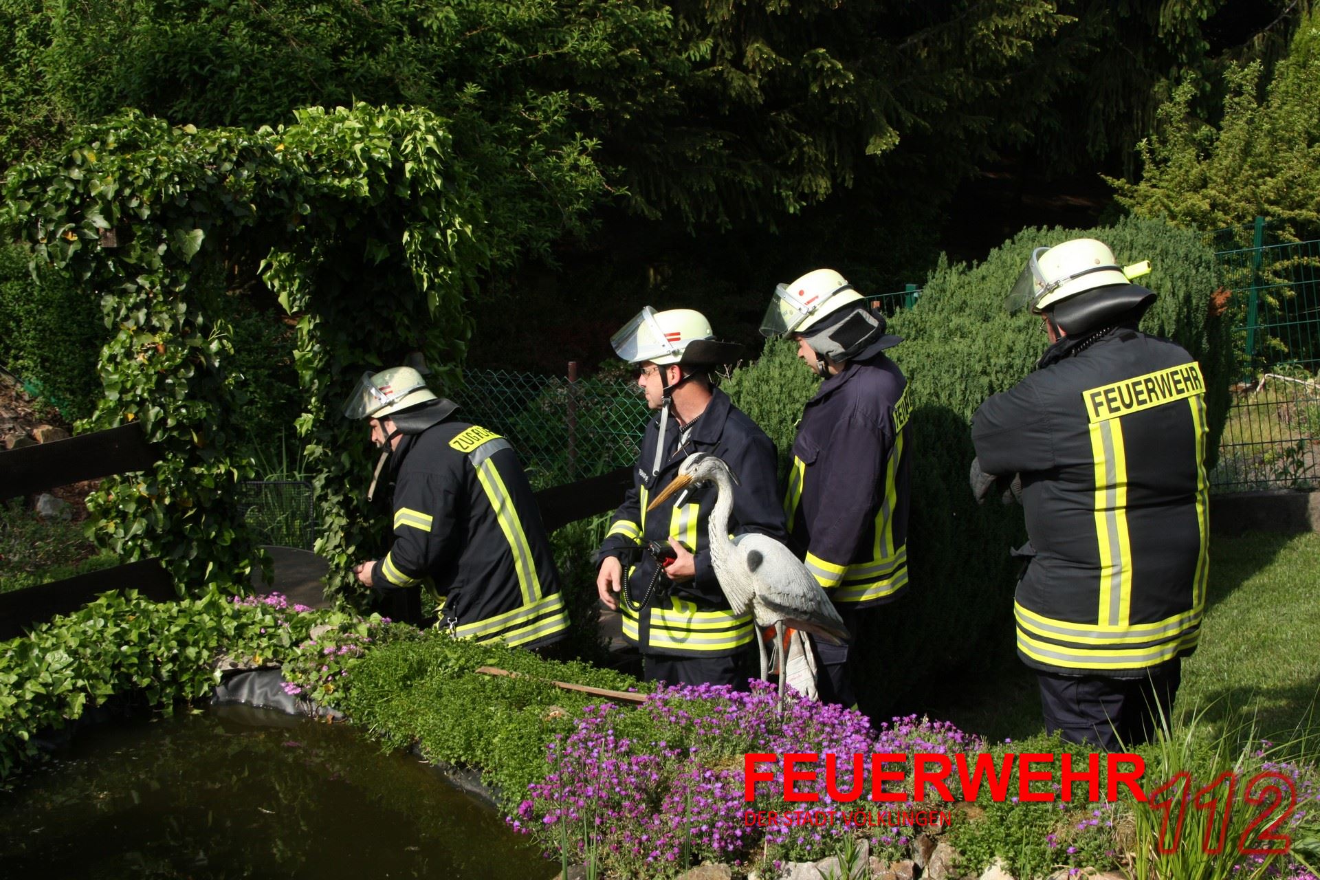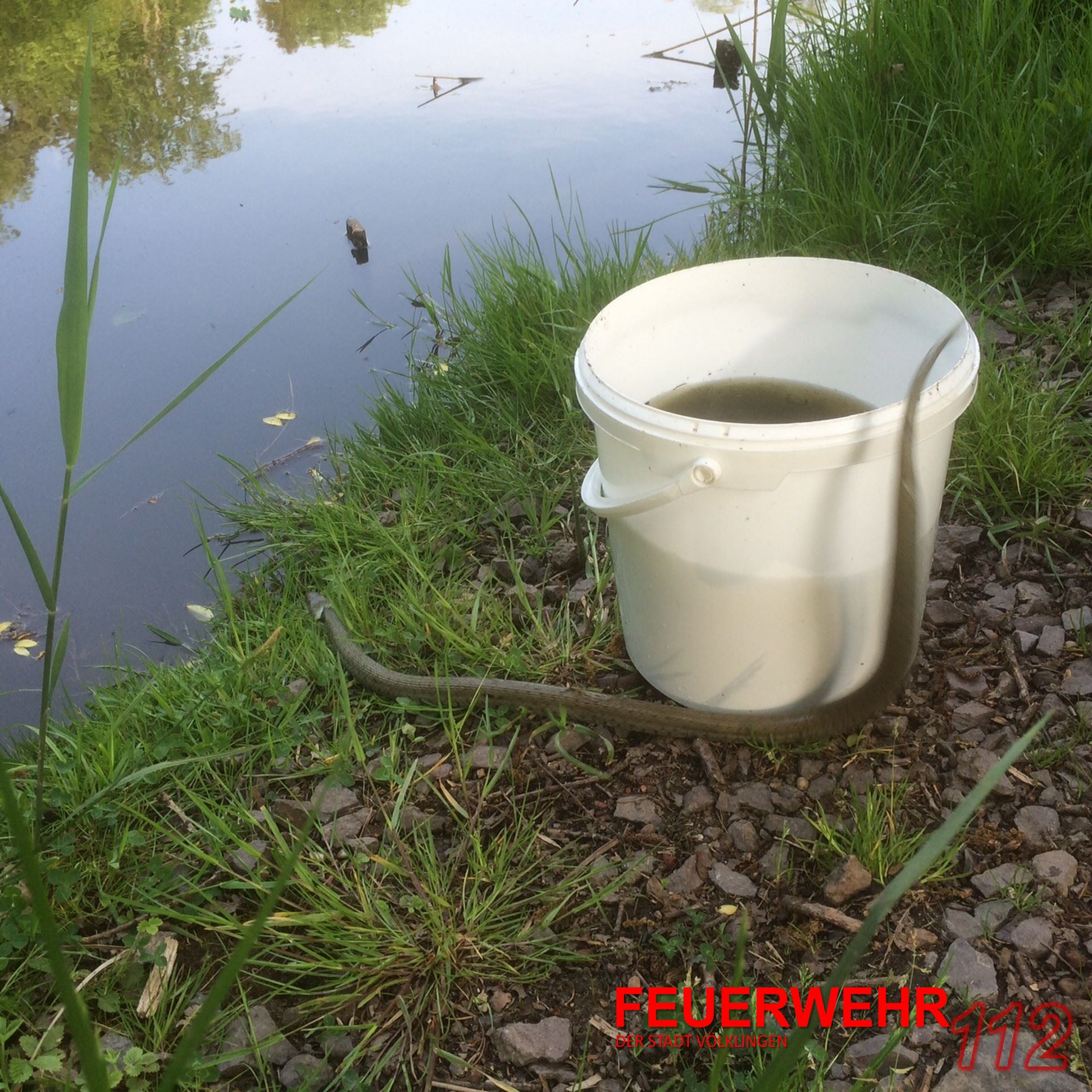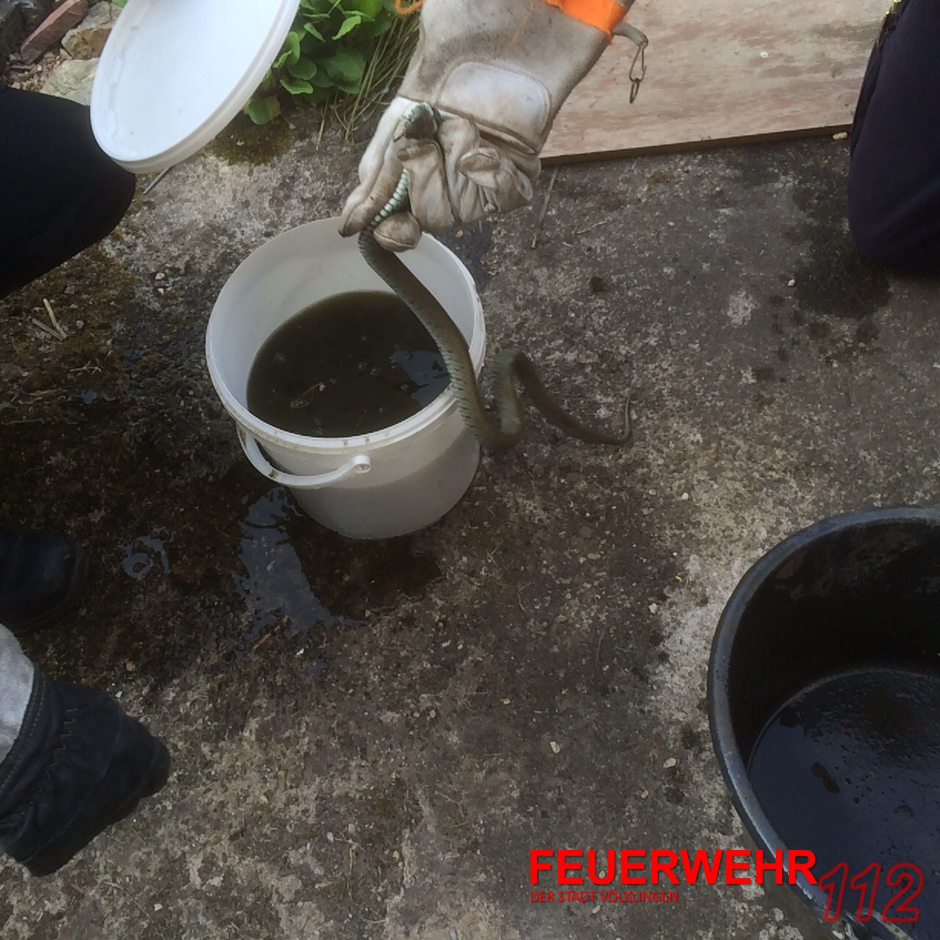 Eine Anwohnerin hatte die Feuerwehr über eine ca. 1m lange Schlange in ihrem Teich informiert. Bei Eintreffen der Einsatzkräfte konnten diese die Schlange als Ringelnatter bestimmen. Die Schlange konnte sich aber vor dem Zugriff der Feuerwehr im Schilf verstecken. Nach einigem Warten war es möglich, diese zu fangen und danach an einem Weiher auszusetzen.