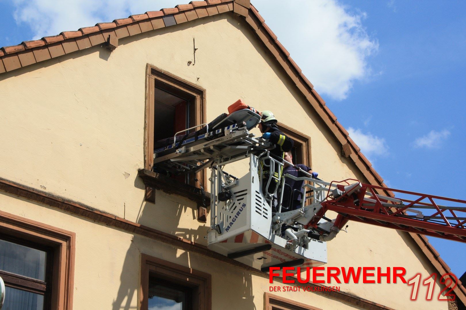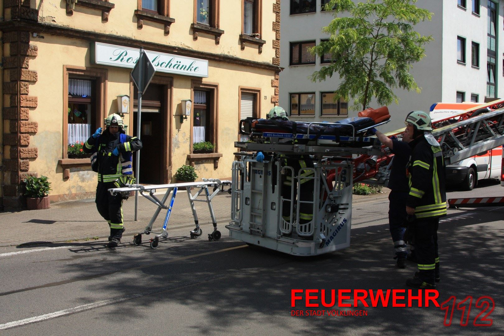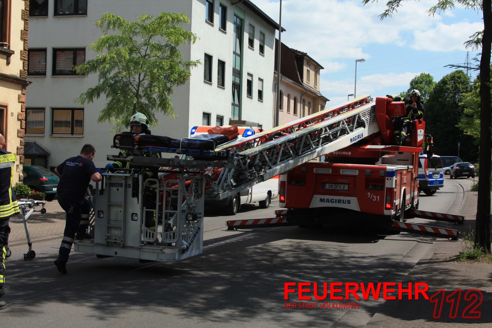 Der Rettungsdienst hat die Feuerwehr zur Rettung einer Person angefordert. Die Einsatzkräfte brachten die Person mittels DLK nach unten und übergaben sie an den Rettungsdienst.
