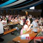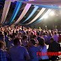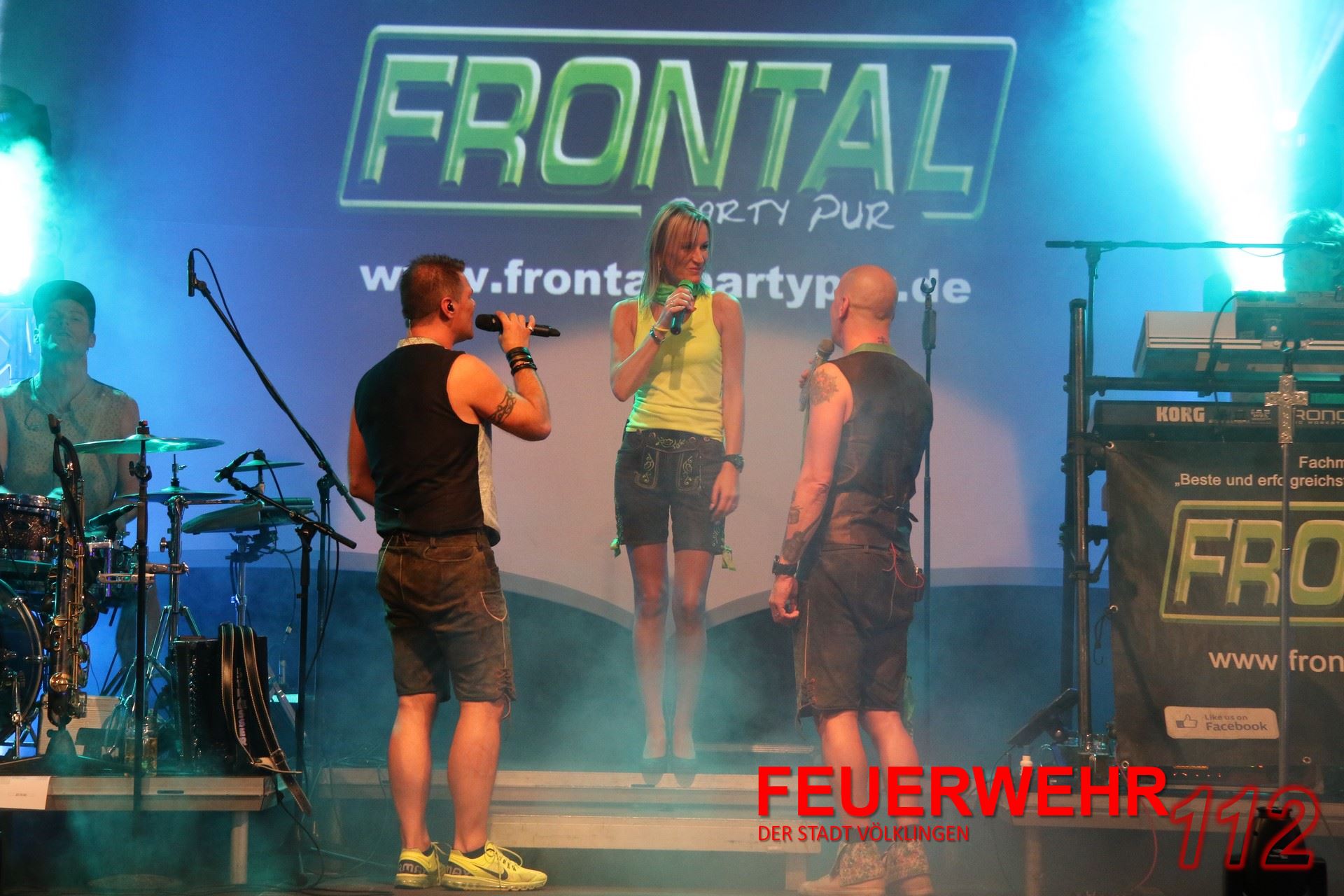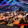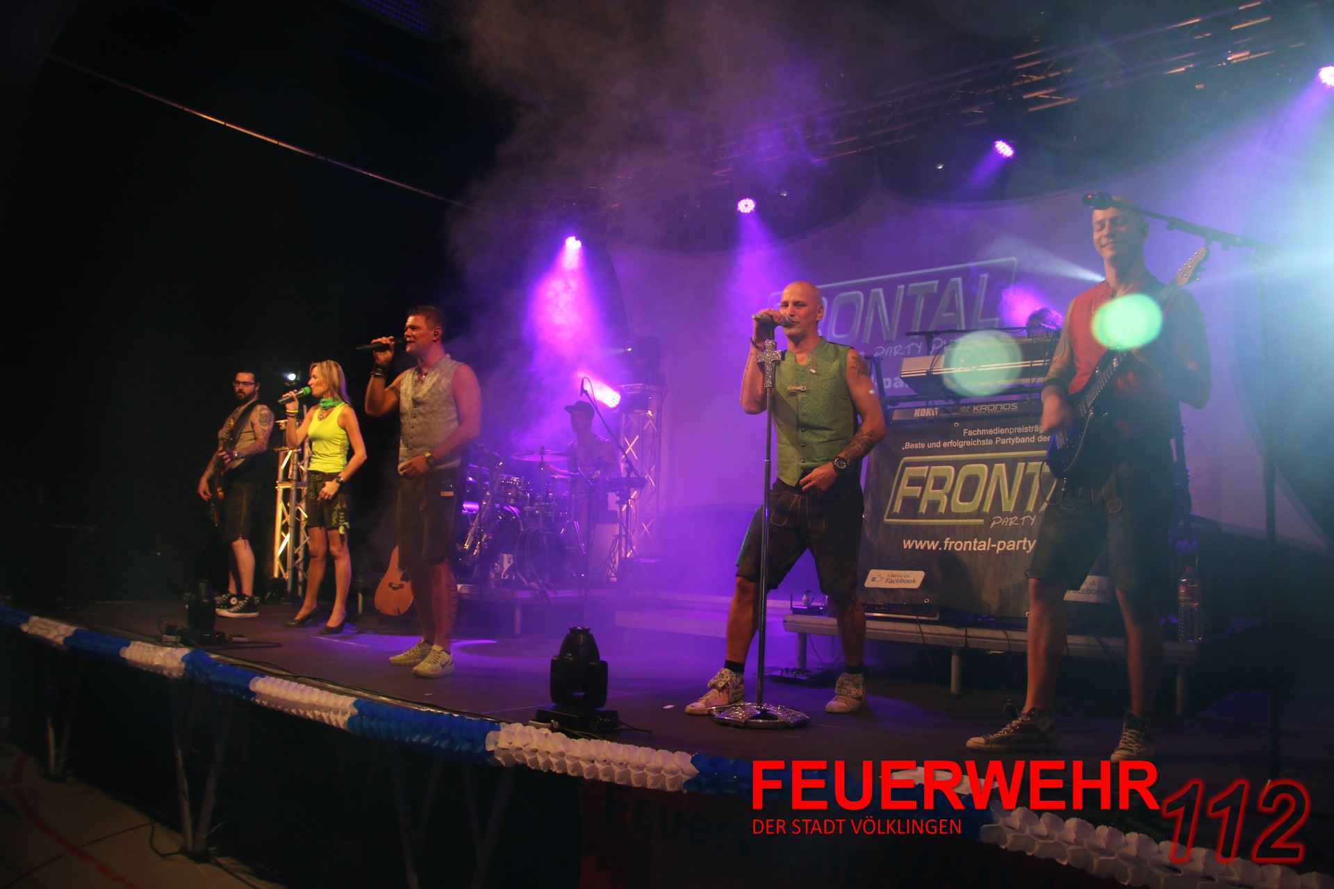 Um 20 Uhr war es dann soweit. Unter tosendem Beifall der Besucher wurde der Fassanstich durch Oberbürgermeister Klaus Lorig durchgeführt. Was folgte, war ein fulminanter Auftritt der Partyband FRONTAL-PartyPur. Dies ist die erfolgreichste Partyband der letzten zehn Jahre, 2014 ausgezeichnet mit dem deutschen Fachmedienpreis. Die Showband rockte die fast ausverkaufte Halle. Dabei boten sie für fast jeden etwas. Von zart bis hart, von Schlager bis Rockklassikern wurde jedem Zuschauer etwas geboten. Innerhalb von Minuten hatten die europaweit aufspielenden Musiker die meist in Dirndl und Lederhosen erschienenen Gäste auf den Bänken stehen.