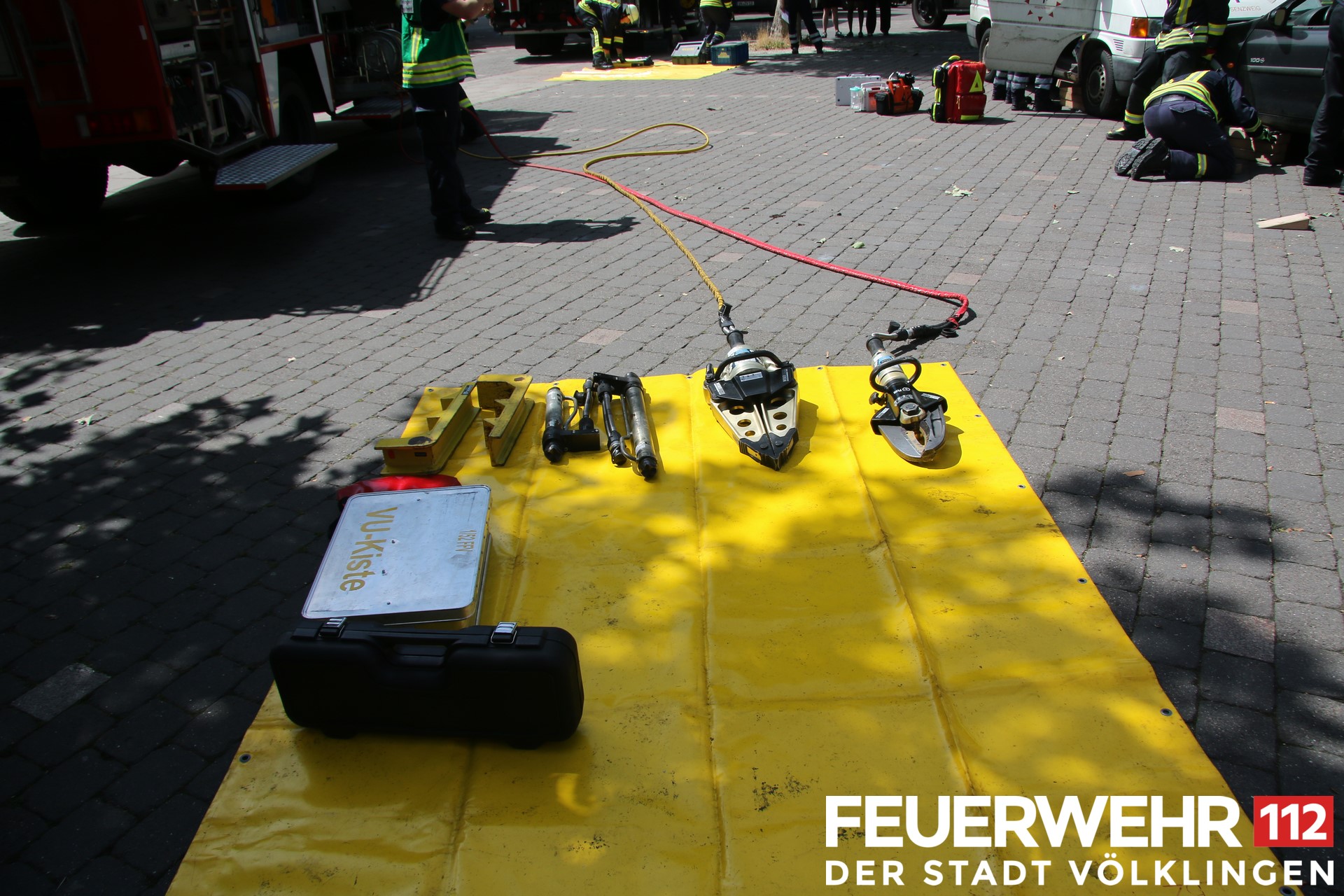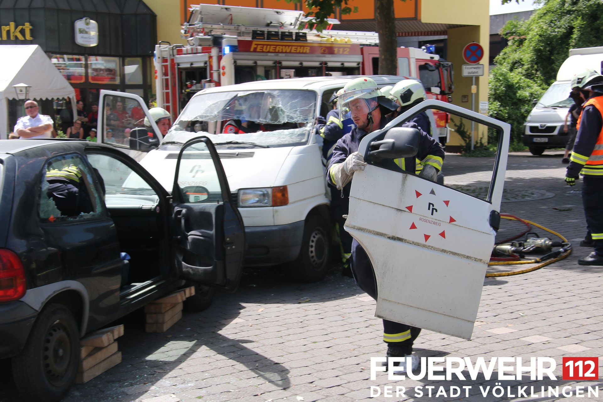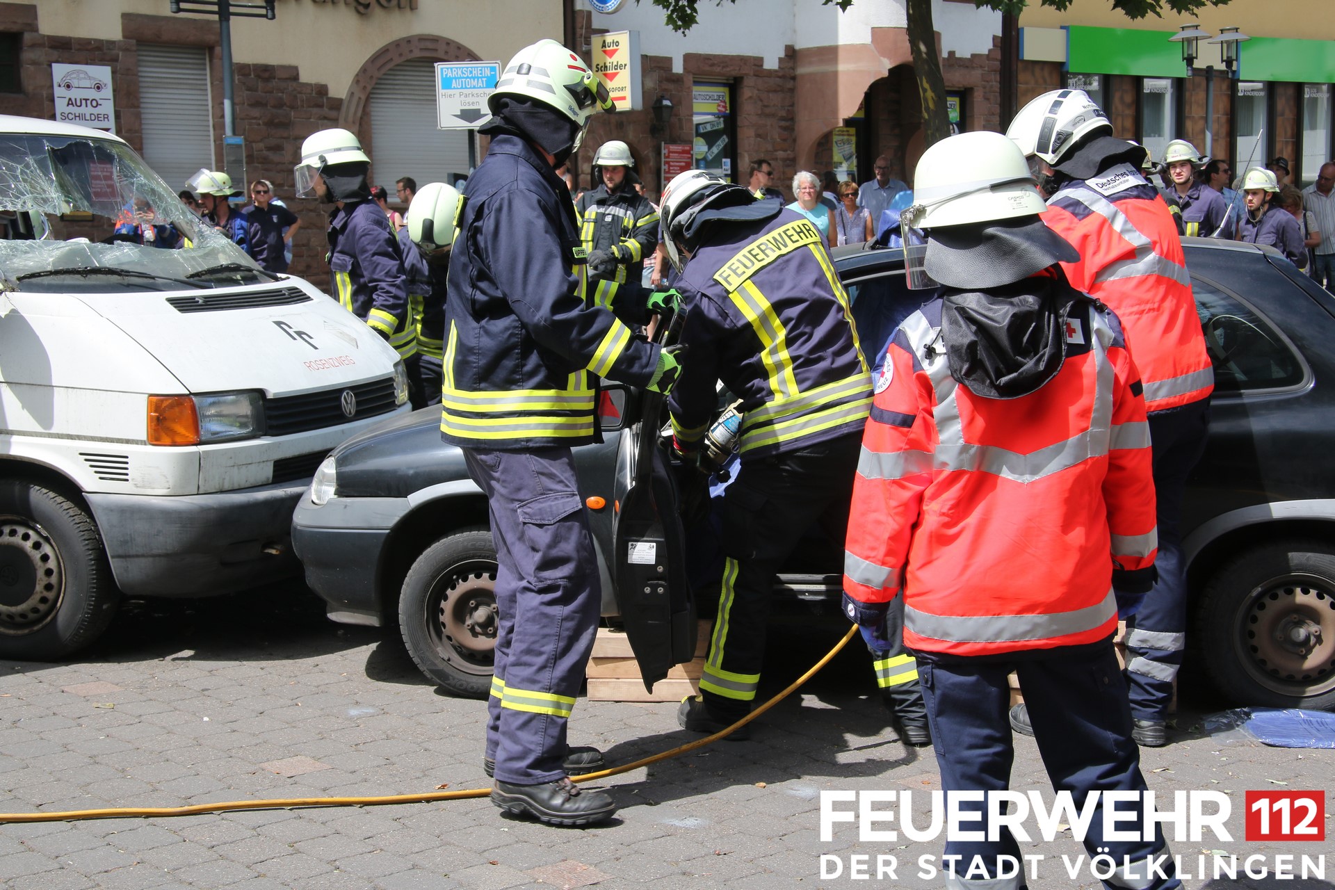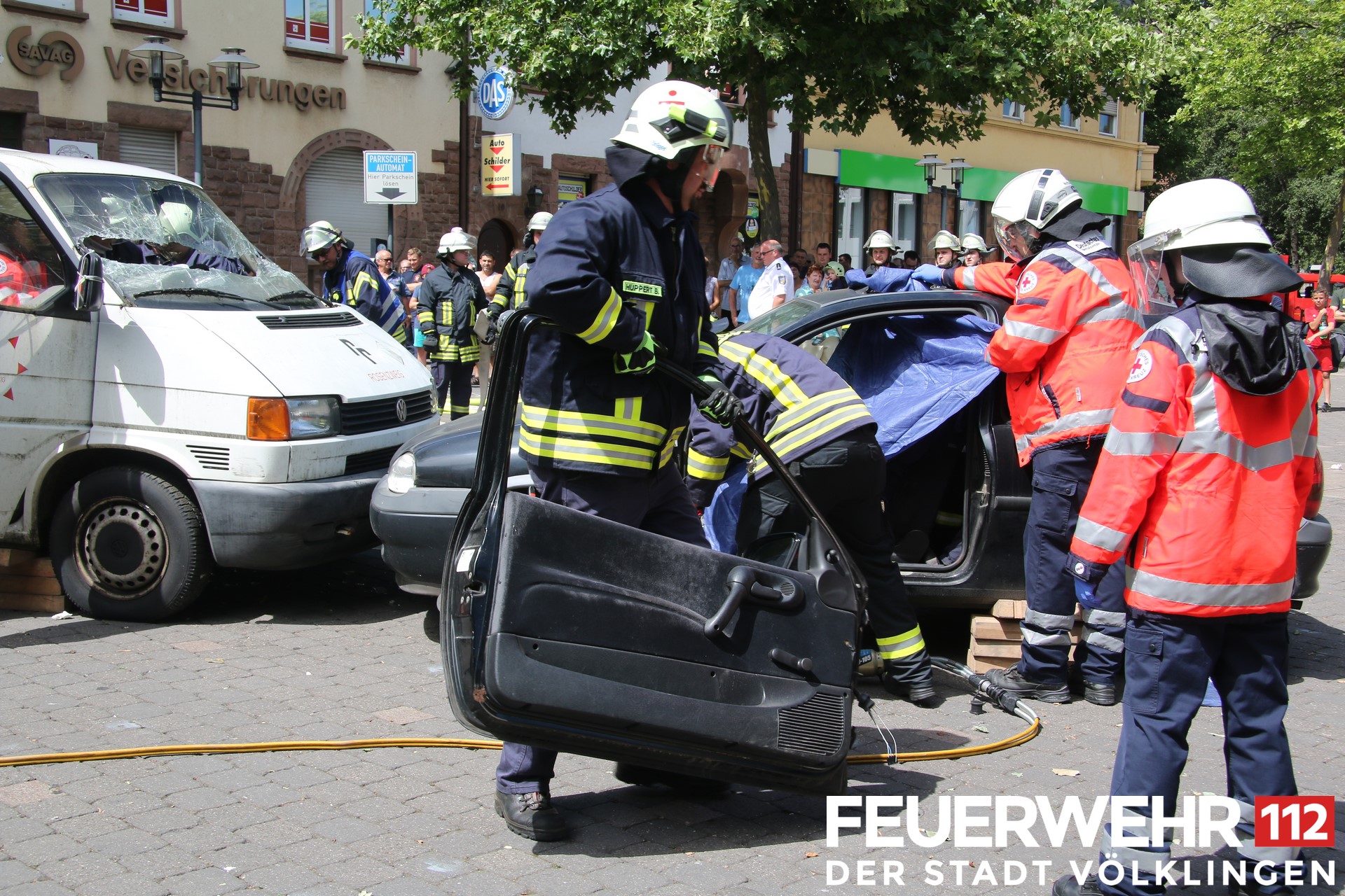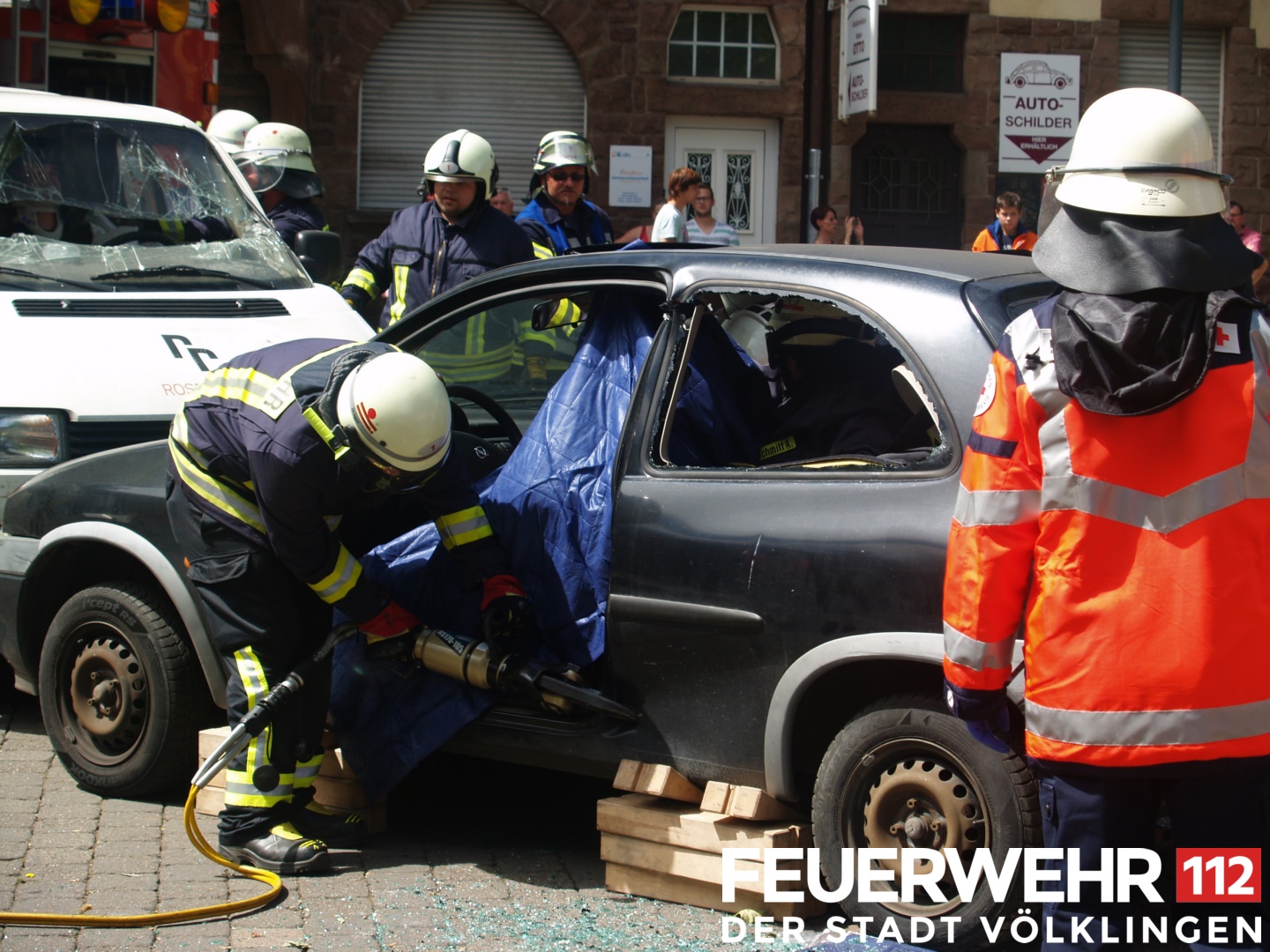 Zuerst wurde ein Verkehrsunfall mit zwei Fahrzeugen demonstriert. An dieser Übung hat auch die Rettungswache Völklingen des DRK mit zwei Fahrzeugen teilgenommen. Ein Pkw war mit einem Lieferwagen zusammengestoßen und aus beiden Fahrzeugen war je eine Person zu retten. Diese wurden mit hydraulischem Rettungsgerät befreit und dem Rettungsdienst übergeben. Hierbei wurden den Zuschauern die Vorgehensweise über Lautsprecher erklärt, so dass sie sich ein Bild über die einzelnen Schritte machen konnten.