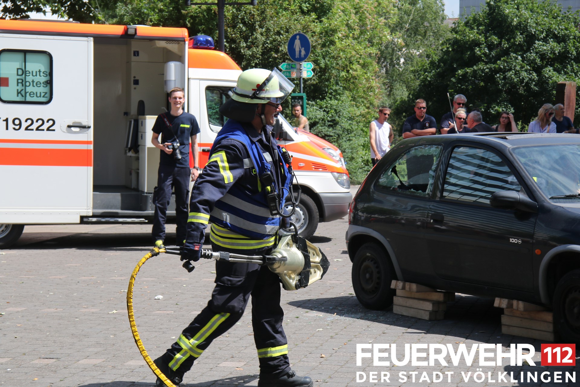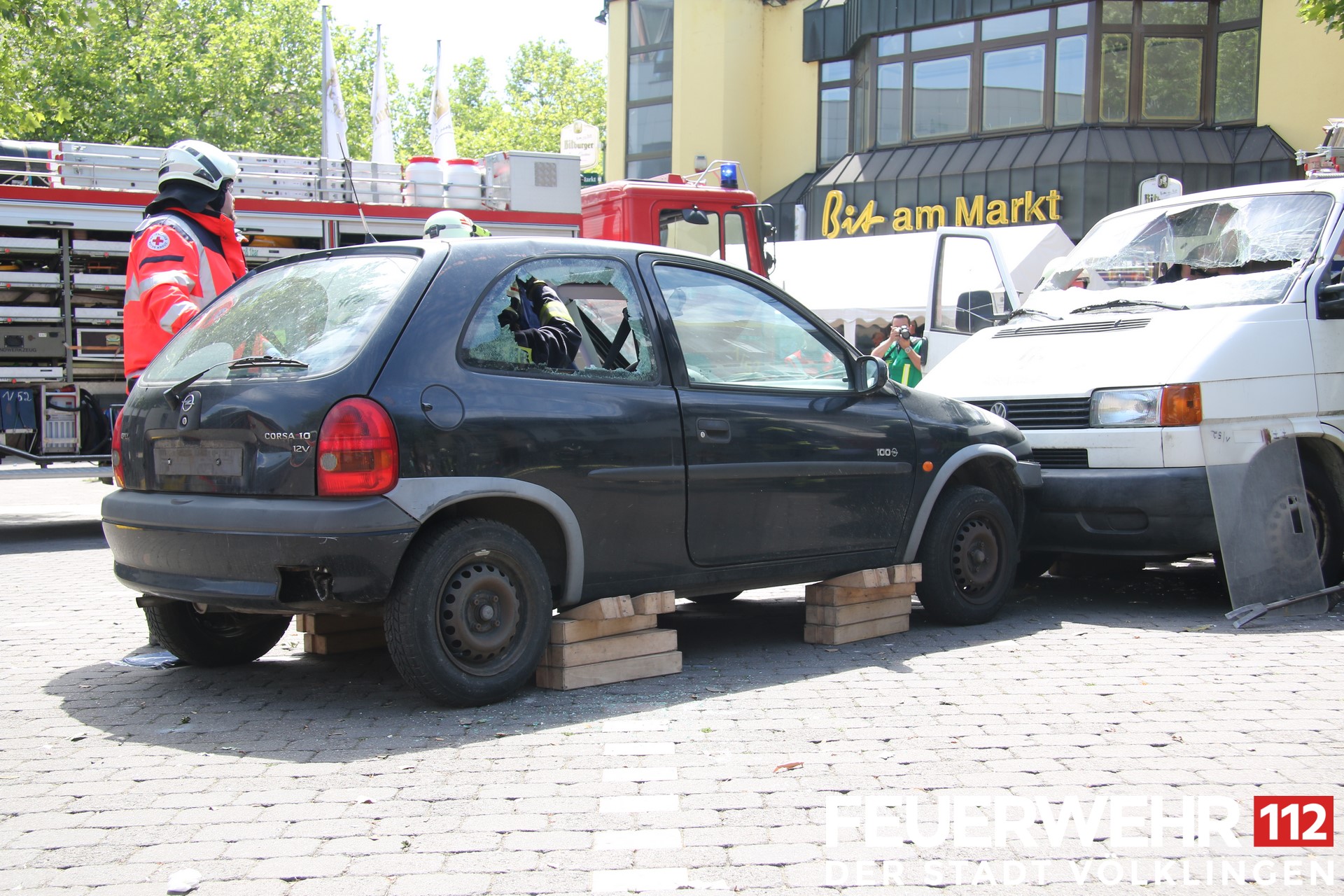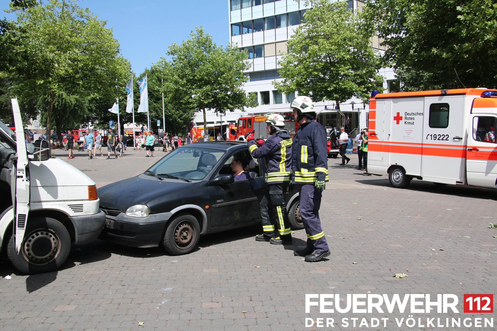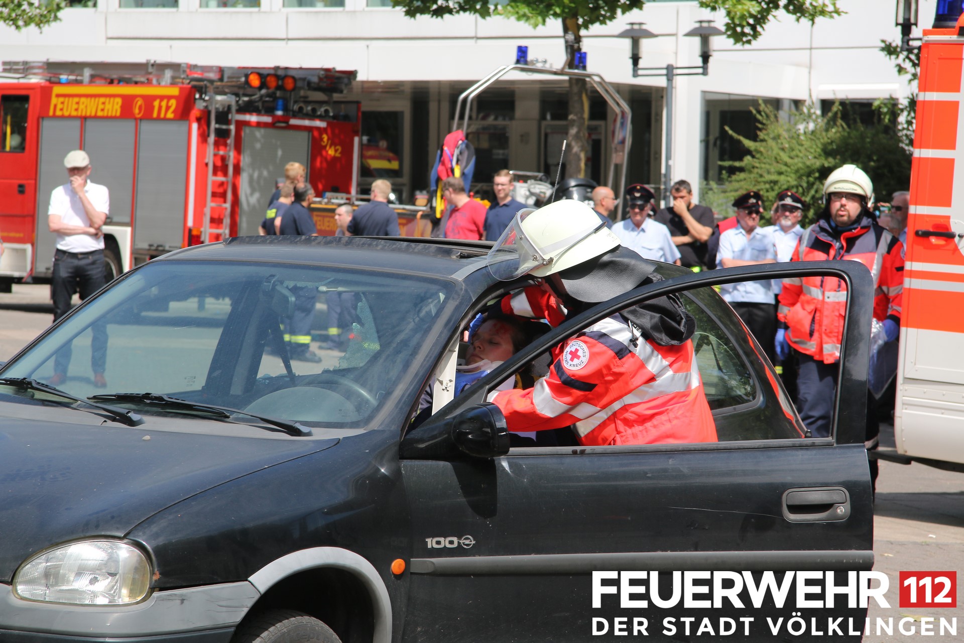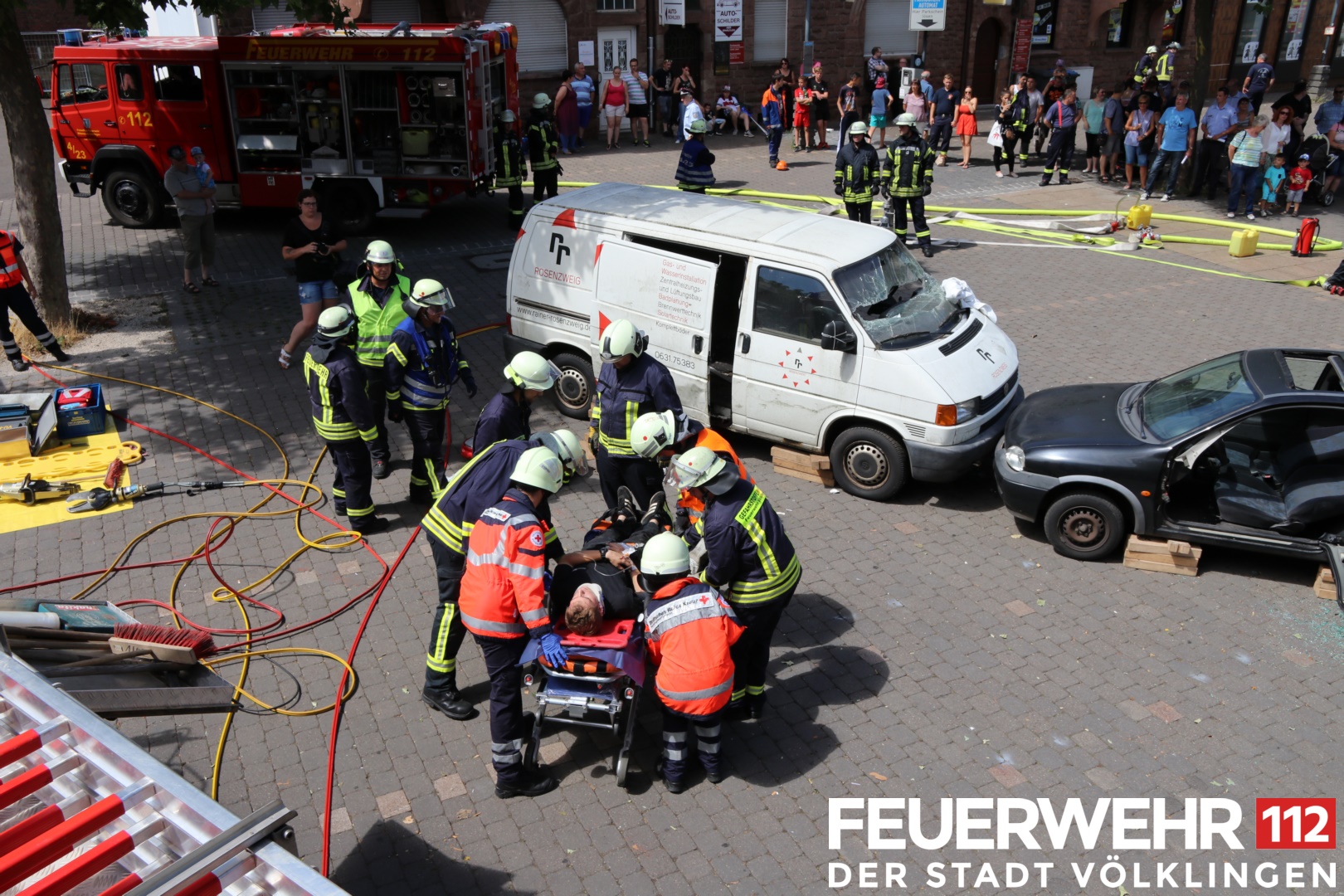 Zuerst wurde ein Verkehrsunfall mit zwei Fahrzeugen demonstriert. An dieser Übung hat auch die Rettungswache Völklingen des DRK mit zwei Fahrzeugen teilgenommen. Ein Pkw war mit einem Lieferwagen zusammengestoßen und aus beiden Fahrzeugen war je eine Person zu retten. Diese wurden mit hydraulischem Rettungsgerät befreit und dem Rettungsdienst übergeben. Hierbei wurden den Zuschauern die Vorgehensweise über Lautsprecher erklärt, so dass sie sich ein Bild über die einzelnen Schritte machen konnten.