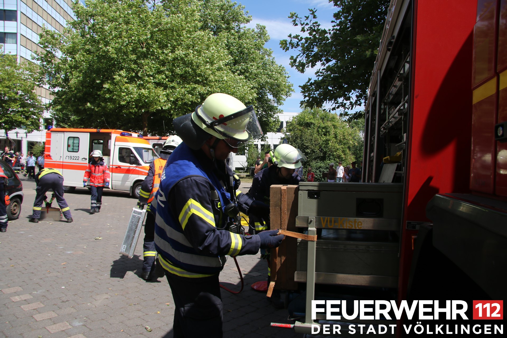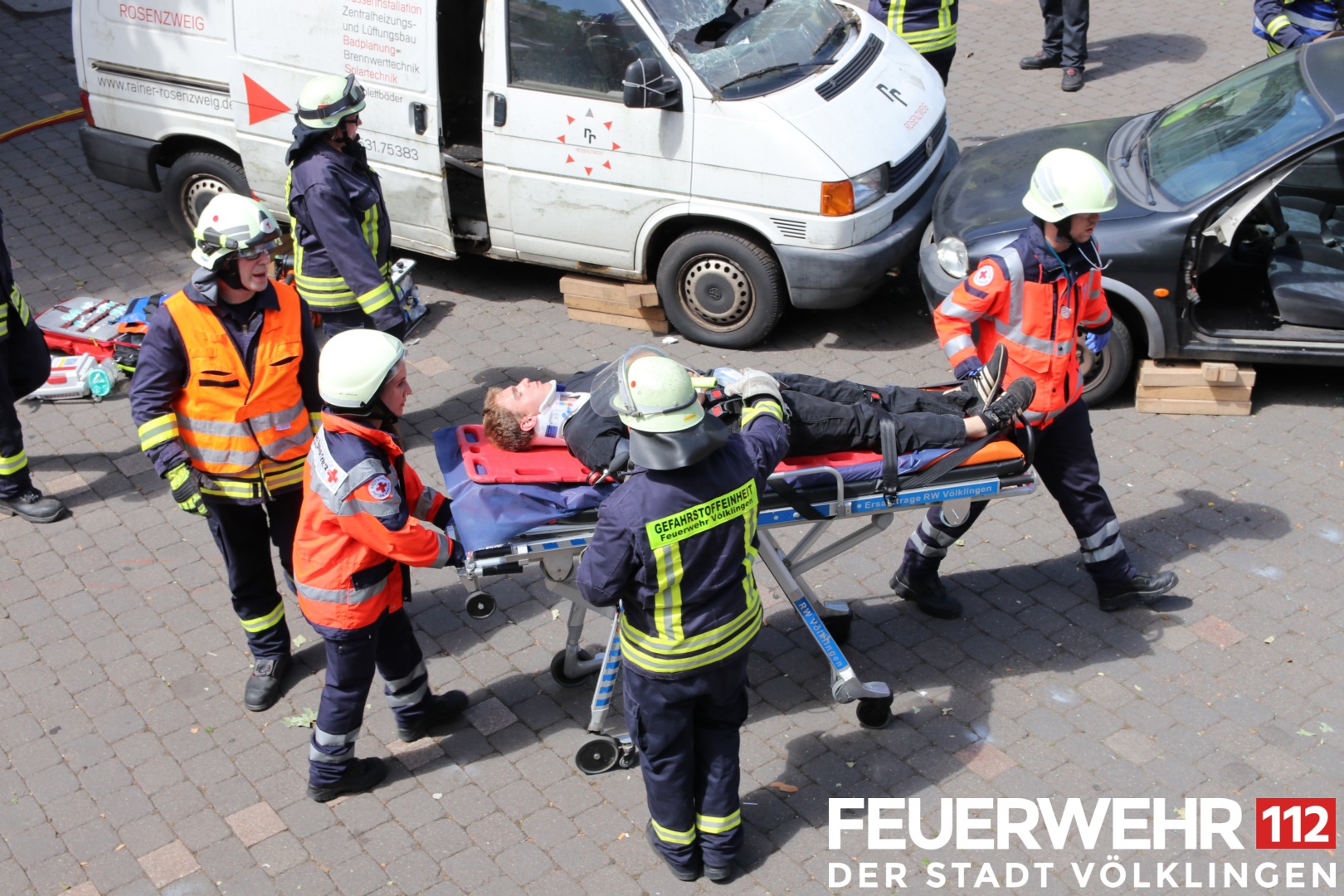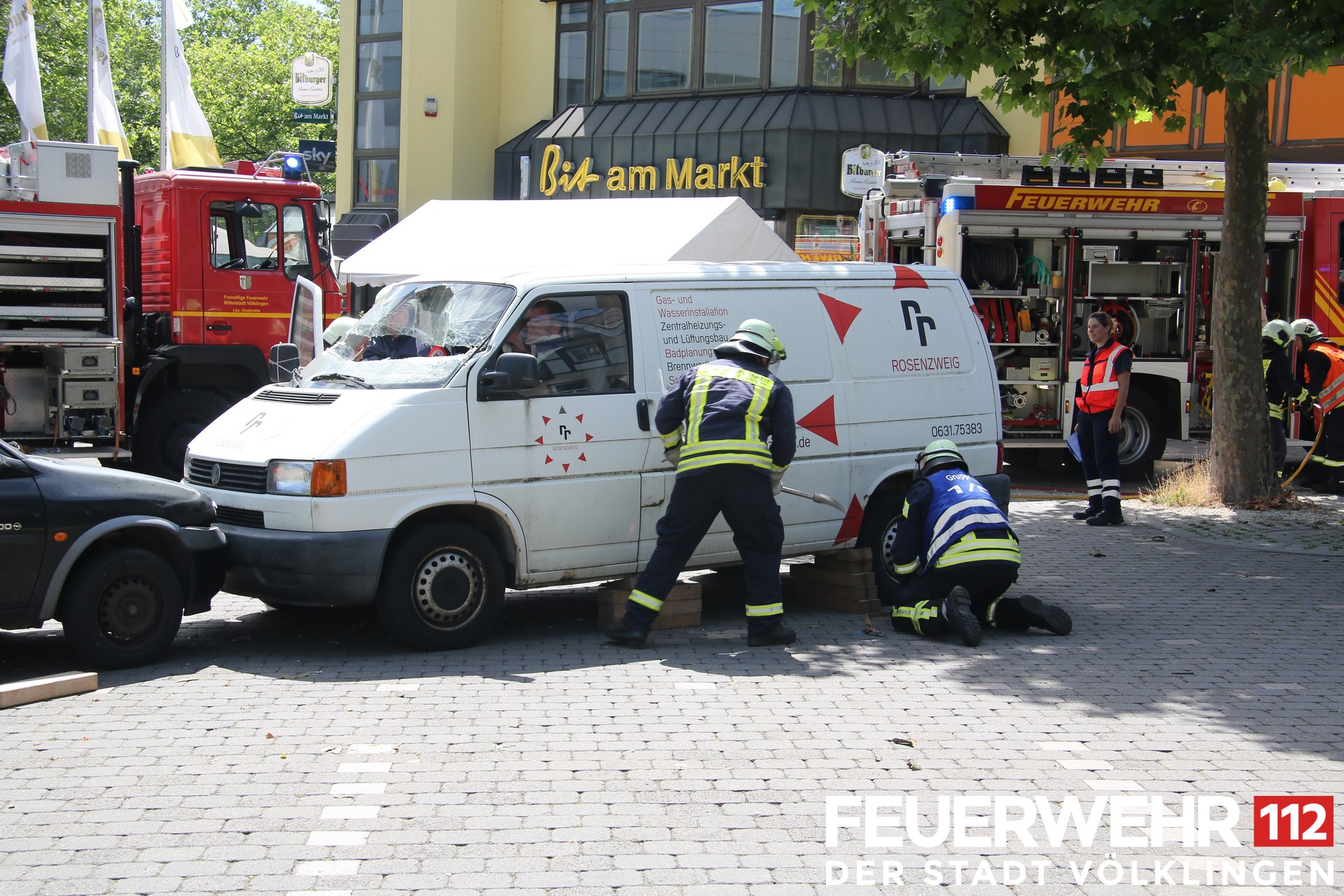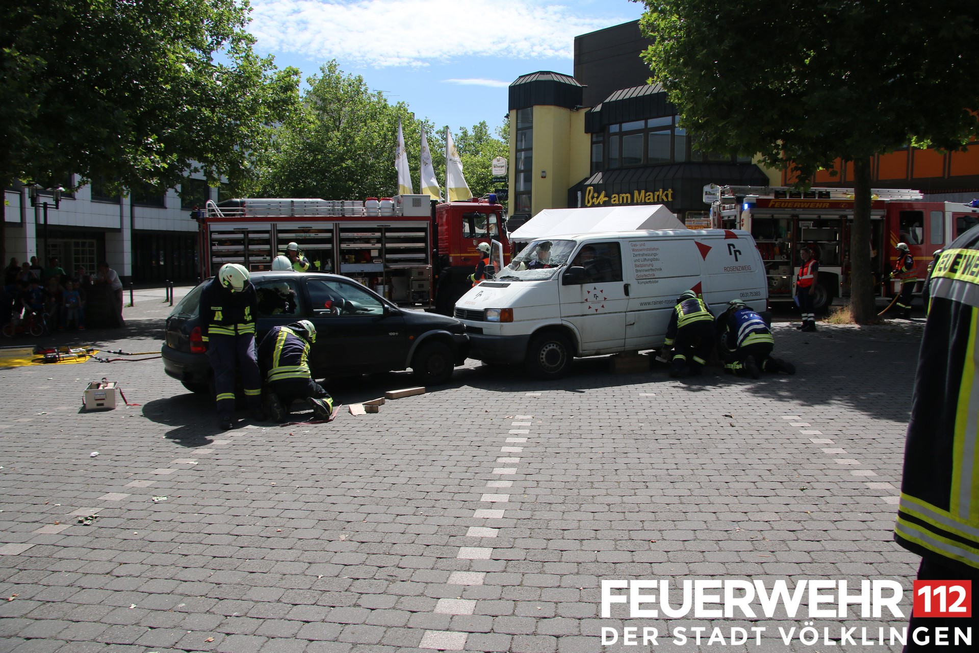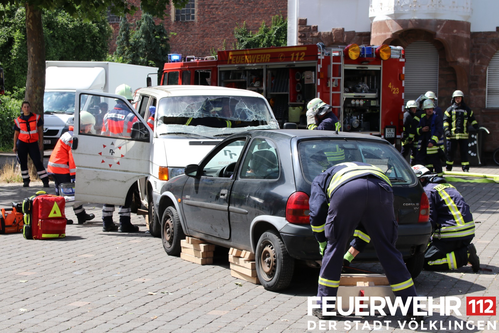 Zuerst wurde ein Verkehrsunfall mit zwei Fahrzeugen demonstriert. An dieser Übung hat auch die Rettungswache Völklingen des DRK mit zwei Fahrzeugen teilgenommen. Ein Pkw war mit einem Lieferwagen zusammengestoßen und aus beiden Fahrzeugen war je eine Person zu retten. Diese wurden mit hydraulischem Rettungsgerät befreit und dem Rettungsdienst übergeben. Hierbei wurden den Zuschauern die Vorgehensweise über Lautsprecher erklärt, so dass sie sich ein Bild über die einzelnen Schritte machen konnten.