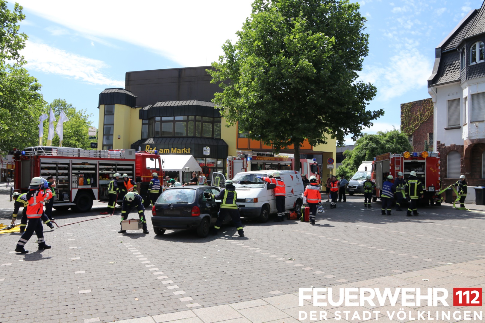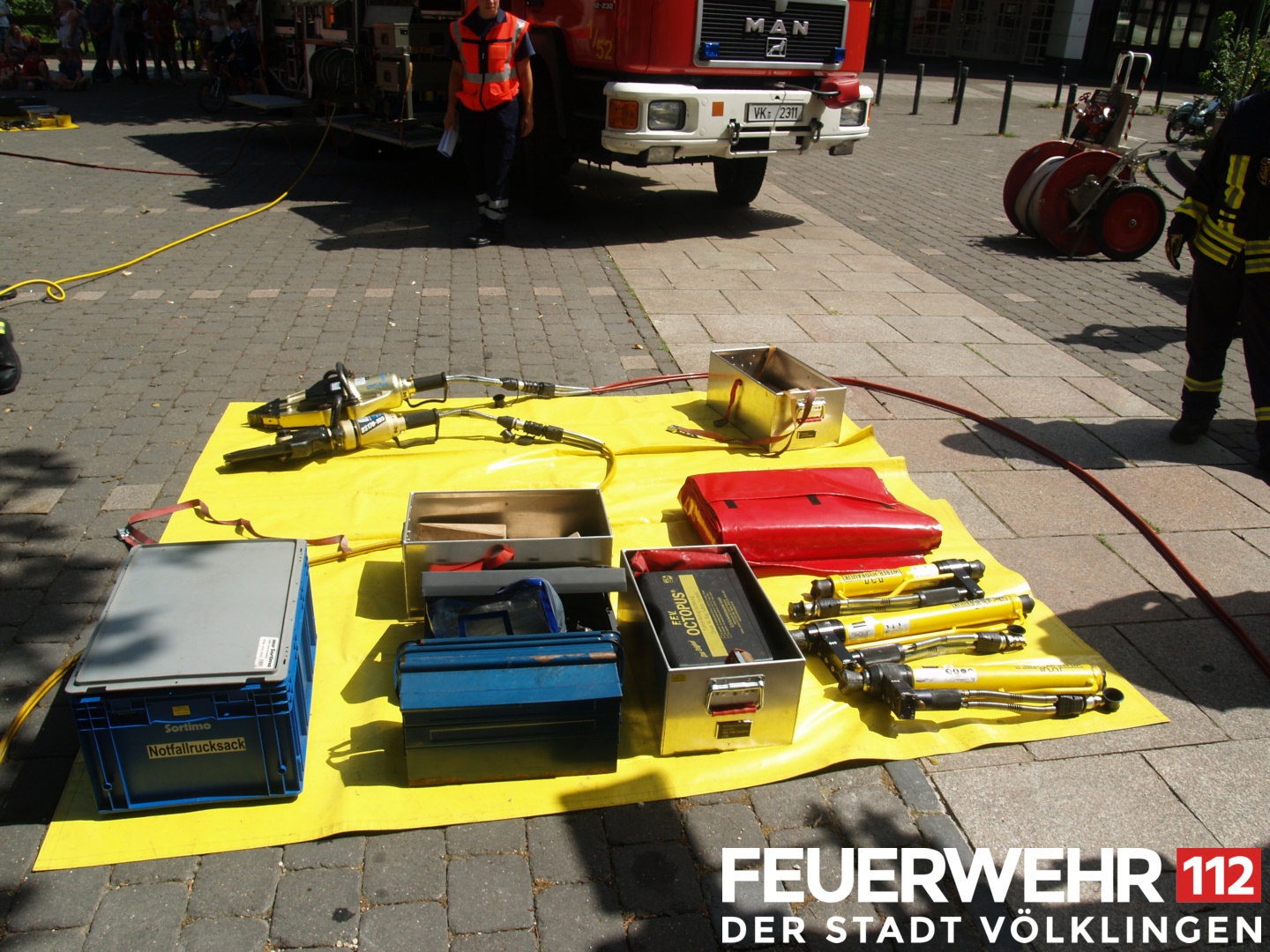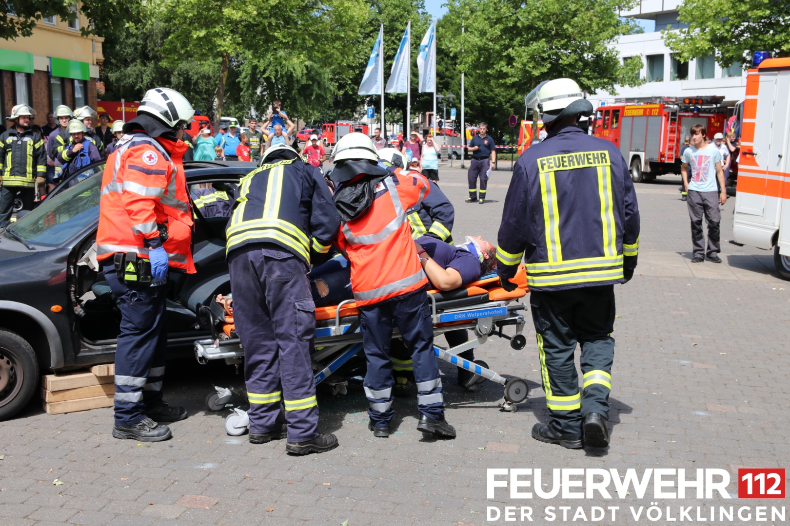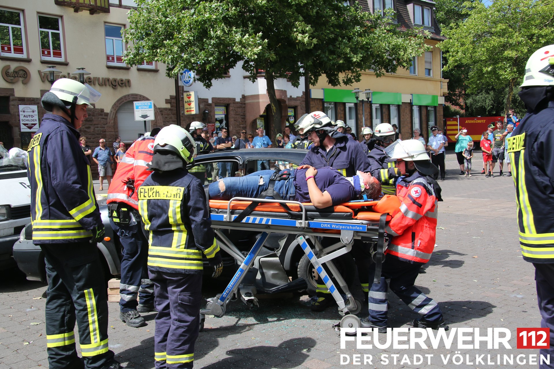 Zuerst wurde ein Verkehrsunfall mit zwei Fahrzeugen demonstriert. An dieser Übung hat auch die Rettungswache Völklingen des DRK mit zwei Fahrzeugen teilgenommen. Ein Pkw war mit einem Lieferwagen zusammengestoßen und aus beiden Fahrzeugen war je eine Person zu retten. Diese wurden mit hydraulischem Rettungsgerät befreit und dem Rettungsdienst übergeben. Hierbei wurden den Zuschauern die Vorgehensweise über Lautsprecher erklärt, so dass sie sich ein Bild über die einzelnen Schritte machen konnten.