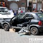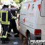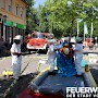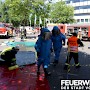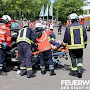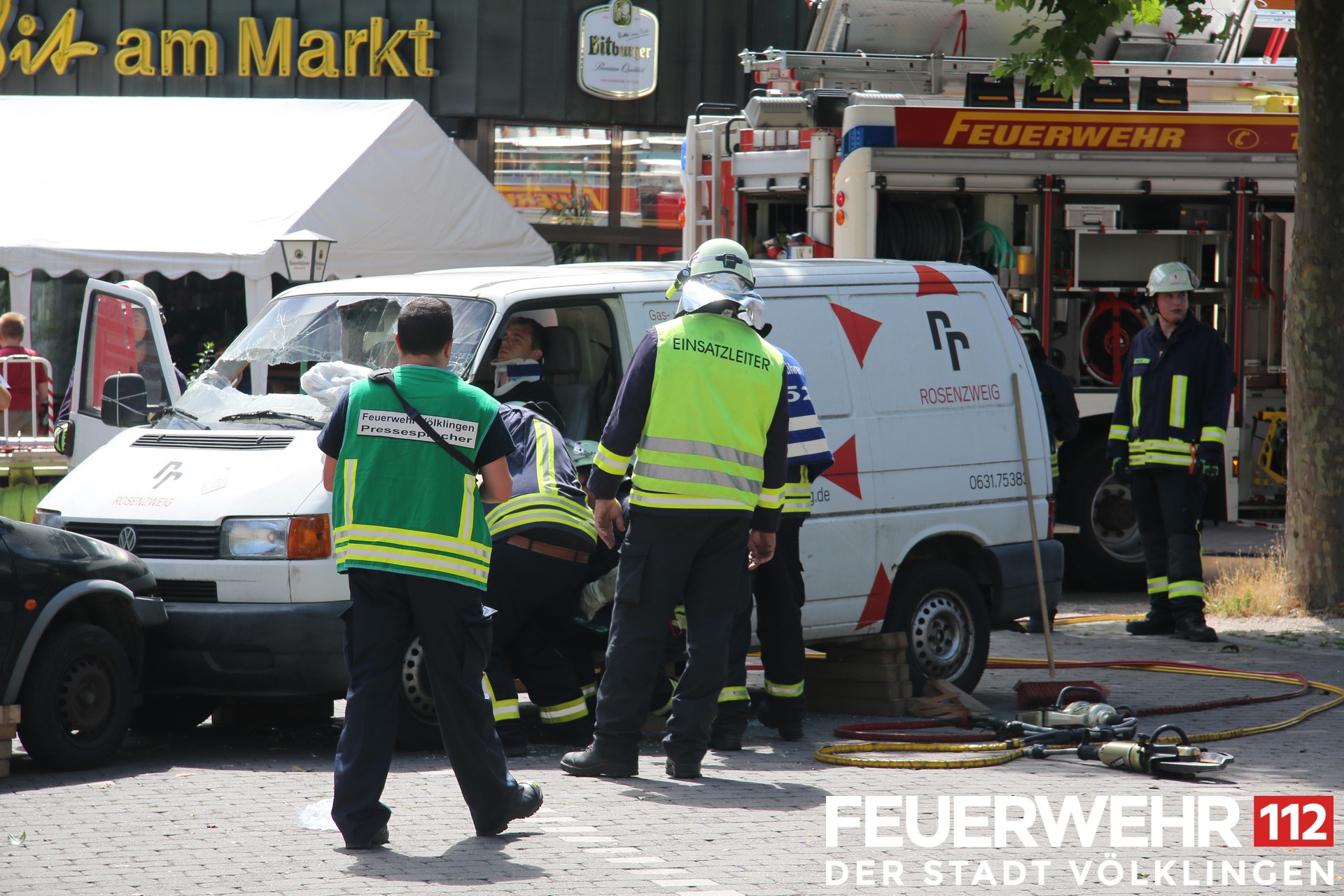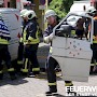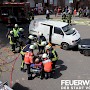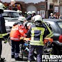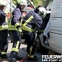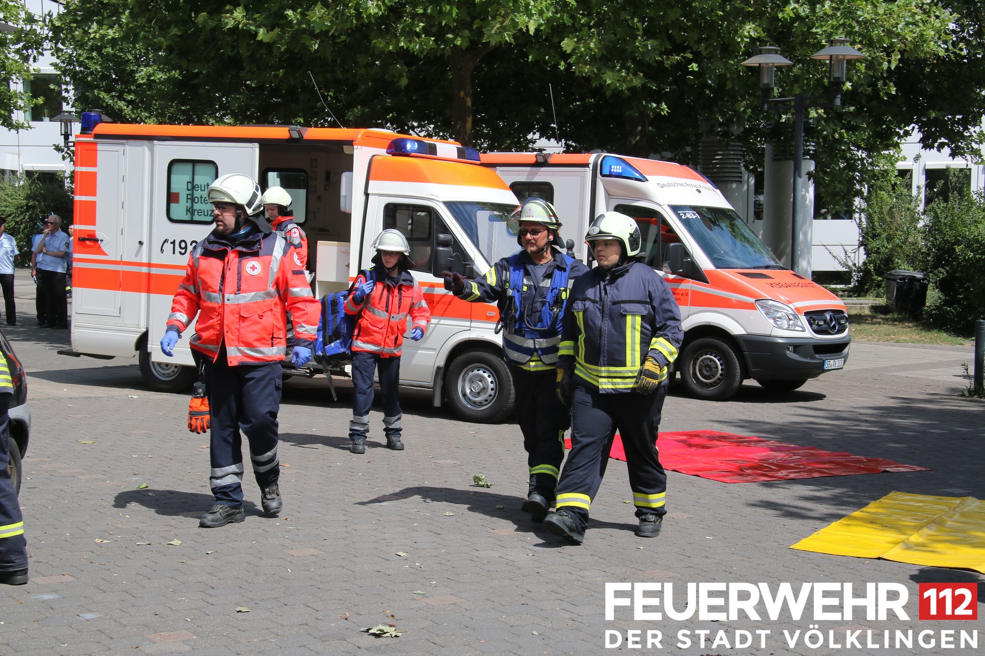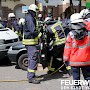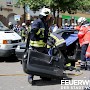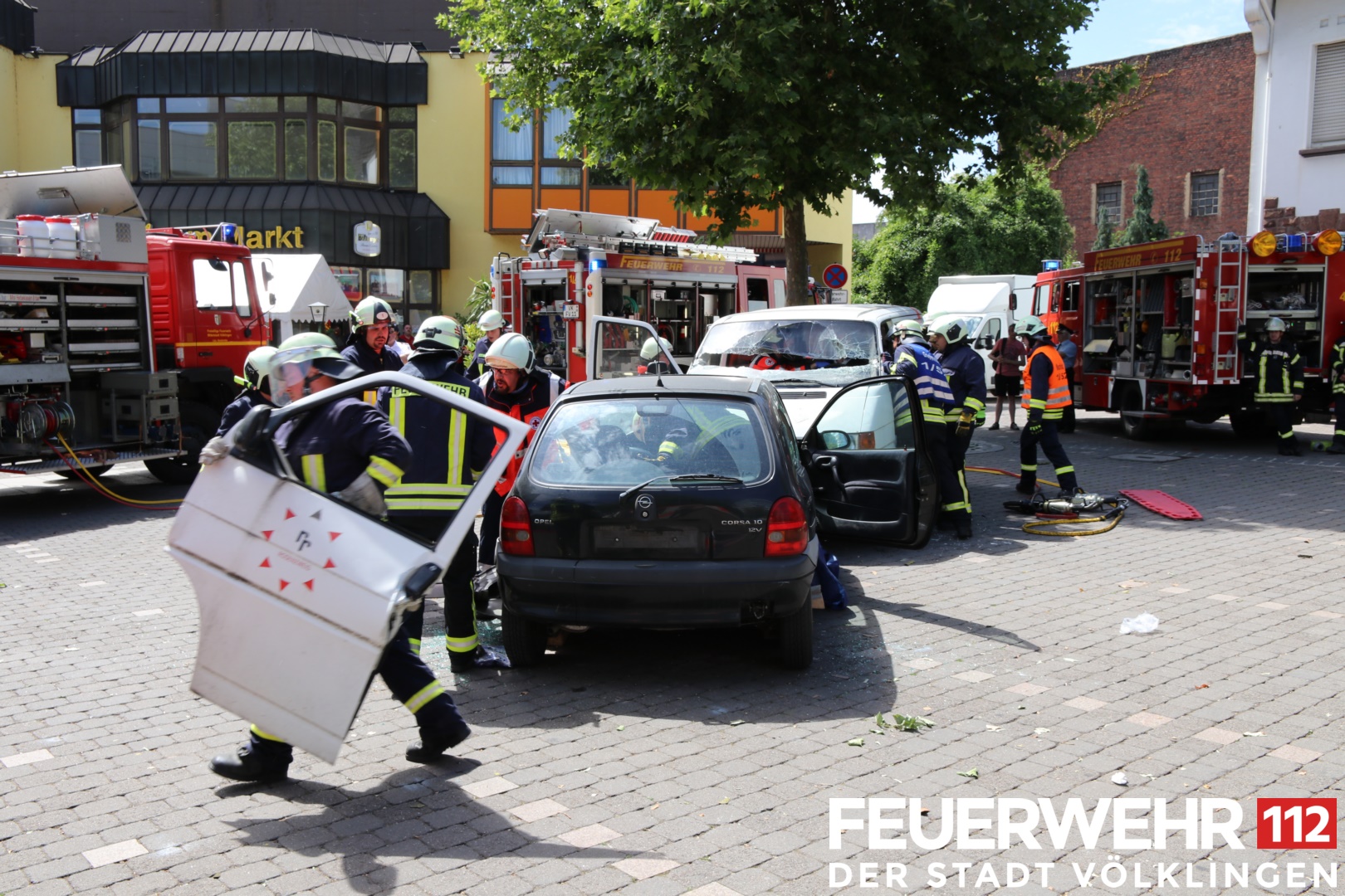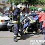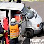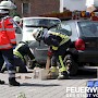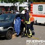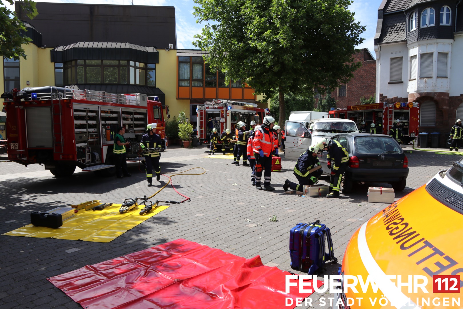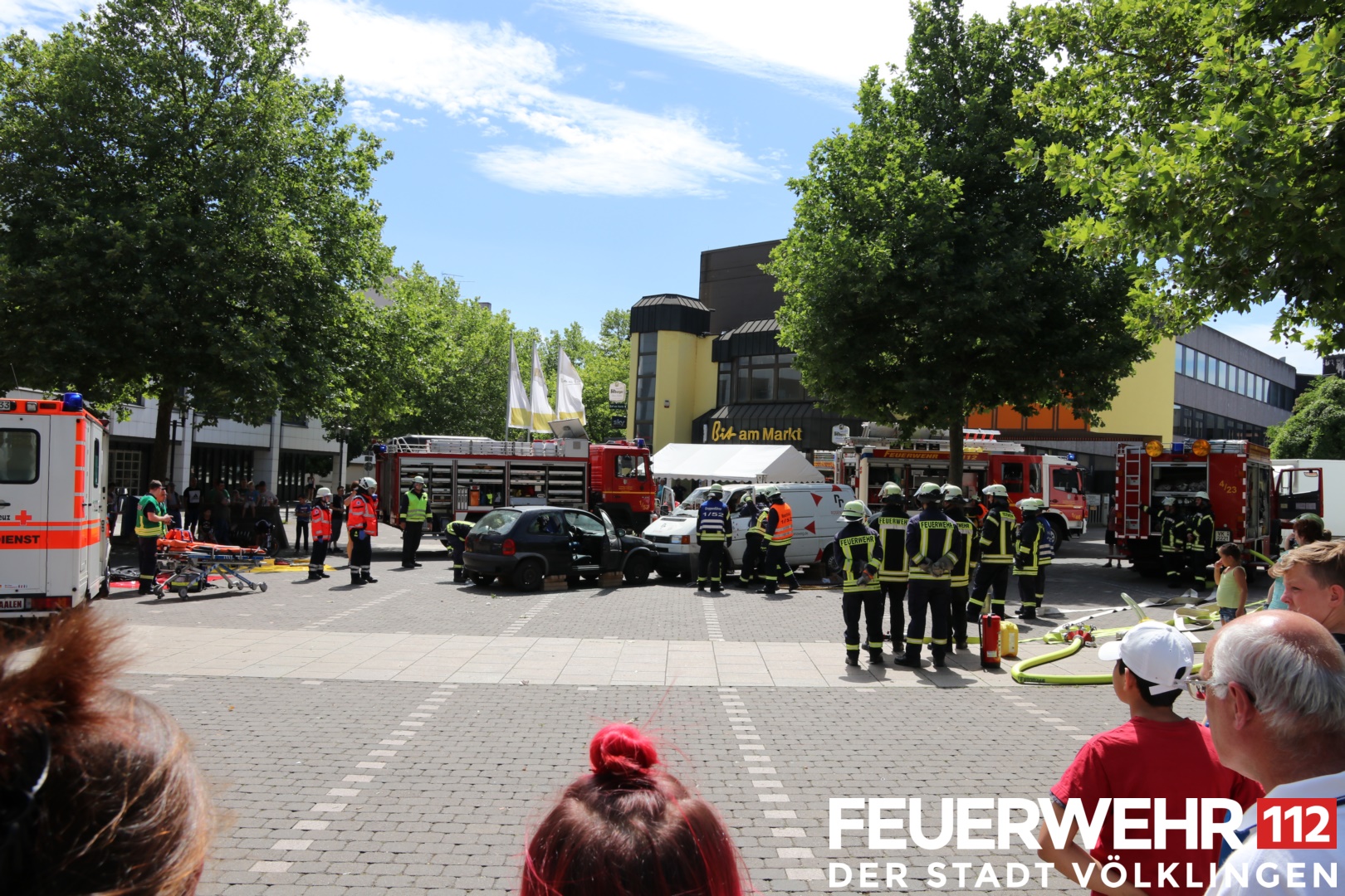 Zuerst wurde ein Verkehrsunfall mit zwei Fahrzeugen demonstriert. An dieser Übung hat auch die Rettungswache Völklingen des DRK mit zwei Fahrzeugen teilgenommen. Ein Pkw war mit einem Lieferwagen zusammengestoßen und aus beiden Fahrzeugen war je eine Person zu retten. Diese wurden mit hydraulischem Rettungsgerät befreit und dem Rettungsdienst übergeben. Hierbei wurden den Zuschauern die Vorgehensweise über Lautsprecher erklärt, so dass sie sich ein Bild über die einzelnen Schritte machen konnten.