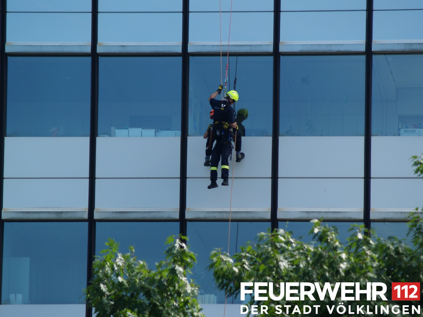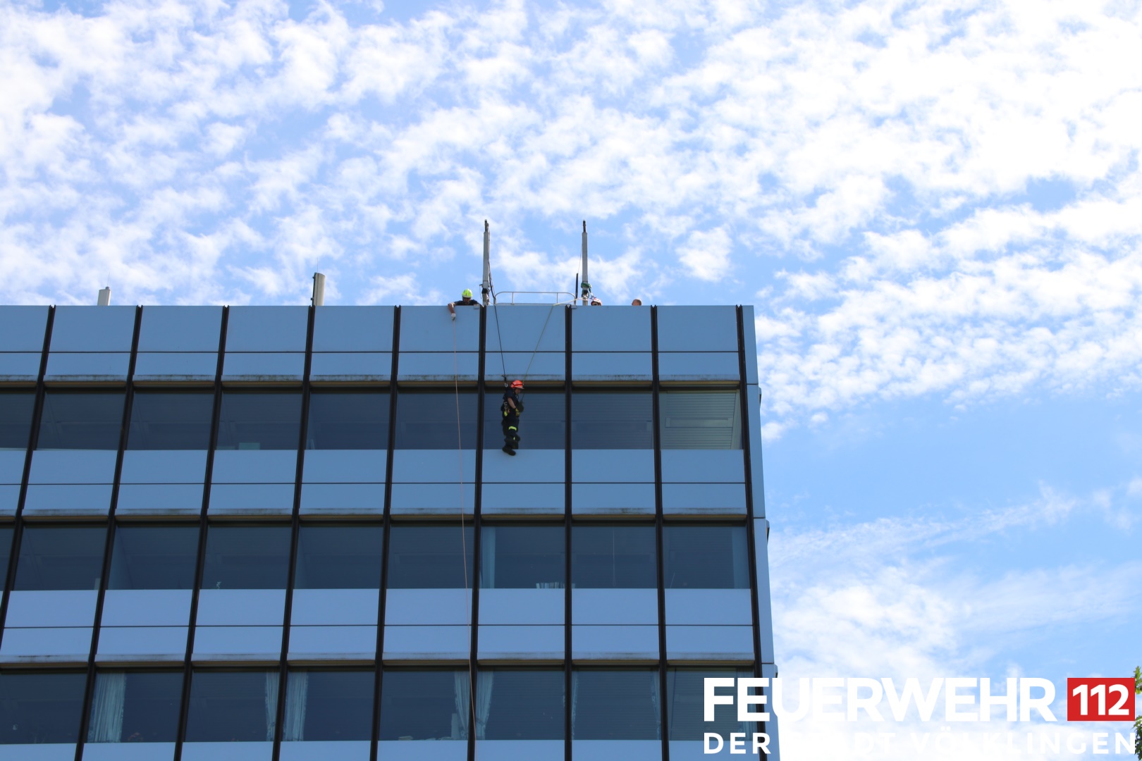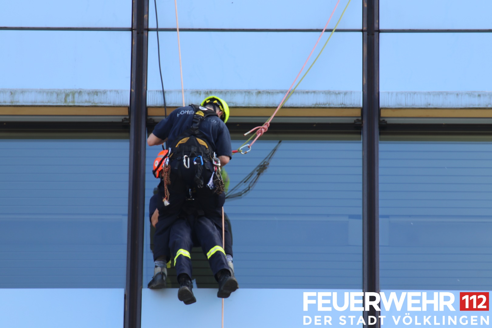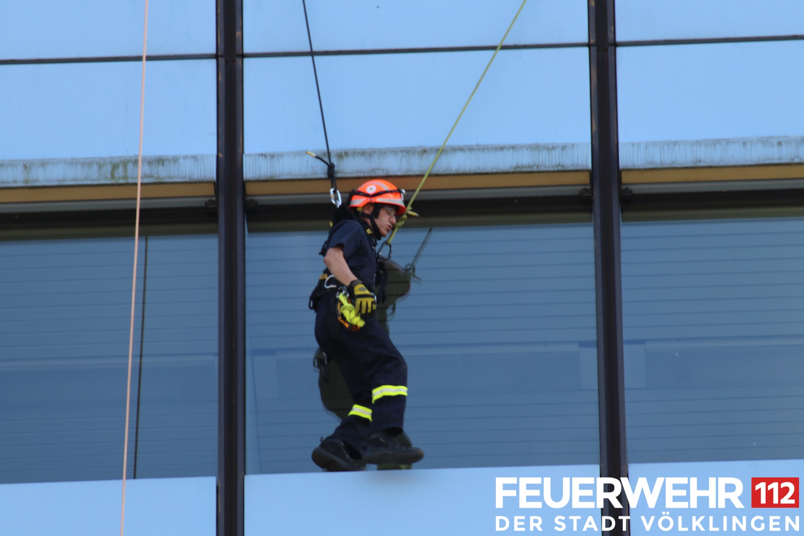Im zweiten Teil der Übung wurde die Rettung einer Person an der Außenfassade des Rathauses dargestellt. Diese wurde von der Höhenrettungsgruppe des Kraftwerks Fenne vorgeführt. Ein Arbeiter war bei Arbeiten an der Fassade nicht mehr in der Lage, sich selbst zu retten. Ein Höhenretter seilte sich zu der Person ab, um sie sicher auf das Vordach des Gebäudes zu bringen, von wo aus sie mit der Drehleiter der Feuerwehr Völklingen nach unten verbracht wurde.