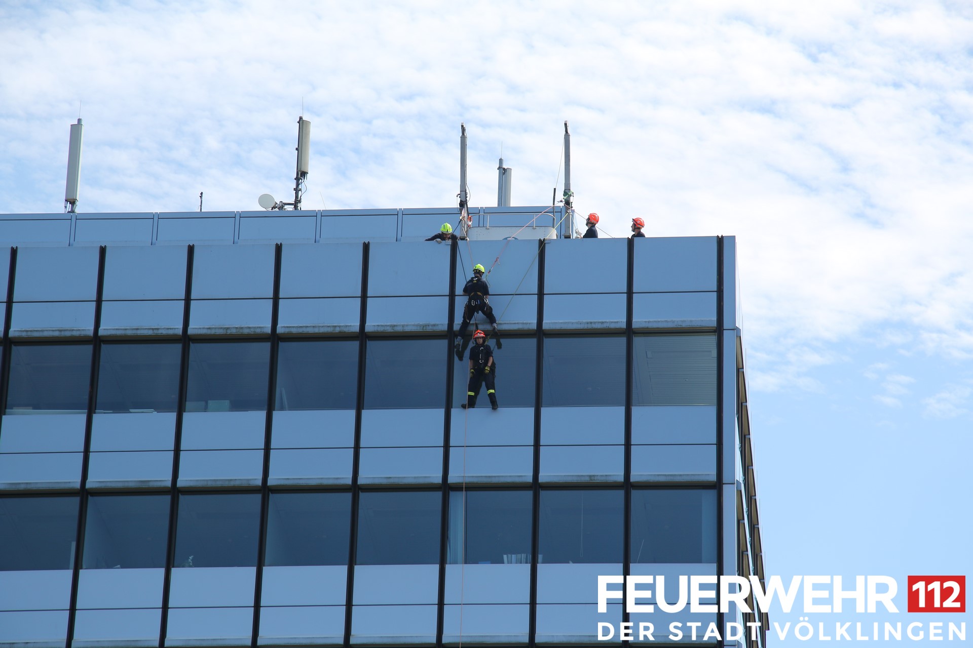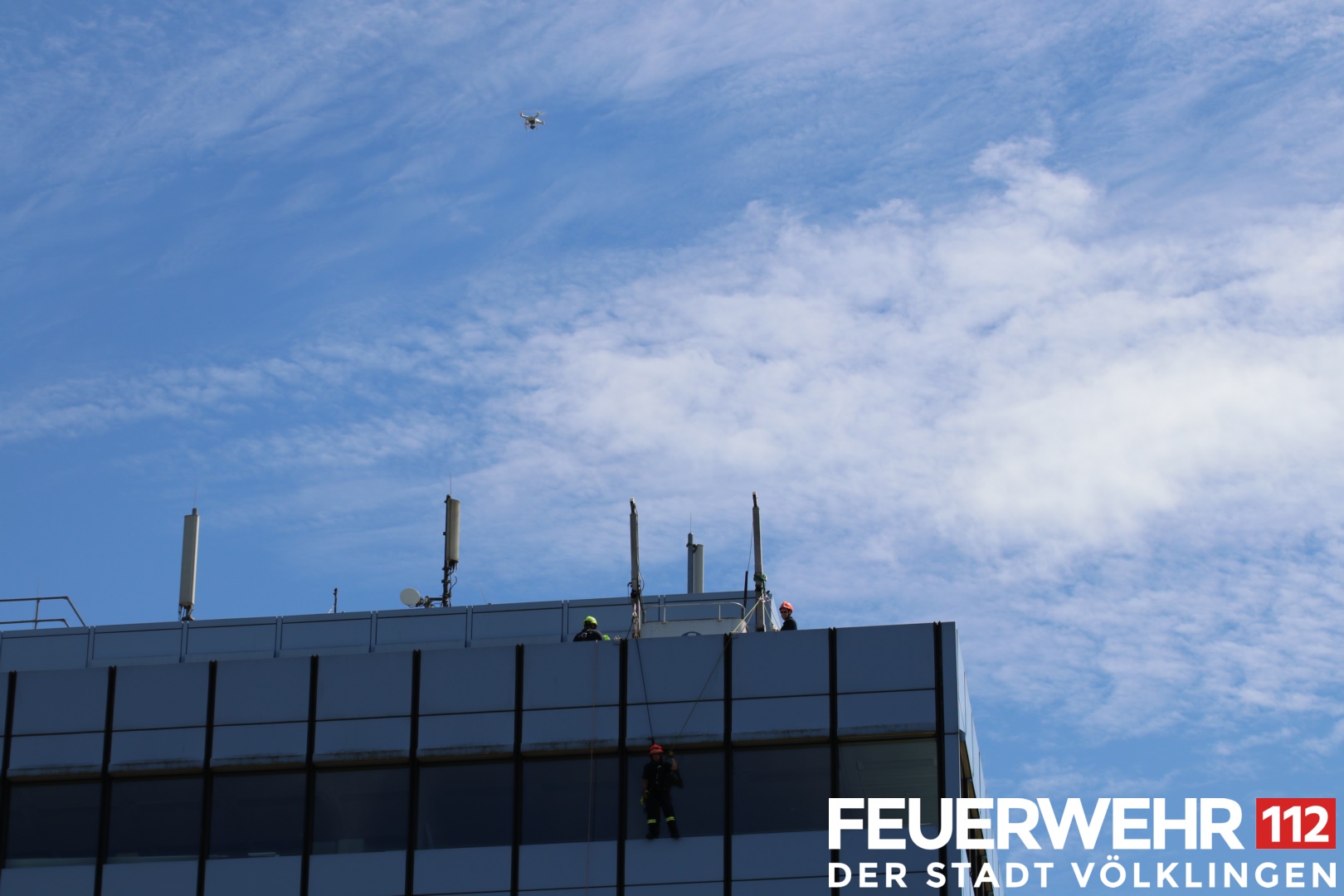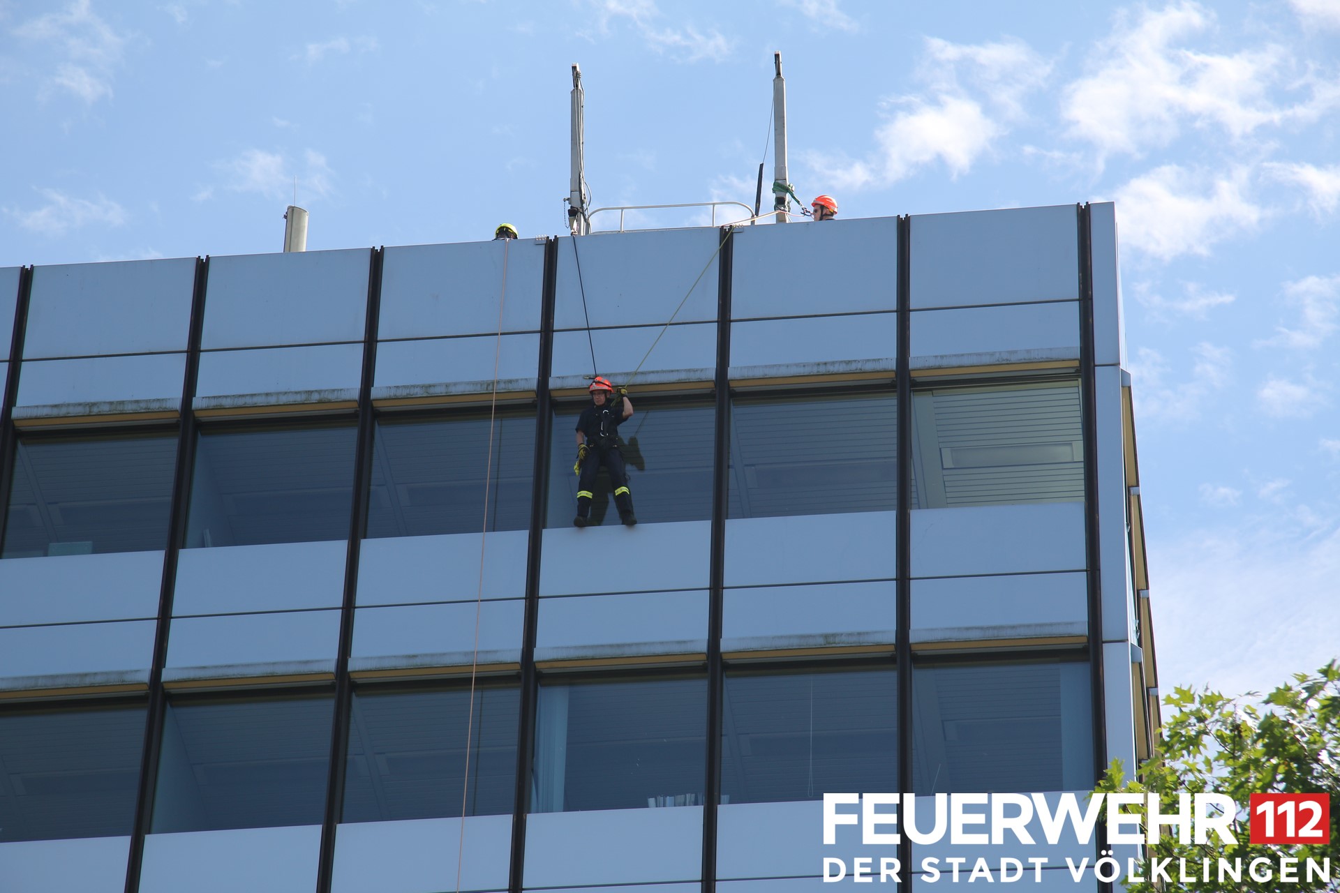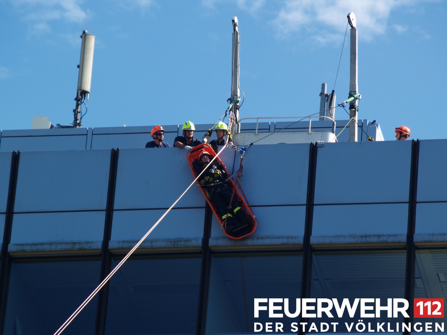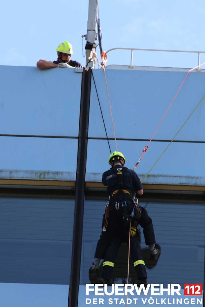 Im zweiten Teil der Übung wurde die Rettung einer Person an der Außenfassade des Rathauses dargestellt. Diese wurde von der Höhenrettungsgruppe des Kraftwerks Fenne vorgeführt. Ein Arbeiter war bei Arbeiten an der Fassade nicht mehr in der Lage, sich selbst zu retten. Ein Höhenretter seilte sich zu der Person ab, um sie sicher auf das Vordach des Gebäudes zu bringen, von wo aus sie mit der Drehleiter der Feuerwehr Völklingen nach unten verbracht wurde.