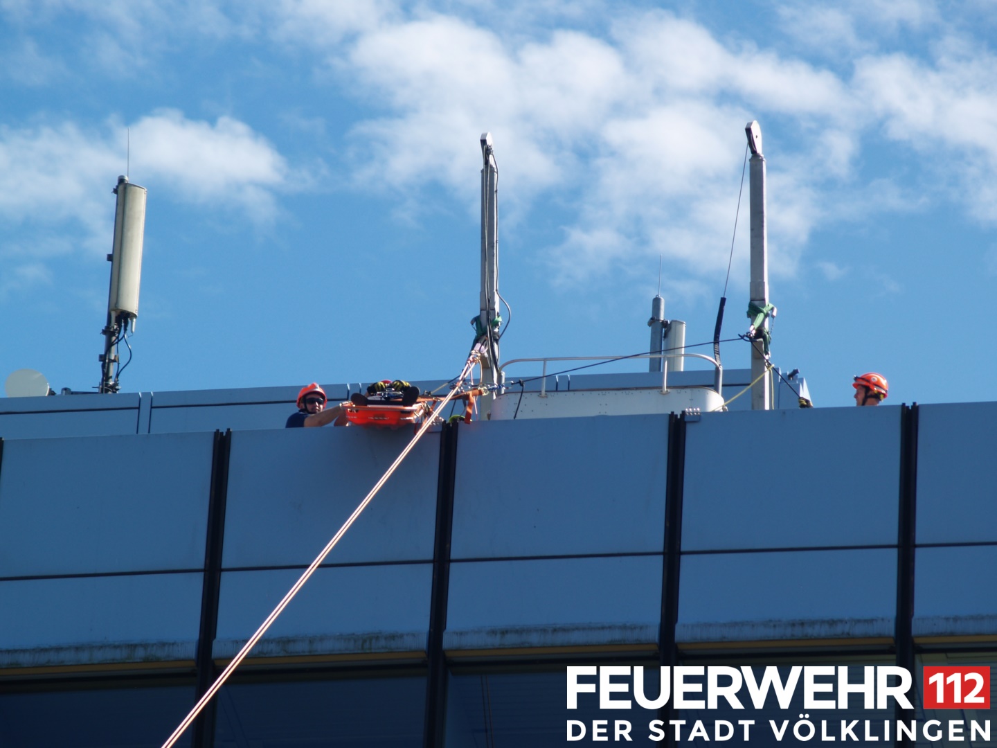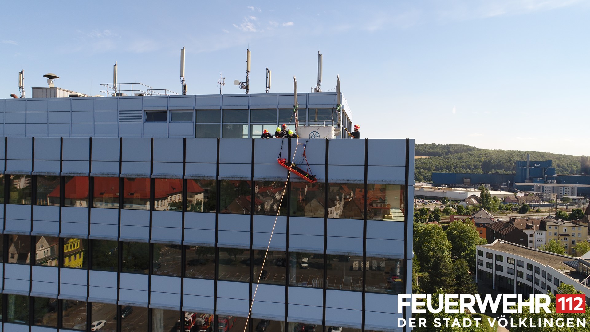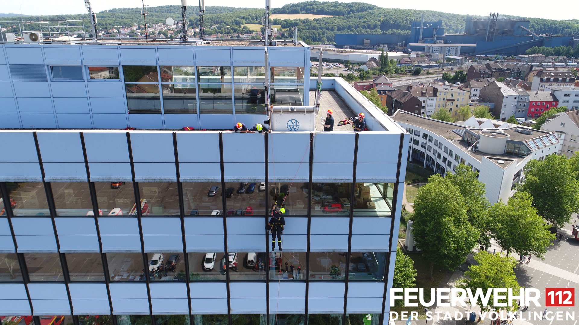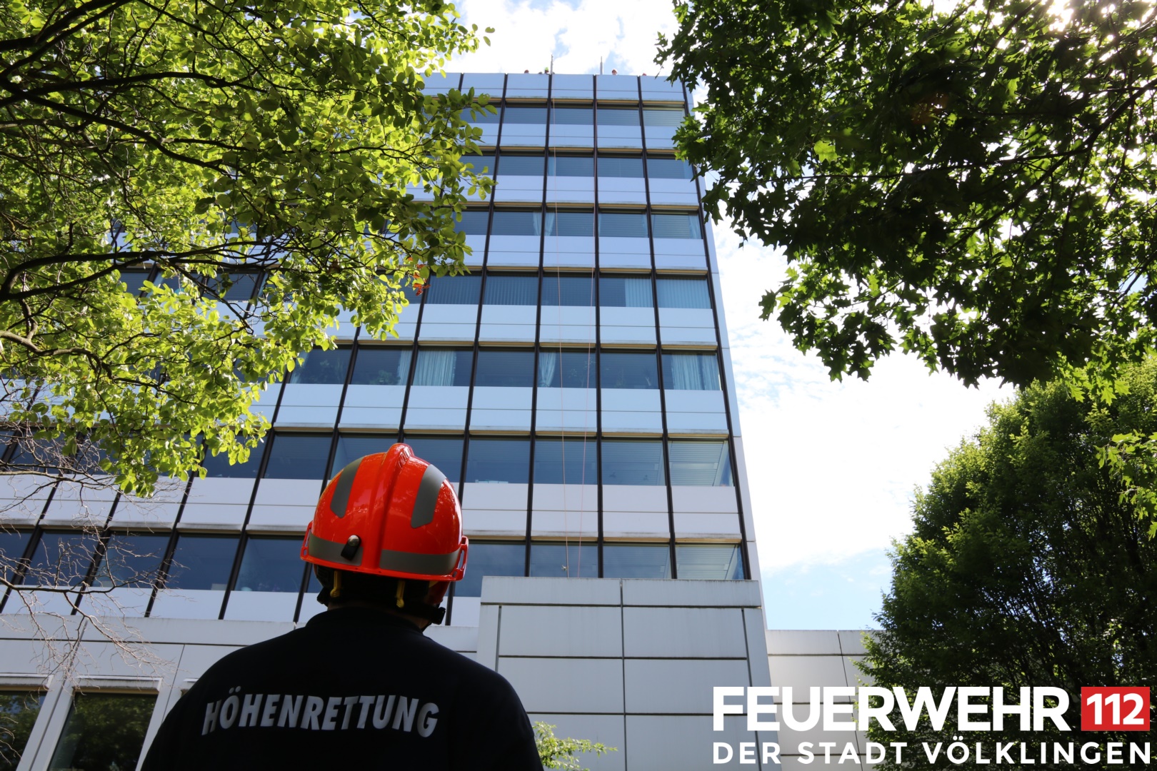 Im zweiten Teil der Übung wurde die Rettung einer Person an der Außenfassade des Rathauses dargestellt. Diese wurde von der Höhenrettungsgruppe des Kraftwerks Fenne vorgeführt. Ein Arbeiter war bei Arbeiten an der Fassade nicht mehr in der Lage, sich selbst zu retten. Ein Höhenretter seilte sich zu der Person ab, um sie sicher auf das Vordach des Gebäudes zu bringen, von wo aus sie mit der Drehleiter der Feuerwehr Völklingen nach unten verbracht wurde.