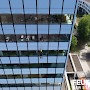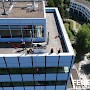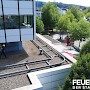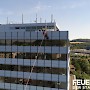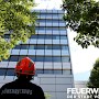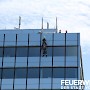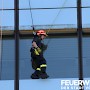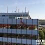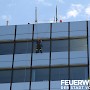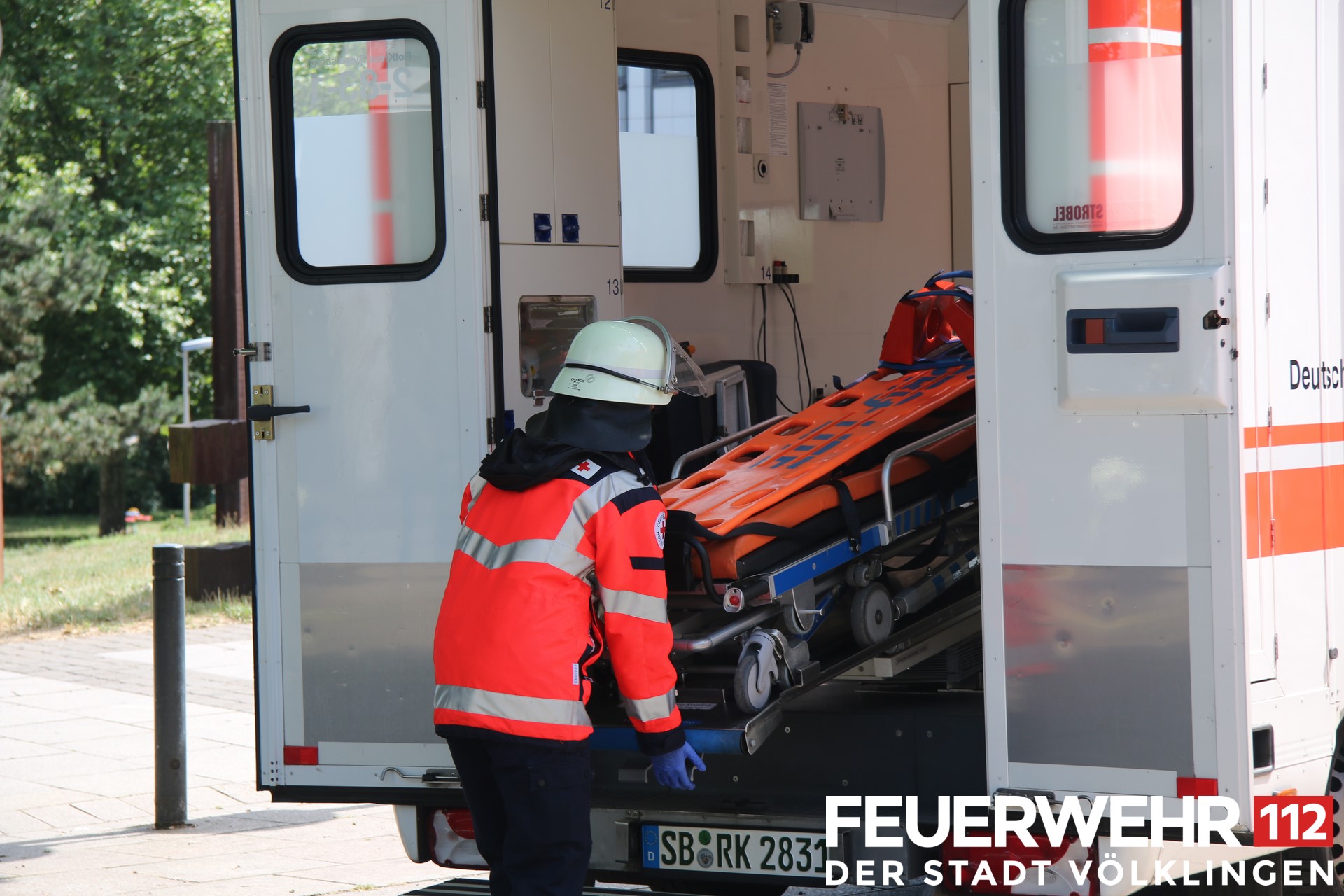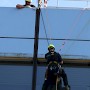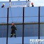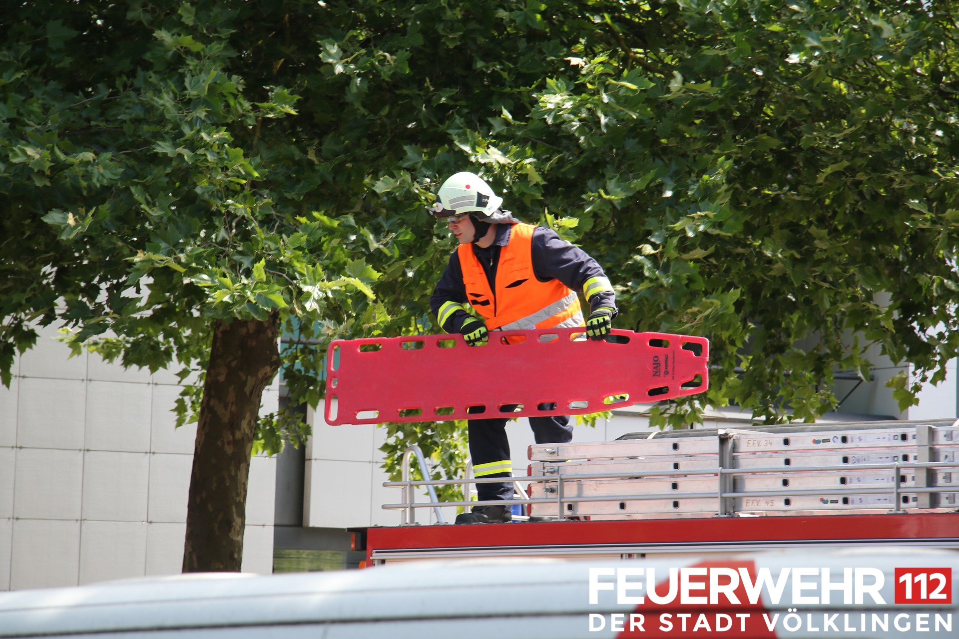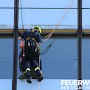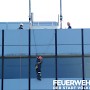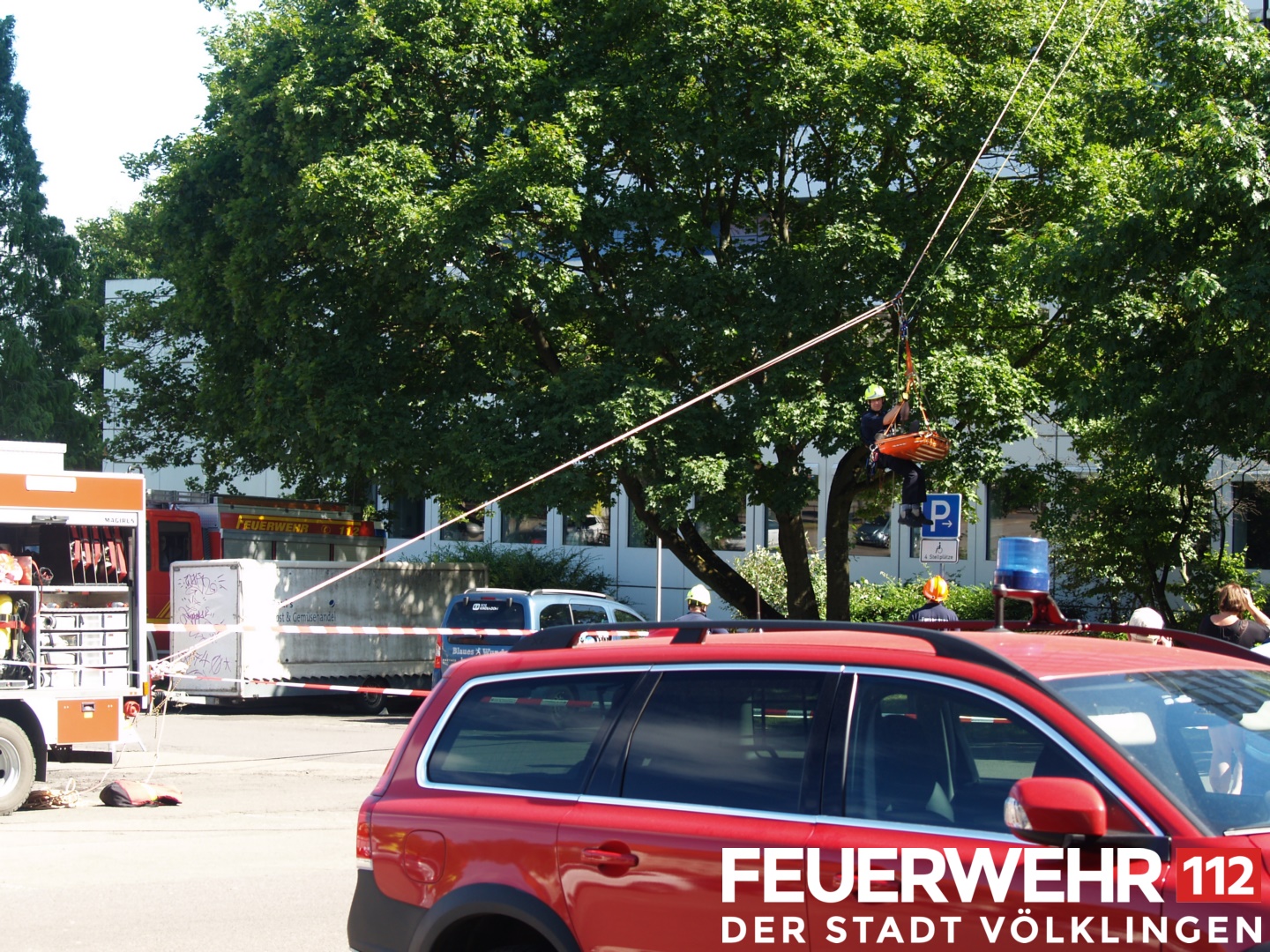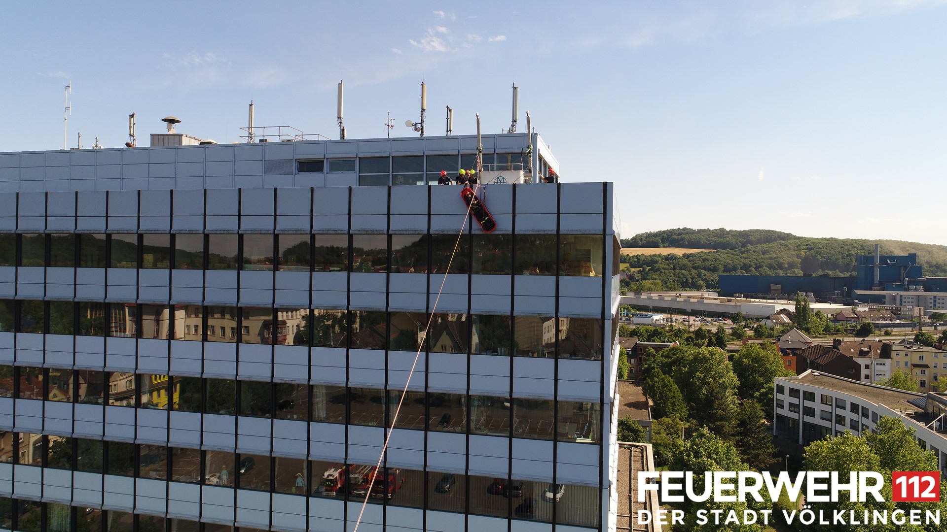 Im zweiten Teil der Übung wurde die Rettung einer Person an der Außenfassade des Rathauses dargestellt. Diese wurde von der Höhenrettungsgruppe des Kraftwerks Fenne vorgeführt. Ein Arbeiter war bei Arbeiten an der Fassade nicht mehr in der Lage, sich selbst zu retten. Ein Höhenretter seilte sich zu der Person ab, um sie sicher auf das Vordach des Gebäudes zu bringen, von wo aus sie mit der Drehleiter der Feuerwehr Völklingen nach unten verbracht wurde.