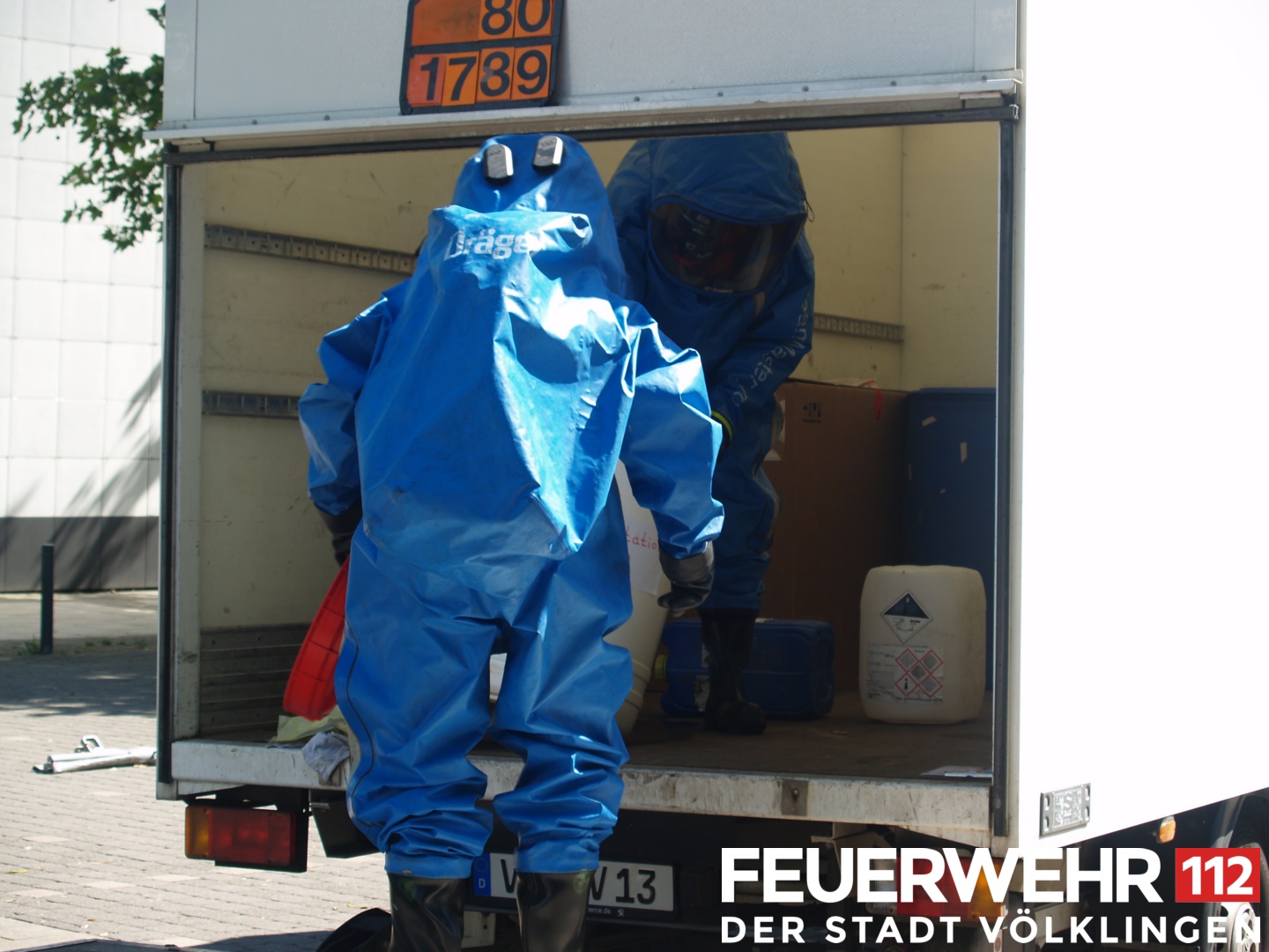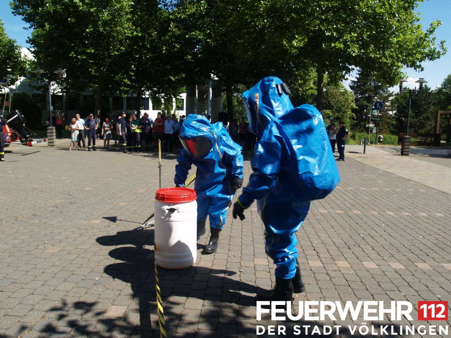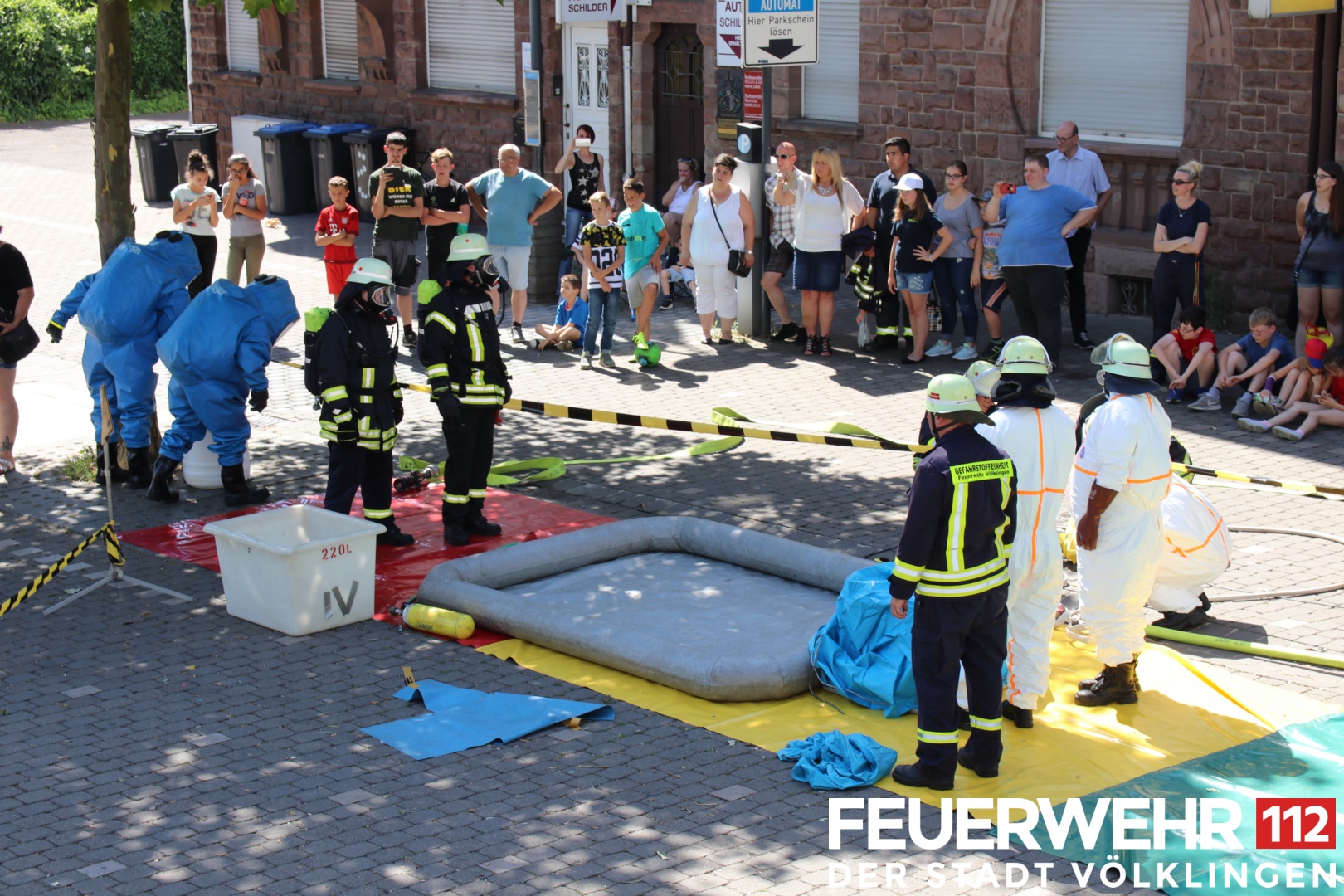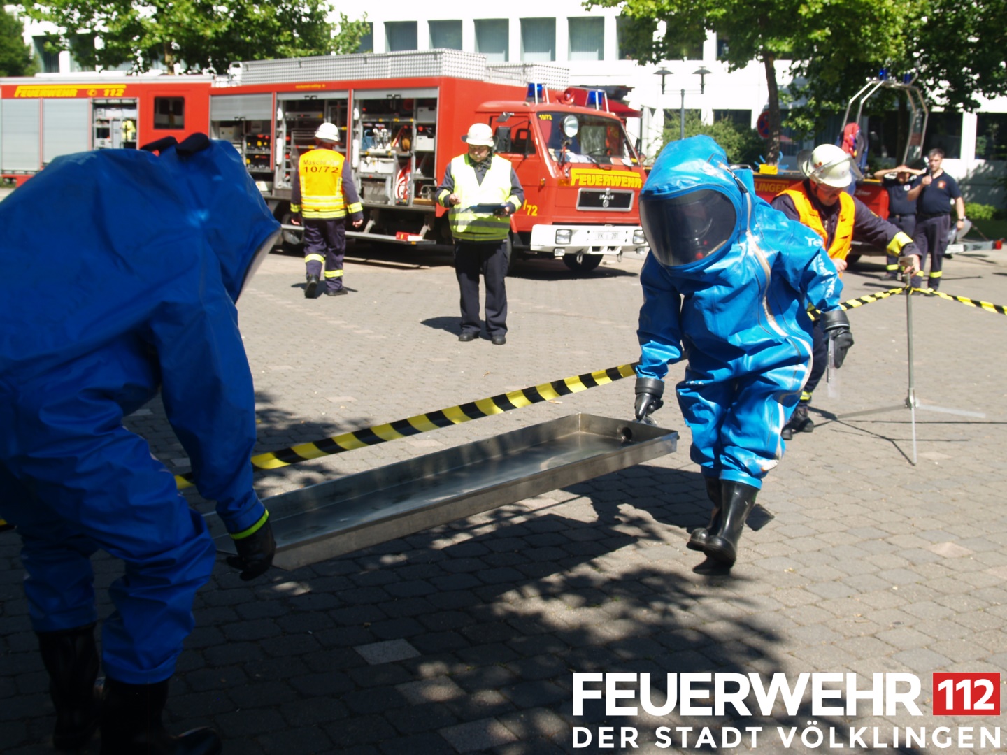 In der dritten Übung stellte die Gefahrstoffeinheit der Freiwilligen Feuerwehr Völklingen ihr Können unter Beweis. Sie stellte einen Gefahrgutunfall nach einem Bremsmanöver dar. Der verletzte Fahrer wurde gerettet und das Fass mit der auslaufenden Flüssigkeit von einem Trupp unter Chemikalienschutzanzug gesichert und zum Abtransport bereitgestellt.