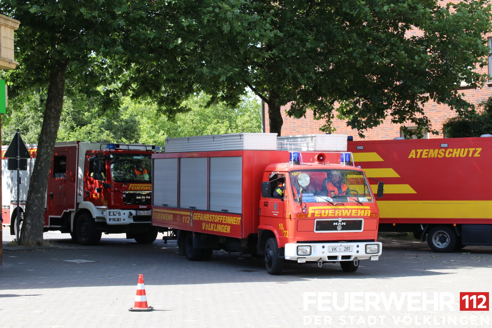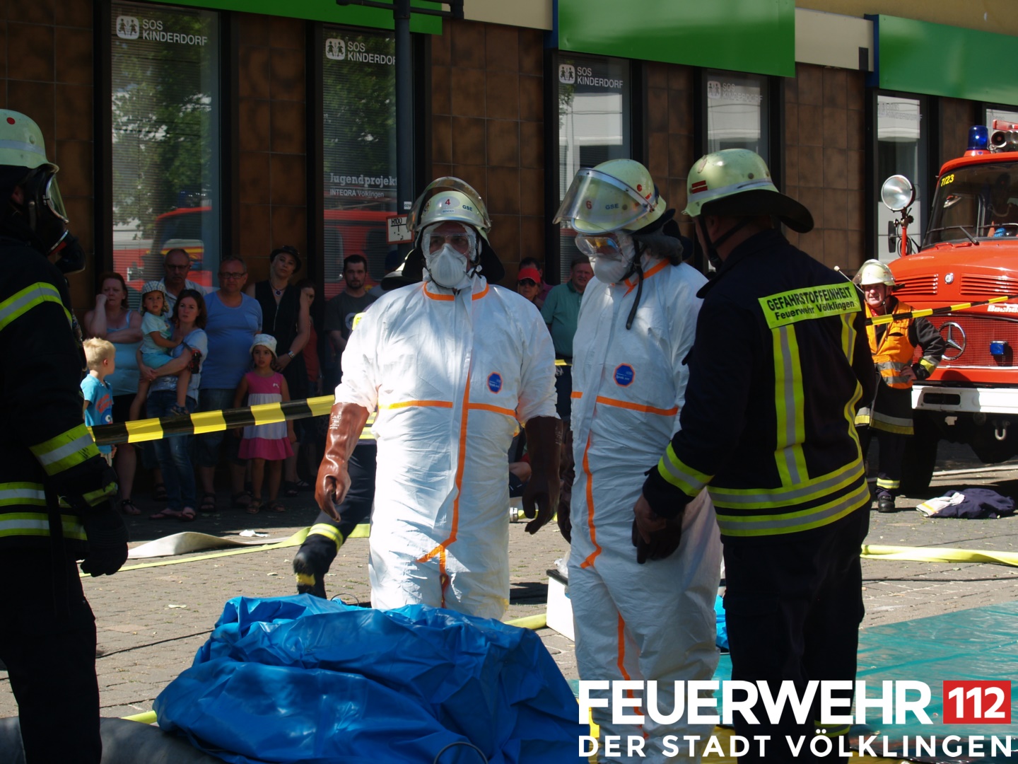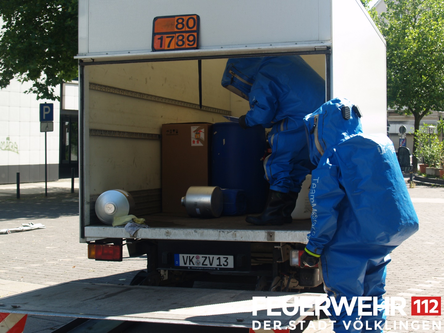 In der dritten Übung stellte die Gefahrstoffeinheit der Freiwilligen Feuerwehr Völklingen ihr Können unter Beweis. Sie stellte einen Gefahrgutunfall nach einem Bremsmanöver dar. Der verletzte Fahrer wurde gerettet und das Fass mit der auslaufenden Flüssigkeit von einem Trupp unter Chemikalienschutzanzug gesichert und zum Abtransport bereitgestellt.