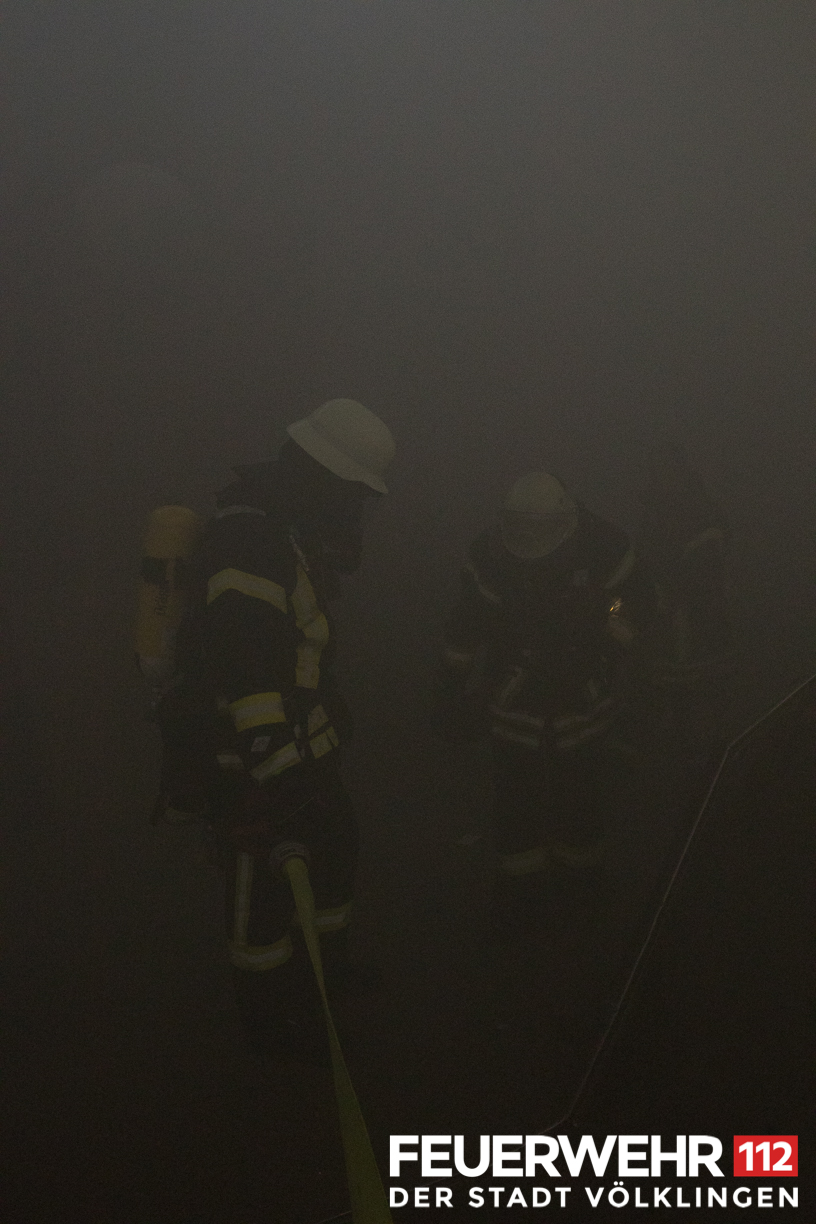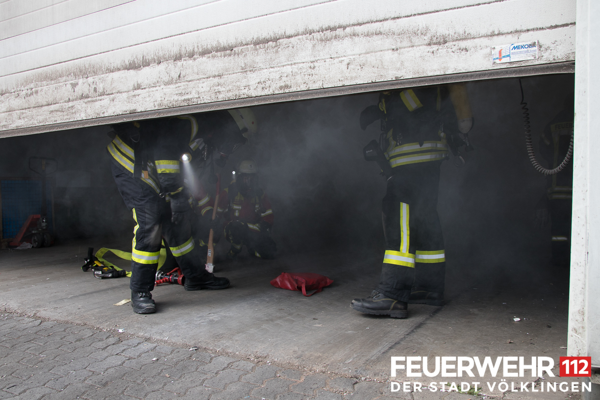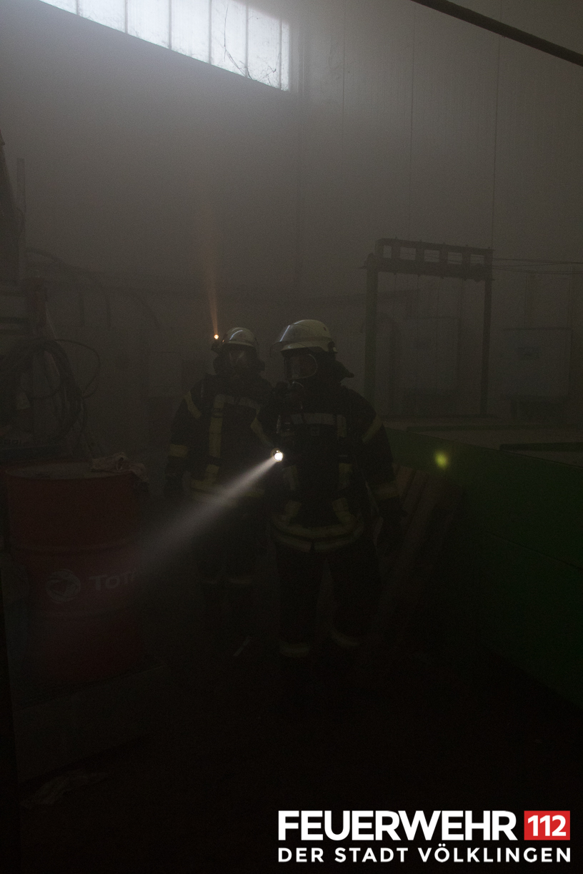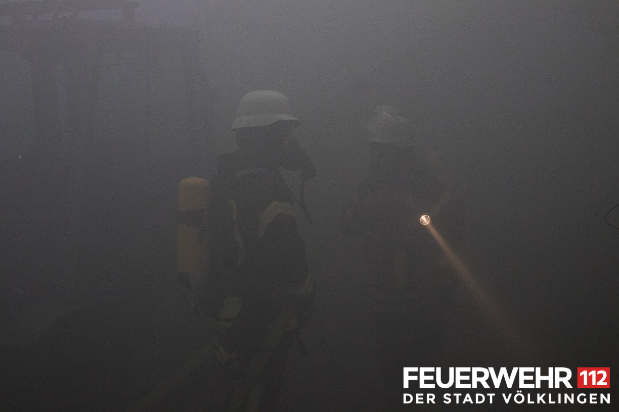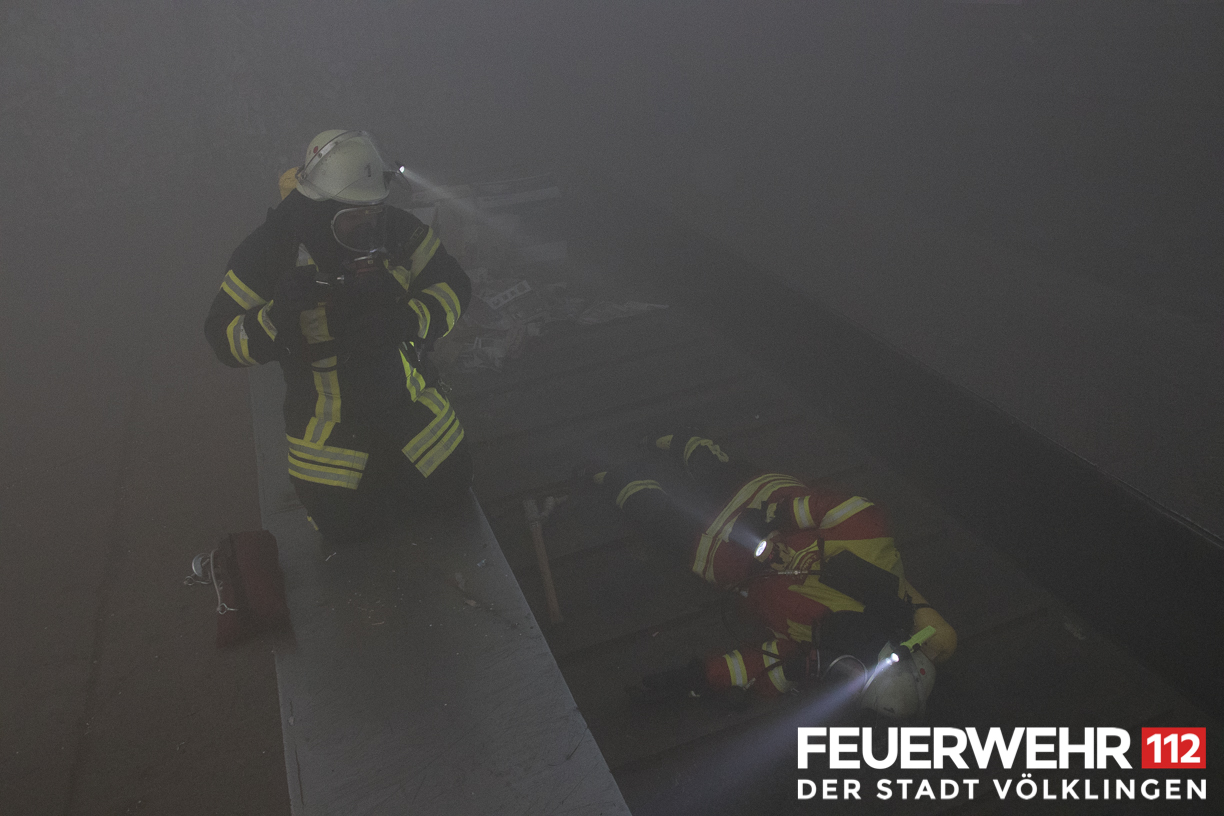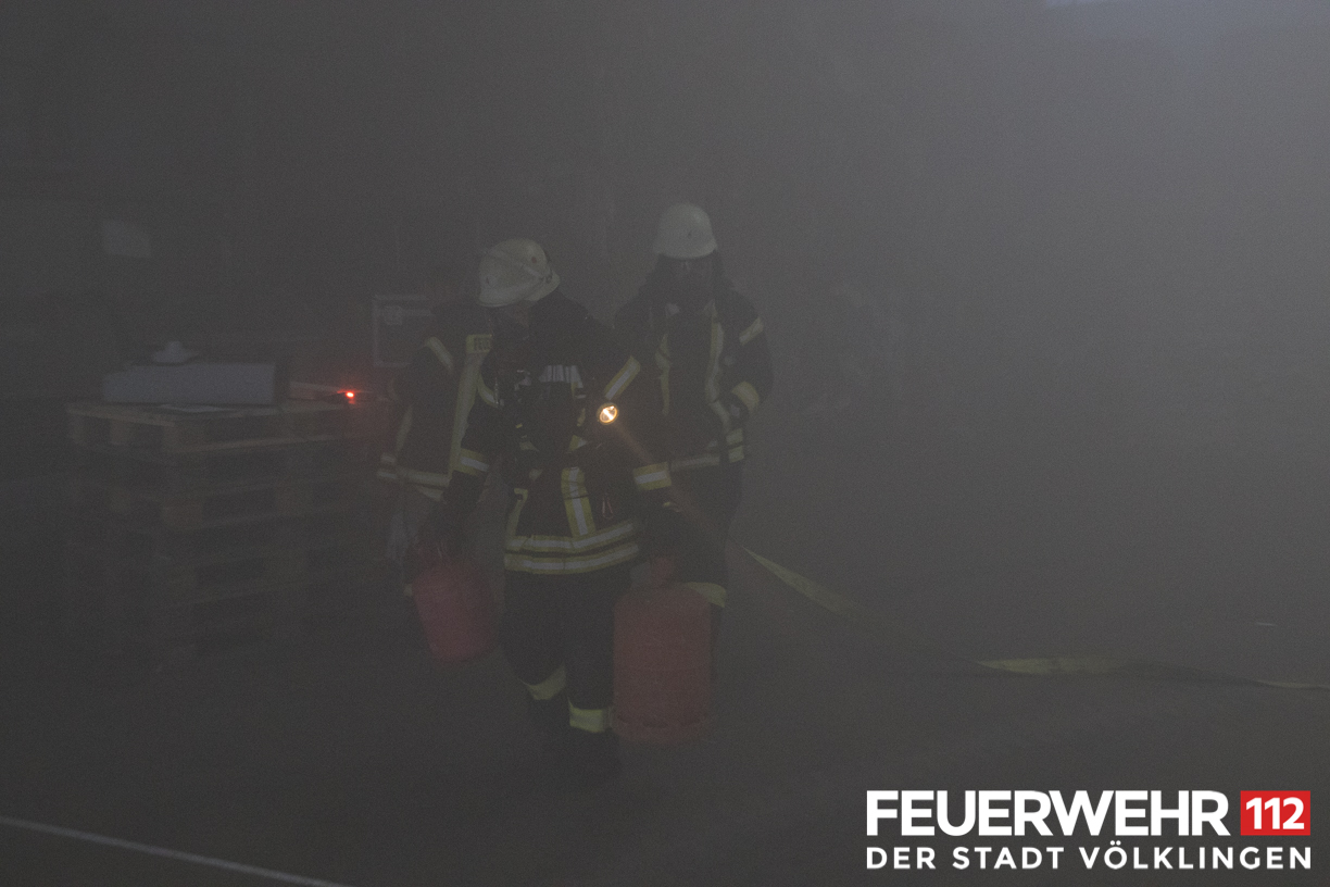 Ein Trupp unter schwerem Atemschutz ging zur Personensuche in die verrauchte Lagerhalle vor. Unterstützt wurden sie hierbei von einem weiterem Trupp des Löschbezirks Wadgassen.