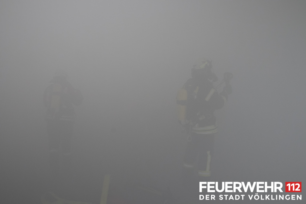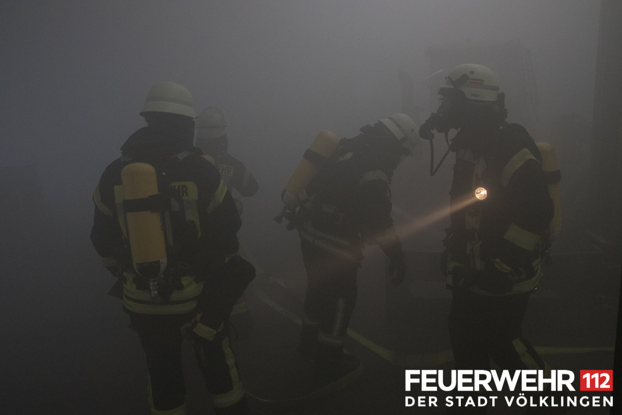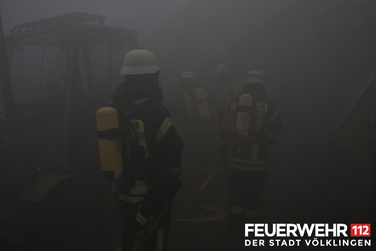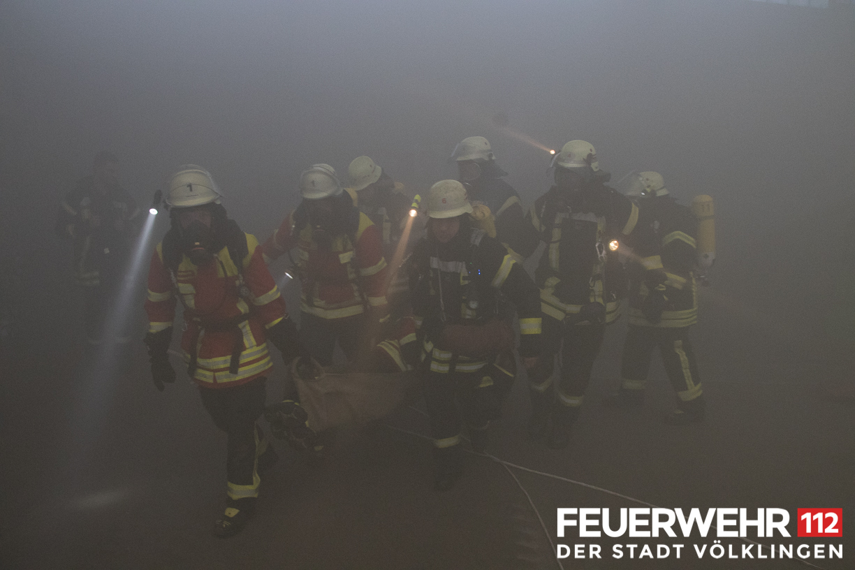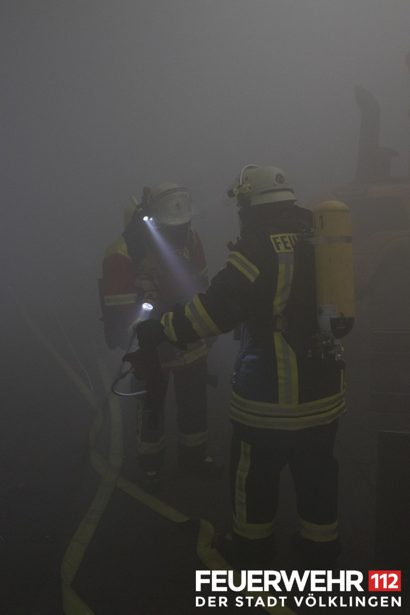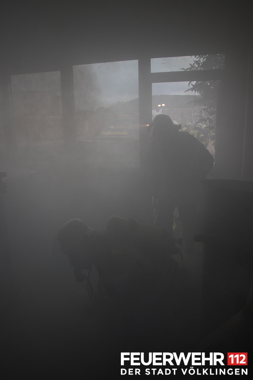 Ein Trupp unter schwerem Atemschutz ging zur Personensuche in die verrauchte Lagerhalle vor. Unterstützt wurden sie hierbei von einem weiterem Trupp des Löschbezirks Wadgassen.