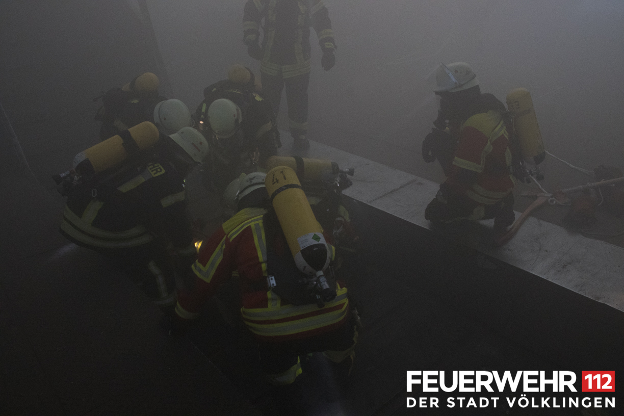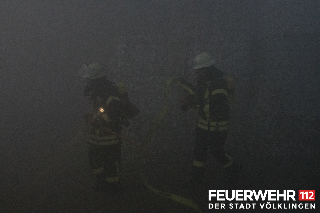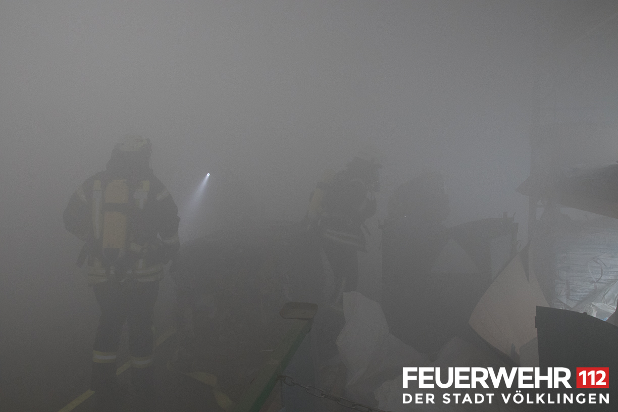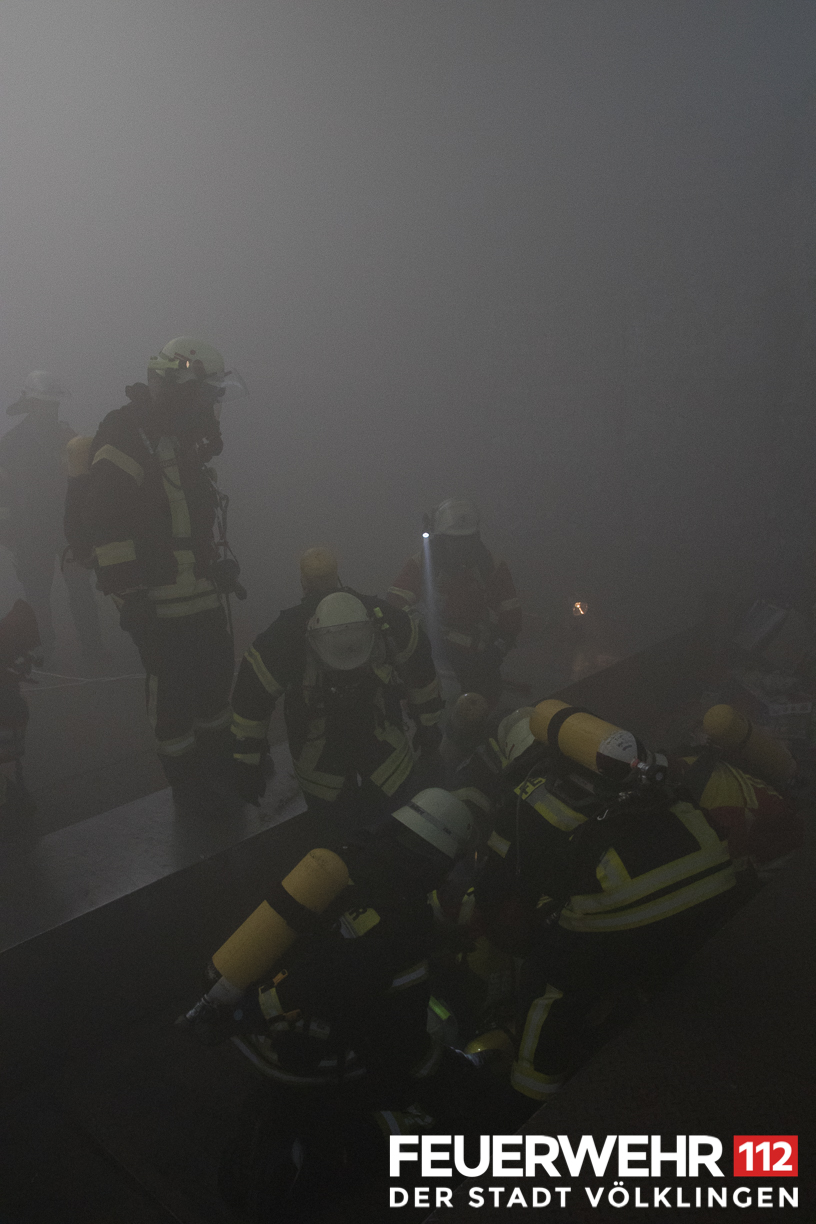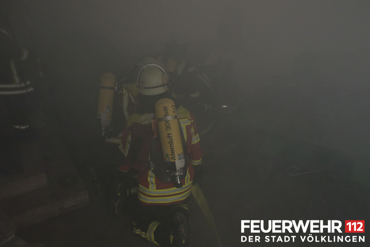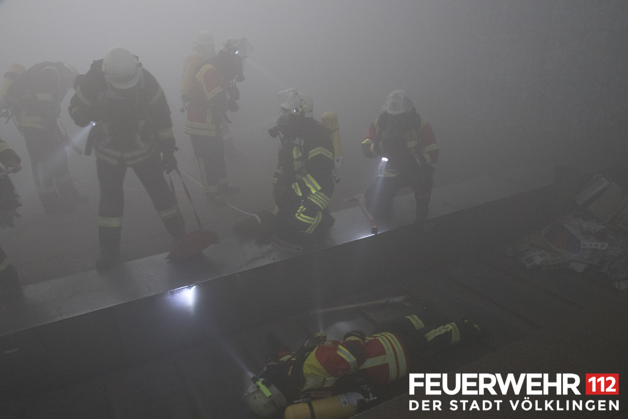 Ein Trupp unter schwerem Atemschutz ging zur Personensuche in die verrauchte Lagerhalle vor. Unterstützt wurden sie hierbei von einem weiterem Trupp des Löschbezirks Wadgassen.