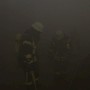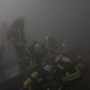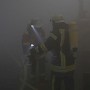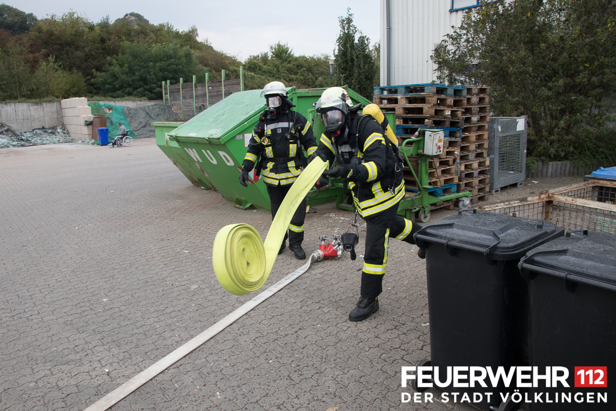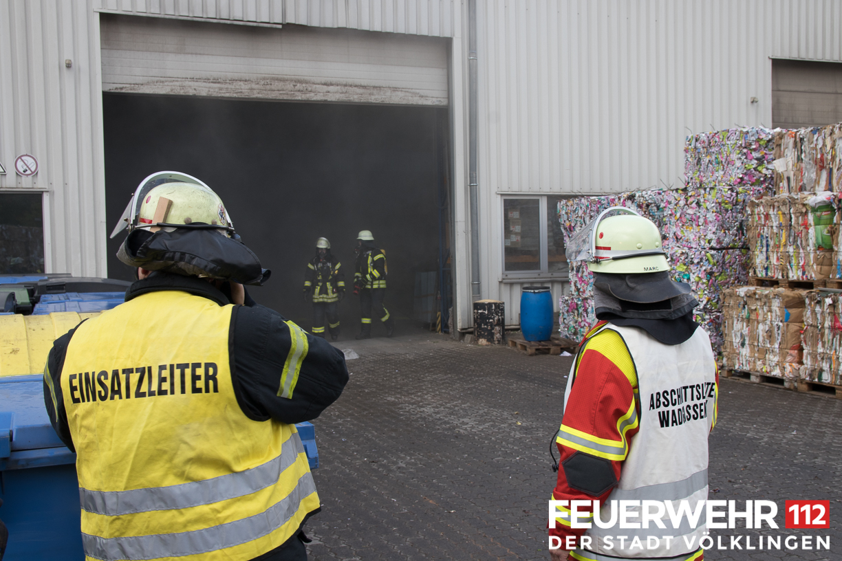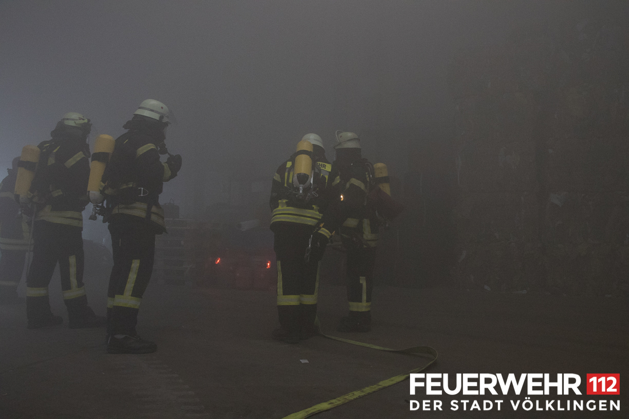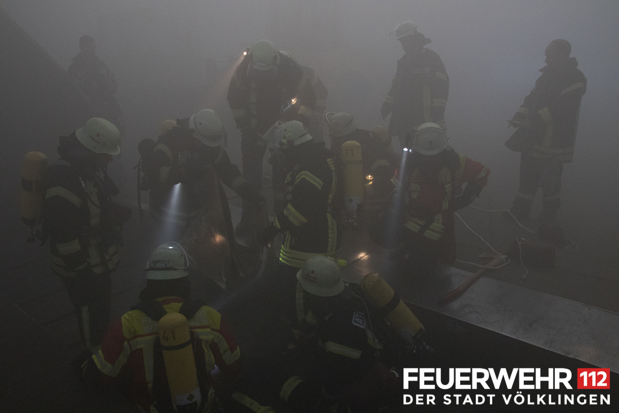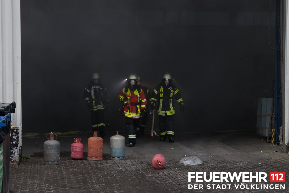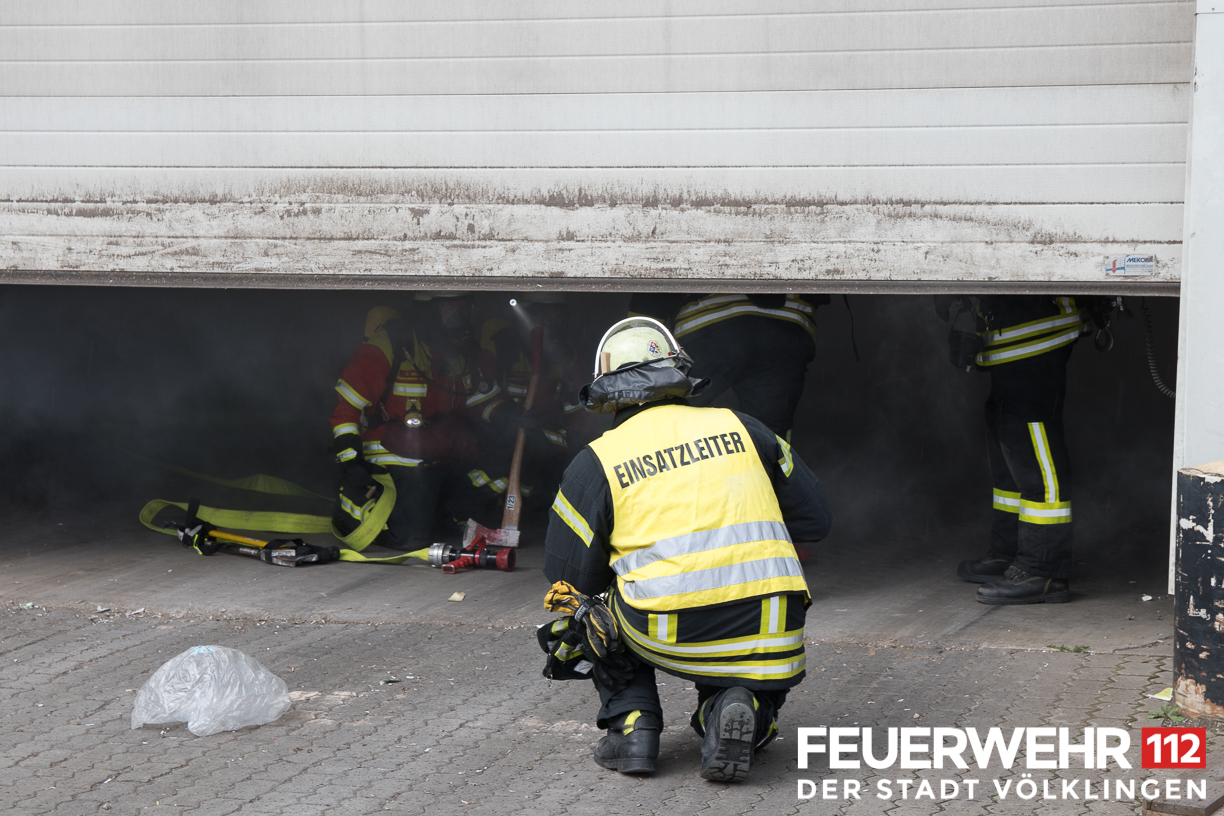 Ein Trupp unter schwerem Atemschutz ging zur Personensuche in die verrauchte Lagerhalle vor. Unterstützt wurden sie hierbei von einem weiterem Trupp des Löschbezirks Wadgassen.