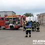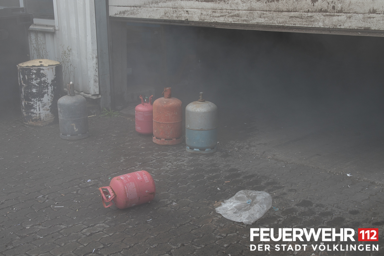 Besondere Gefahr für die Einsatzkräfte ging von einem Gefahrstoffcontainer und Gasflaschen im Inneren, sowie von der auf dem Dach der Halle installierten Photovoltaikanlage aus.