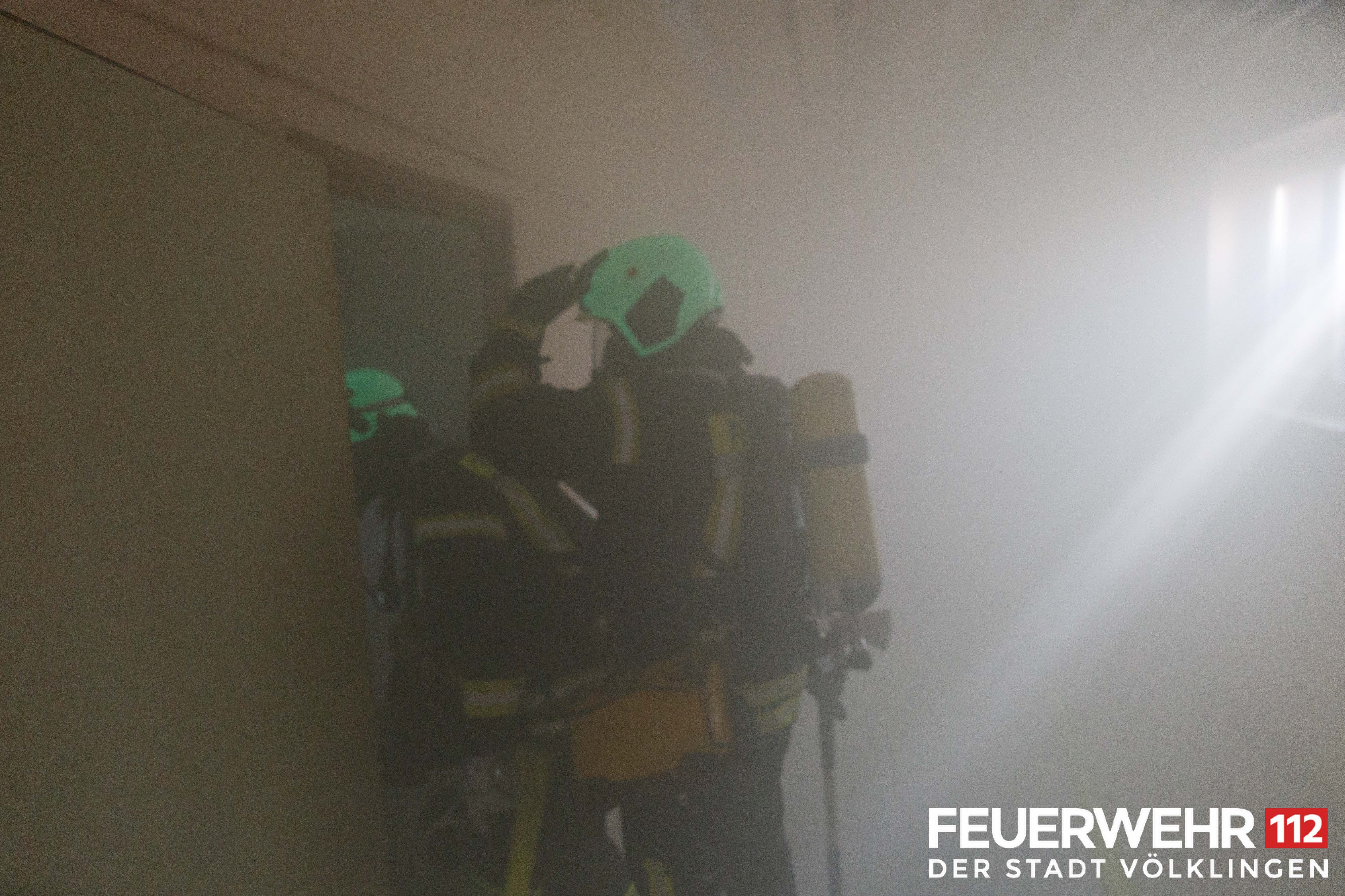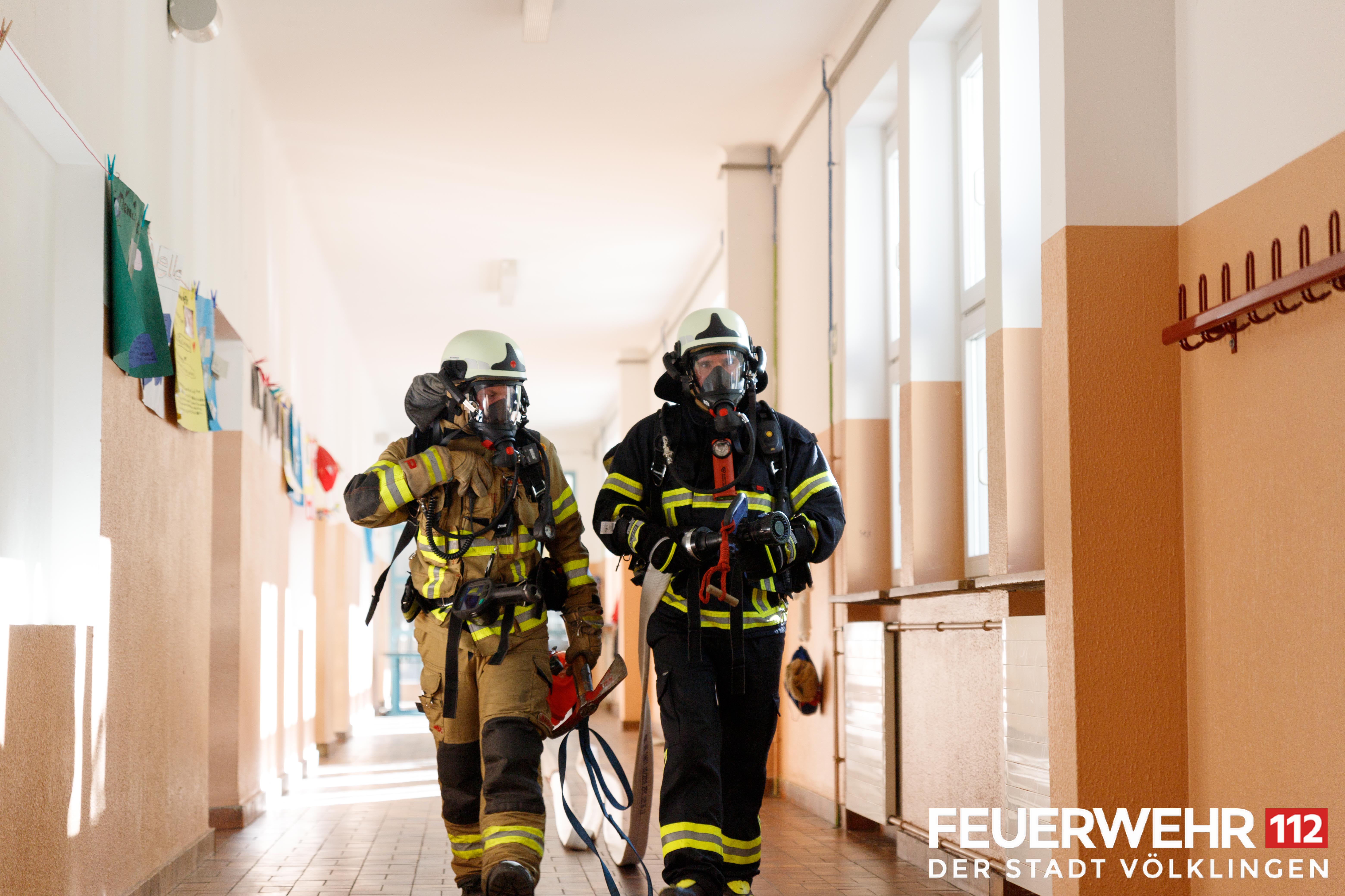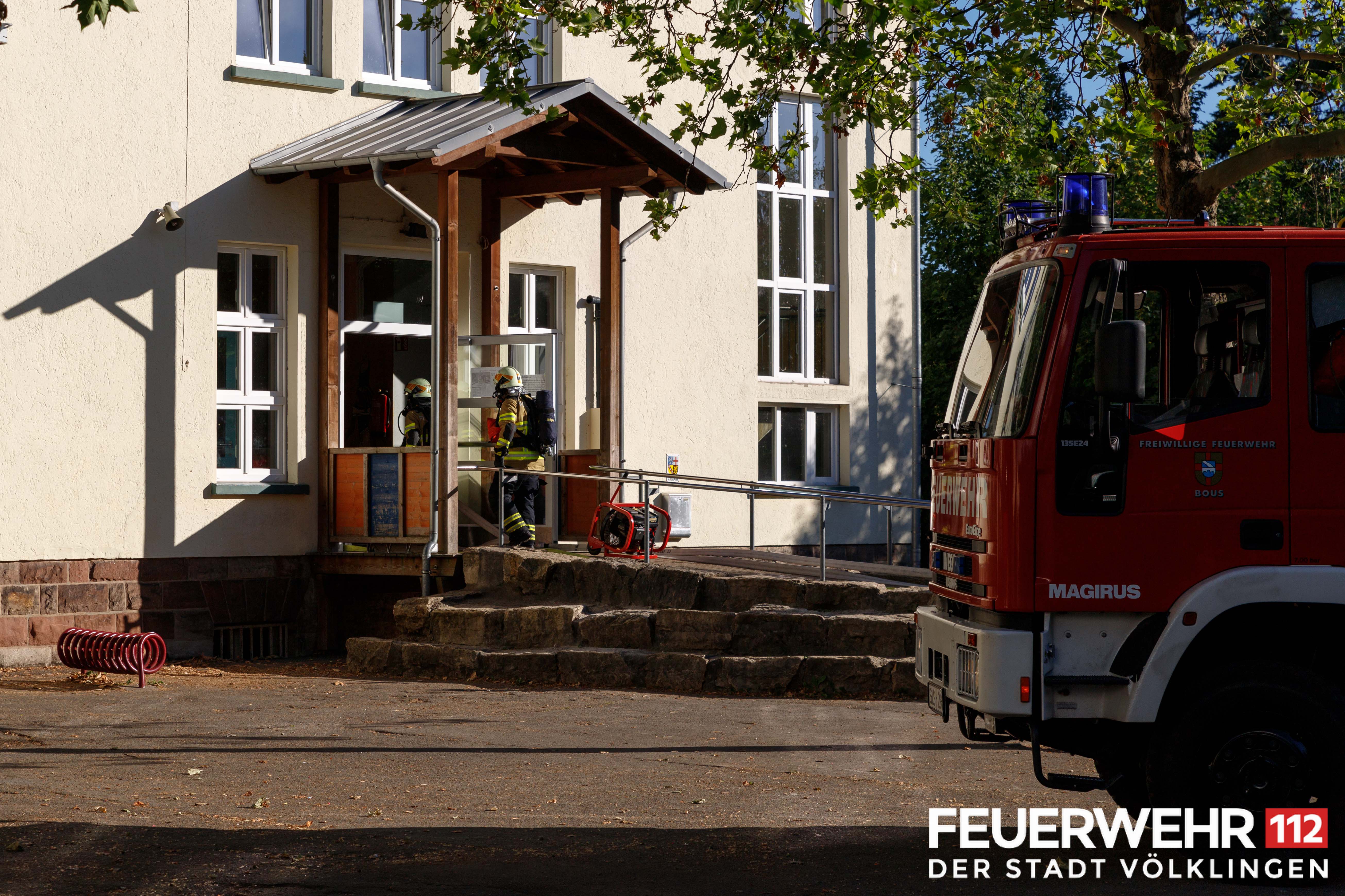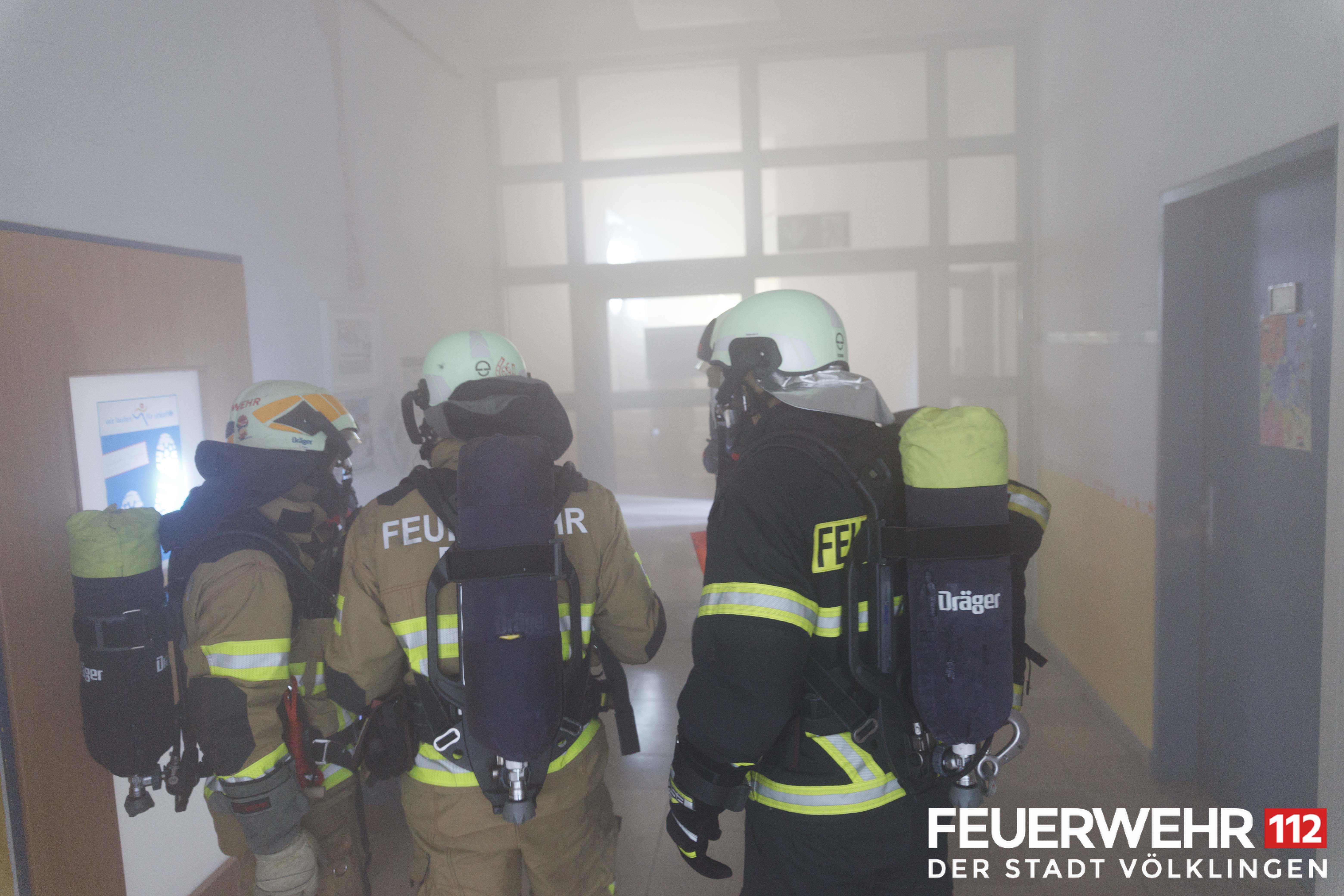 Das ersteintreffende Fahrzeug aus Völklingen erkundete die Lage und alarmierte umgehend die Feuerwehr Bous zur Unterstützung nach. Zwischenzeitlich brachte sich die Drehleiter aus Völklingen in Stellung und rettete mehrere Kinder aus dem 1. Obergeschoss. Weitere Kräfte aus Völklingen und Bous übernahmen den Angriffsweg über den Schulhof, wo ebenfalls die Drehleiter aus Bous eingesetzt wurde. Mit mehreren Trupps beider Feuerwehren gingen die Einsatzkräfte unter schwerem Atemschutz zur Menschenrettung und Brandbekämpfung durch das stark verrauchte Gebäude vor. Der Einsatz wurde in zwei Einsatzabschnitte unterteilt und der Funkverkehr über den Einsatzleitwagen aus Völklingen koordiniert.