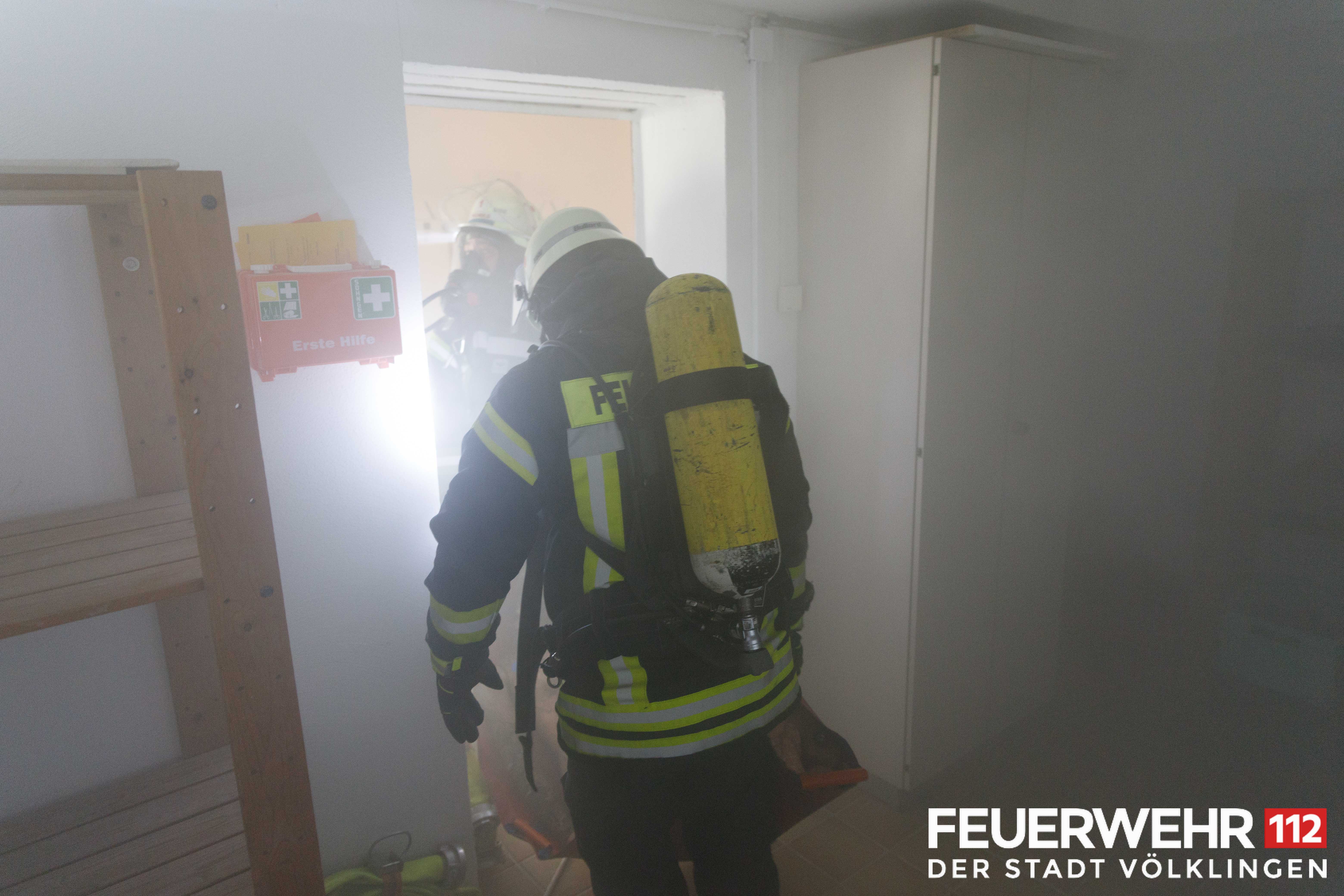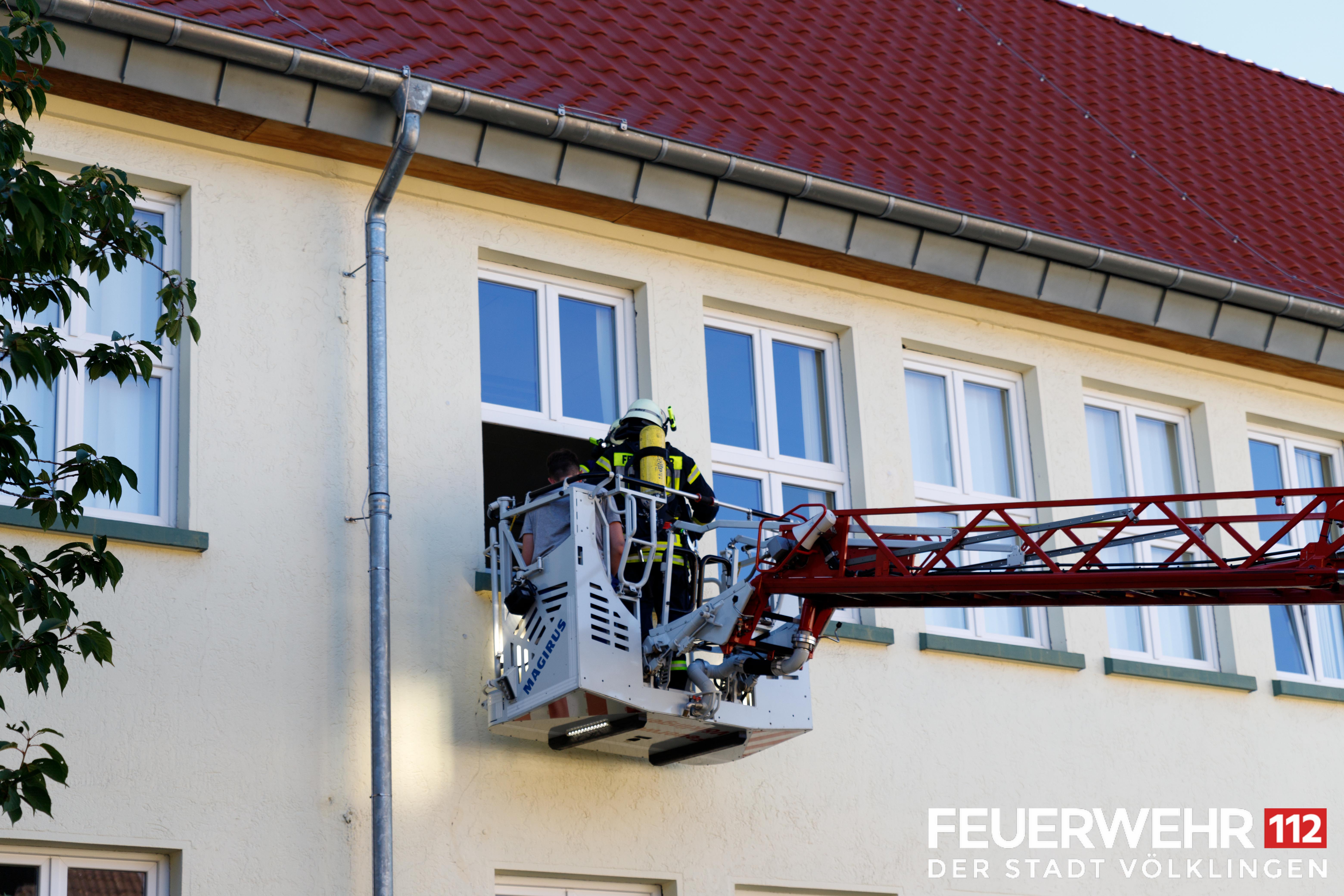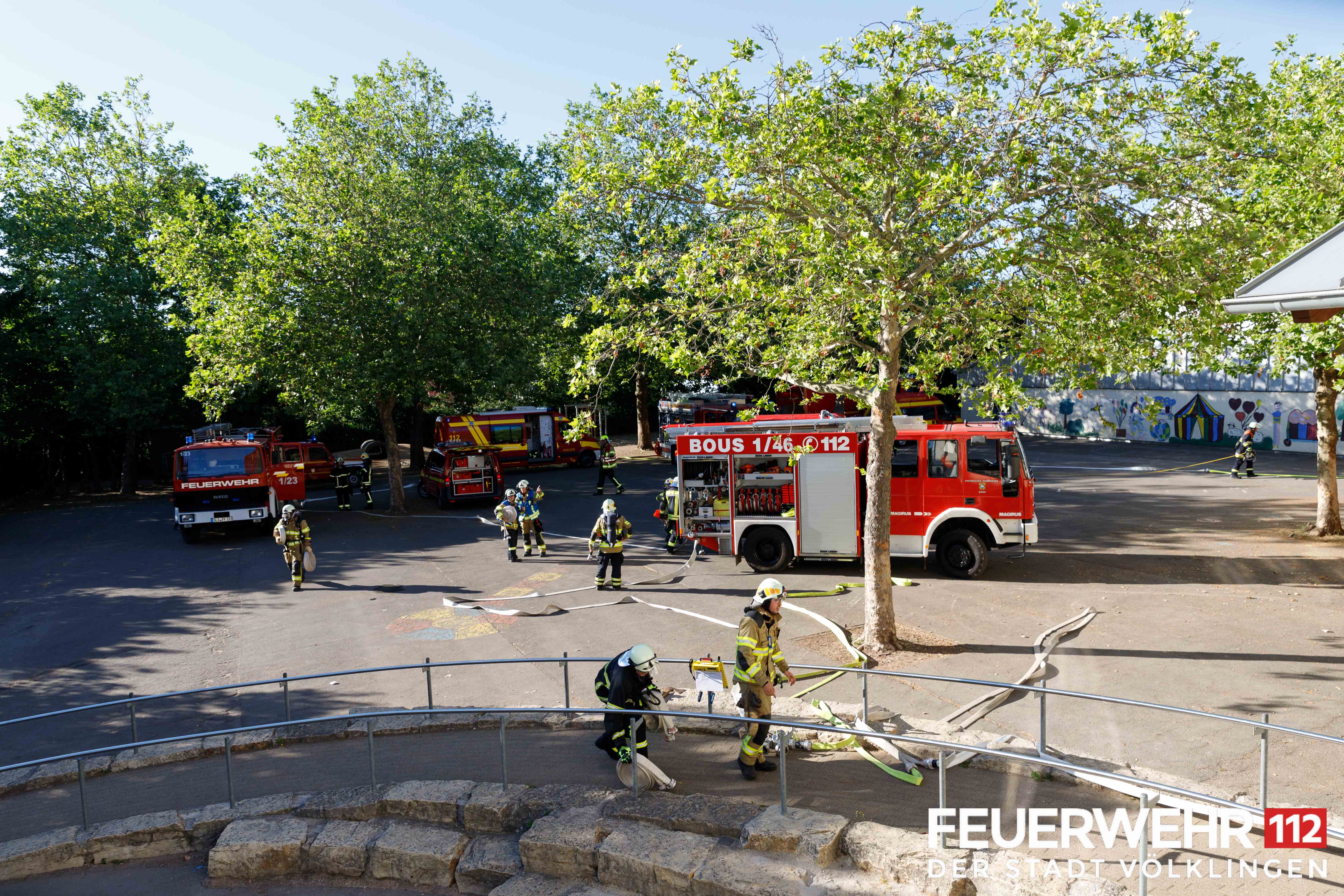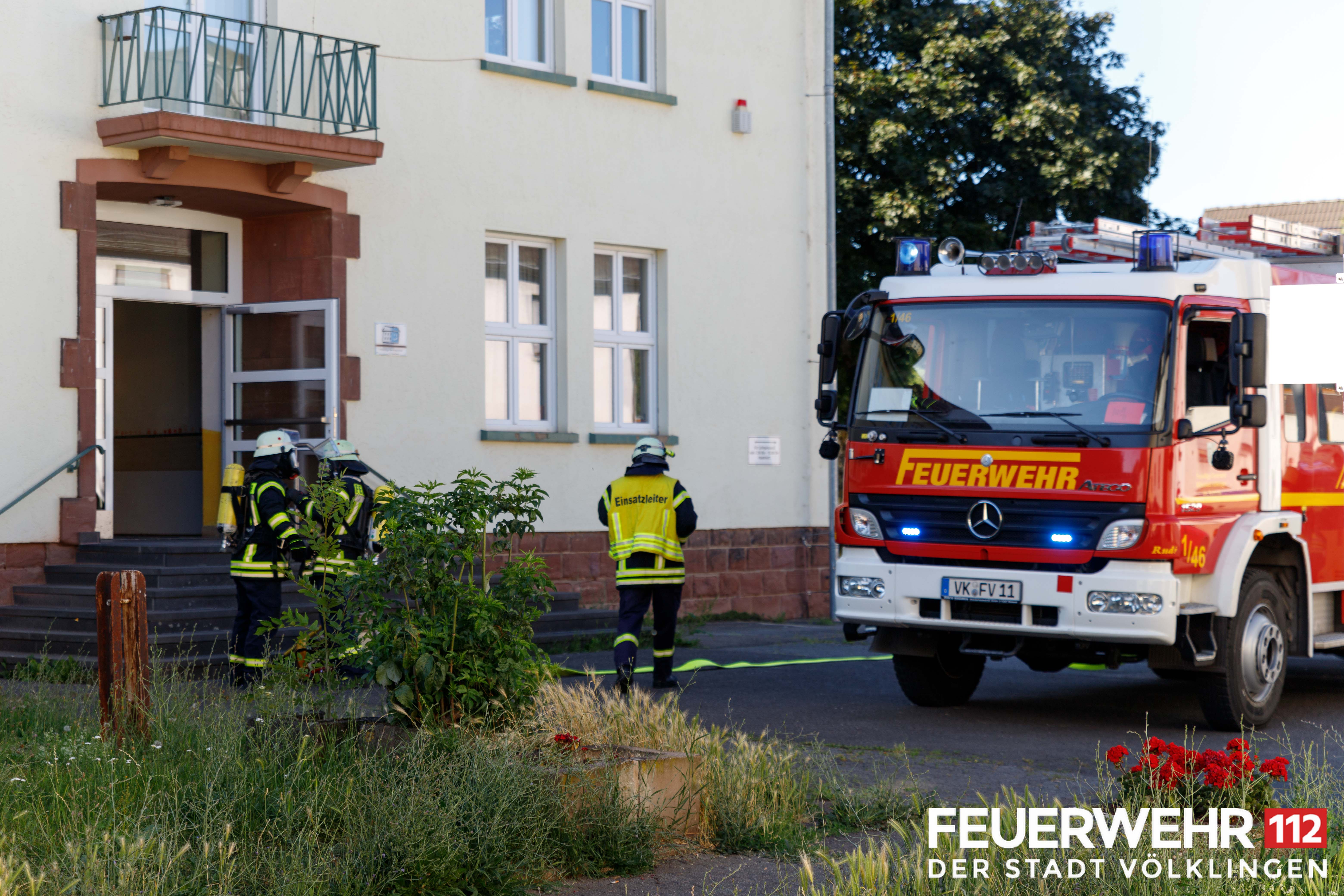 Das ersteintreffende Fahrzeug aus Völklingen erkundete die Lage und alarmierte umgehend die Feuerwehr Bous zur Unterstützung nach. Zwischenzeitlich brachte sich die Drehleiter aus Völklingen in Stellung und rettete mehrere Kinder aus dem 1. Obergeschoss. Weitere Kräfte aus Völklingen und Bous übernahmen den Angriffsweg über den Schulhof, wo ebenfalls die Drehleiter aus Bous eingesetzt wurde. Mit mehreren Trupps beider Feuerwehren gingen die Einsatzkräfte unter schwerem Atemschutz zur Menschenrettung und Brandbekämpfung durch das stark verrauchte Gebäude vor. Der Einsatz wurde in zwei Einsatzabschnitte unterteilt und der Funkverkehr über den Einsatzleitwagen aus Völklingen koordiniert.
