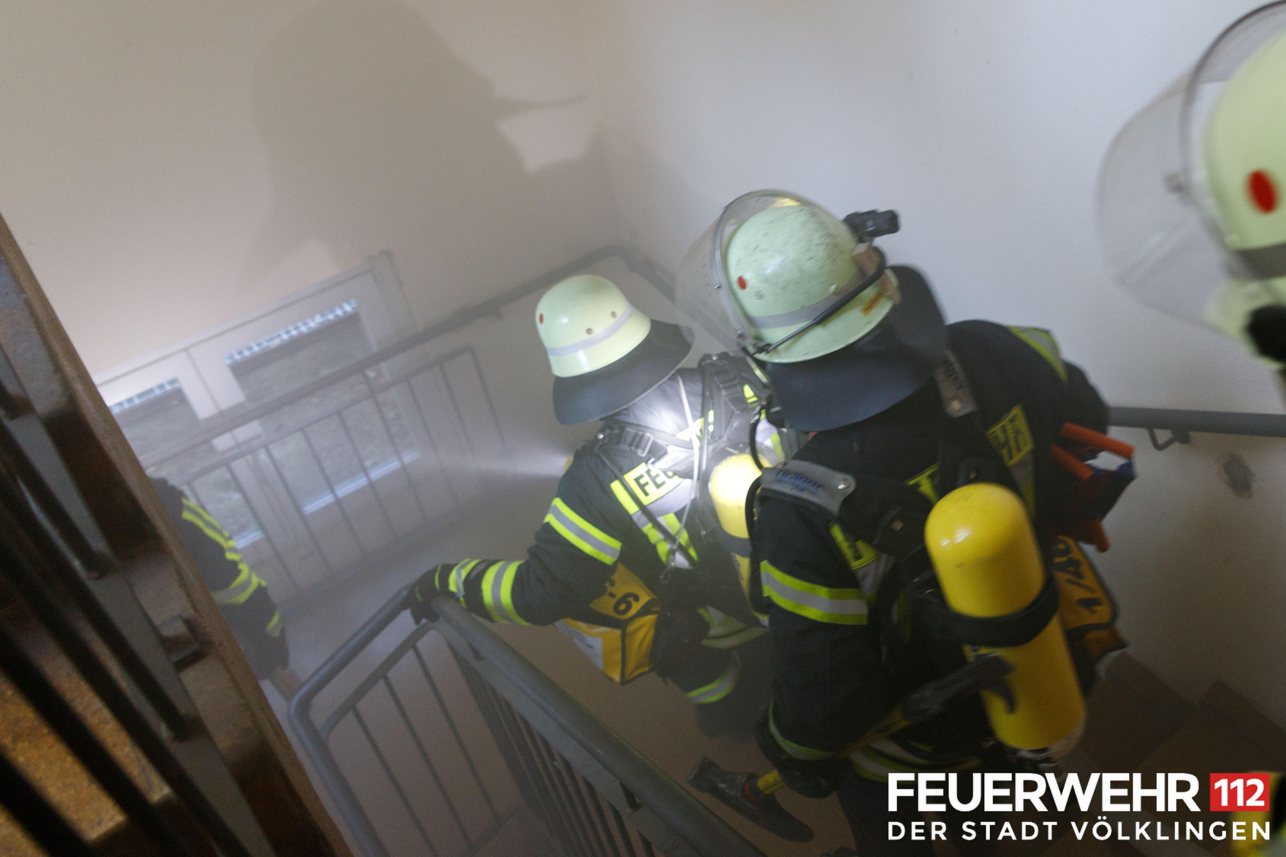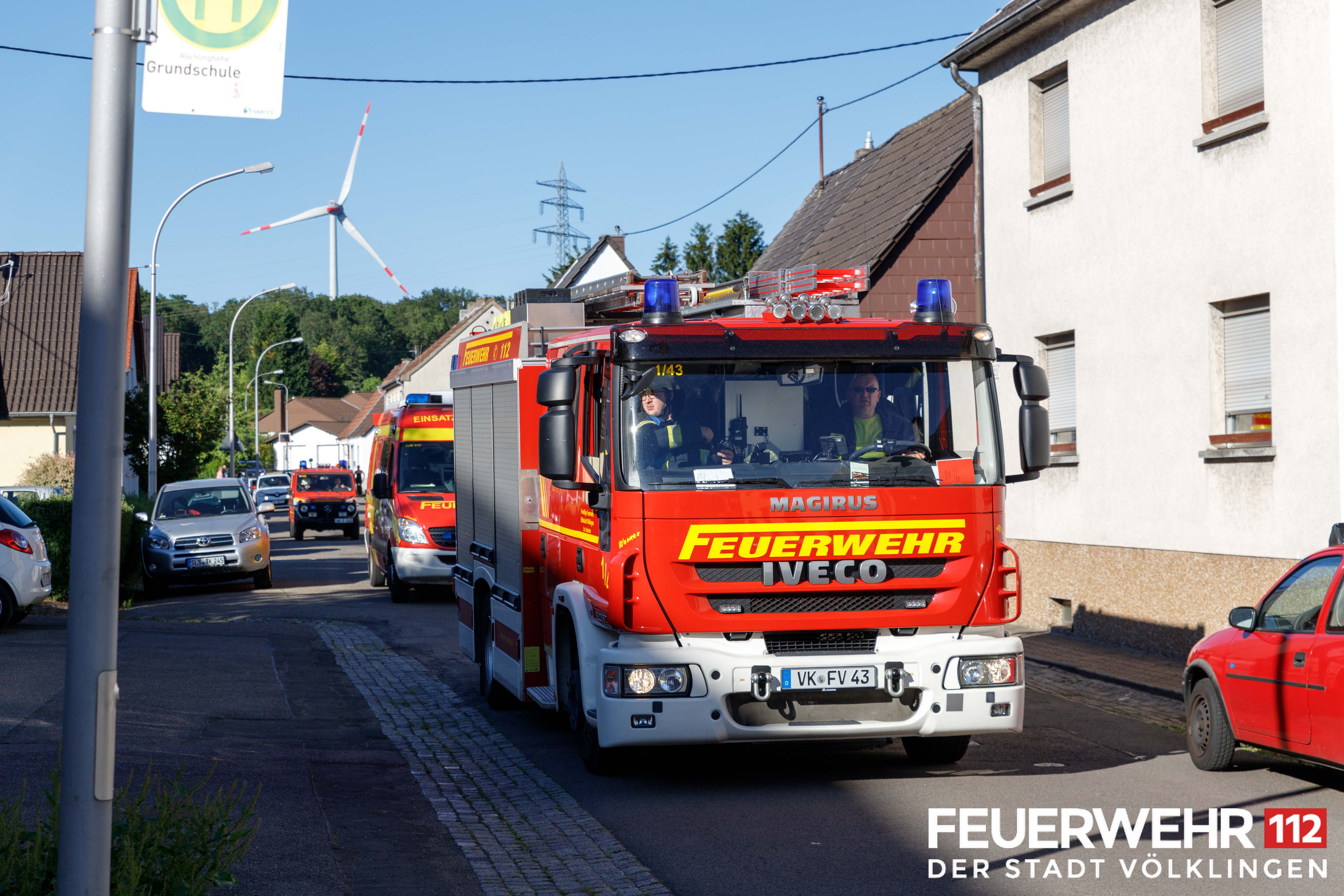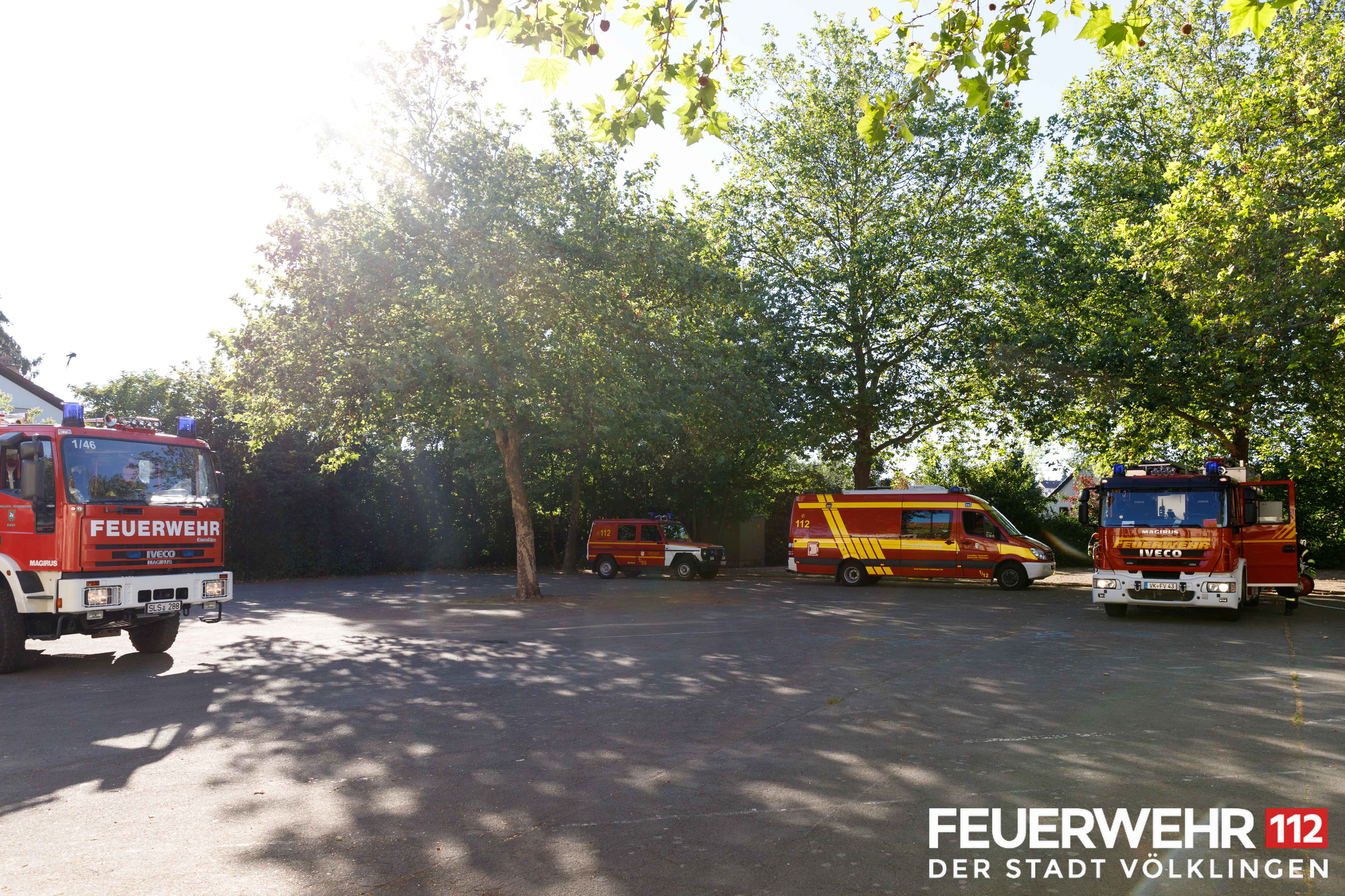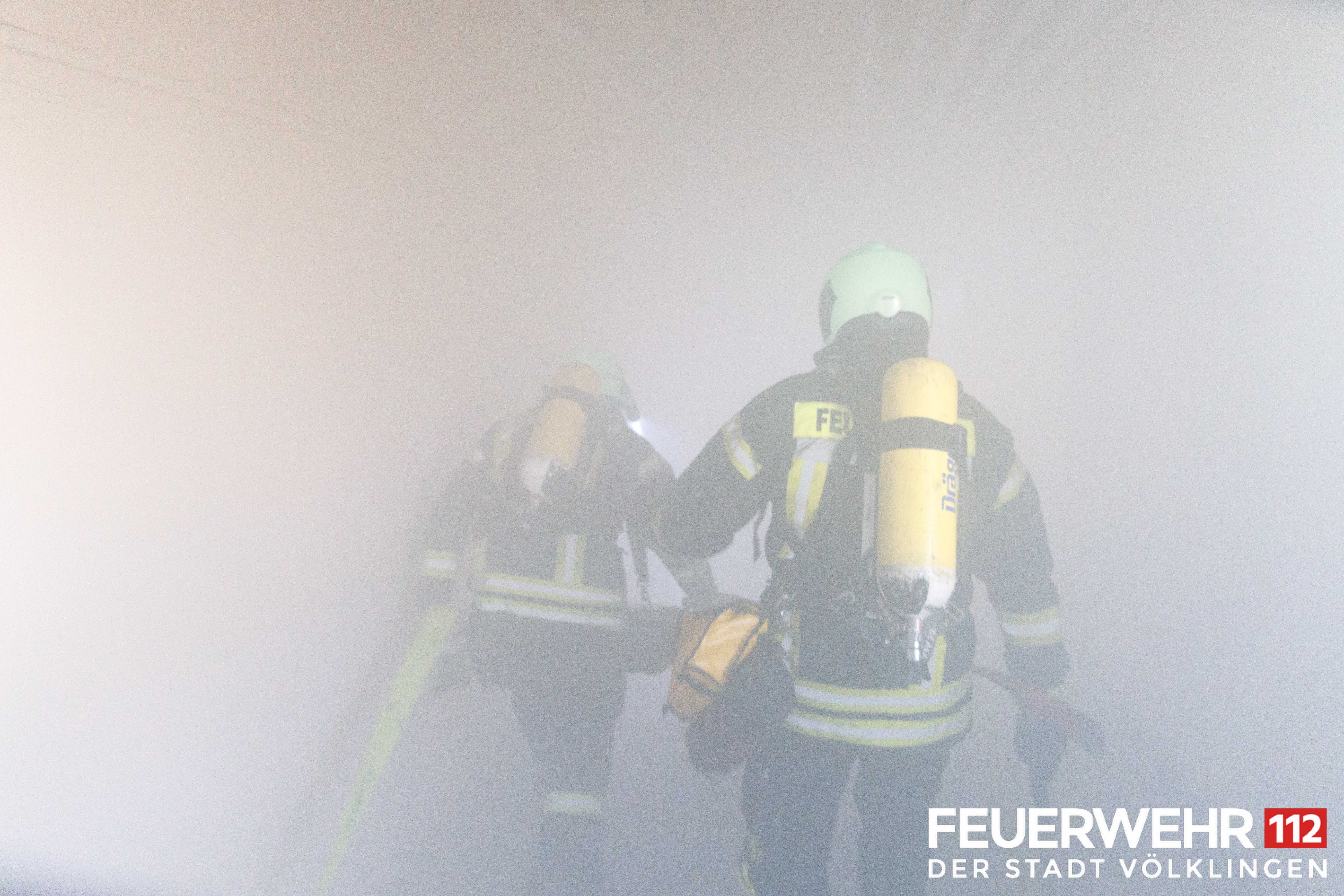 Das ersteintreffende Fahrzeug aus Völklingen erkundete die Lage und alarmierte umgehend die Feuerwehr Bous zur Unterstützung nach. Zwischenzeitlich brachte sich die Drehleiter aus Völklingen in Stellung und rettete mehrere Kinder aus dem 1. Obergeschoss. Weitere Kräfte aus Völklingen und Bous übernahmen den Angriffsweg über den Schulhof, wo ebenfalls die Drehleiter aus Bous eingesetzt wurde. Mit mehreren Trupps beider Feuerwehren gingen die Einsatzkräfte unter schwerem Atemschutz zur Menschenrettung und Brandbekämpfung durch das stark verrauchte Gebäude vor. Der Einsatz wurde in zwei Einsatzabschnitte unterteilt und der Funkverkehr über den Einsatzleitwagen aus Völklingen koordiniert.