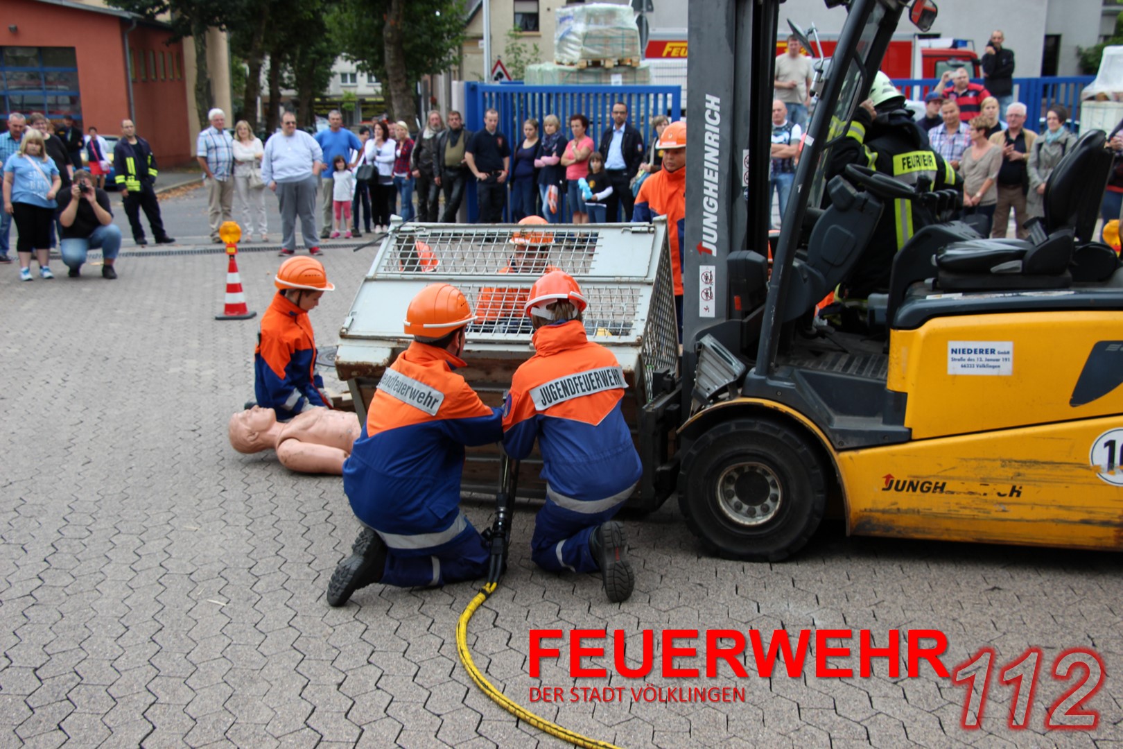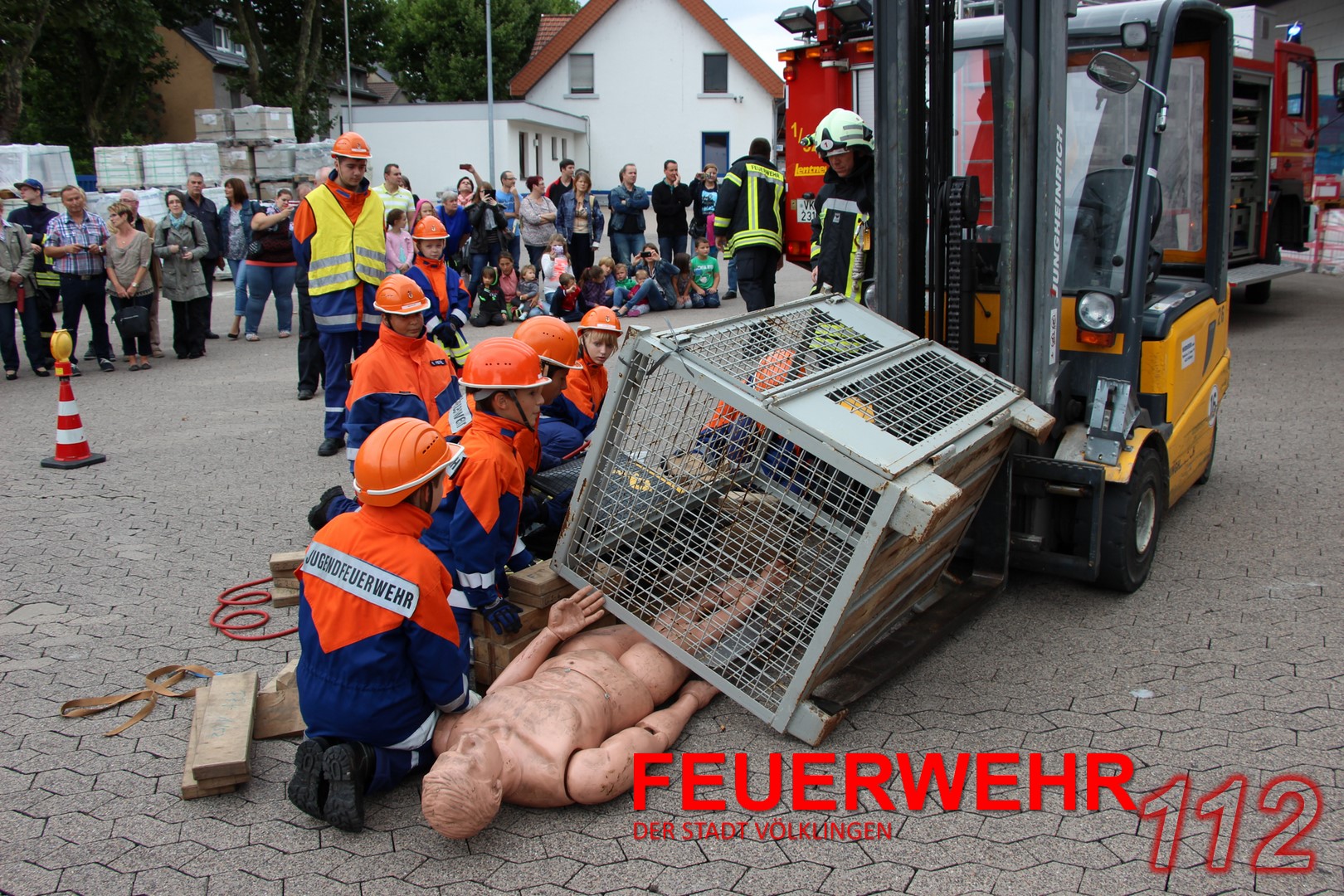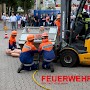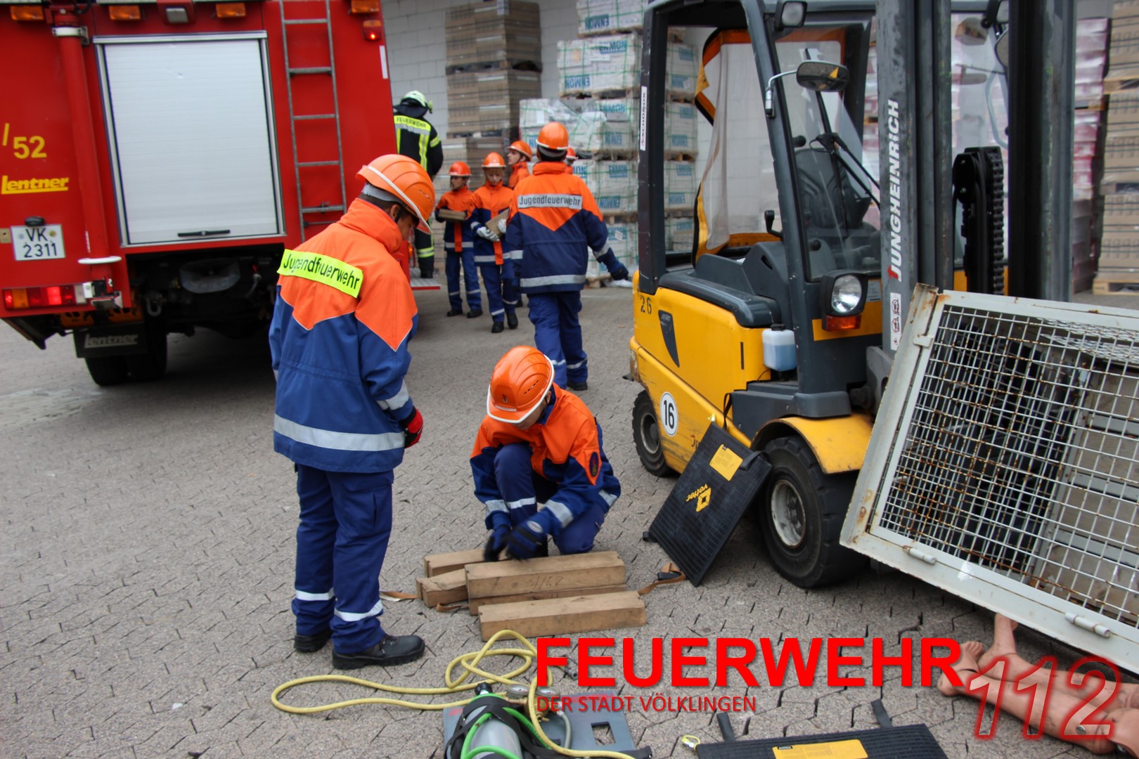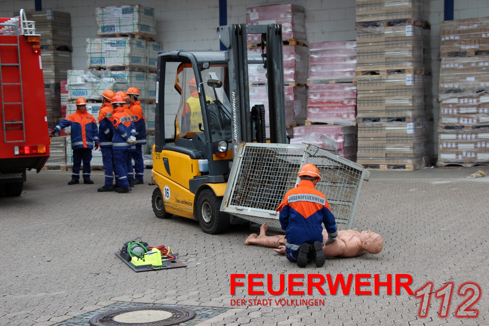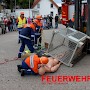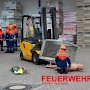 Mit einem Gabelstapler war es zu einem Unfall gekommen. Eine „Person“ war unter einer Gitterbox, die teilweise vom Stapler gefallen war, eingeklemmt. Die Jugendlichen konnten hier ihr Können unter Beweis stellen und den Einsatz routiniert abarbeiten. Ohne größere Probleme konnte die verletzte Person gerettet und mit einer Trage abtransportiert werden.