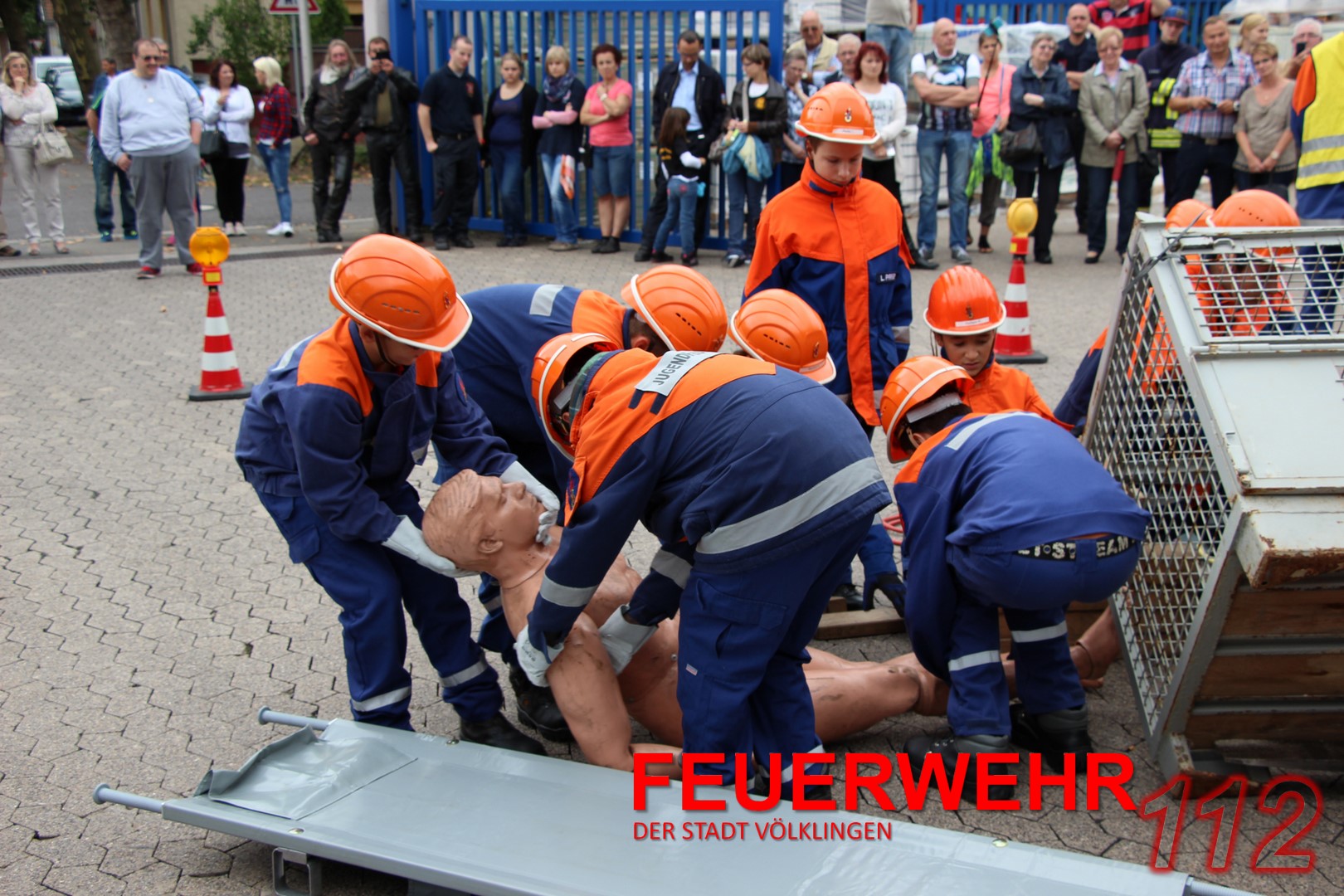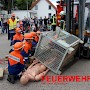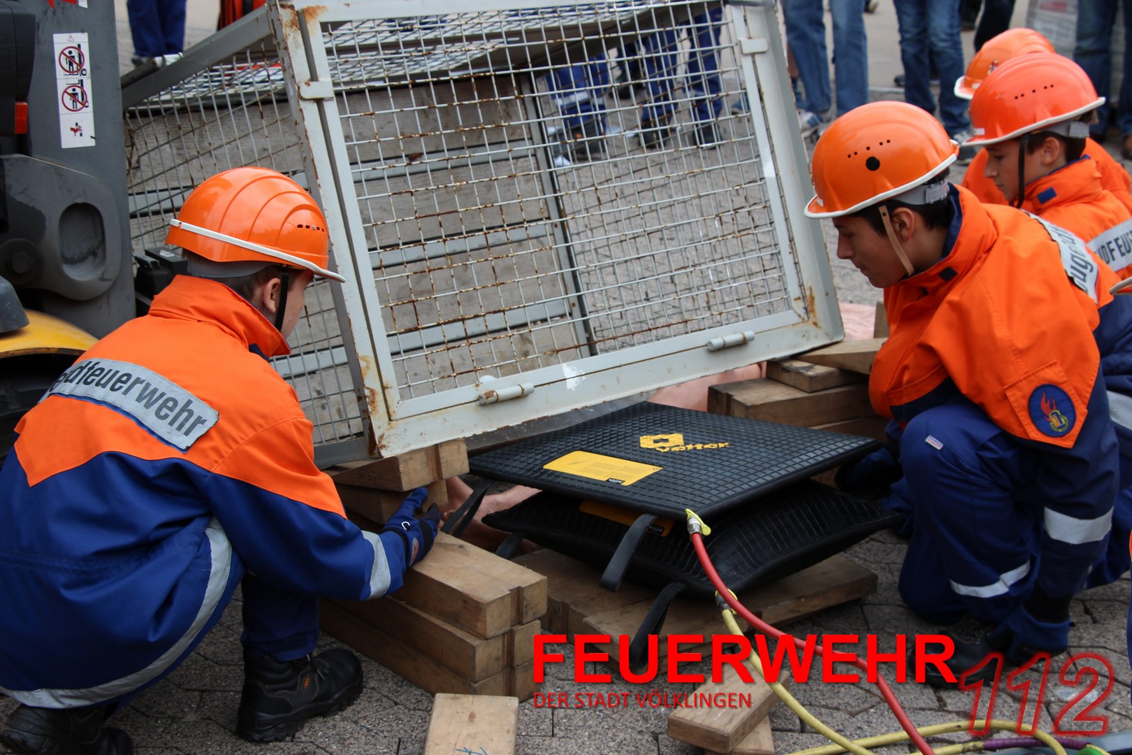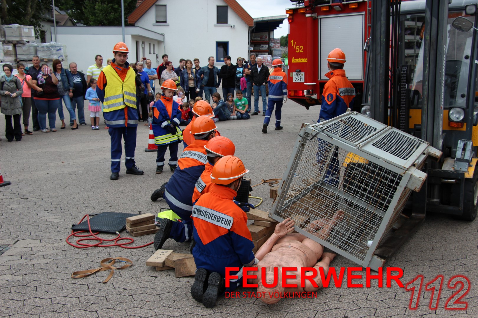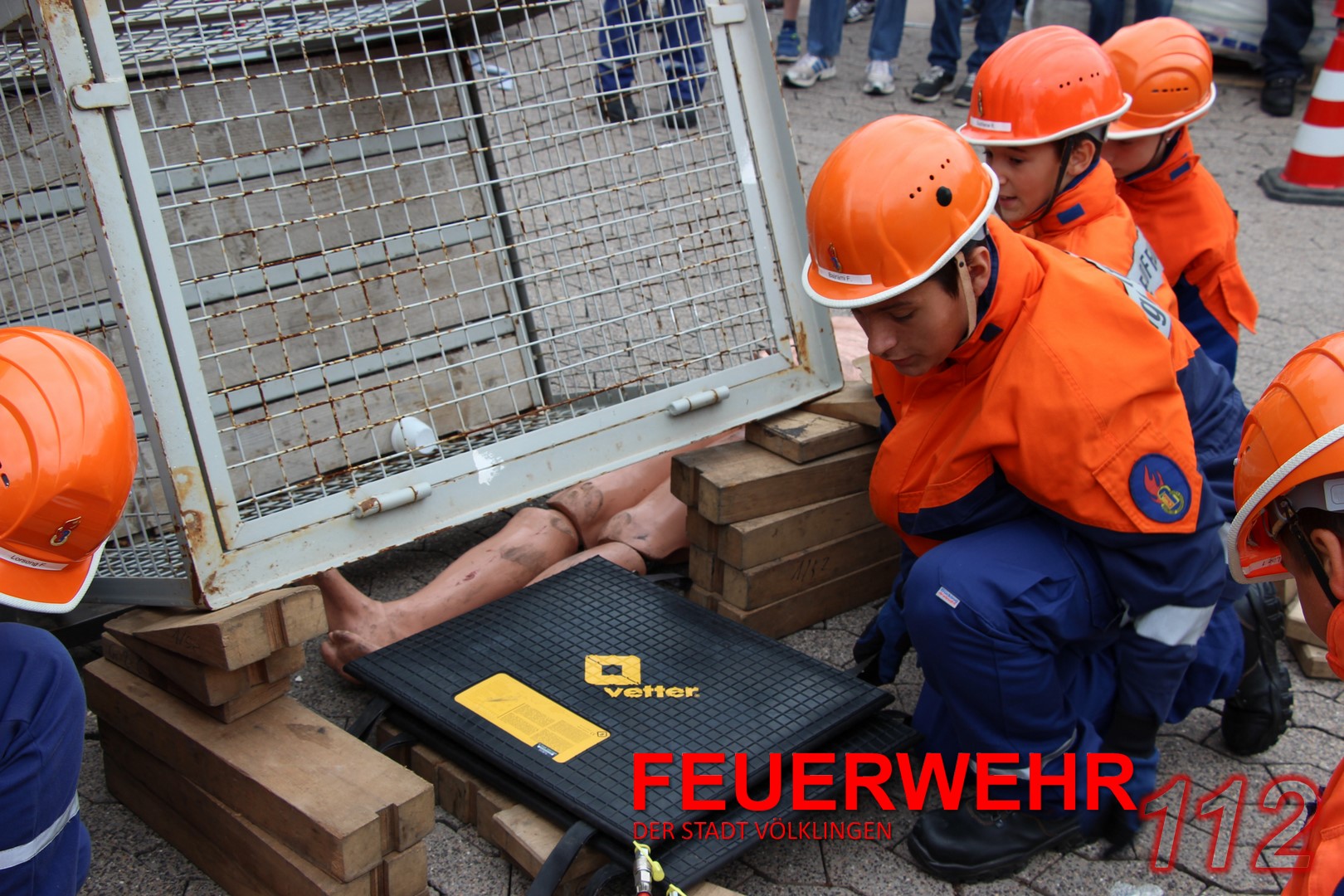 Mit einem Gabelstapler war es zu einem Unfall gekommen. Eine „Person“ war unter einer Gitterbox, die teilweise vom Stapler gefallen war, eingeklemmt. Die Jugendlichen konnten hier ihr Können unter Beweis stellen und den Einsatz routiniert abarbeiten. Ohne größere Probleme konnte die verletzte Person gerettet und mit einer Trage abtransportiert werden.