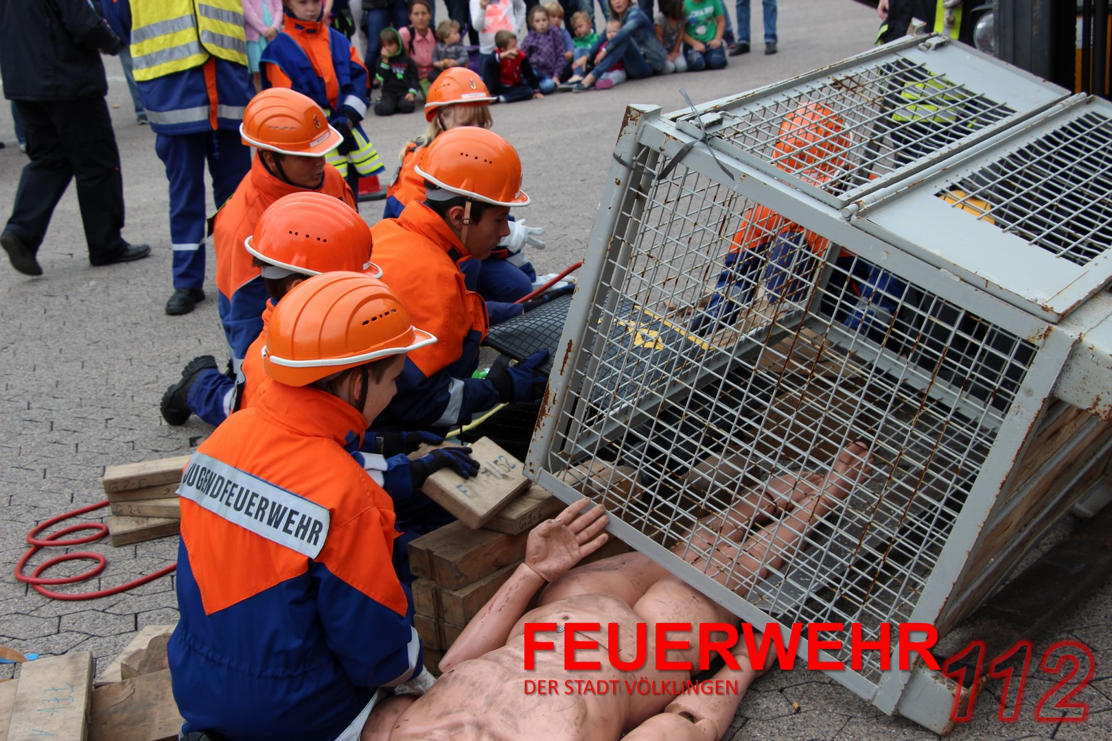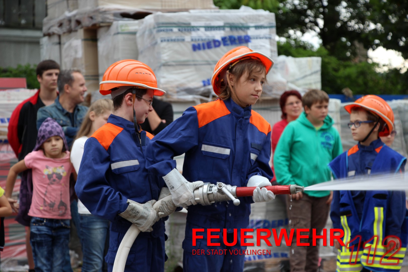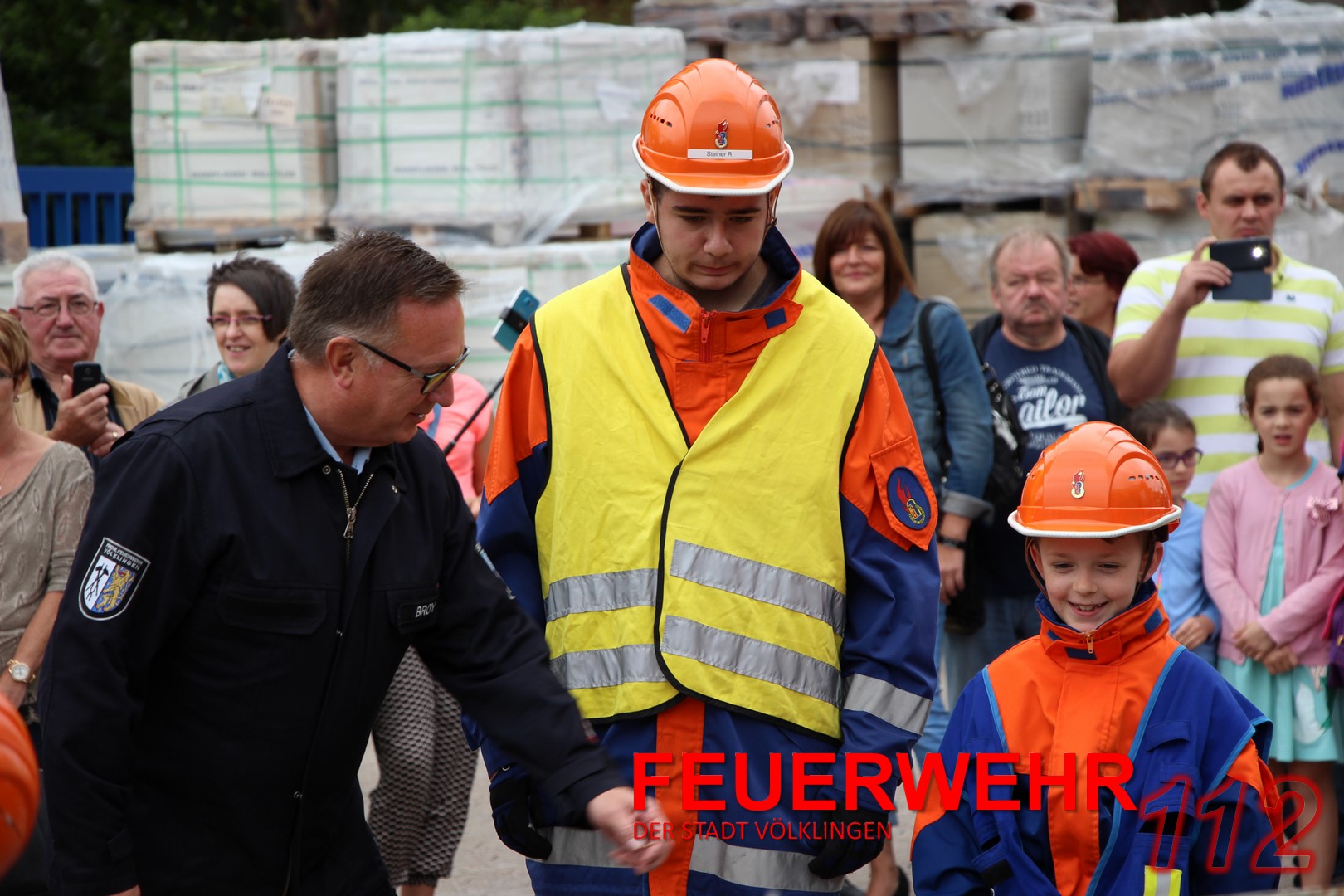 24 Jugendliche (davon vier Jugendfeuerwehrfrauen) mit ihren Ausbildern führten unter den Augen von Oberbürgermeister Lorig, Brandinspekteur Bender, Wehrführer Broy, Regionalverbands-Jugendwart Schaum und Stadtjugendwart Menzel diese Übung durch.