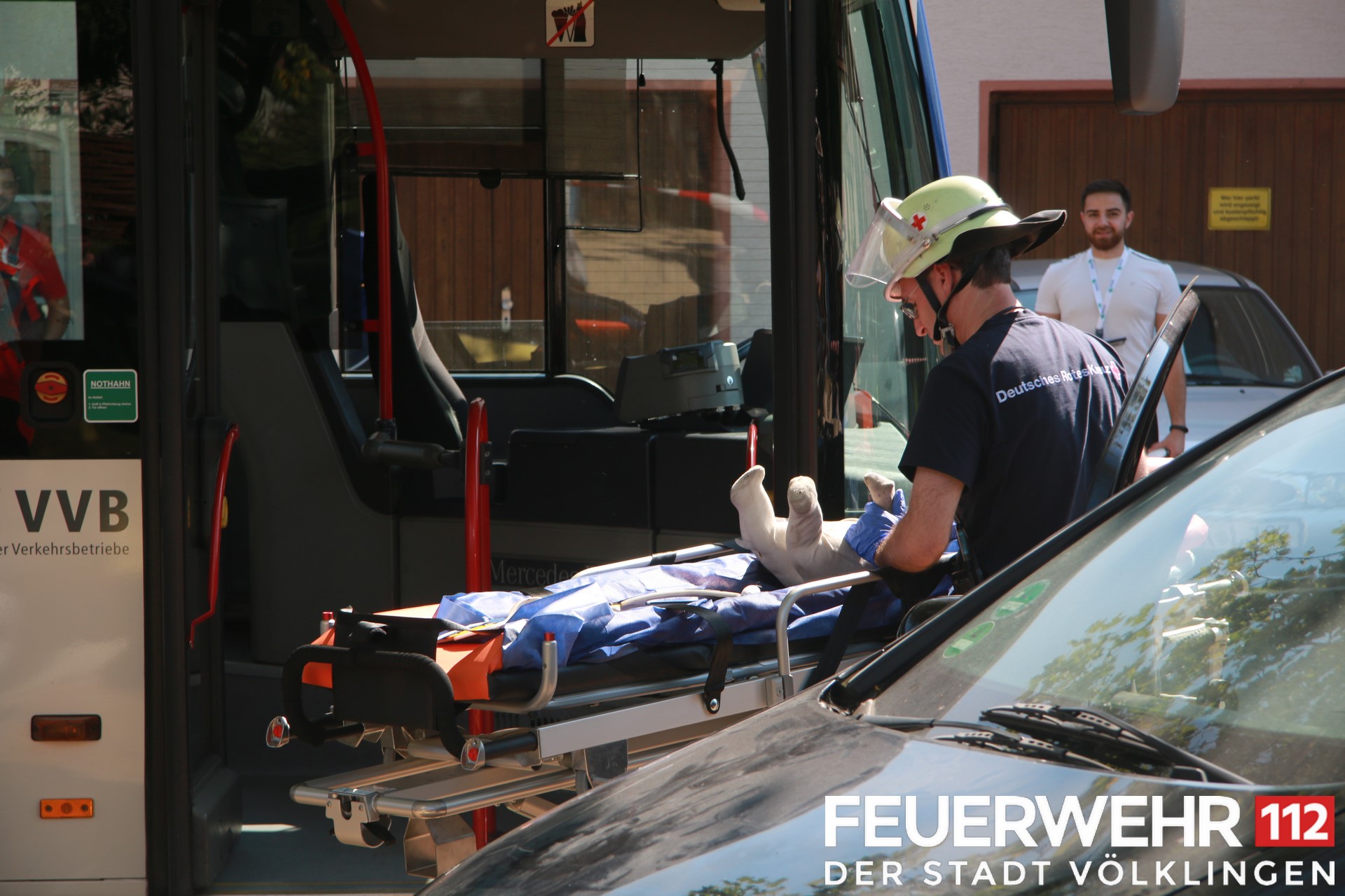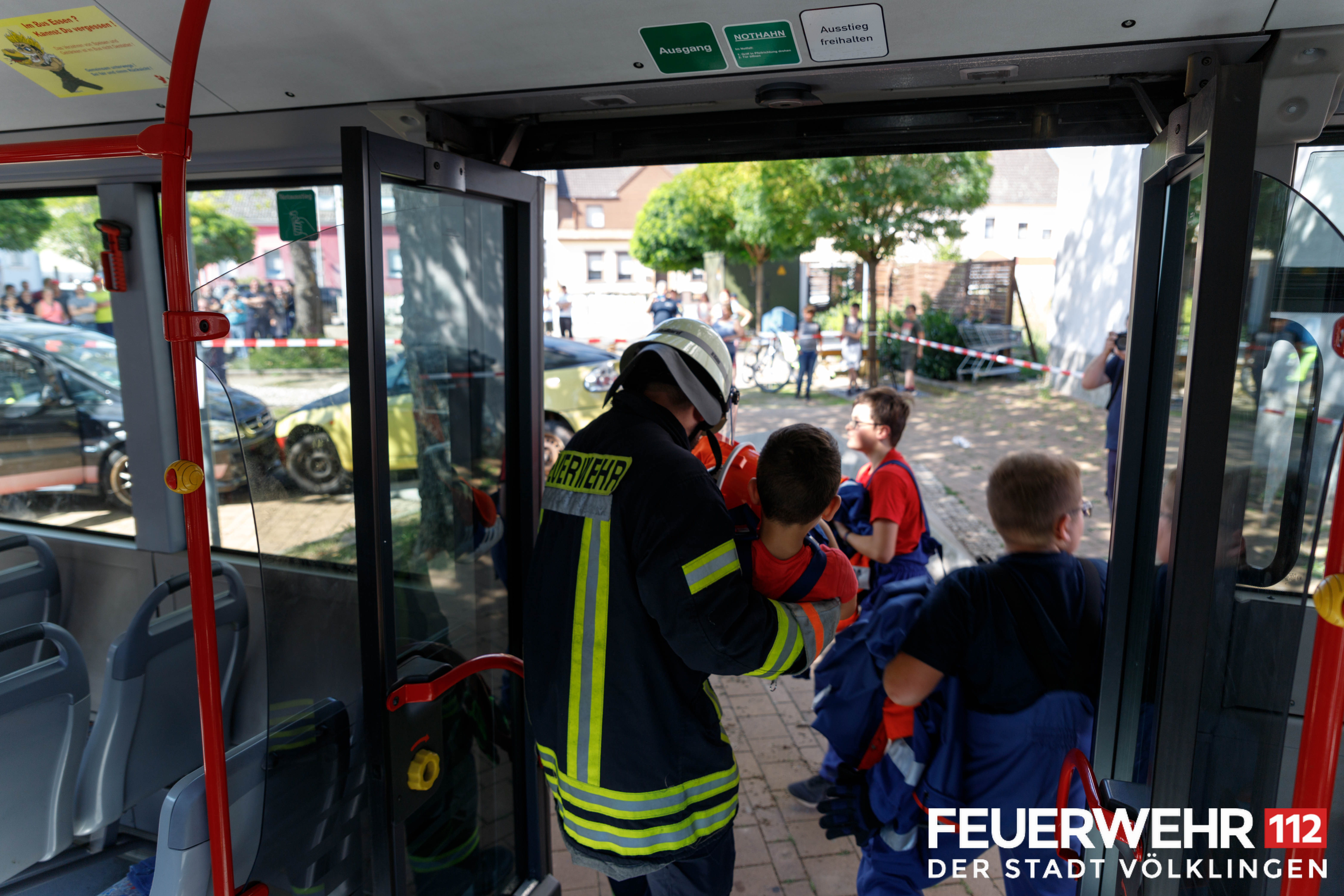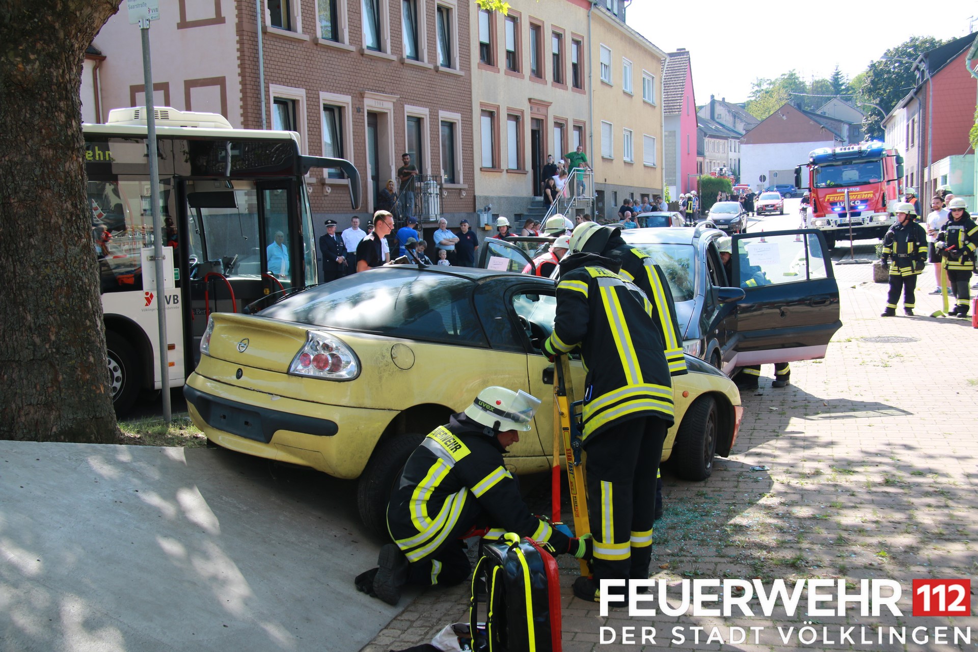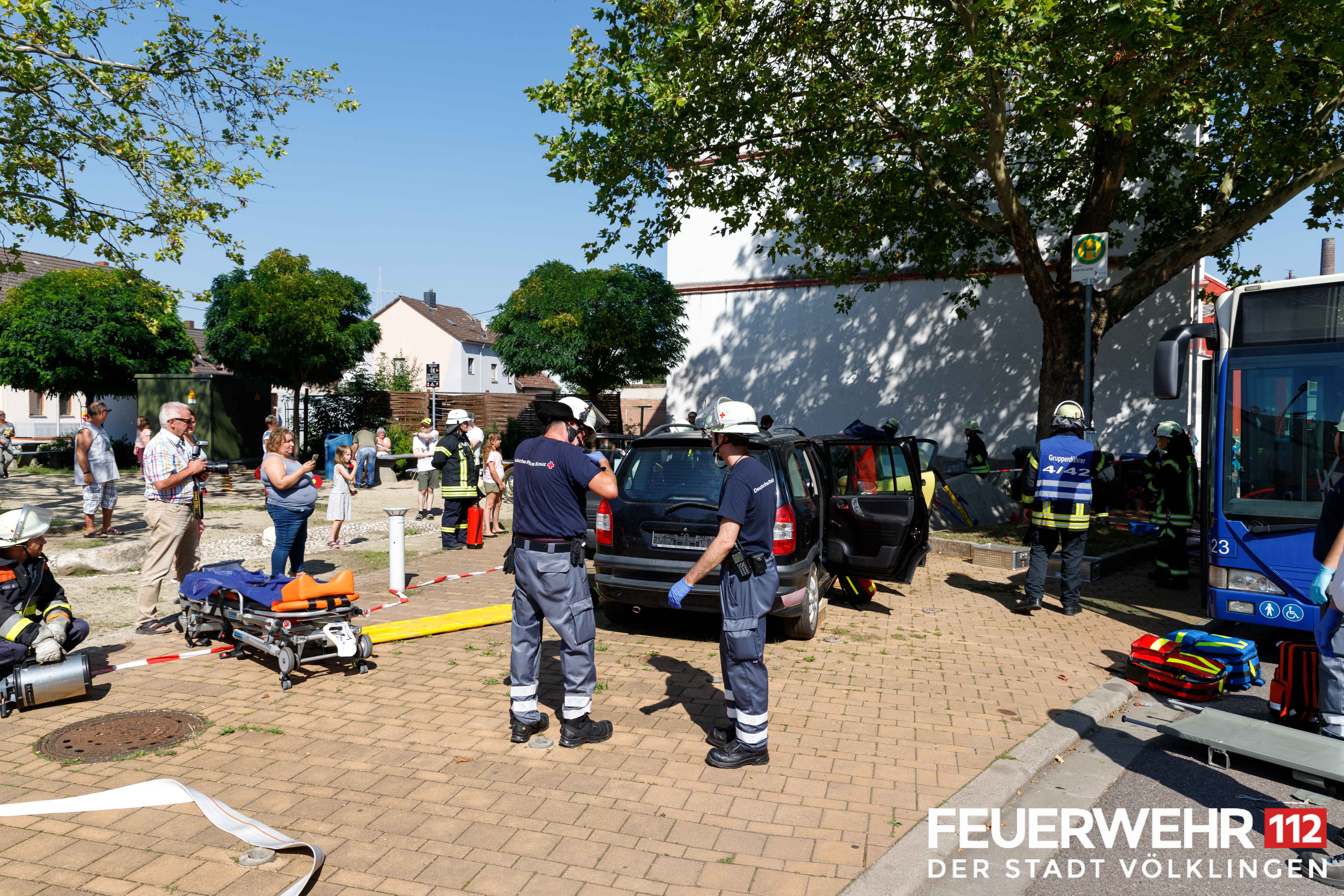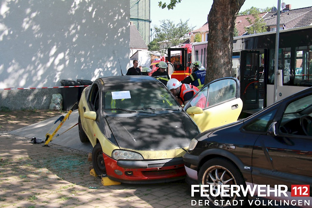 Als erstes Szenario wurde ein Verkehrsunfall mit zwei PKW und einem Schulbus angenommen. In der Hostenbacher Straße nimmt der Schulbus wartende Kinder auf. Ein in die Hostenbacher Straße Richtung Saarstraße fahrender Fahrzeugführer verliert die Kontrolle über sein Fahrzueg und fährt über den Bürgersteig in die Haltestelle. Dort kollidiert er mit einem haltenden PKW. In diesem befindet sich eine Mutter mit Ihrem Säugling. Beide PKW Fahrer sind nicht in der Lage ihre Fahrzeuge selbstständig zu verlassen und müssen von der Feuerwehr befreit werden. Die Kinder im Bus werden nicht verletzt, erleiden aber durch das Unfallgeschehen einen Schock und müssen betreut werden.