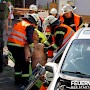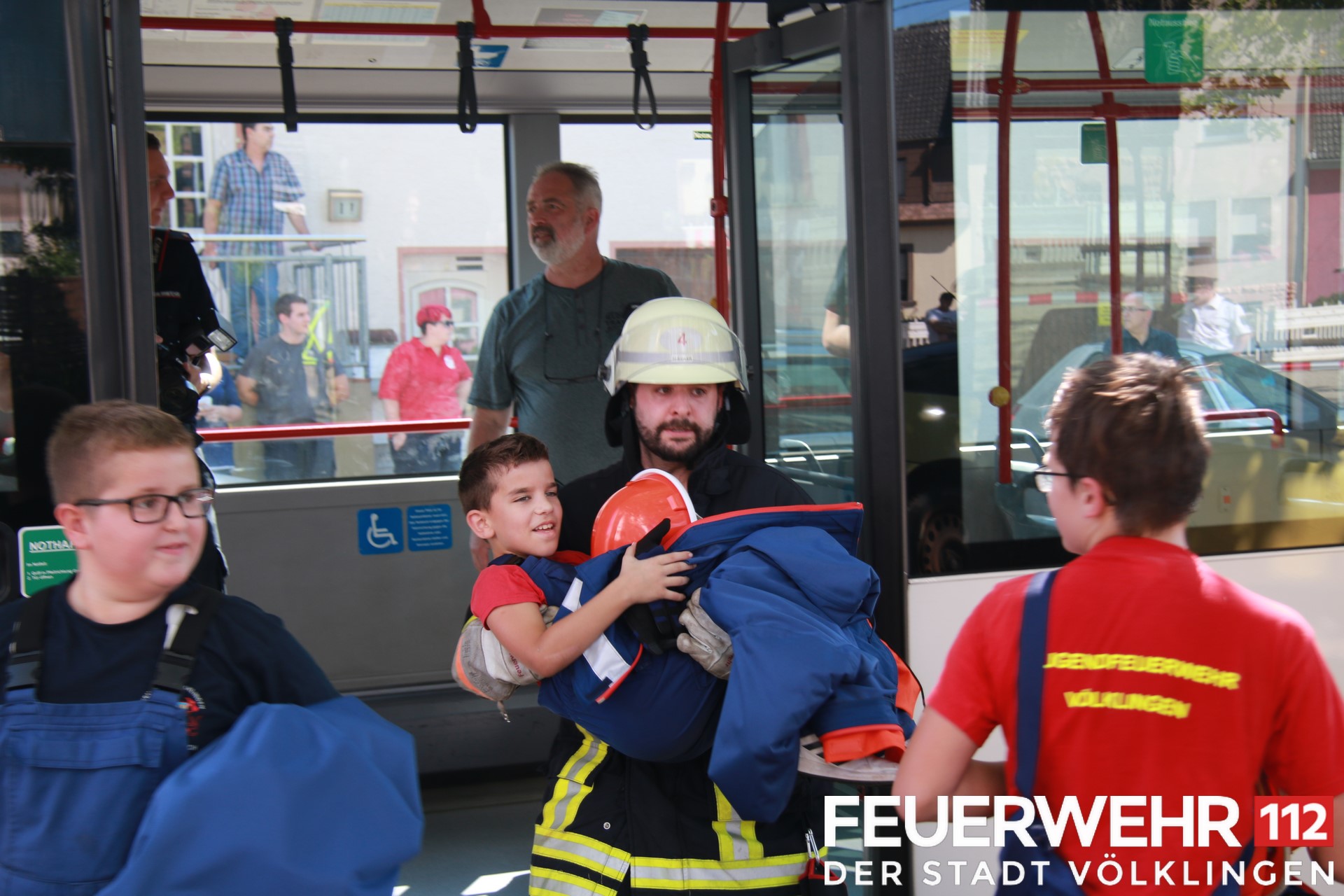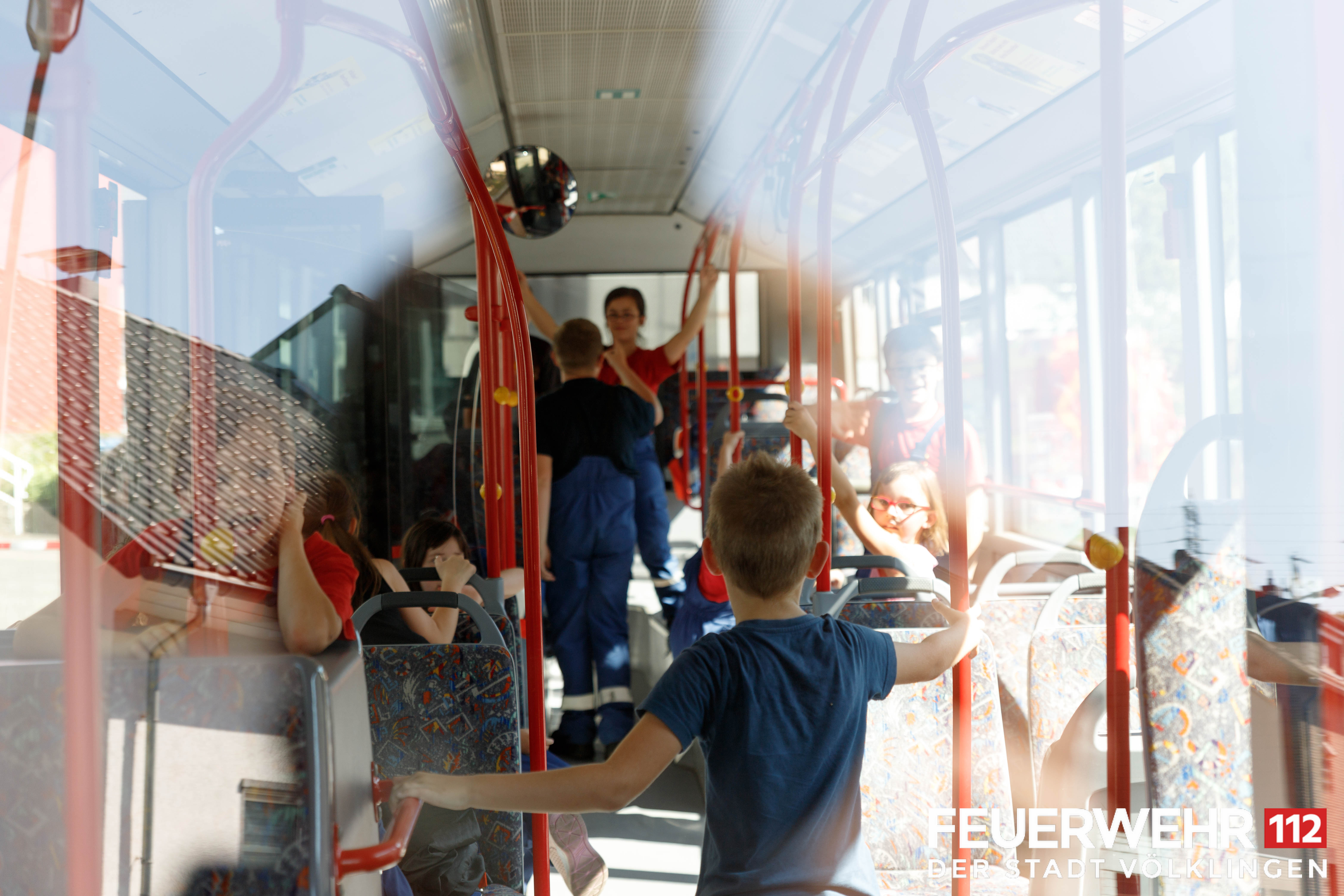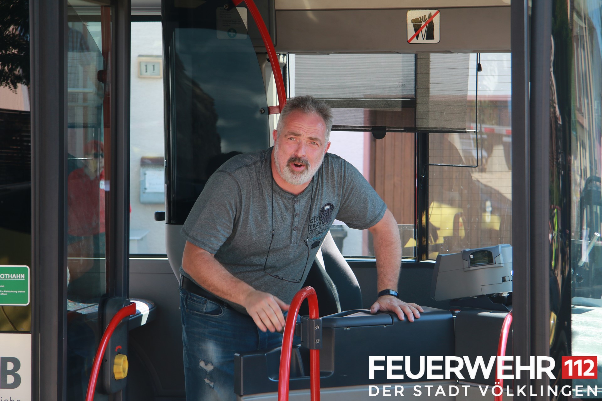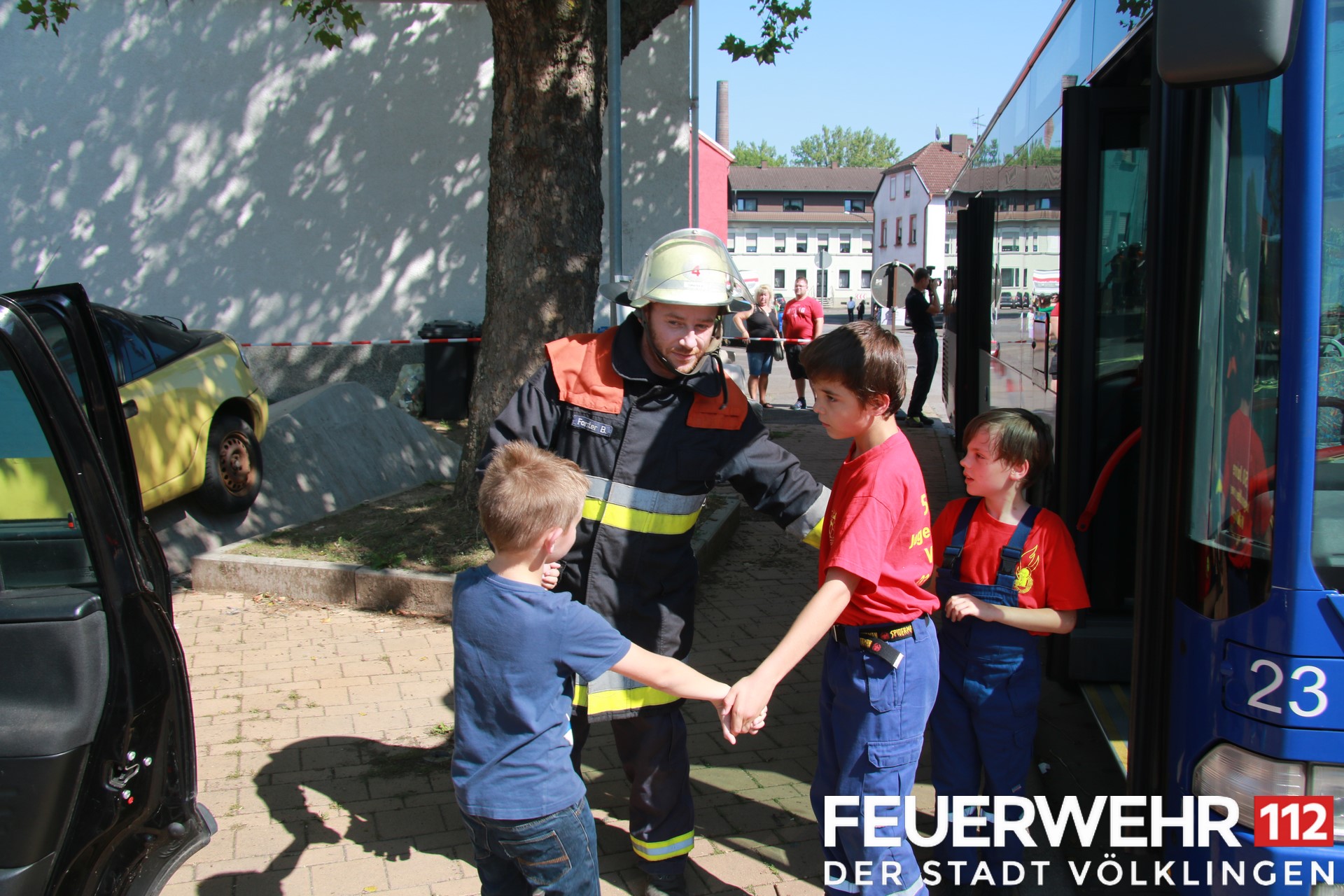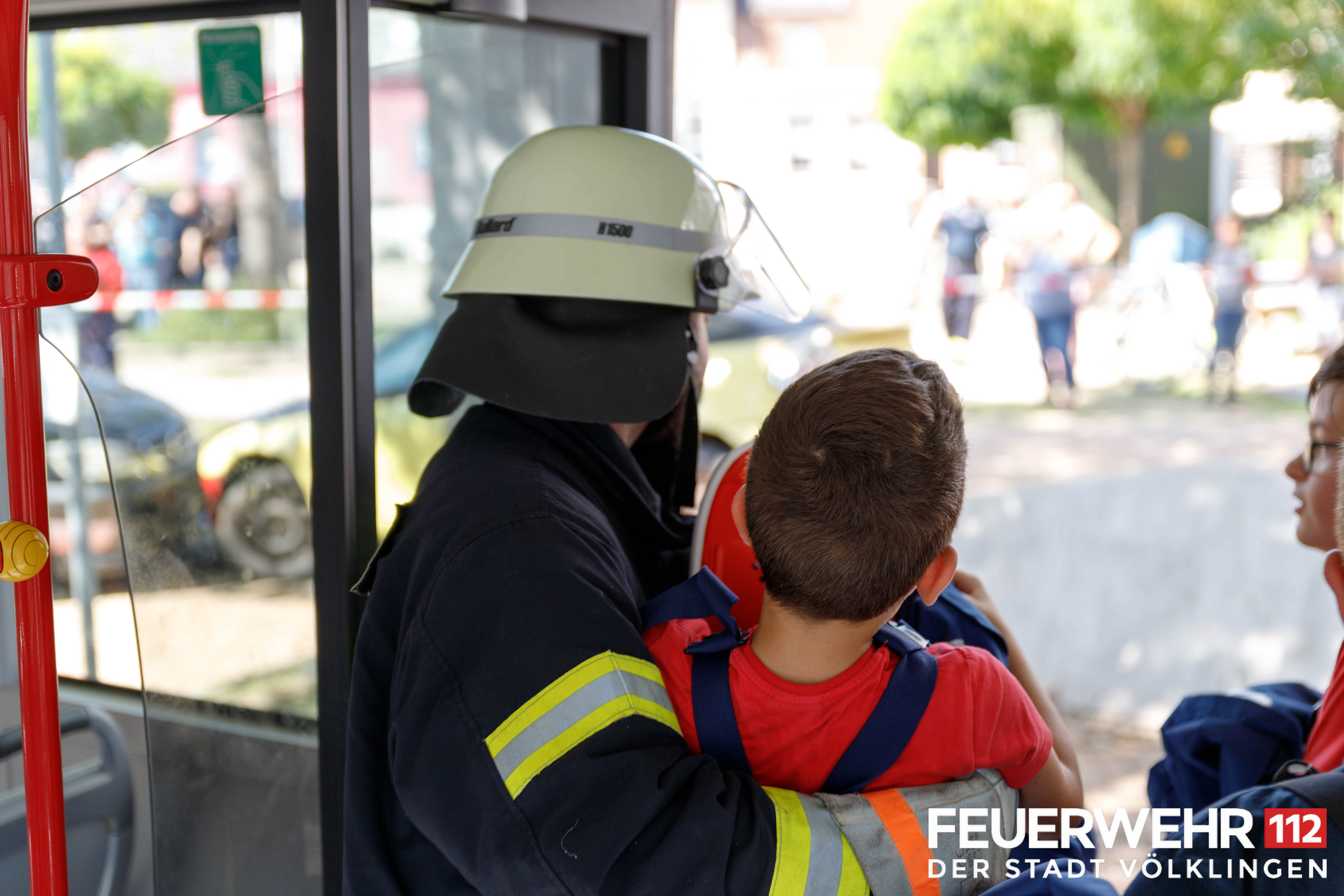 Als erstes Szenario wurde ein Verkehrsunfall mit zwei PKW und einem Schulbus angenommen. In der Hostenbacher Straße nimmt der Schulbus wartende Kinder auf. Ein in die Hostenbacher Straße Richtung Saarstraße fahrender Fahrzeugführer verliert die Kontrolle über sein Fahrzueg und fährt über den Bürgersteig in die Haltestelle. Dort kollidiert er mit einem haltenden PKW. In diesem befindet sich eine Mutter mit Ihrem Säugling. Beide PKW Fahrer sind nicht in der Lage ihre Fahrzeuge selbstständig zu verlassen und müssen von der Feuerwehr befreit werden. Die Kinder im Bus werden nicht verletzt, erleiden aber durch das Unfallgeschehen einen Schock und müssen betreut werden.