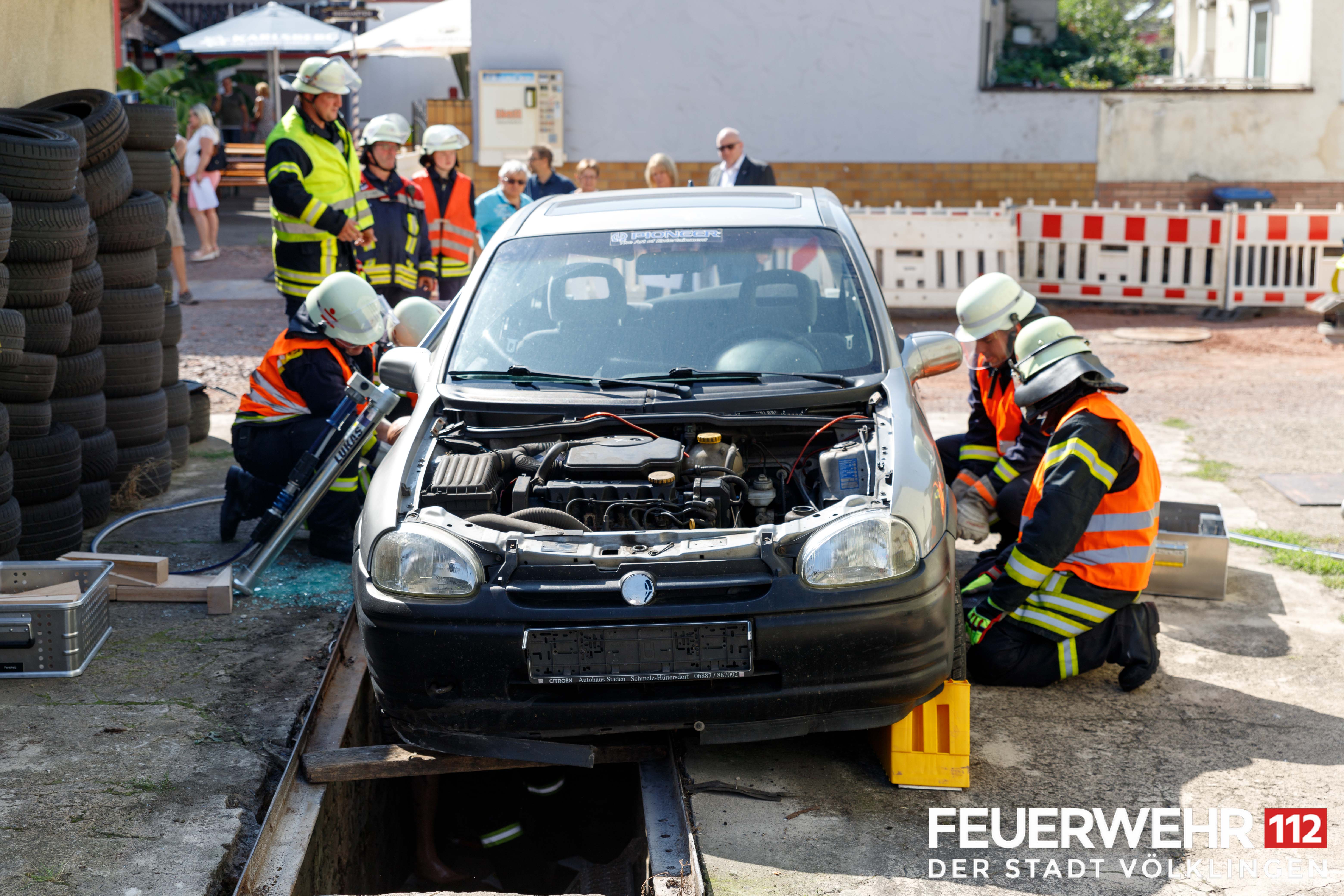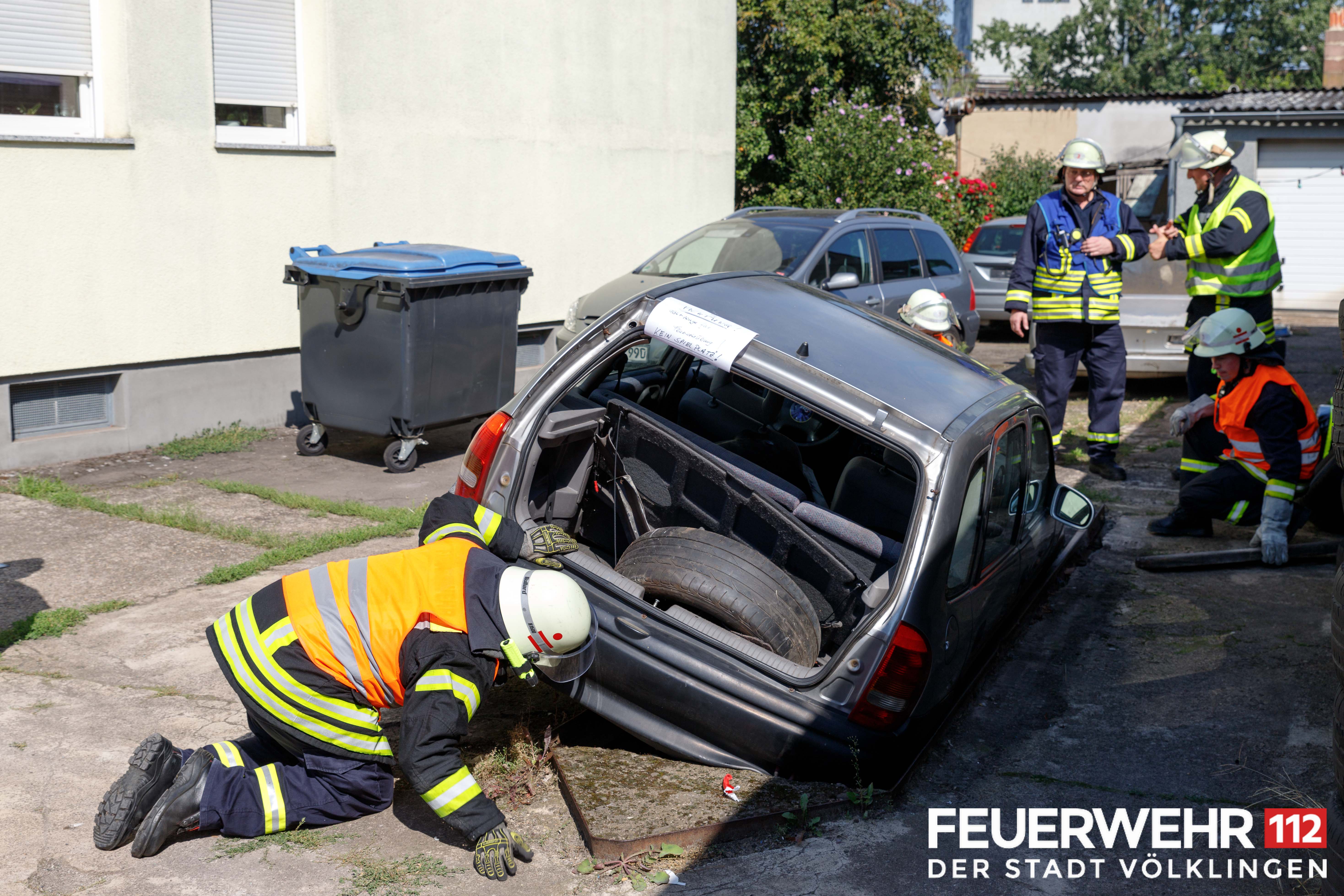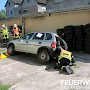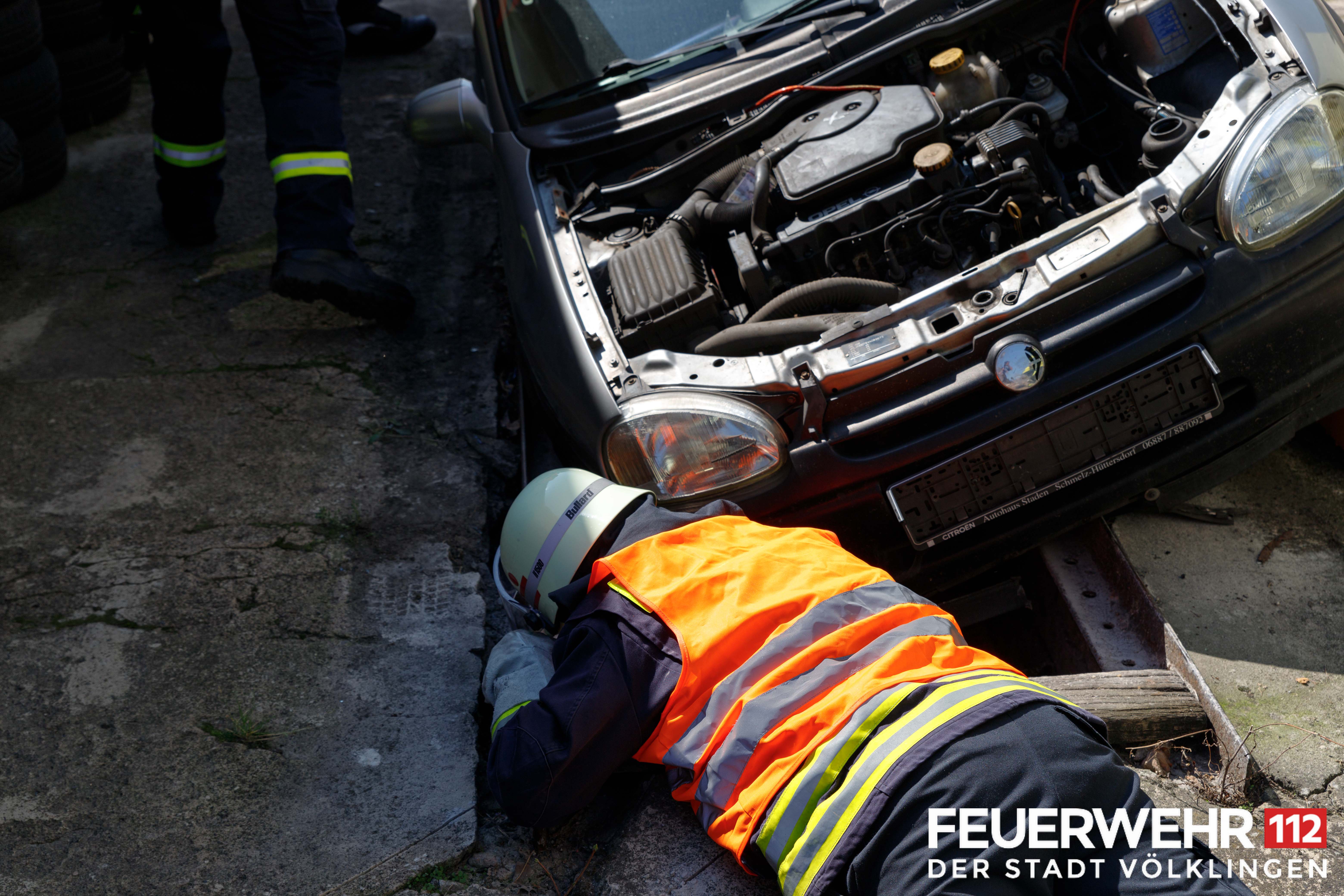 Als zweites Szenario wurde ein Unfall in einer KFZ-Werkstatt in der Grabenstraße angenommen. Bei Arbeiten an einem PKw auf einer Montagegruber rutscht dieser ab und verletzt dabei einen Mechaniker. Er ist eingeklemmt und kann sich nicht mehr aus eigener Kraft aus der Grube befreien. Mittels Hydraulikzylinder wird das Fahrzeug aus der Grube gehoben und mit Hölzern unterbaut, sodass die Person aus der Grube gerettet und zur Weiterbehandlung an den Rettungsdienst übergeben werden kann.