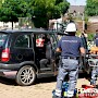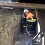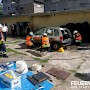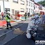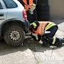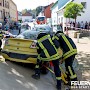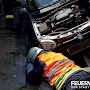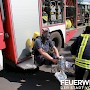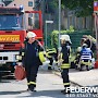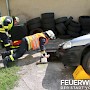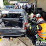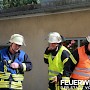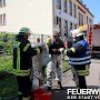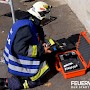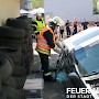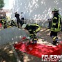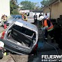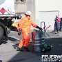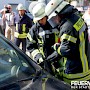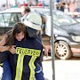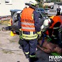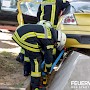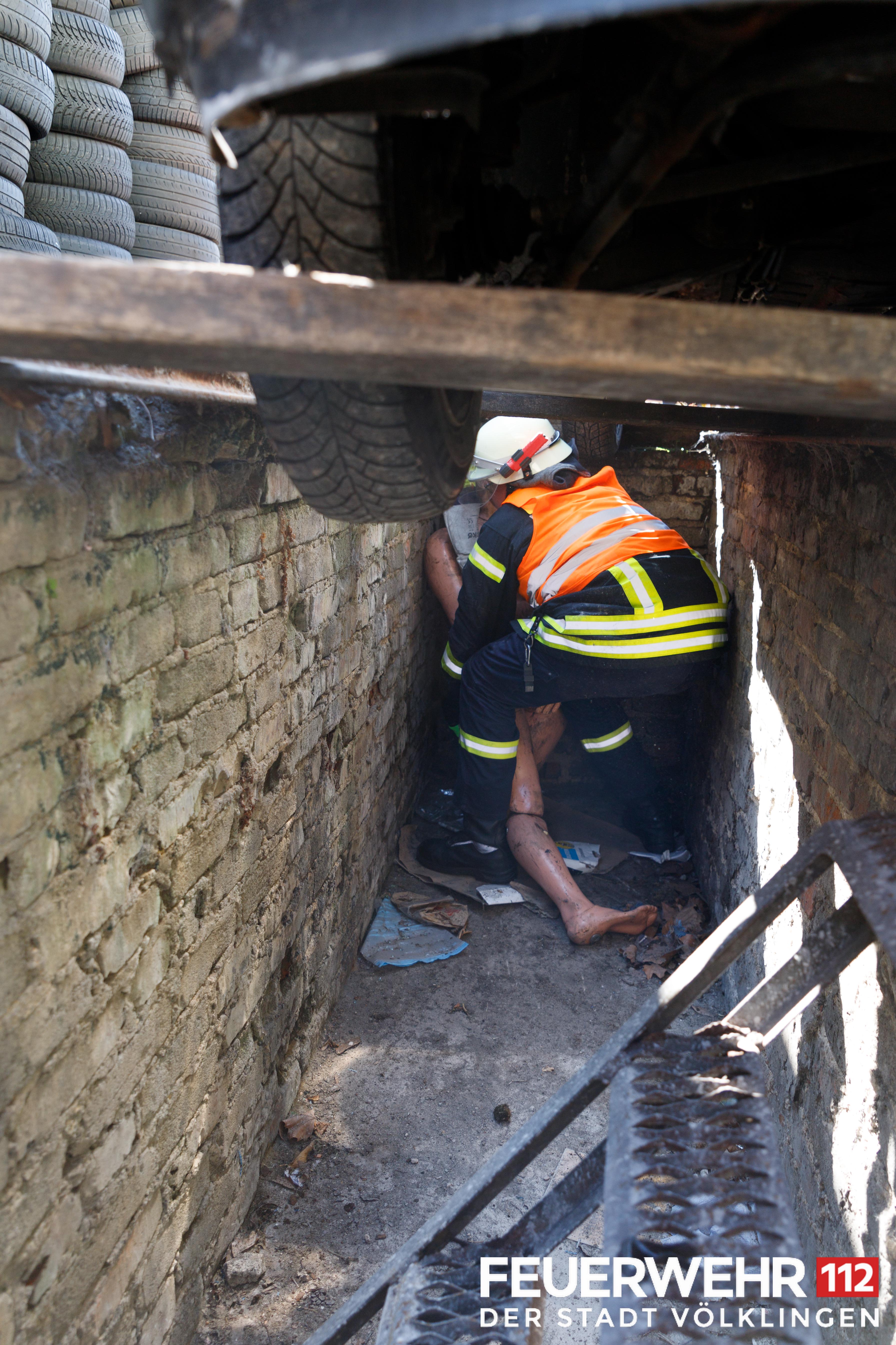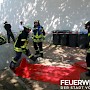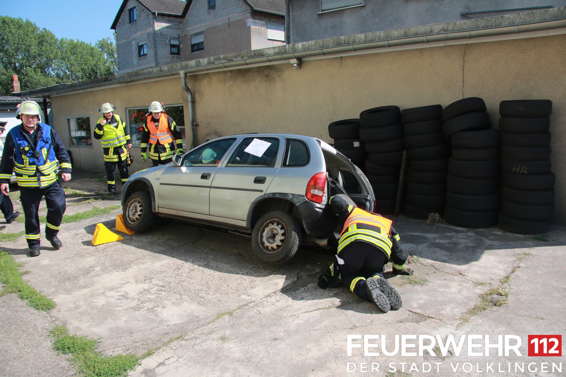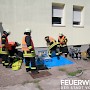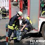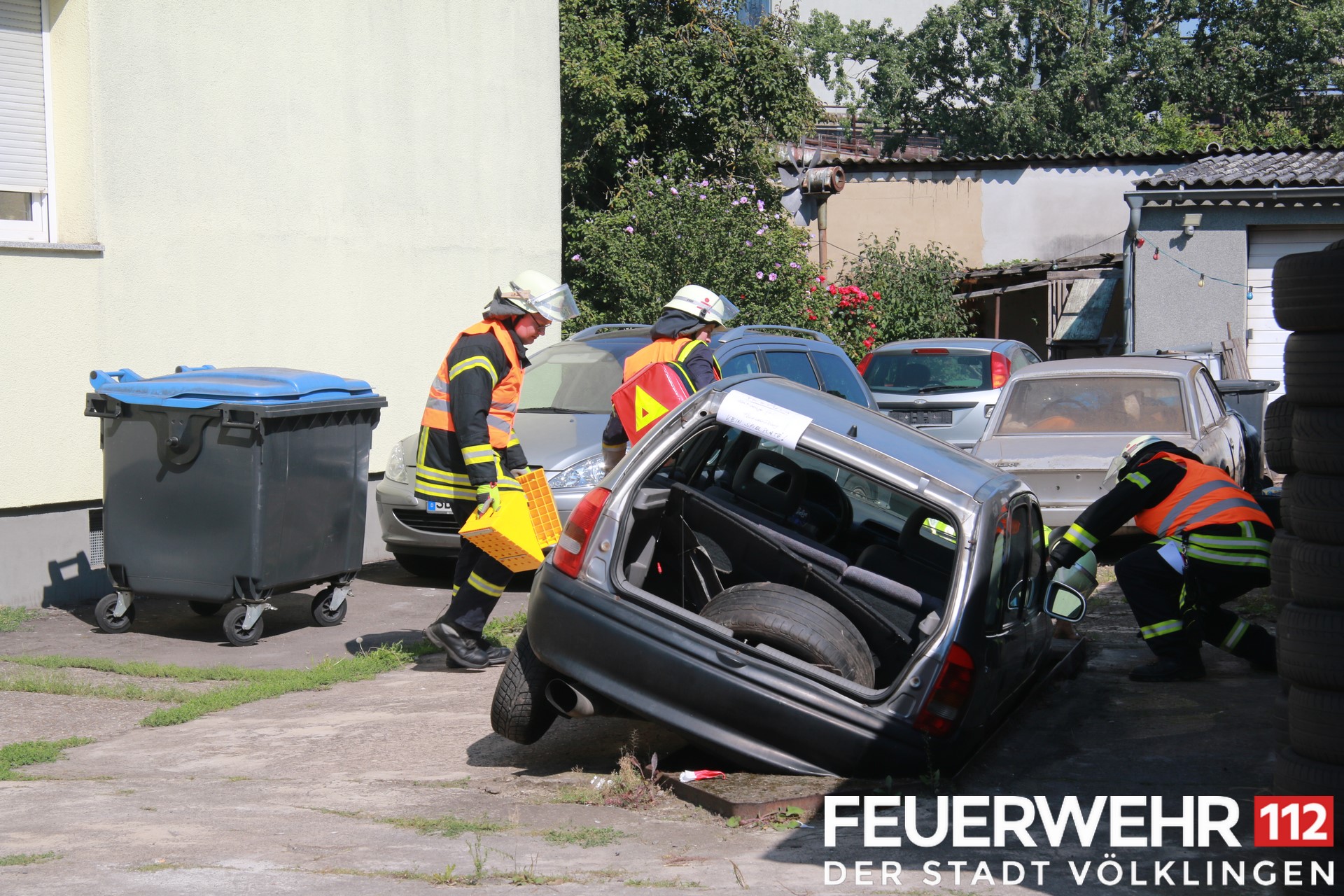 Als zweites Szenario wurde ein Unfall in einer KFZ-Werkstatt in der Grabenstraße angenommen. Bei Arbeiten an einem PKw auf einer Montagegruber rutscht dieser ab und verletzt dabei einen Mechaniker. Er ist eingeklemmt und kann sich nicht mehr aus eigener Kraft aus der Grube befreien. Mittels Hydraulikzylinder wird das Fahrzeug aus der Grube gehoben und mit Hölzern unterbaut, sodass die Person aus der Grube gerettet und zur Weiterbehandlung an den Rettungsdienst übergeben werden kann.