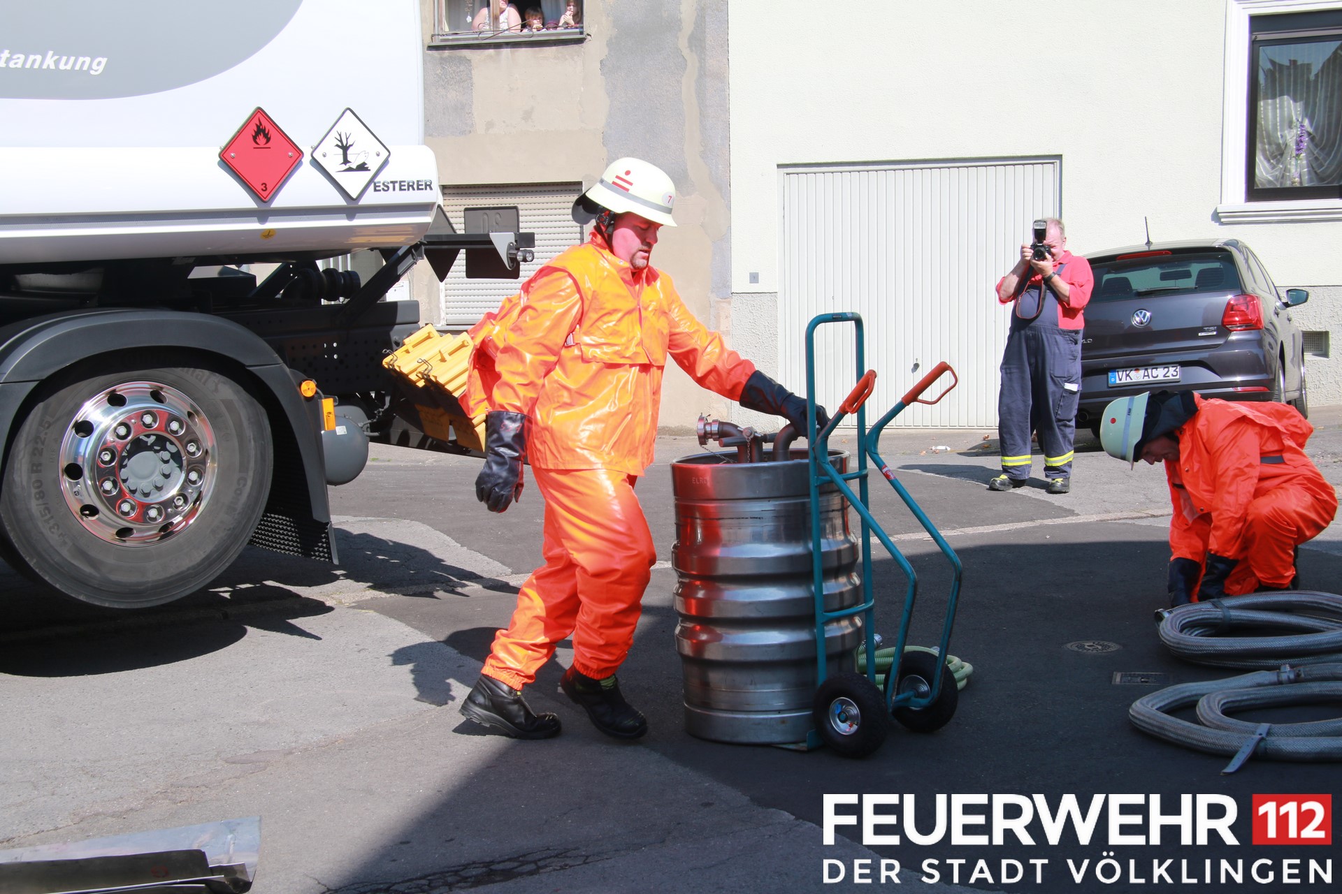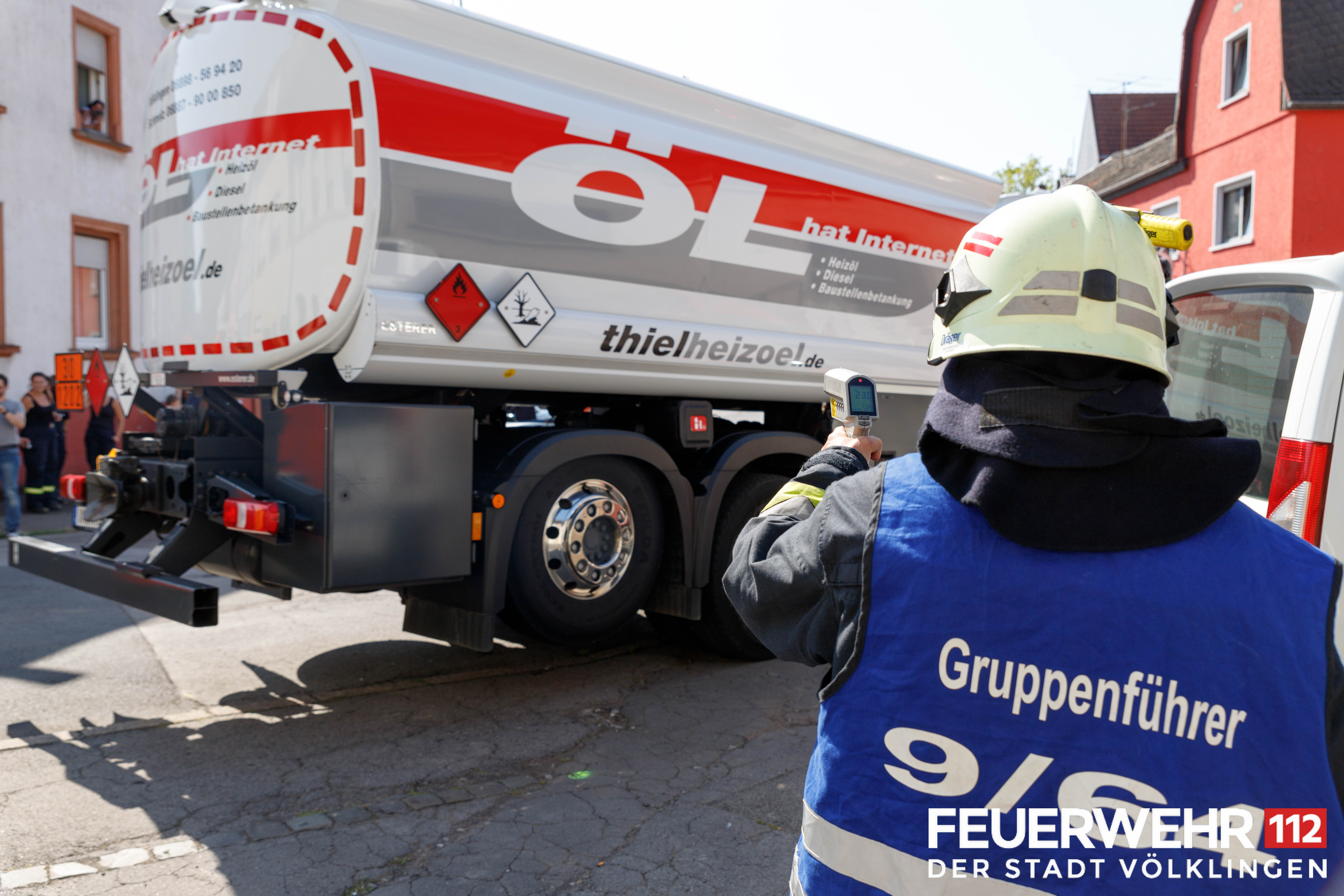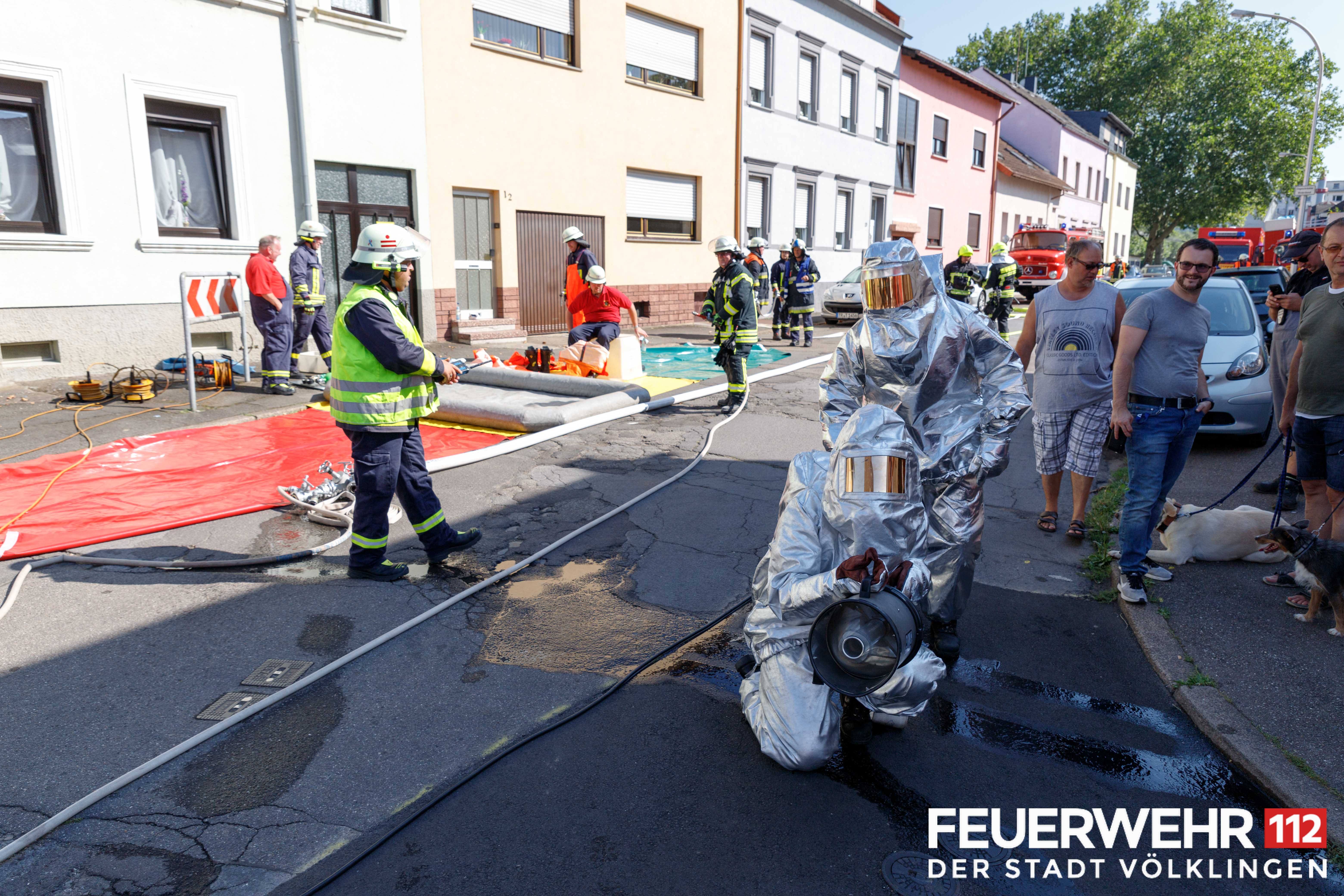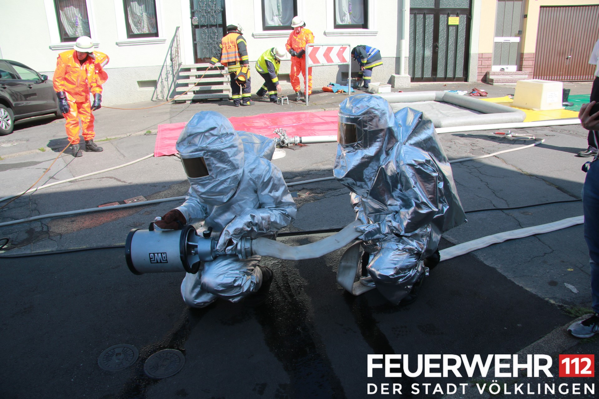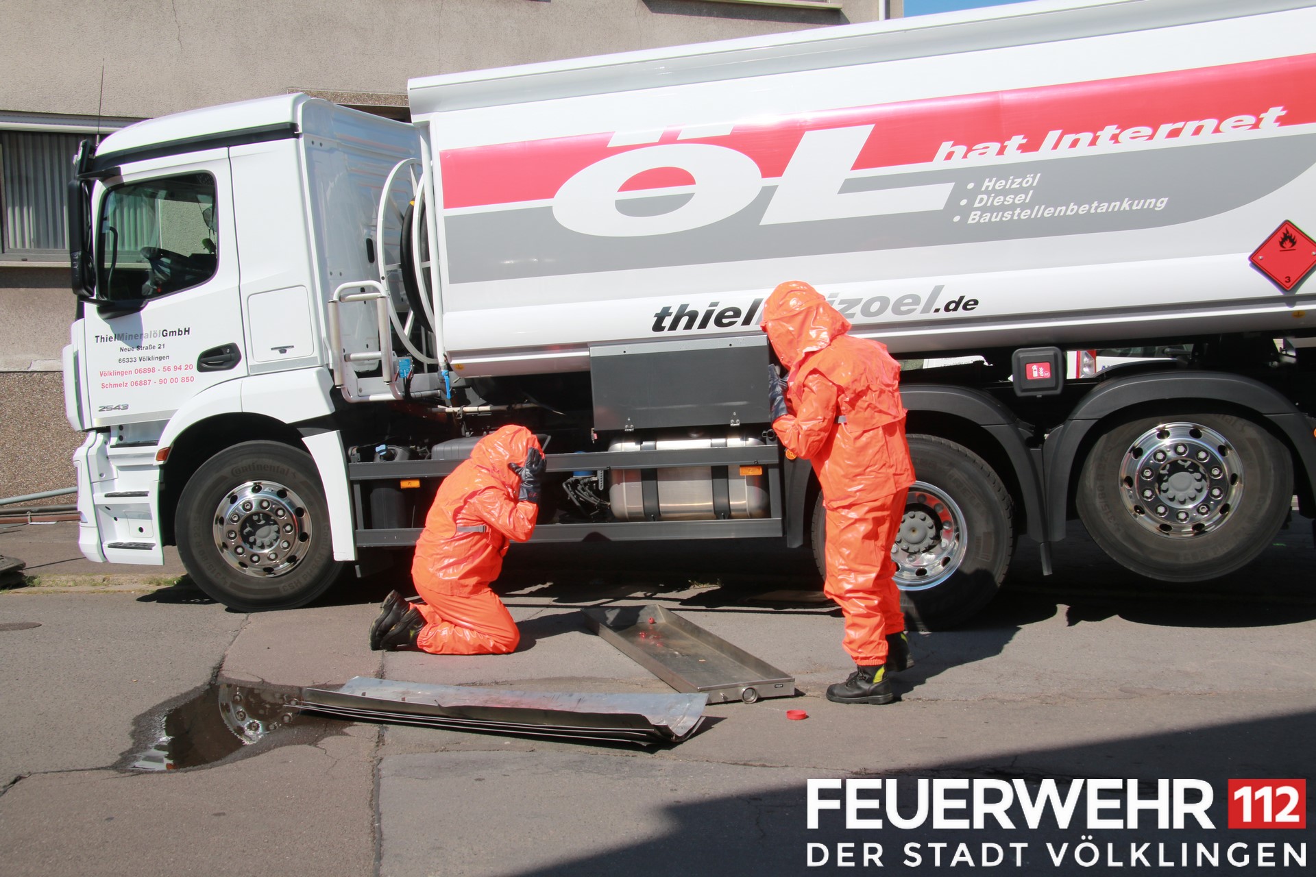 Als drittes und letztes Szenario kommt es in der Saarstraße zum Umkippen eines Tanklasters. Dieser fährt von der Saarstraße in Richtung Hostenbacher Straße. In der dortigen Kurve kommt das Fahrzeug zum Kippen. Dabei tritt Dieselkraftstoff aus. Dieser gelangt über die Schachteinläufe in das Abwassersystem und damit auch in die benachbarten Häuser. Die austretende Ladung wird umgepumpt und der Brandschutz in der Umgebung sichergestellt. Zur Unterstützung kommt das Zumischlöschfahrzeug der Saarstahl AG zum Einsatz, da die Wasserversorgung im Unfallbereich über das Trinkwassernetz nicht sichergestellt ist wird zusätzlich Wasser aus der Saar zur Einsatzstelle gefördert.